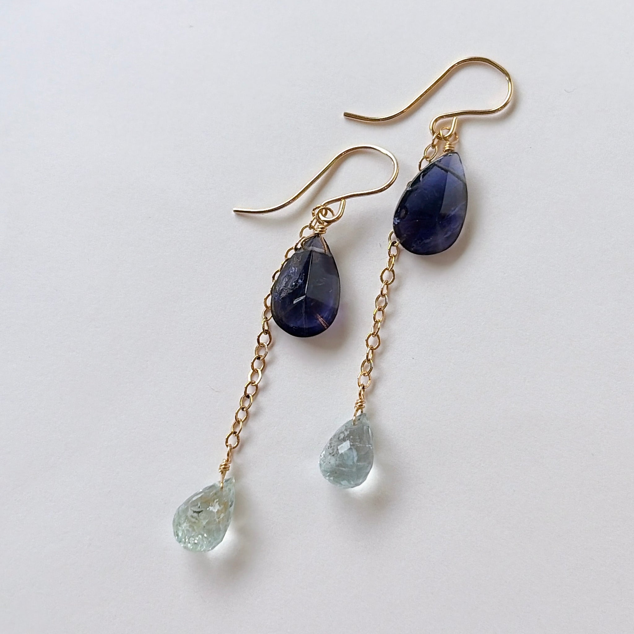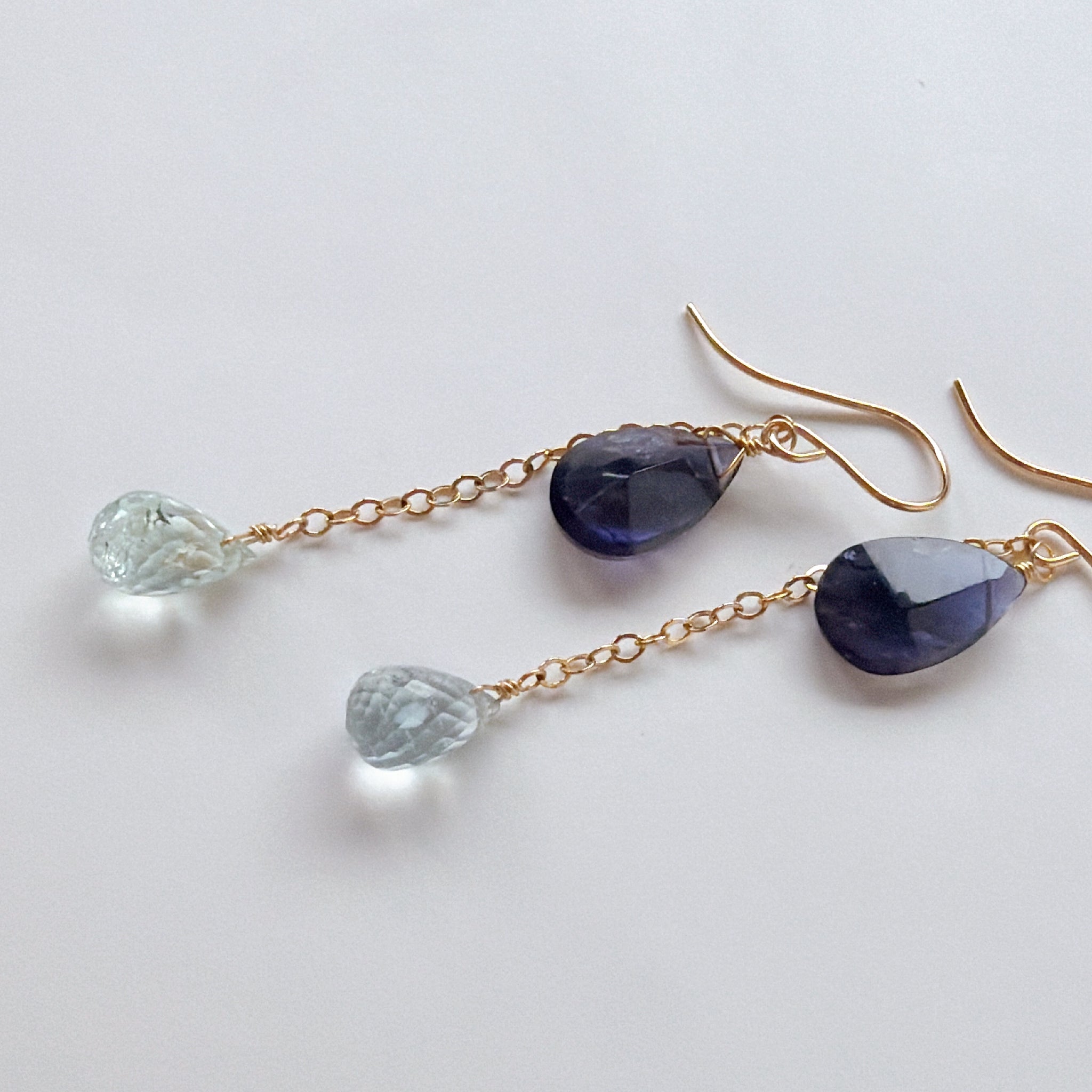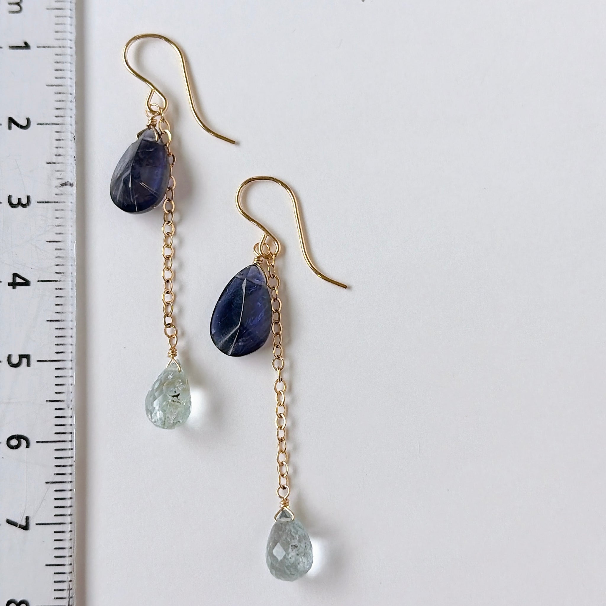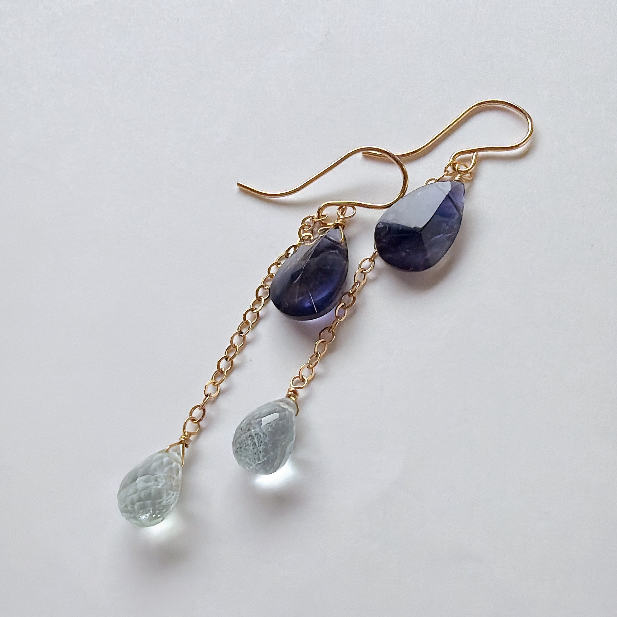 バフトップカットのアイオライトとドロップカットのアクアマリンのピアスです。