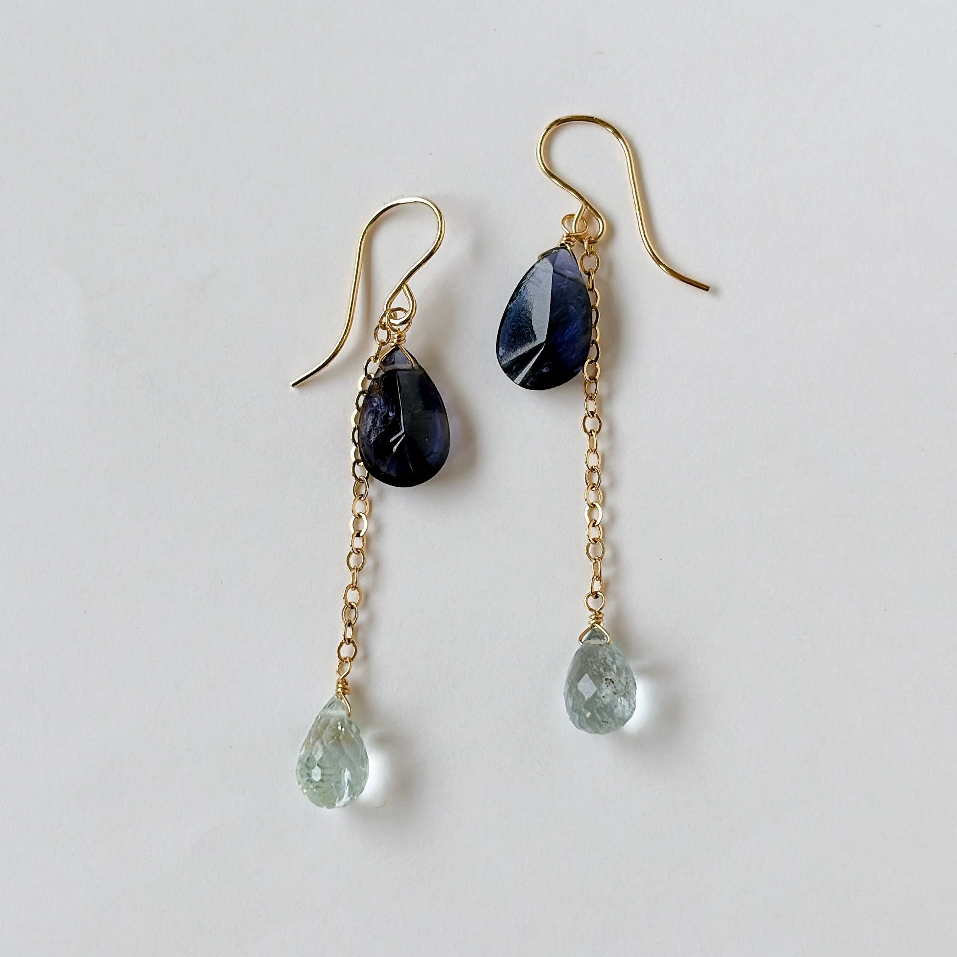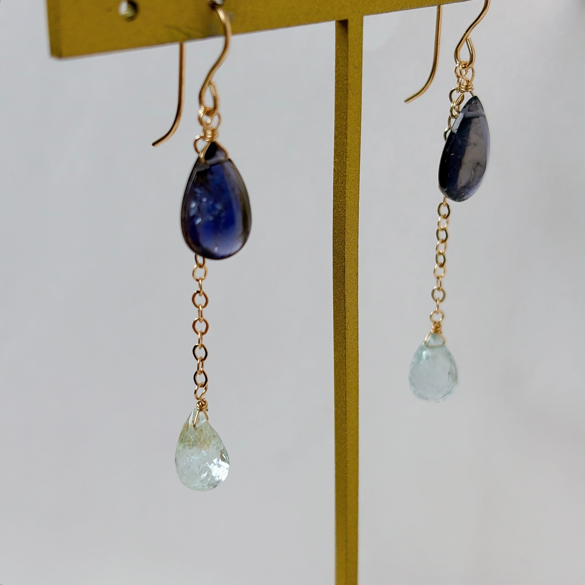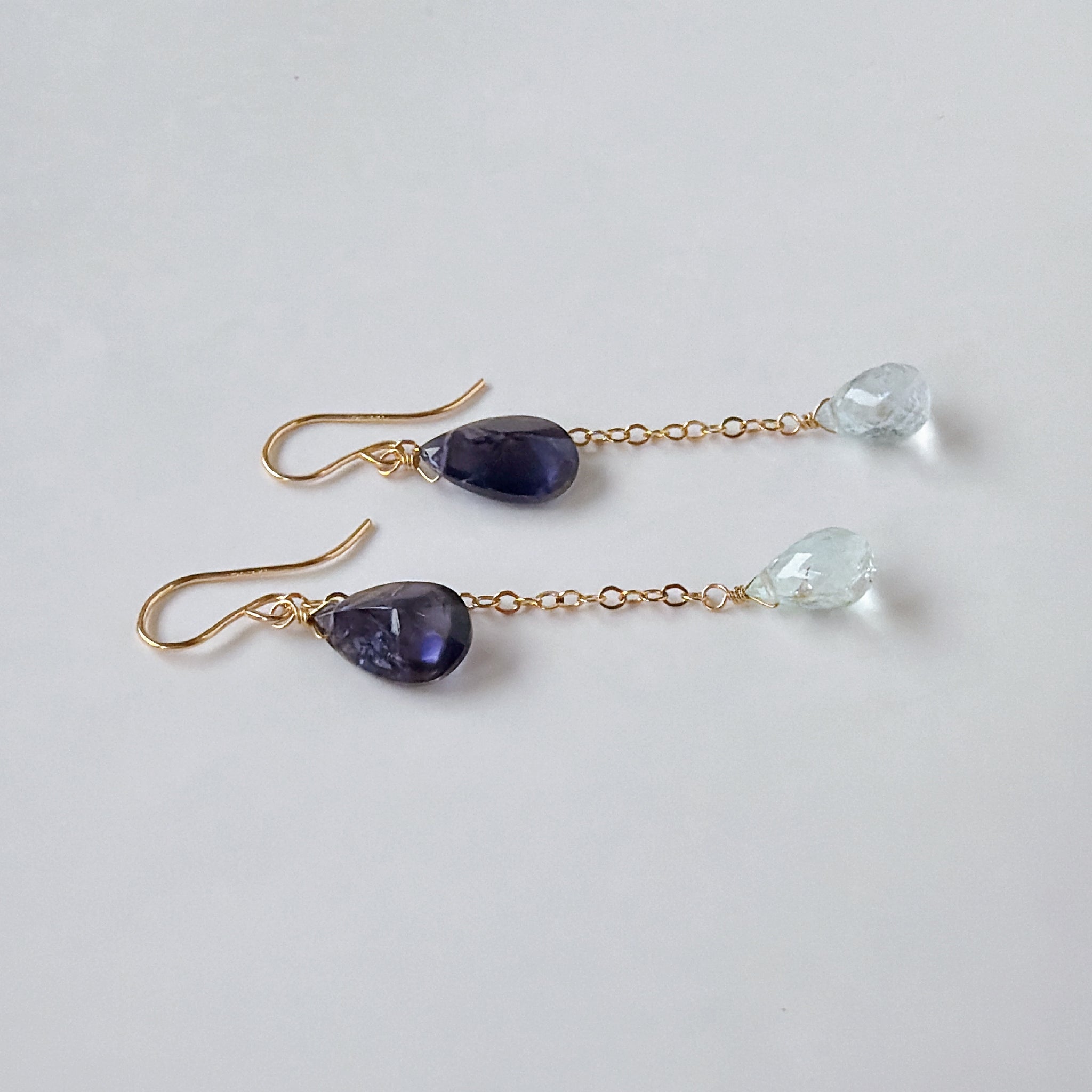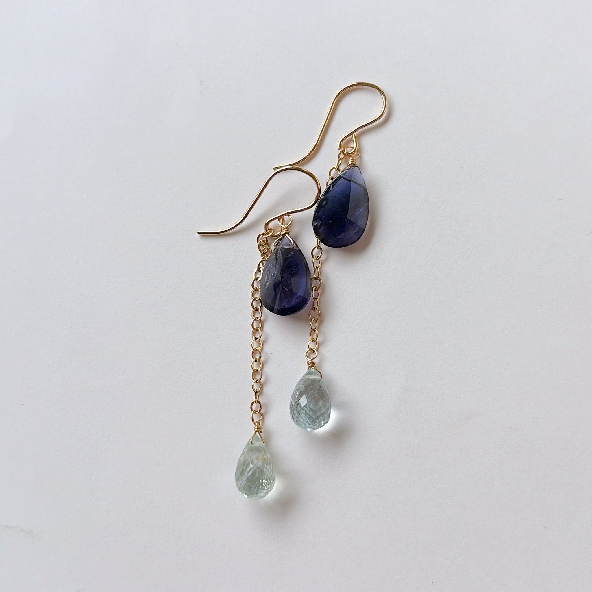 バフトップカットのアイオライトとドロップカットのアクアマリンのピアスです。