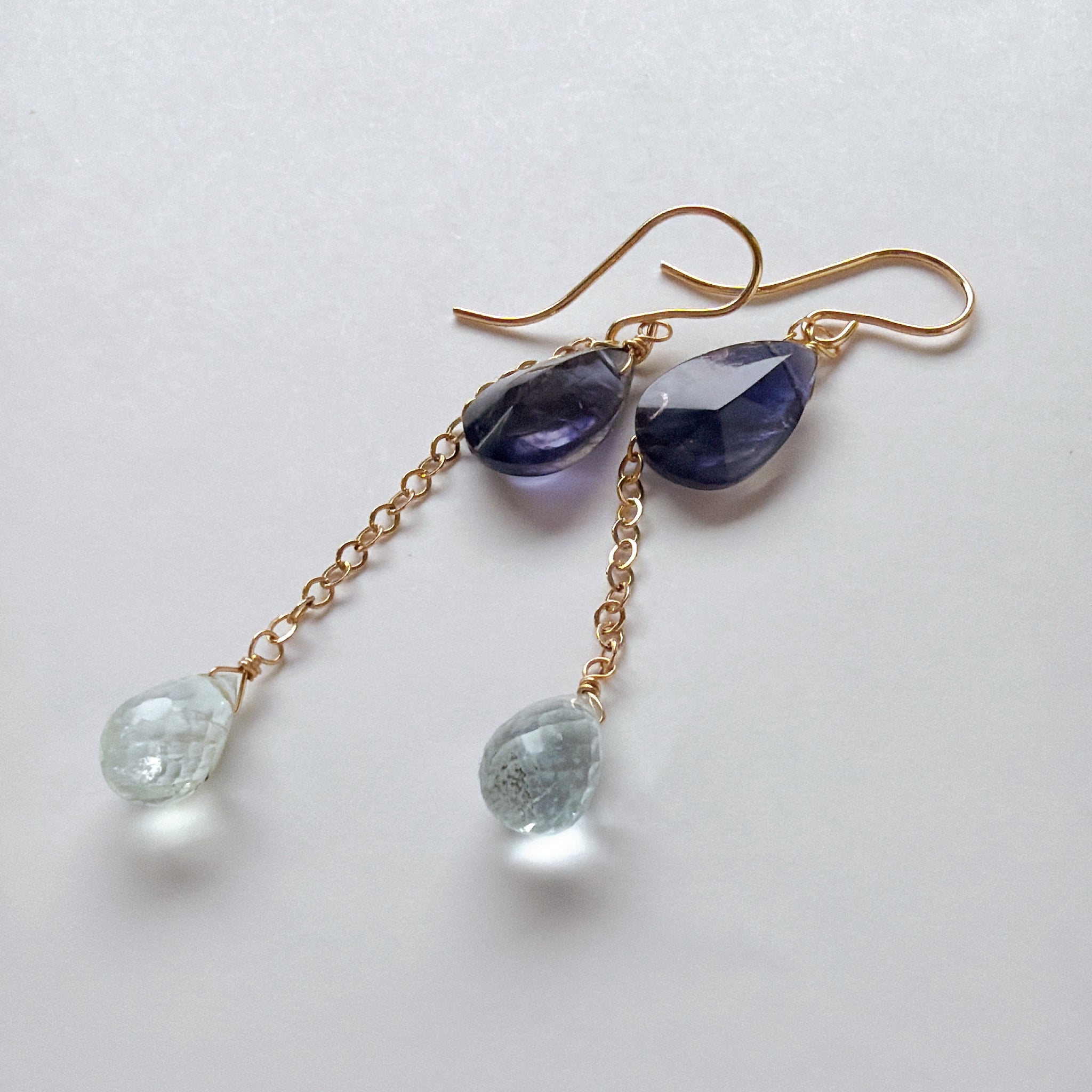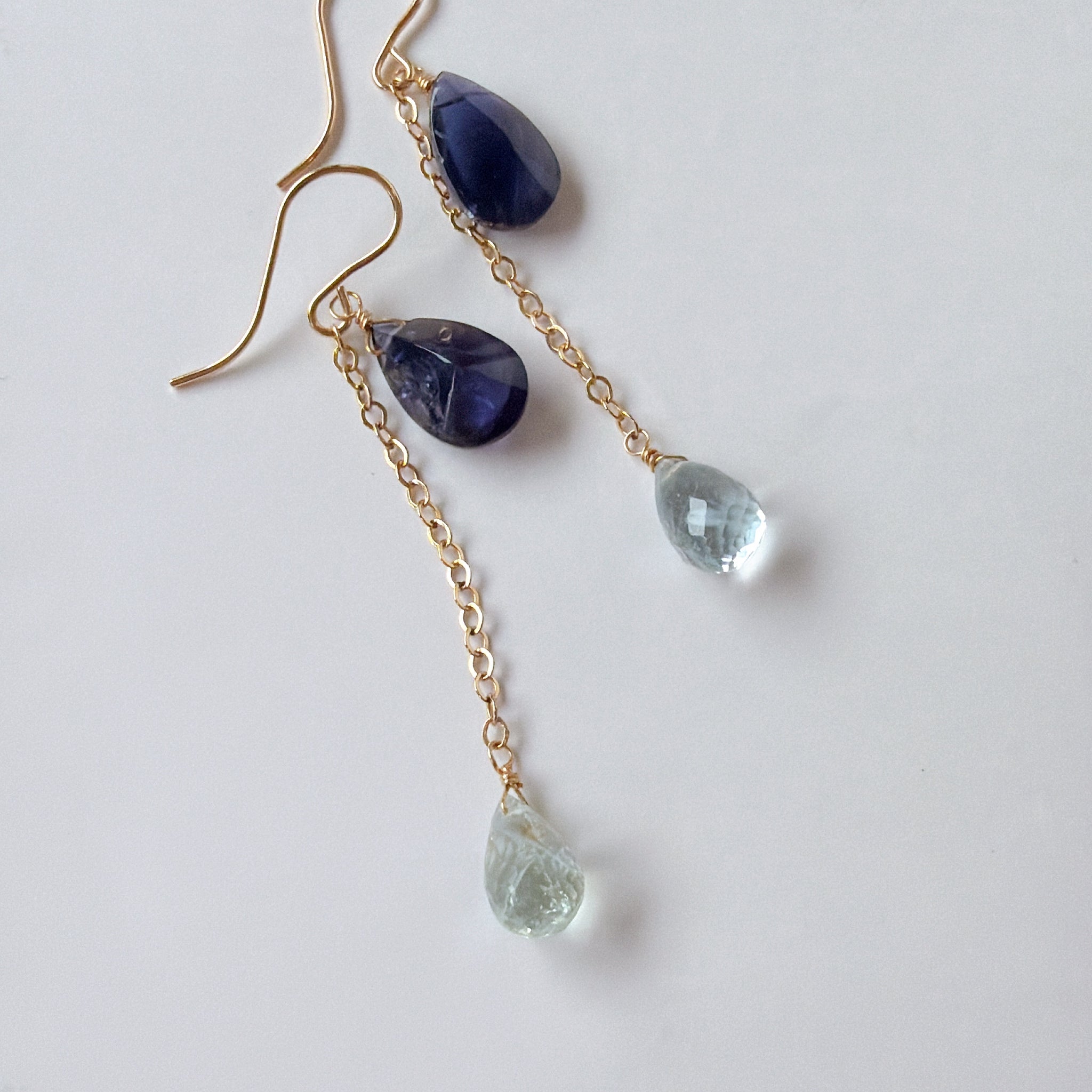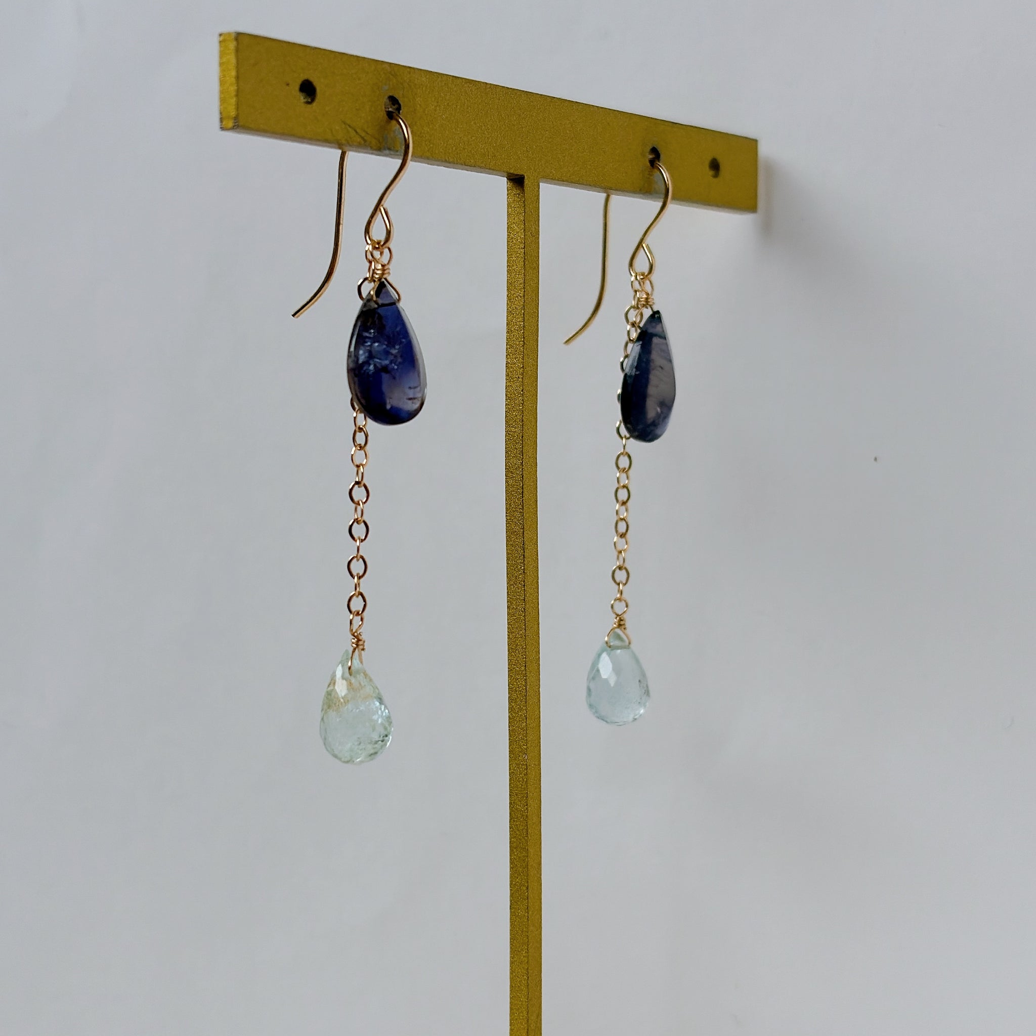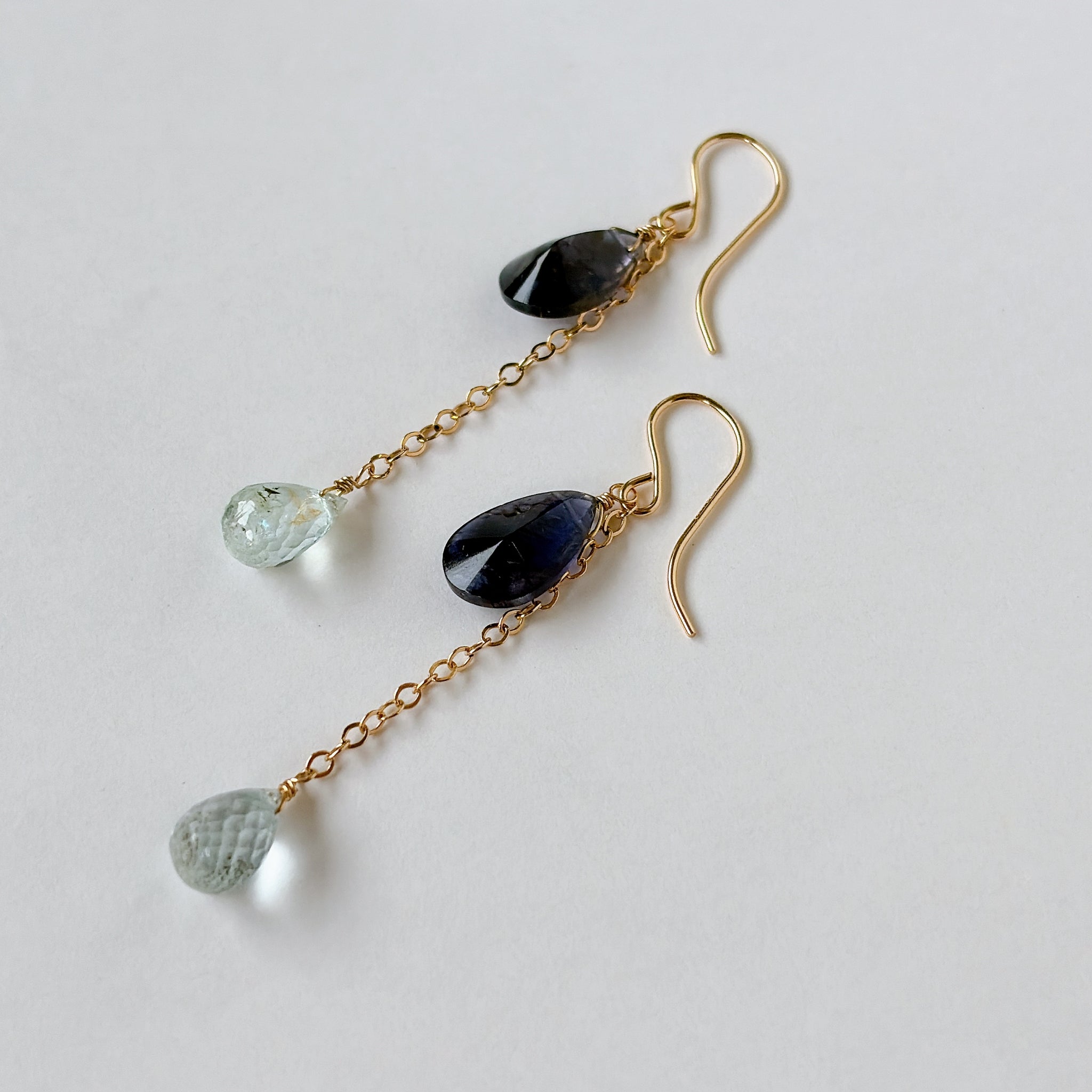 バフトップカットのアイオライトとドロップカットのアクアマリンのピアスです。