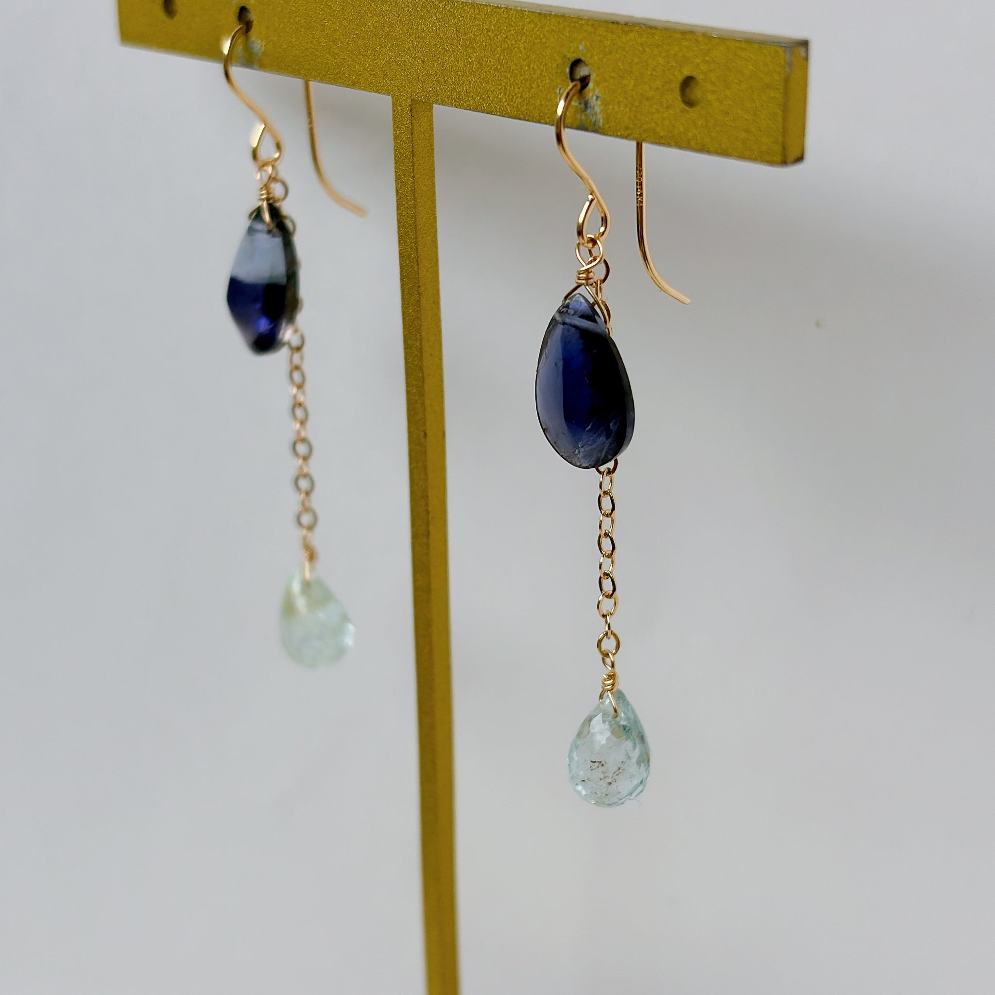 深い藍色の中に、角度によって色味が変わって見える多色性、部分的にアベンチュレッセンスも見られるアイオライトと、てりの美しいアクアマリンを合わせました。