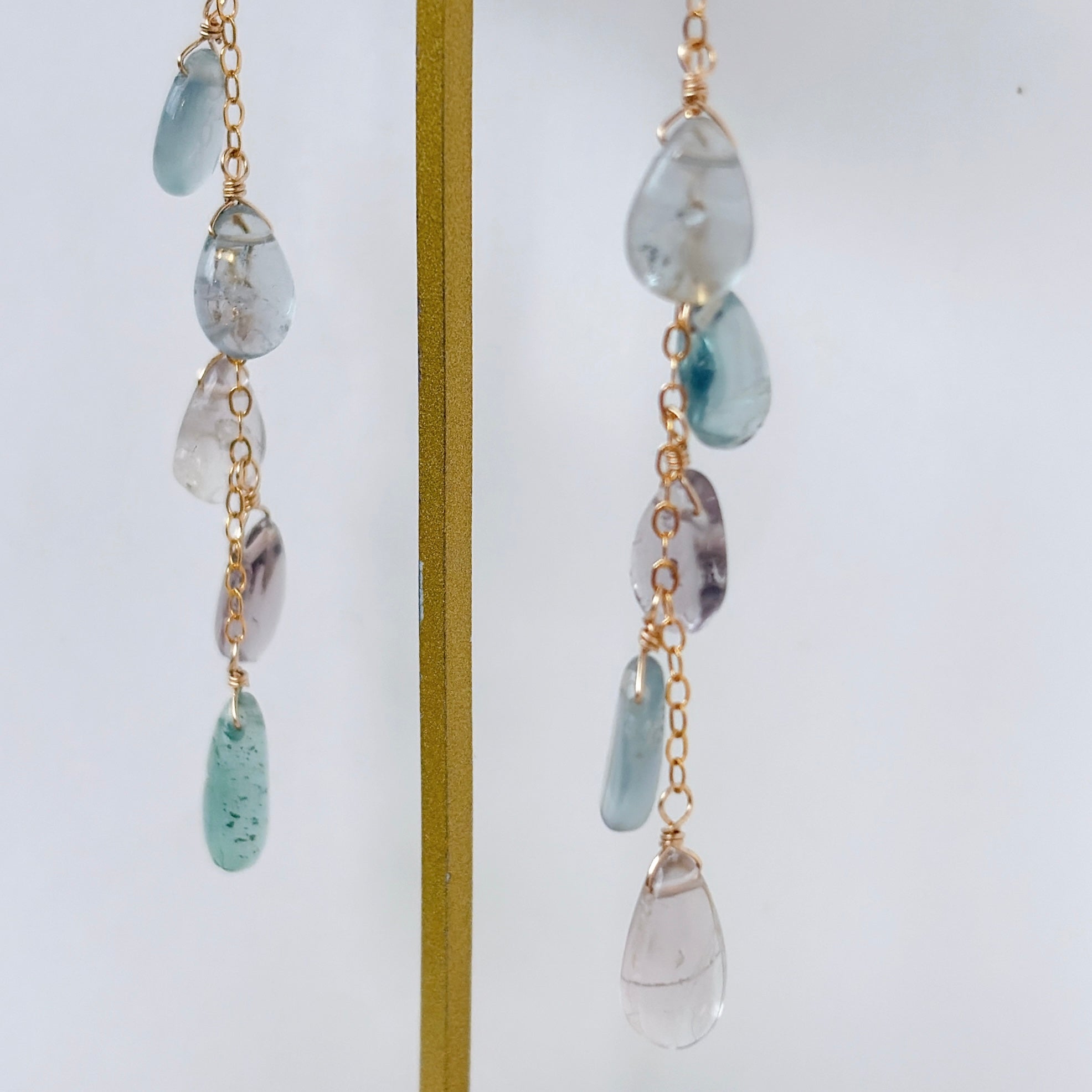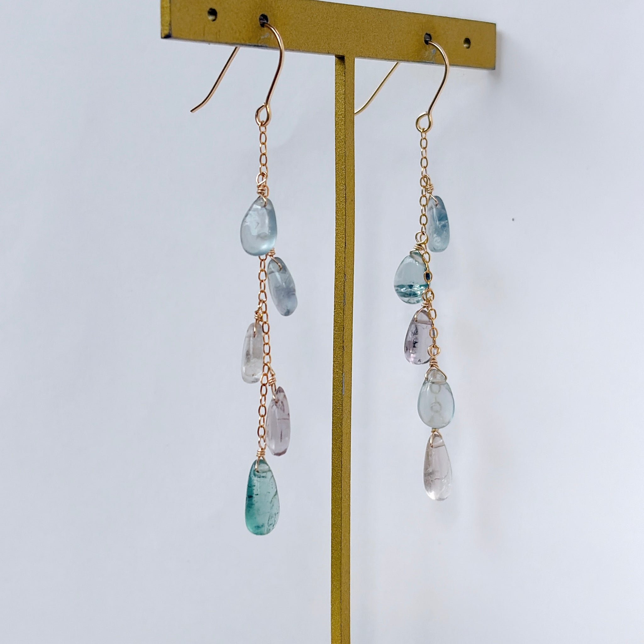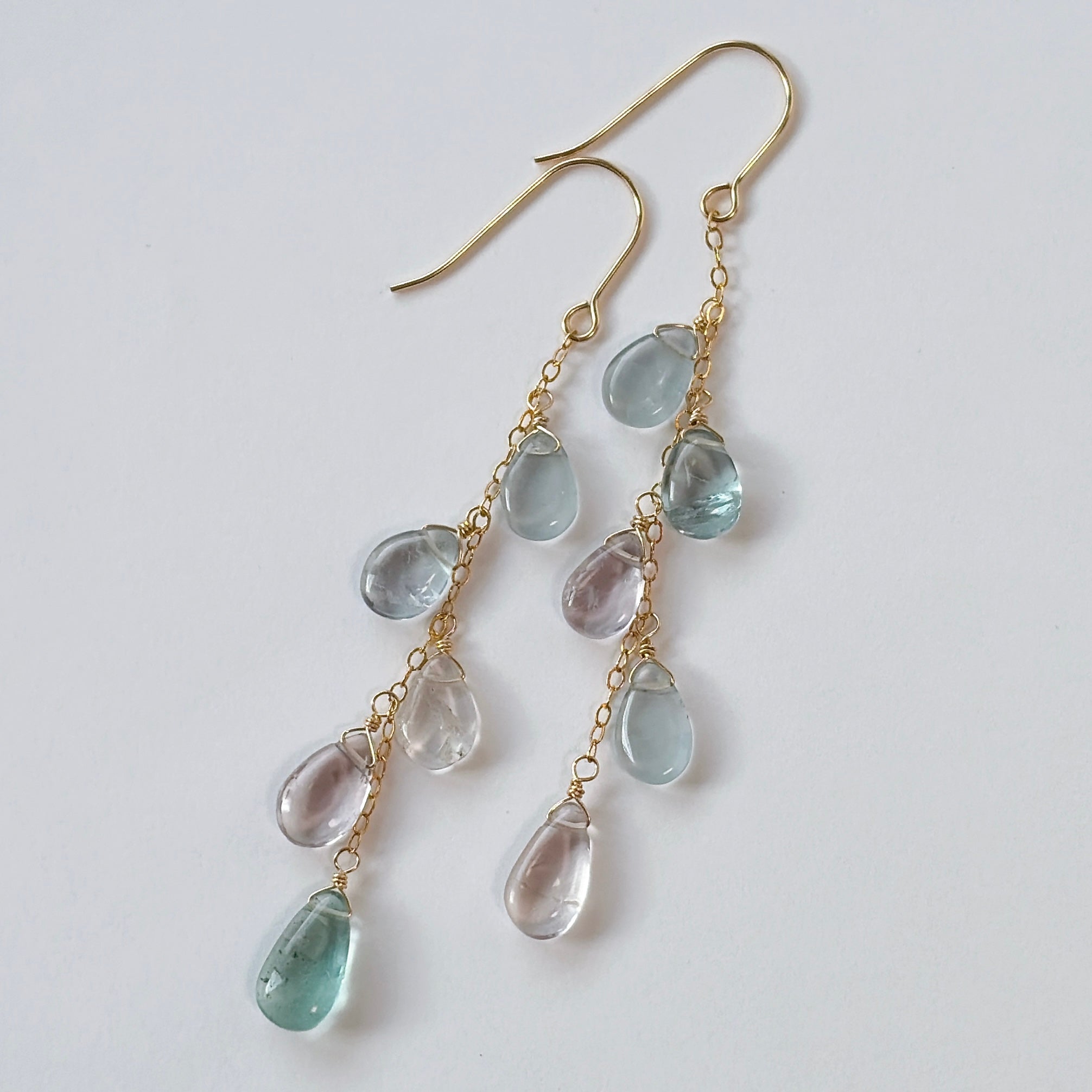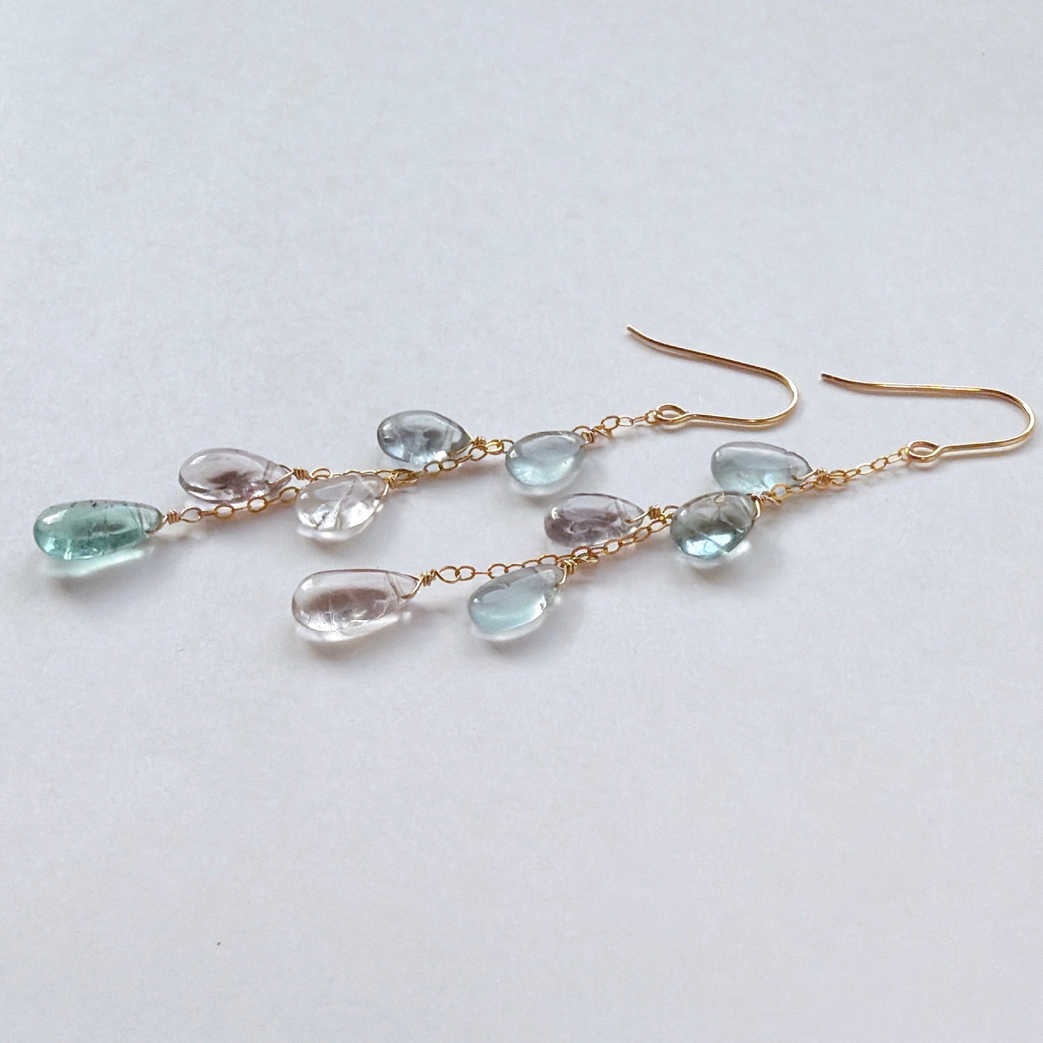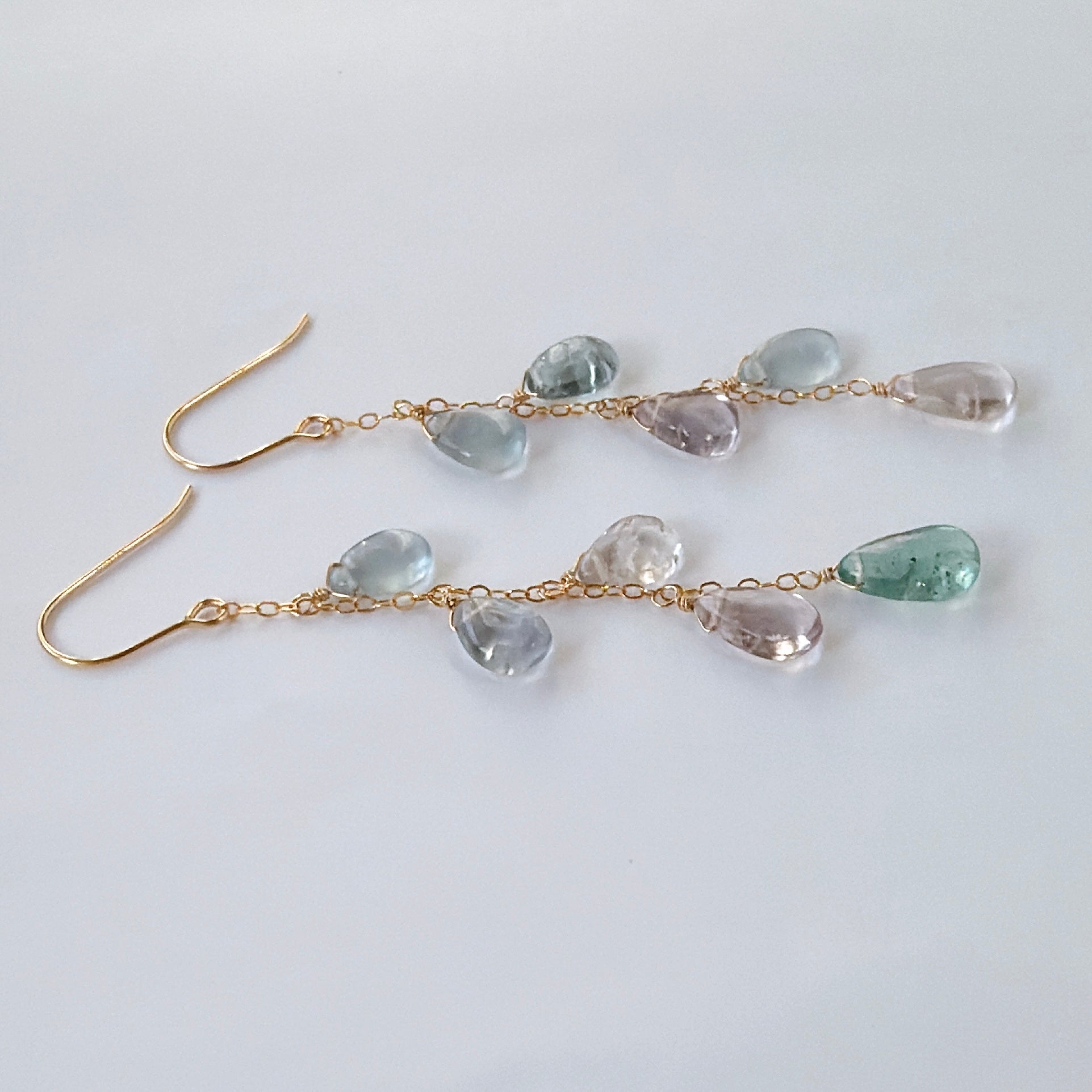 透明感のあるフローライトを、華奢なチェーンに縦に流れるように5粒ずつ留めました。