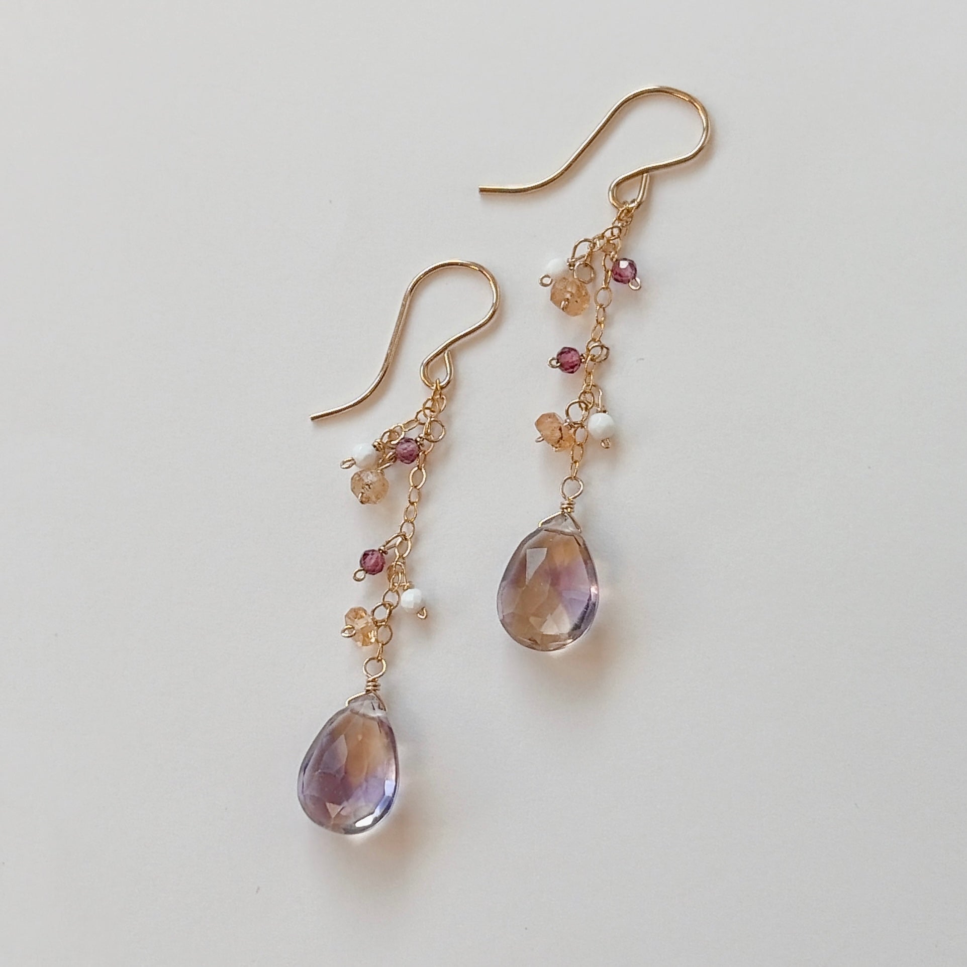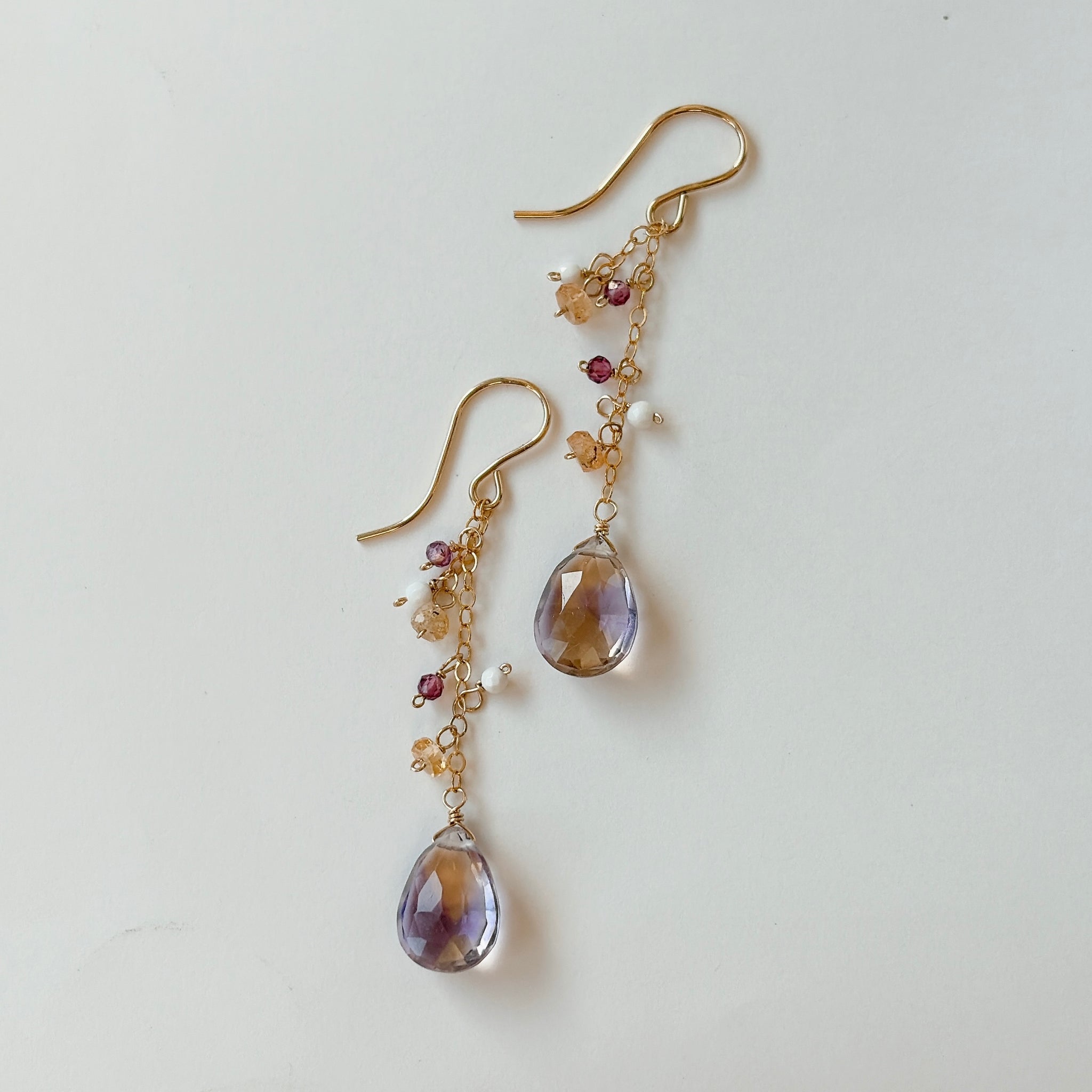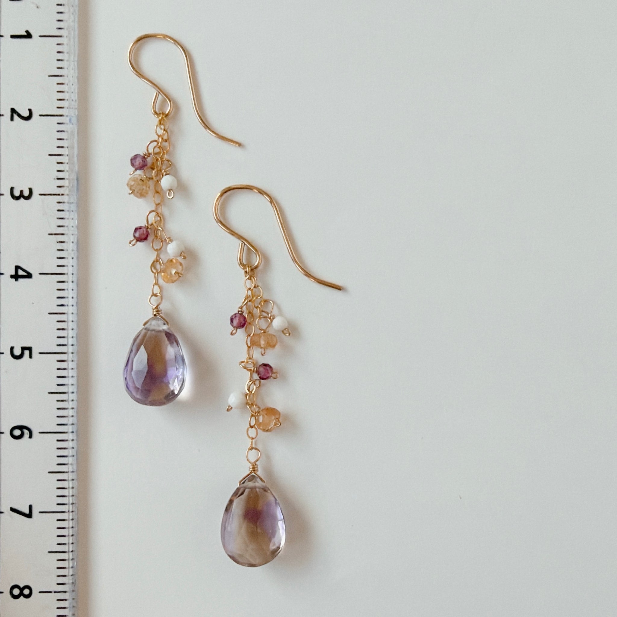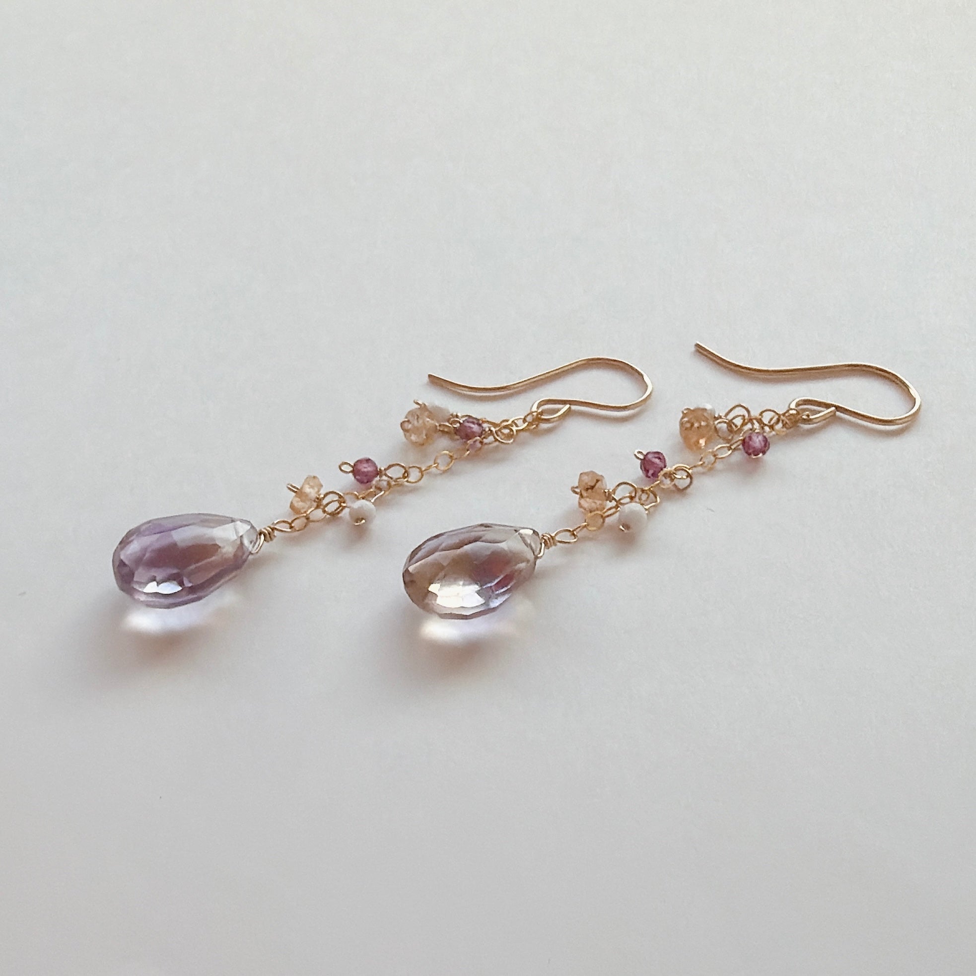紫とシャンパンカラーが溶け合うアメトリンを主役に、小粒の天然石を連ねた繊細なチェーンデザインのピアス。
