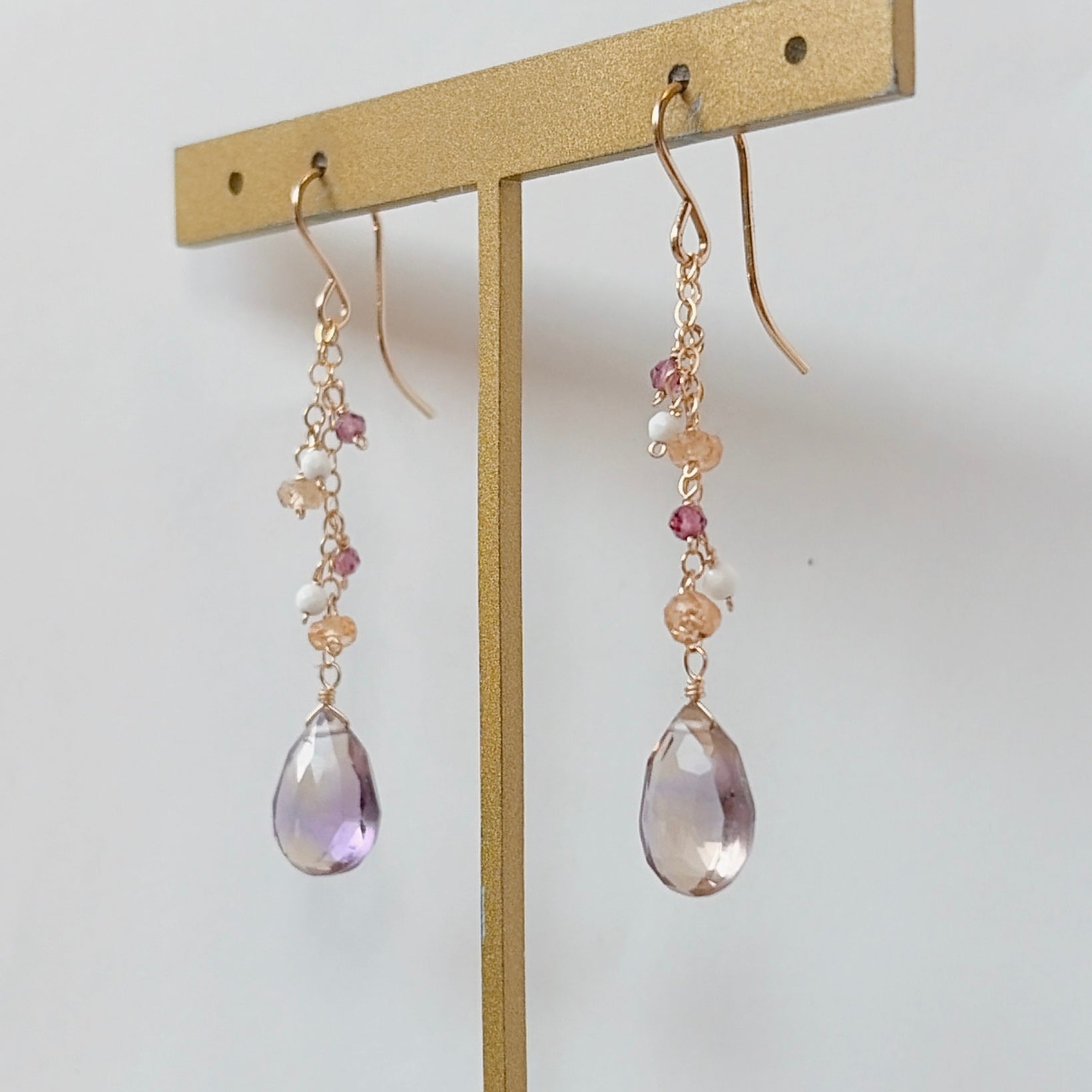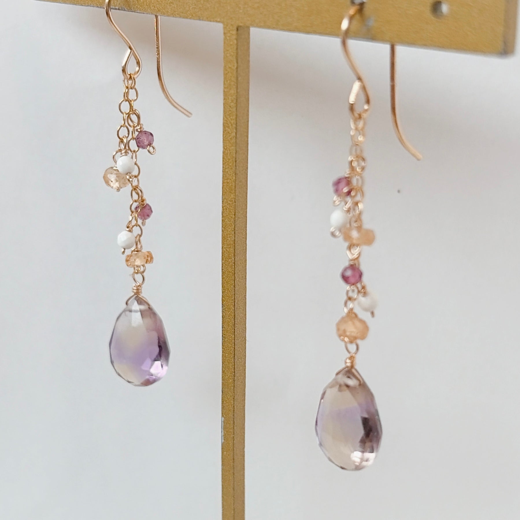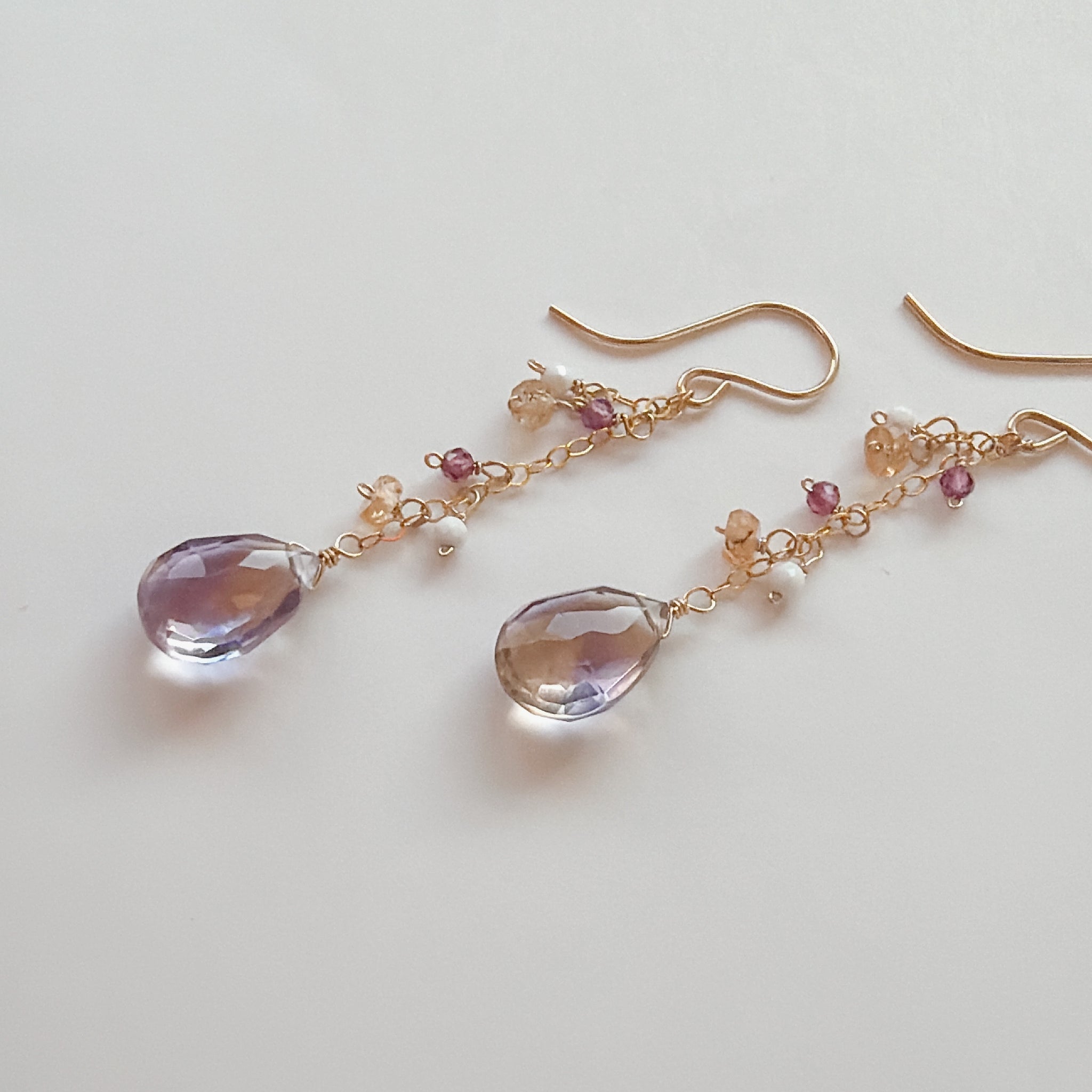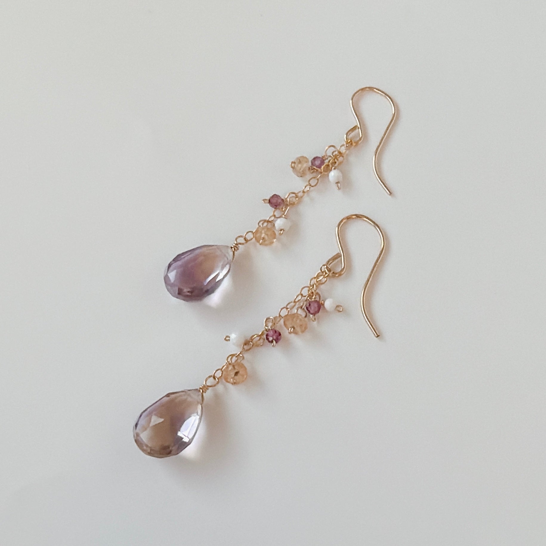 紫とシャンパンカラーが溶け合うアメトリンを主役に、小粒の天然石を連ねた繊細なチェーンデザインのピアス。