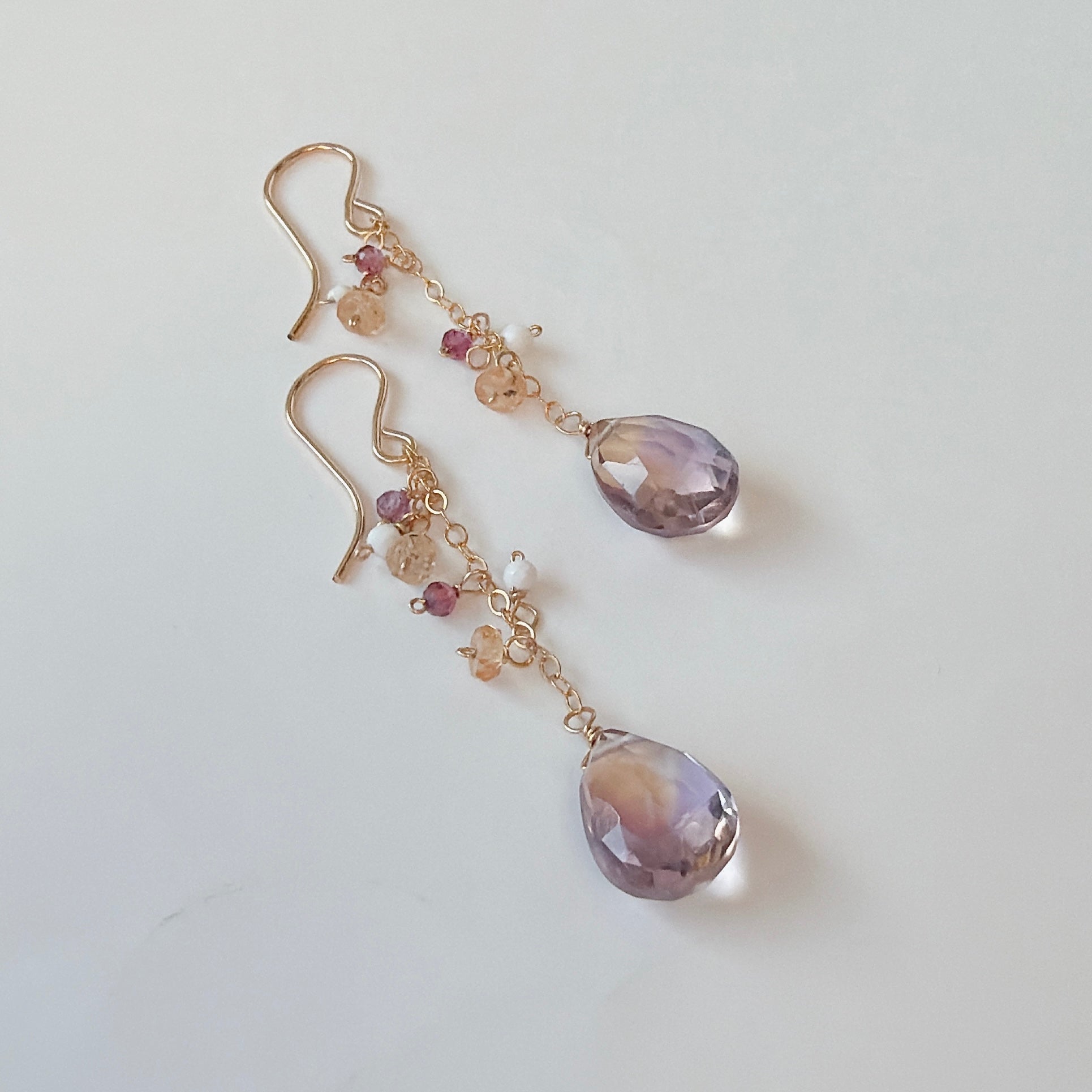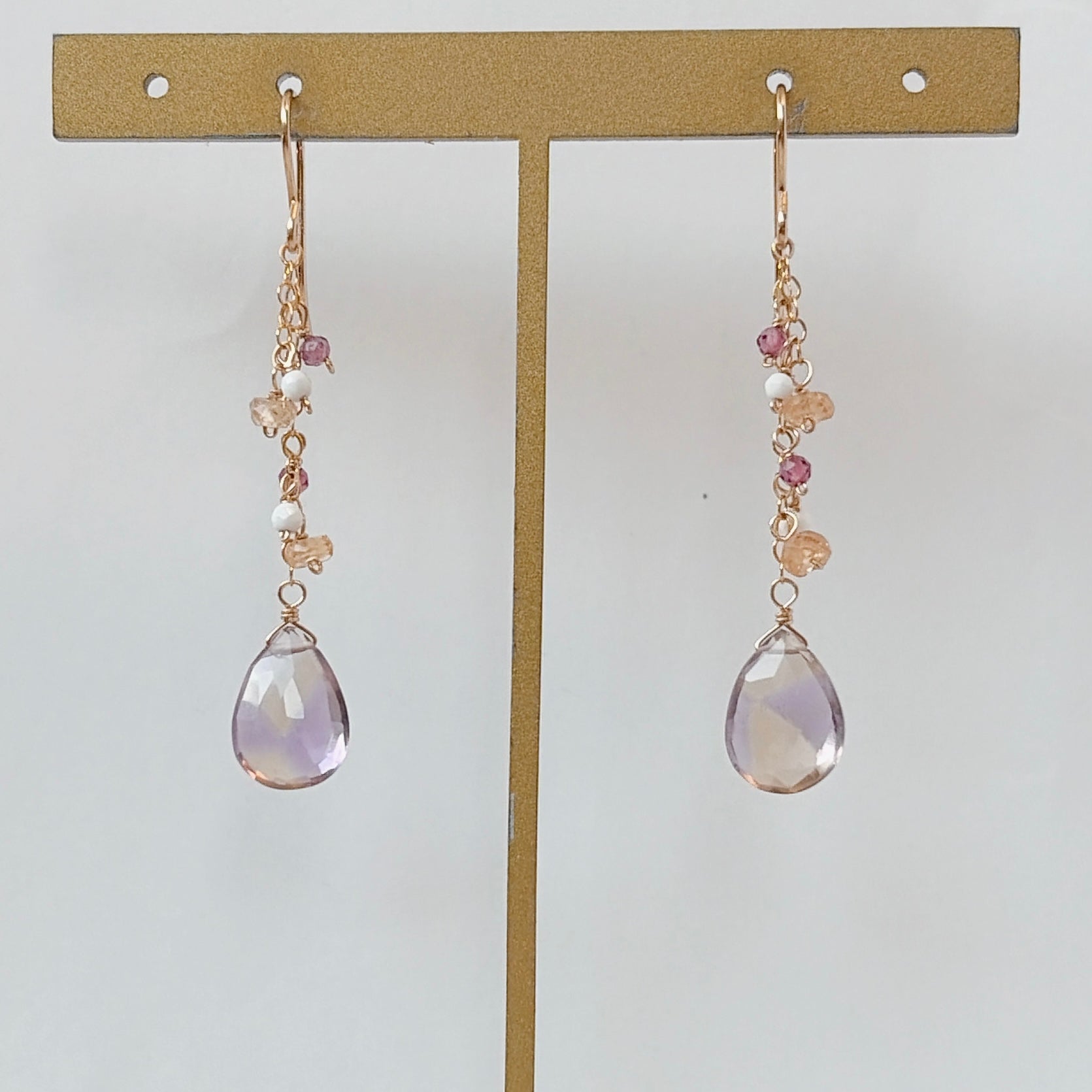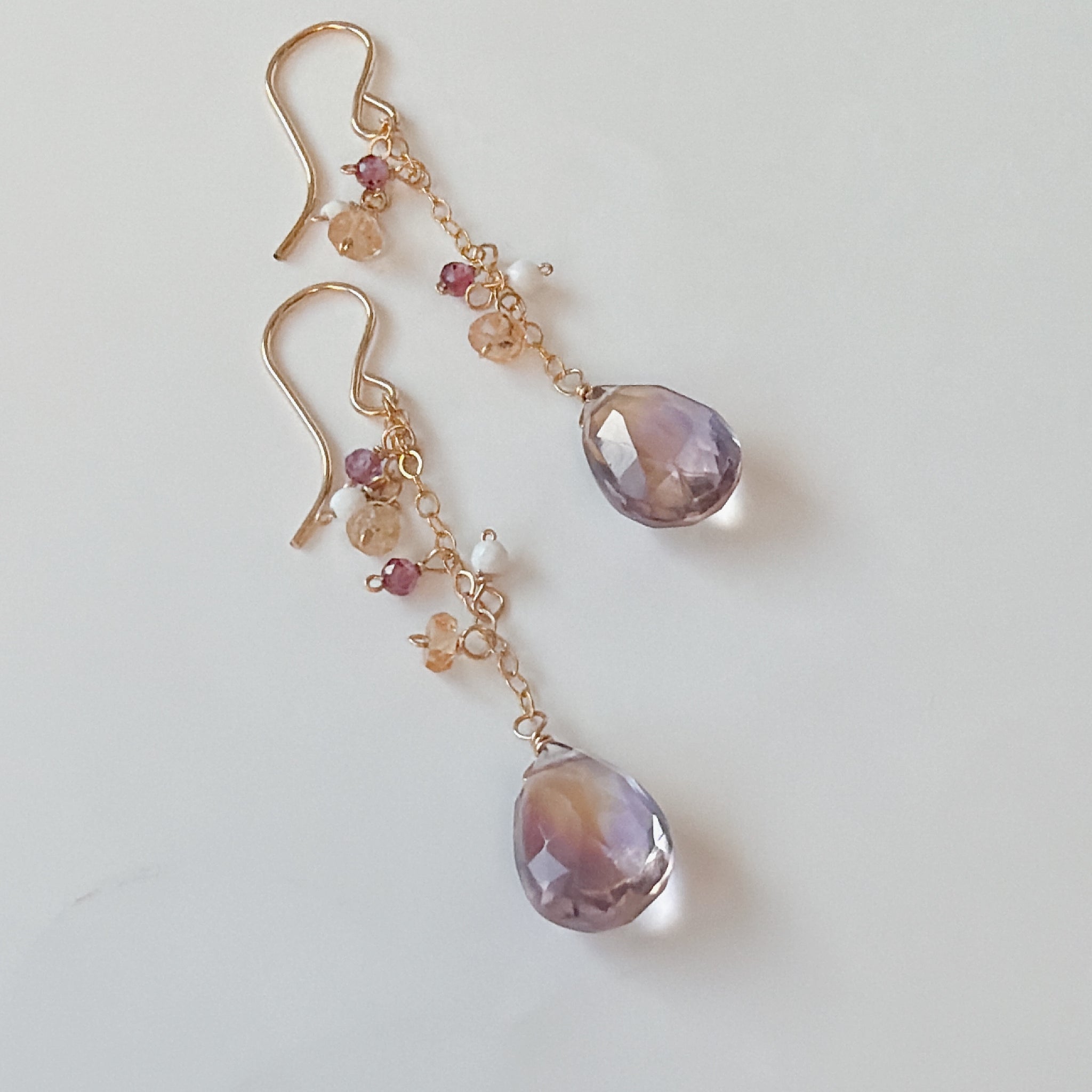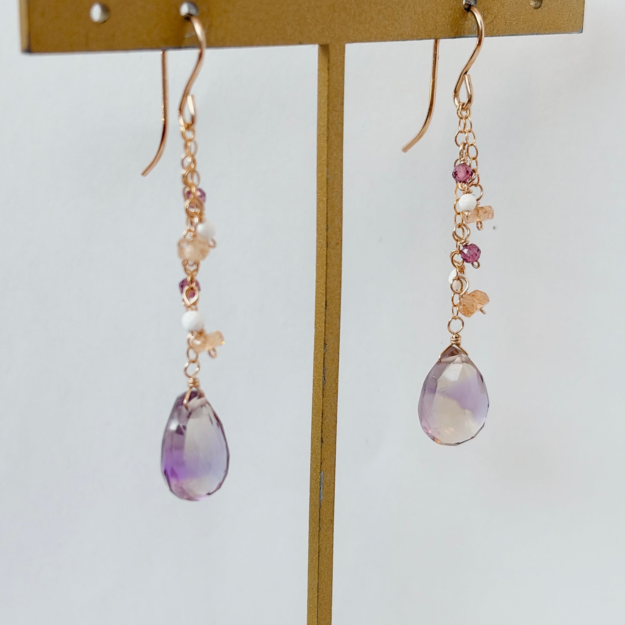 紫とシャンパンカラーが溶け合うアメトリンを主役に、小粒の天然石を連ねた繊細なチェーンデザインのピアス。