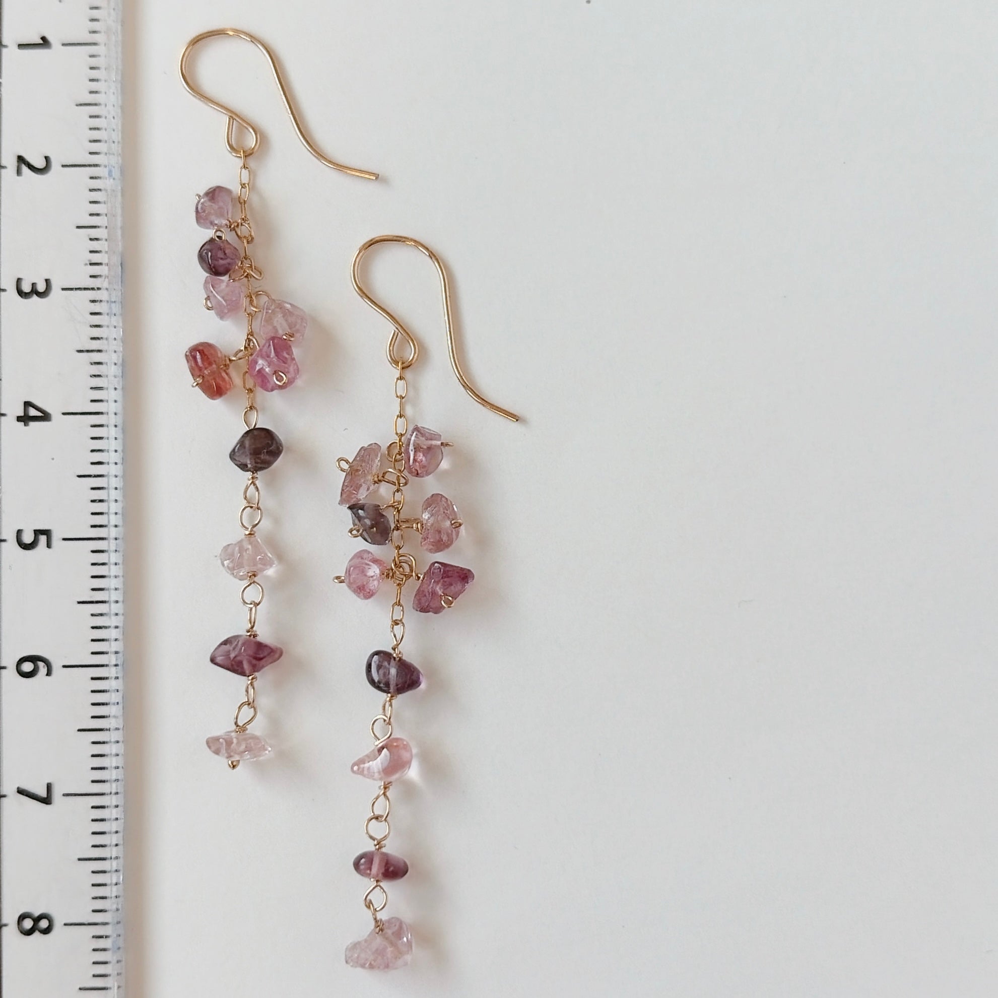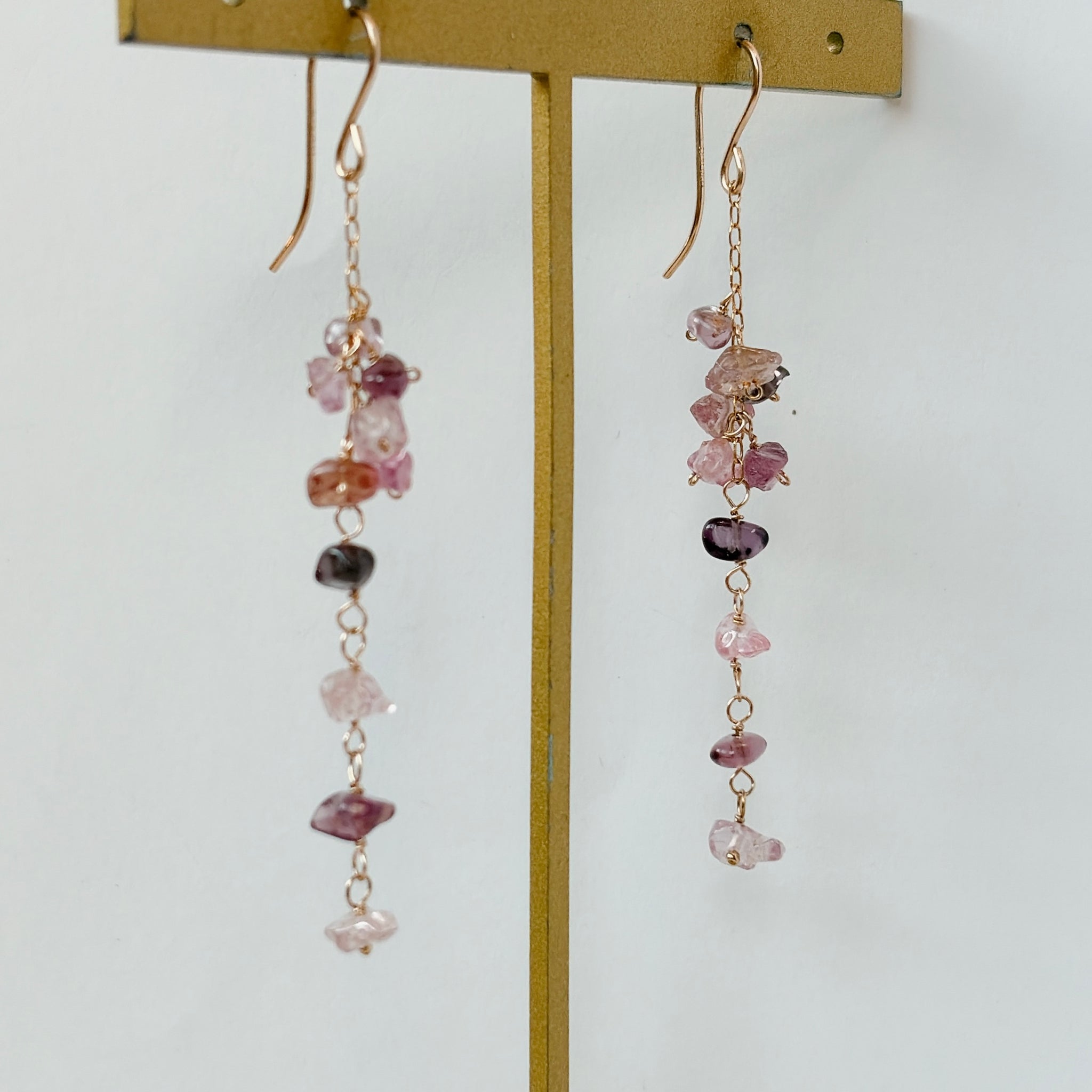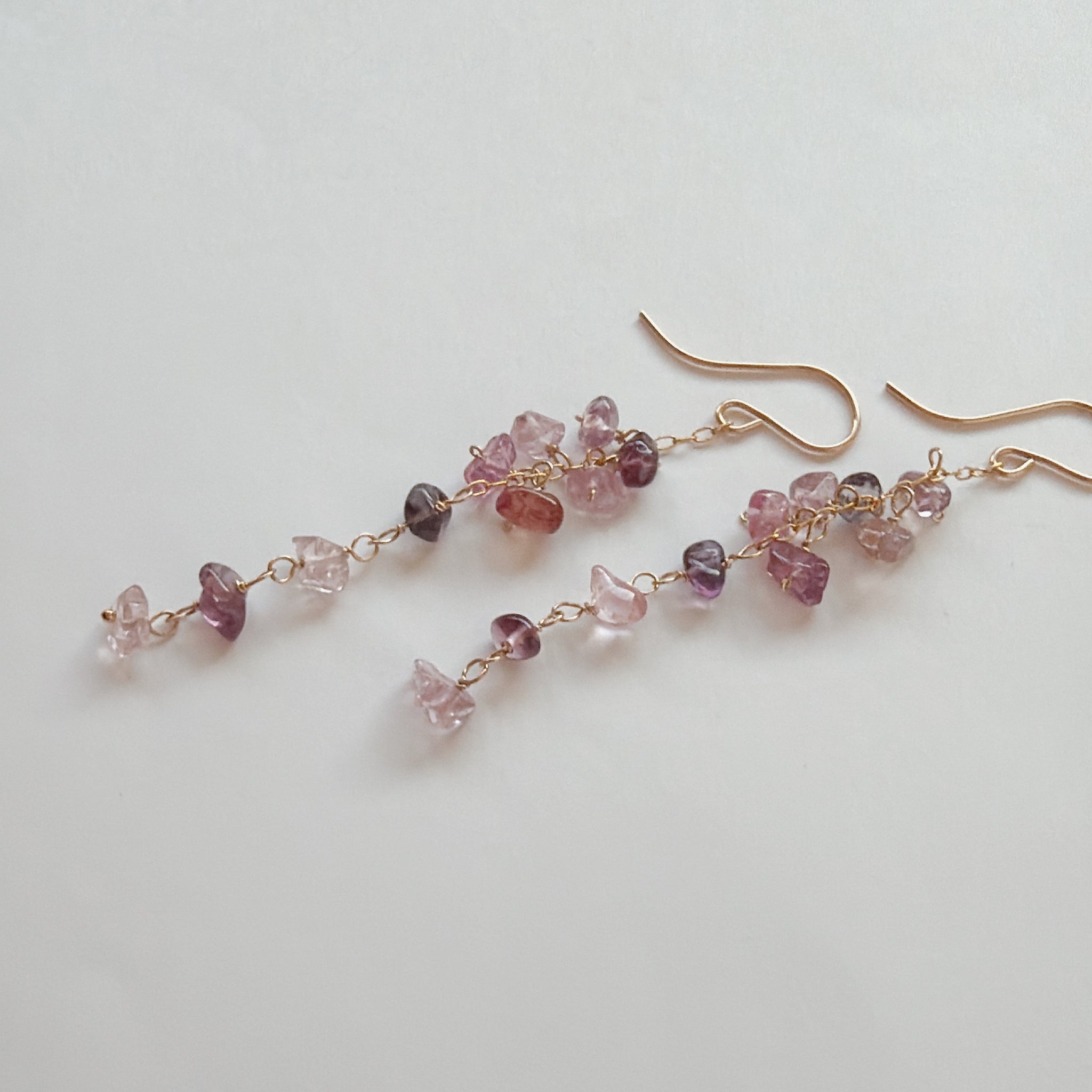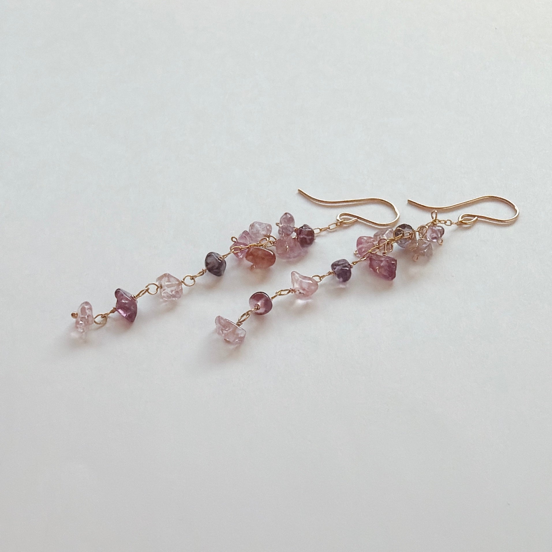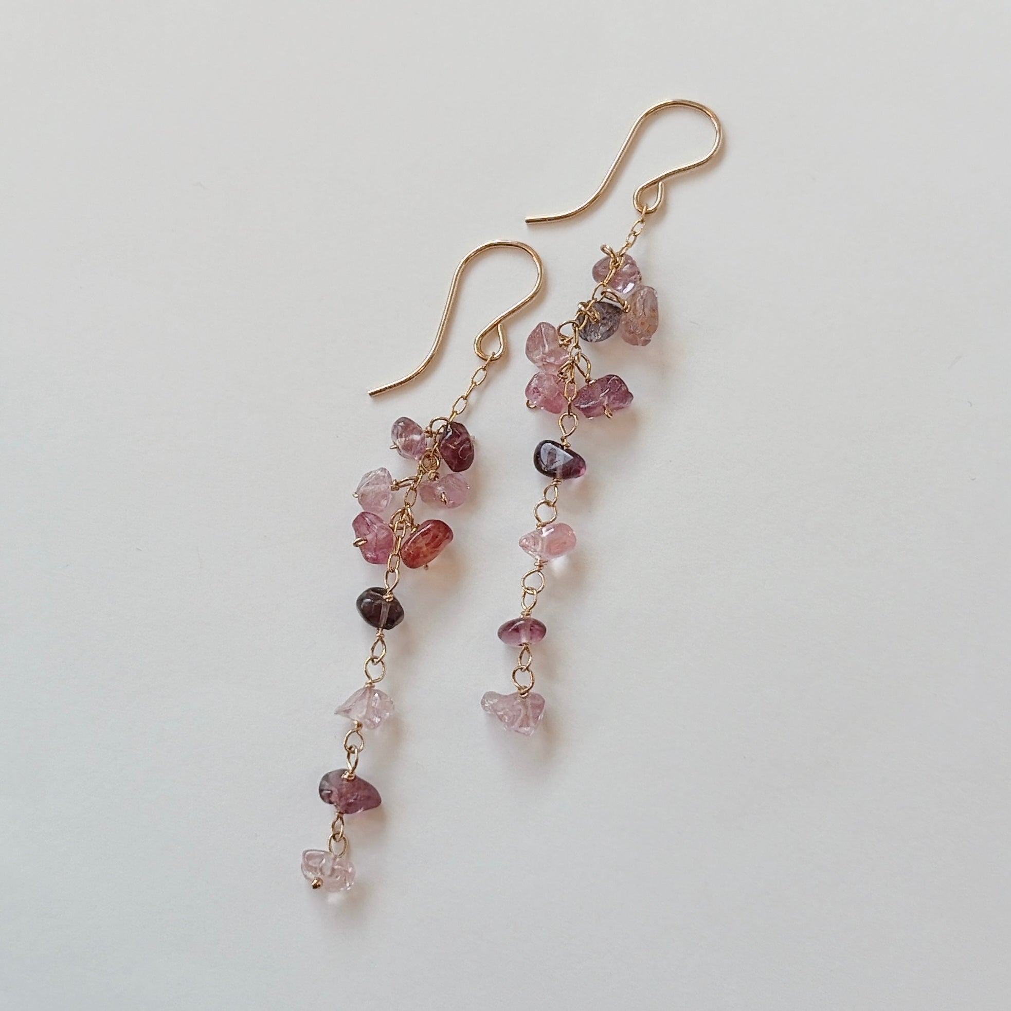 さまざまな表情を持つスピネルを、縦のラインに沿って丁寧に連ねたピアスです。