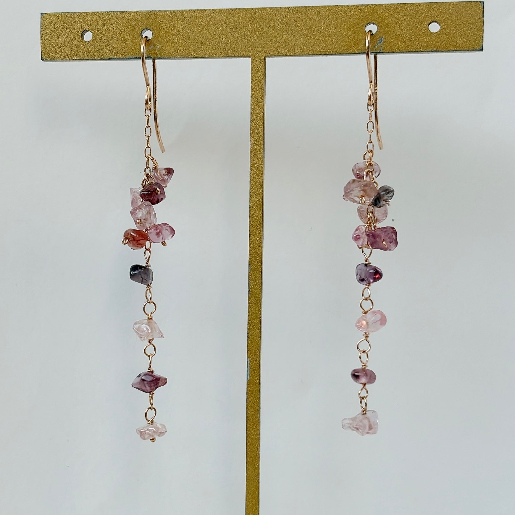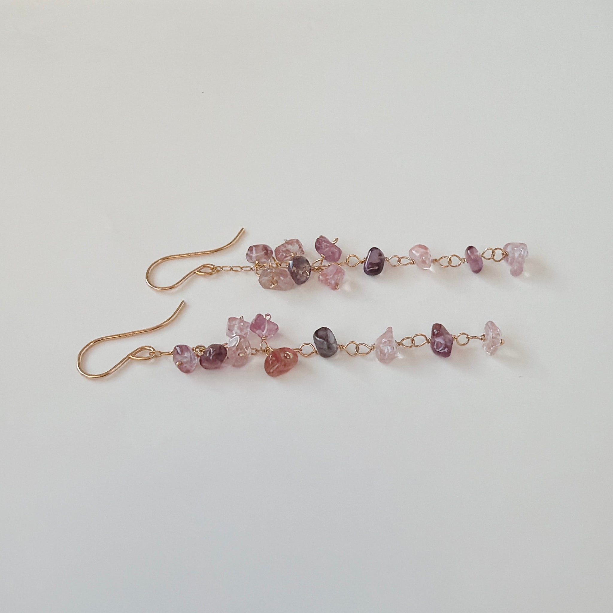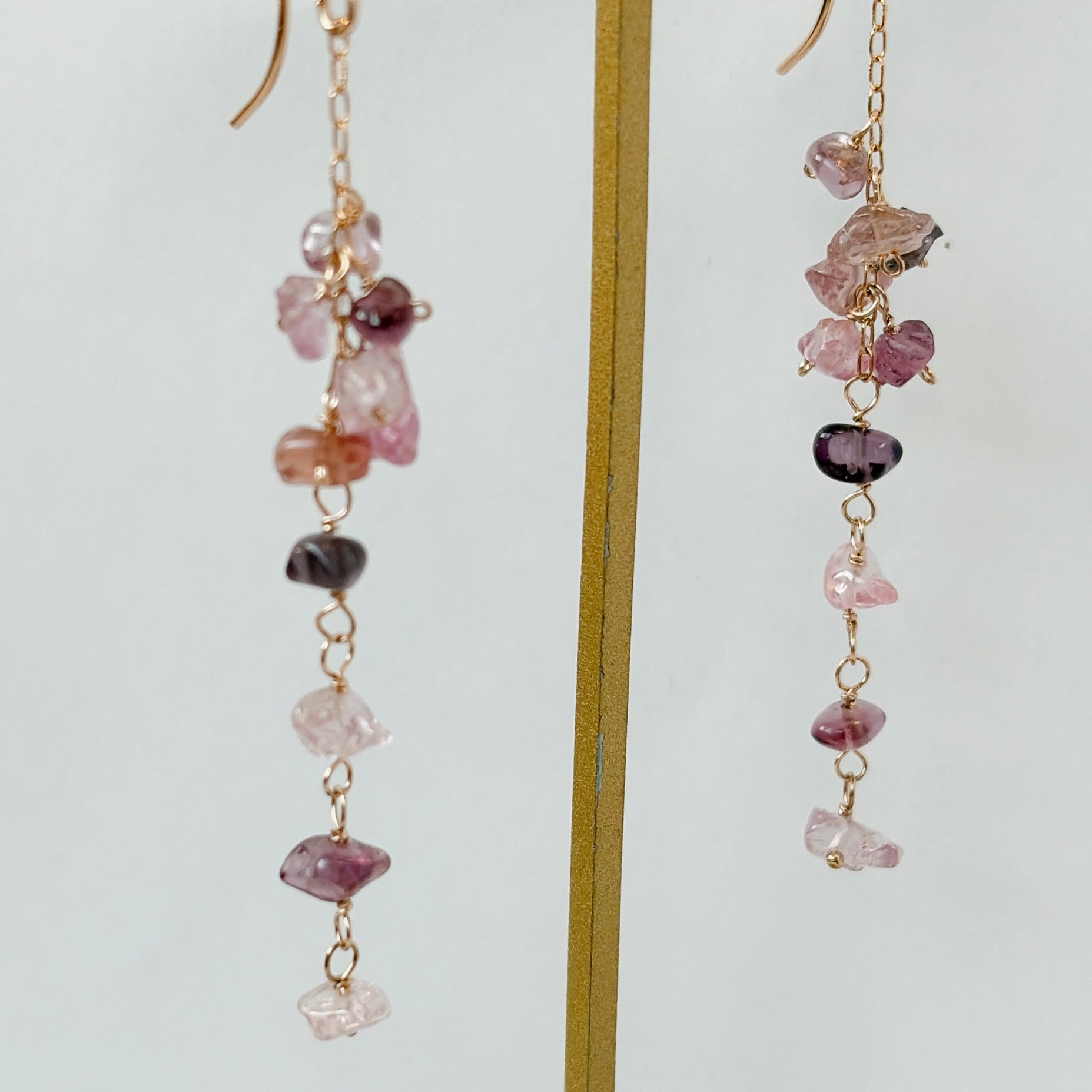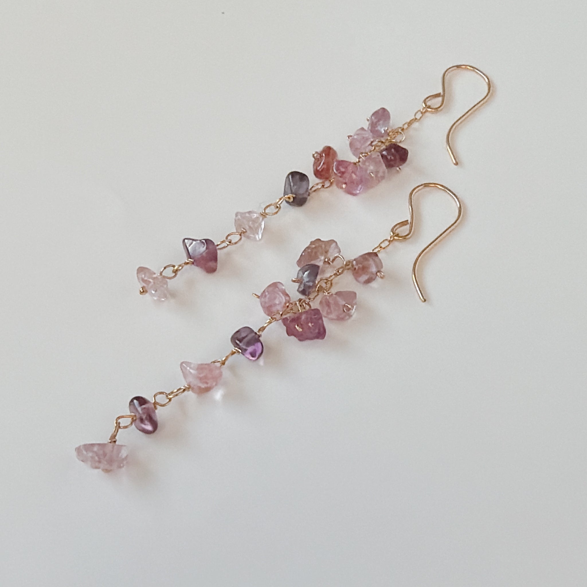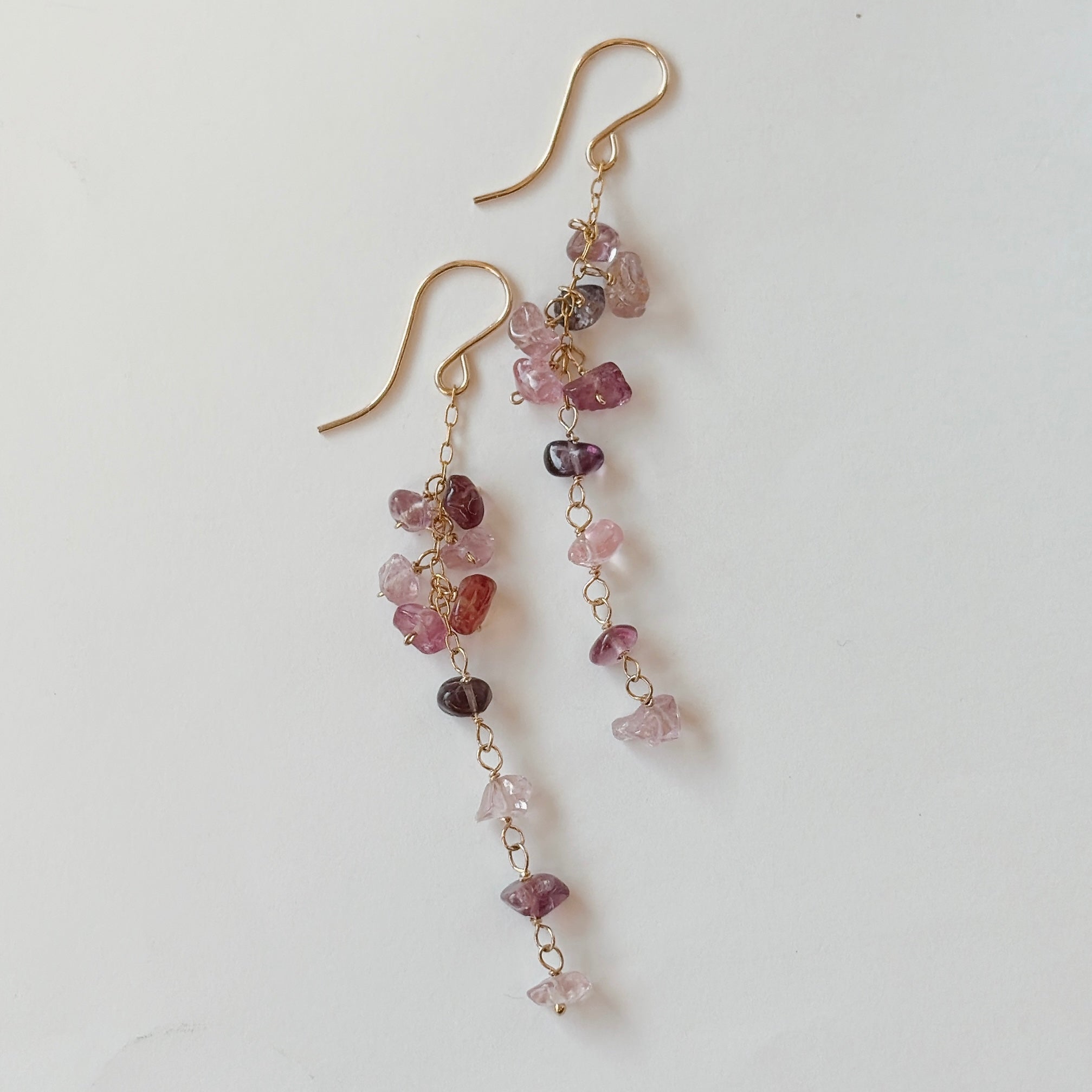 さまざまな表情を持つスピネルを、縦のラインに沿って丁寧に連ねたピアスです。