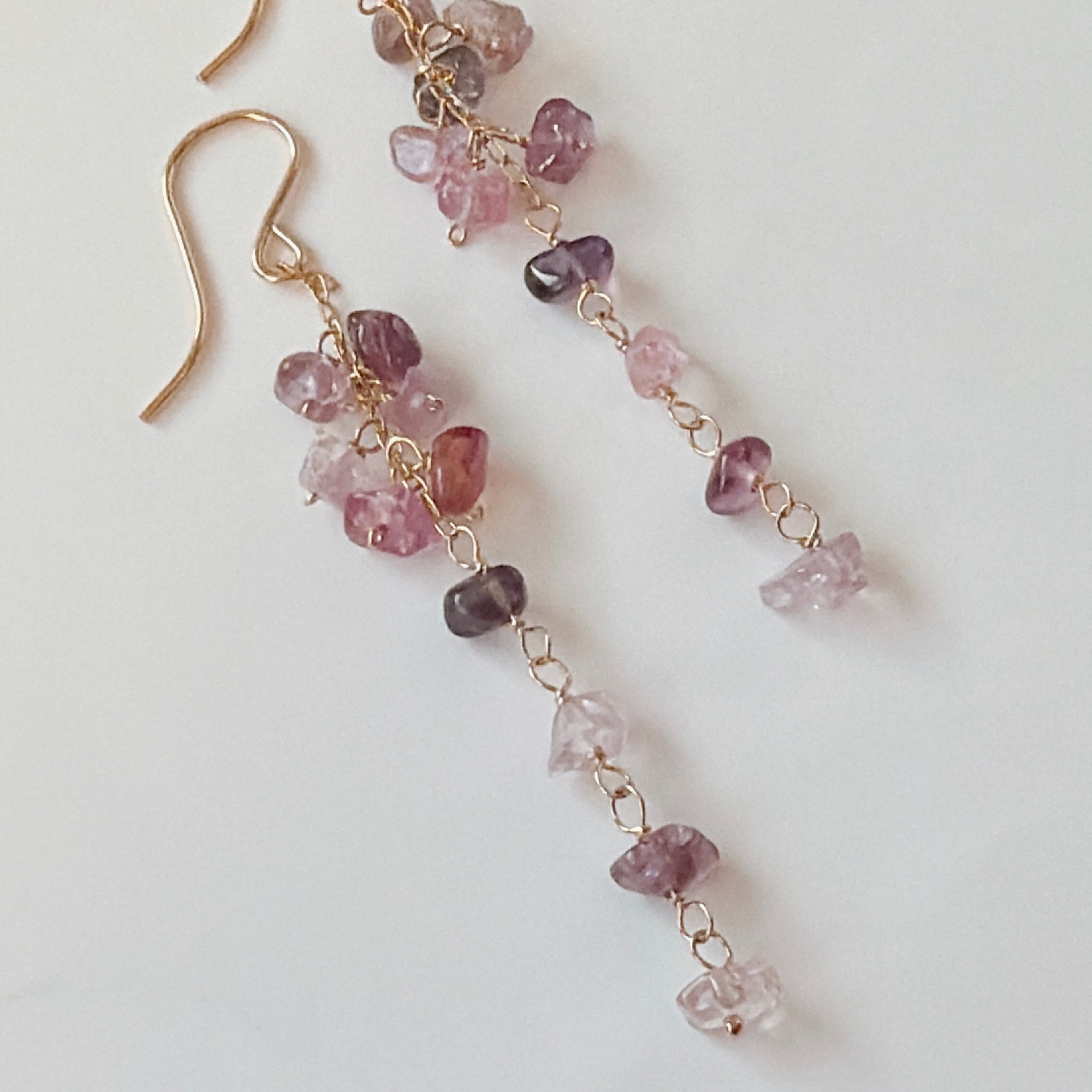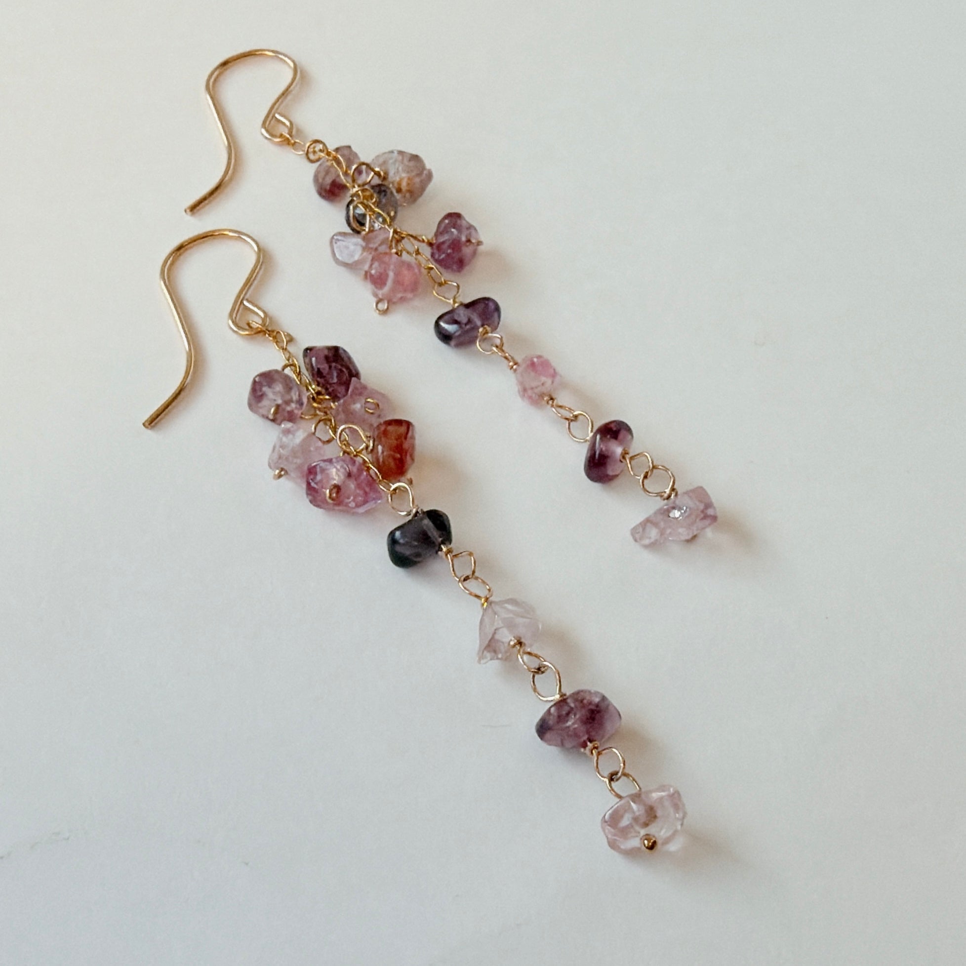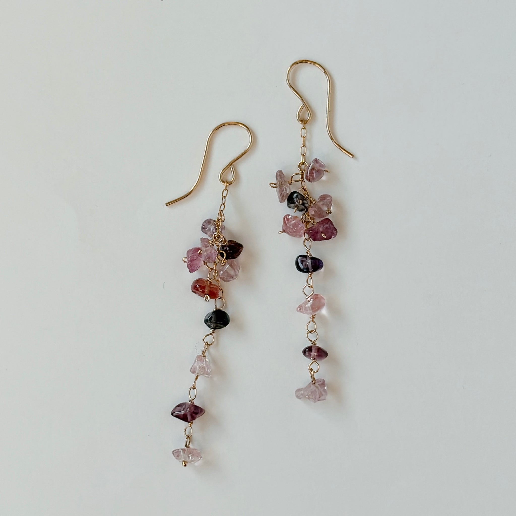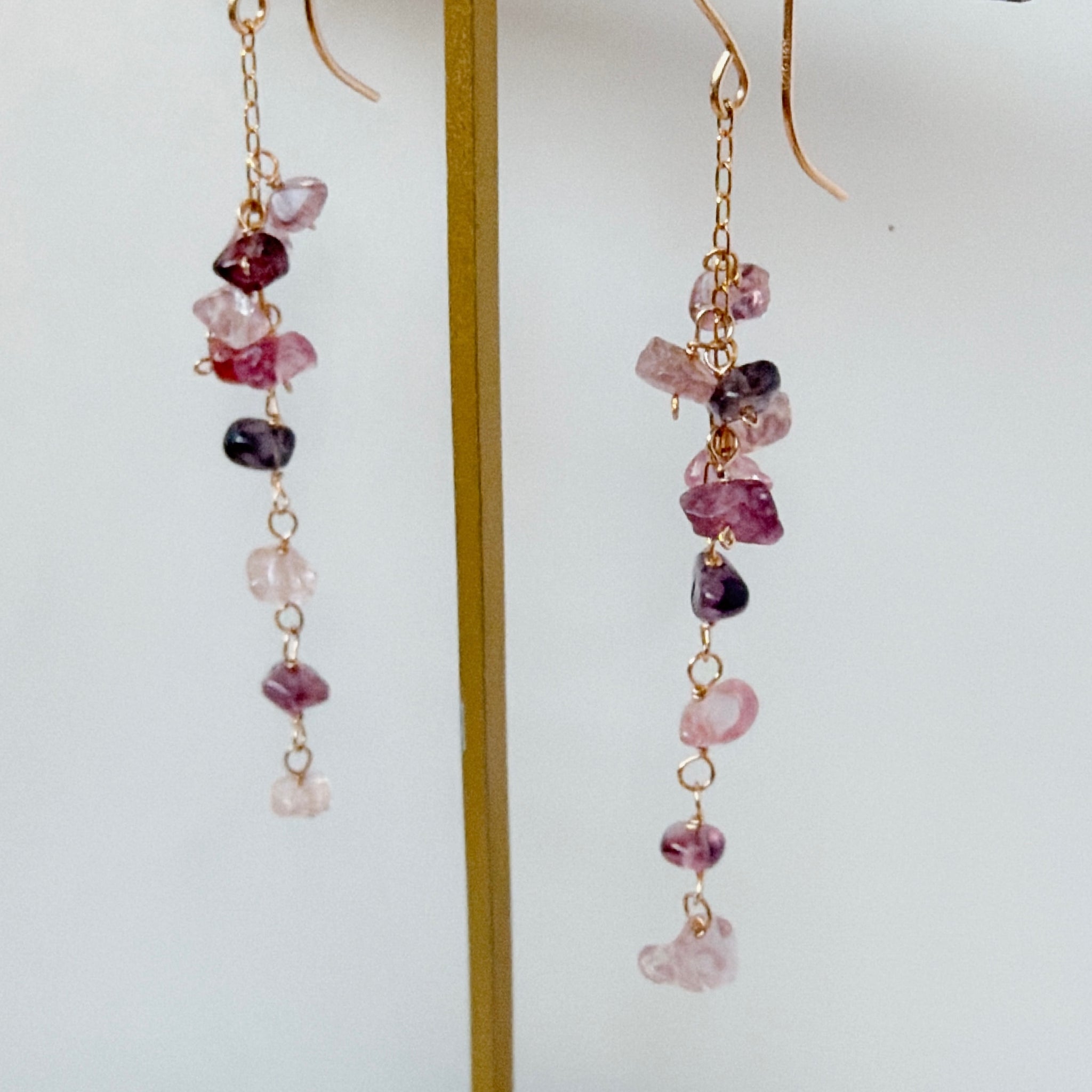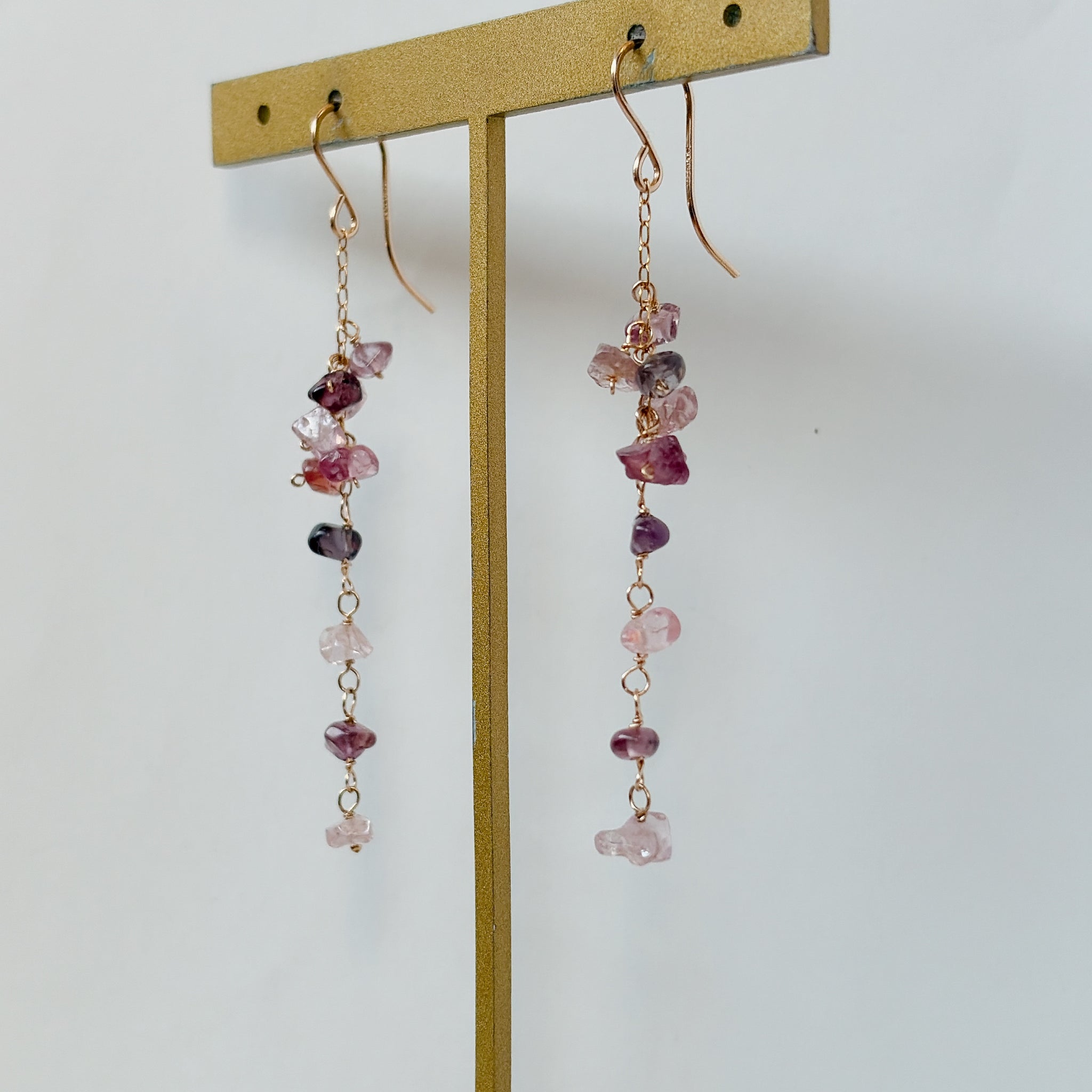 さまざまな表情を持つスピネルを、縦のラインに沿って丁寧に連ねたピアスです。