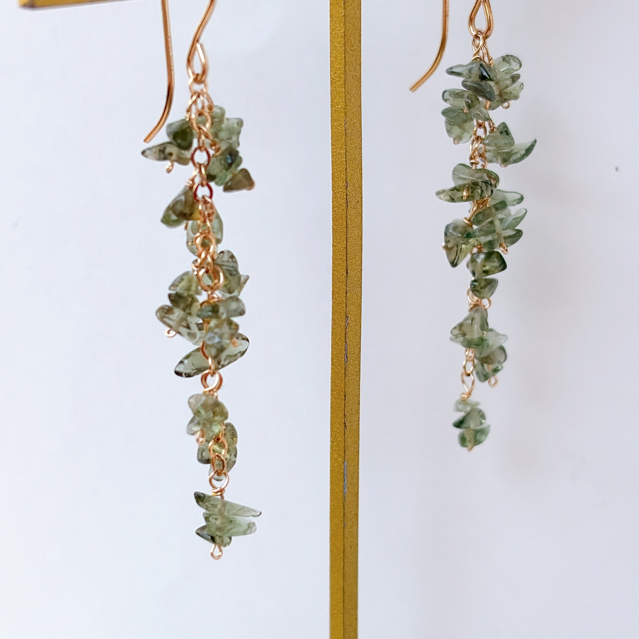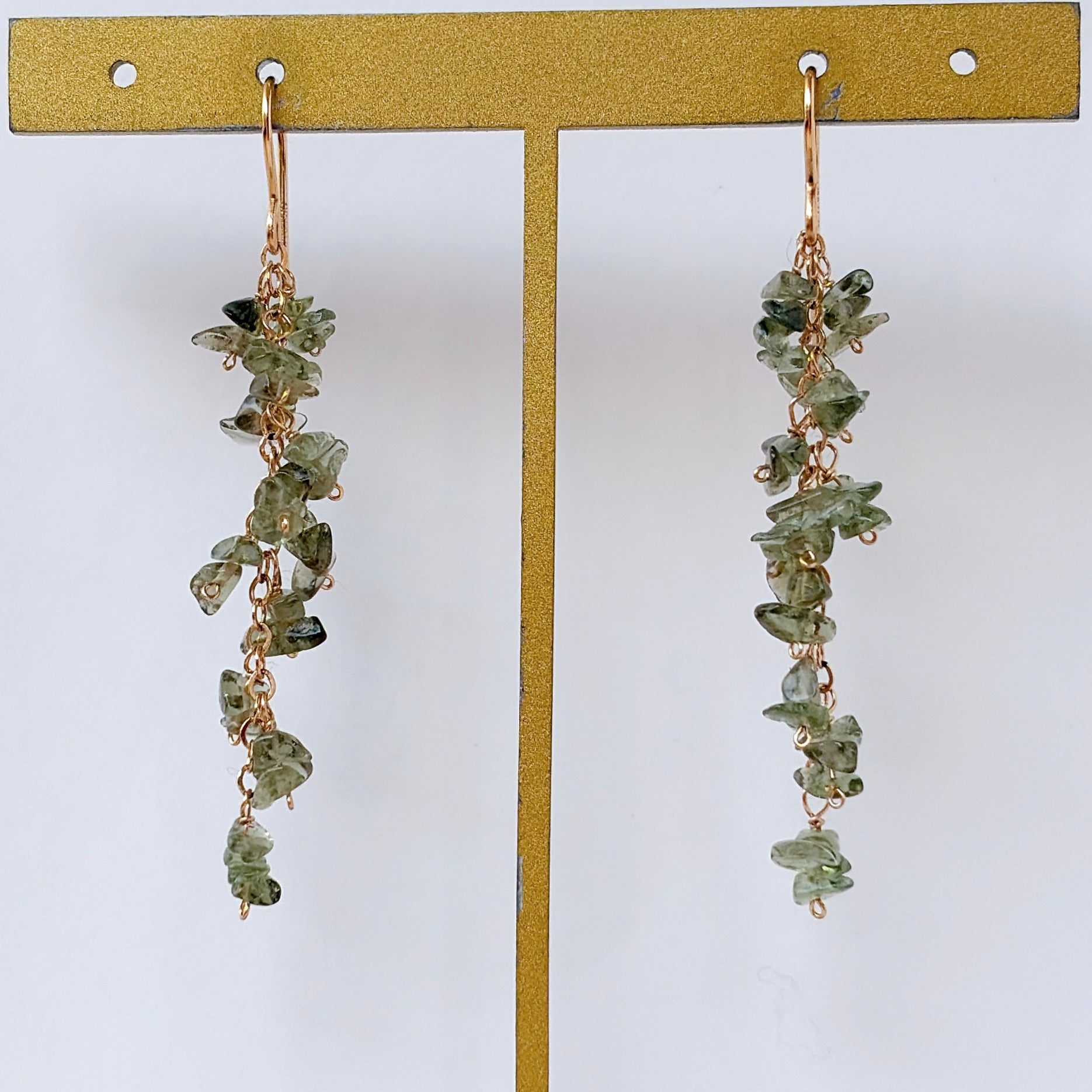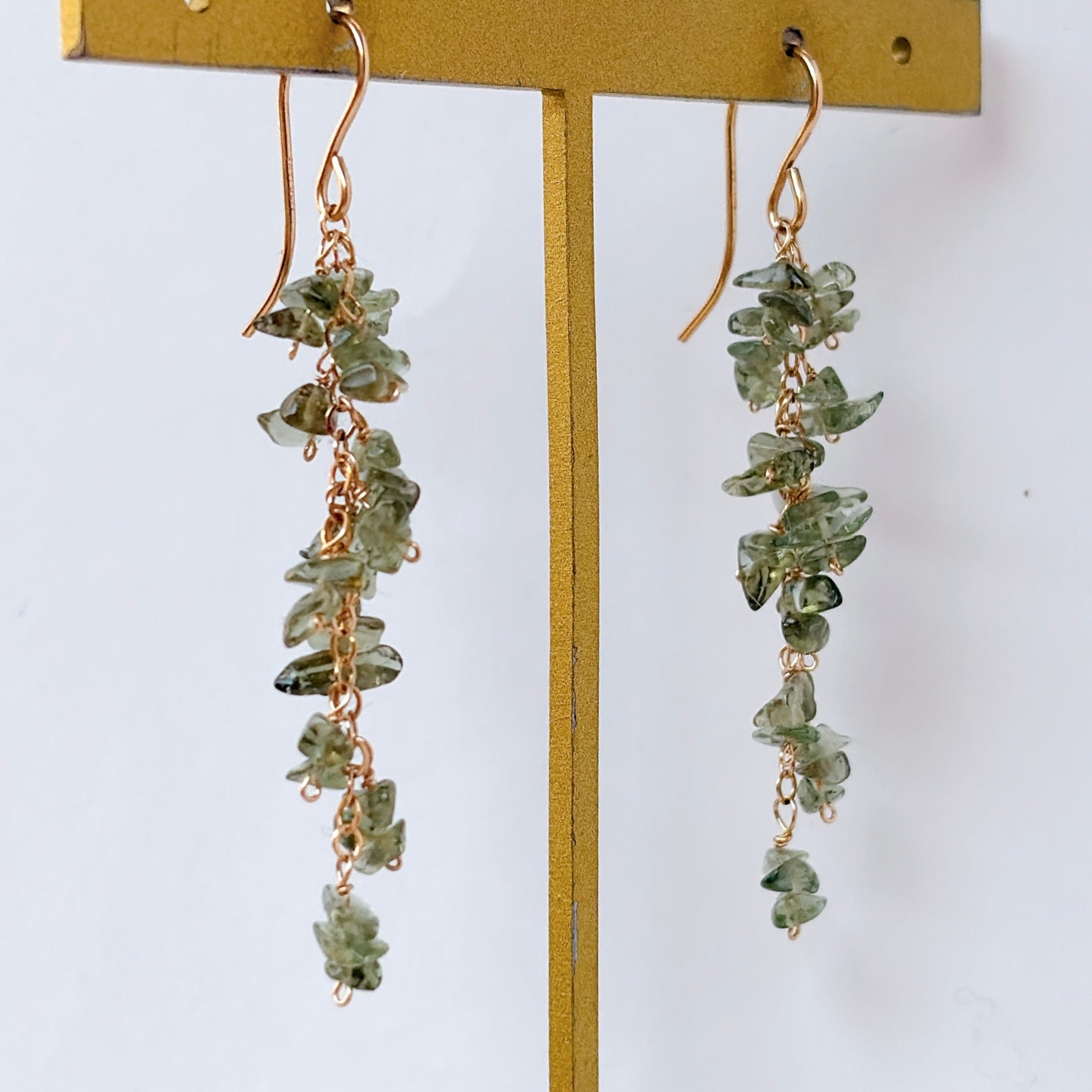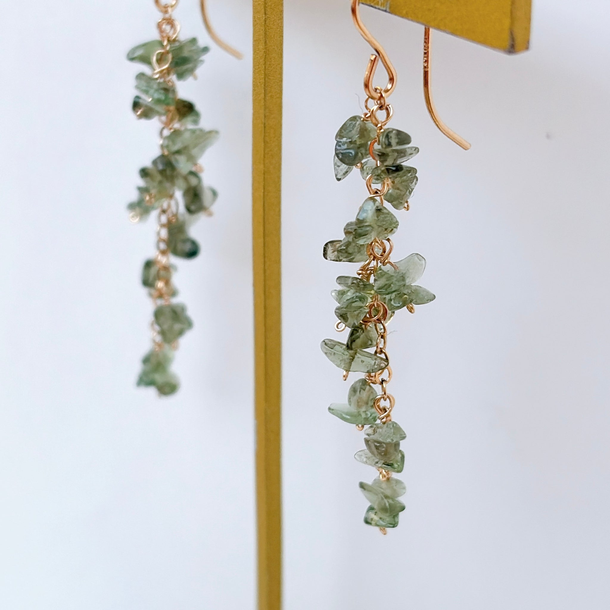 モルダバイトのラフチップを連ね、流れるような縦のラインに仕立てたピアスです。
