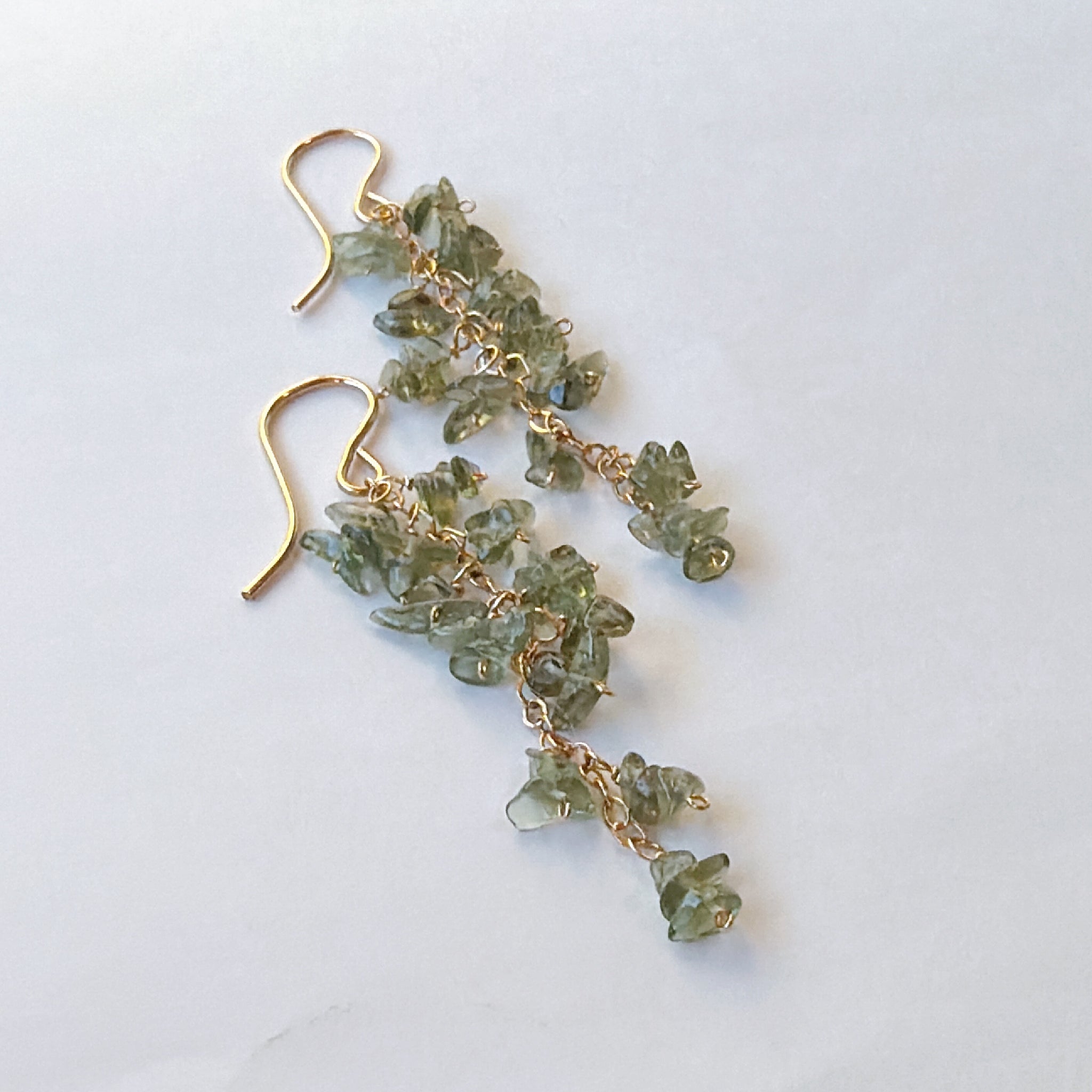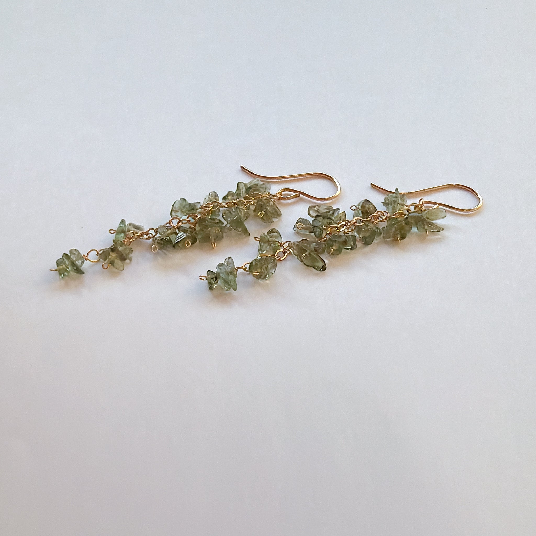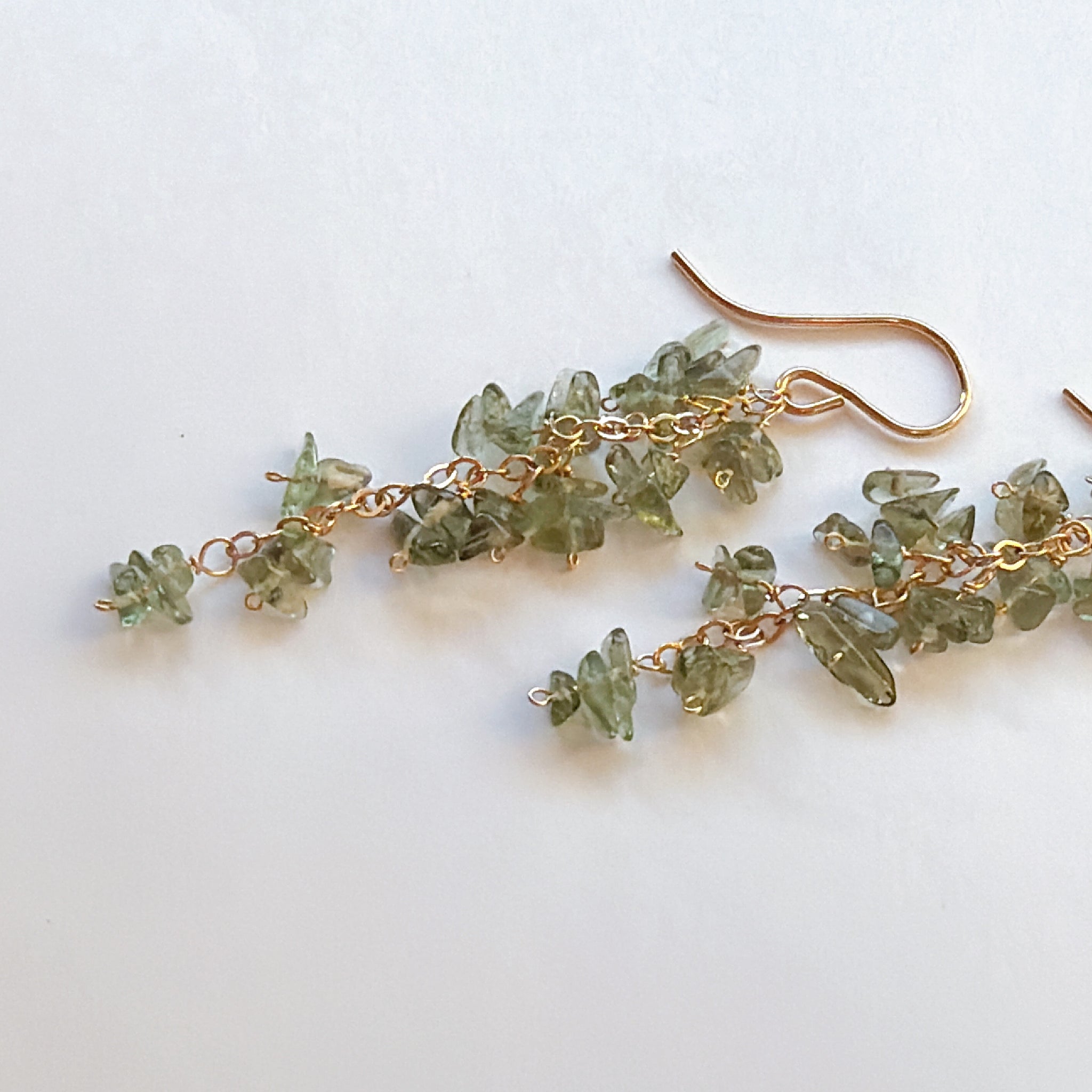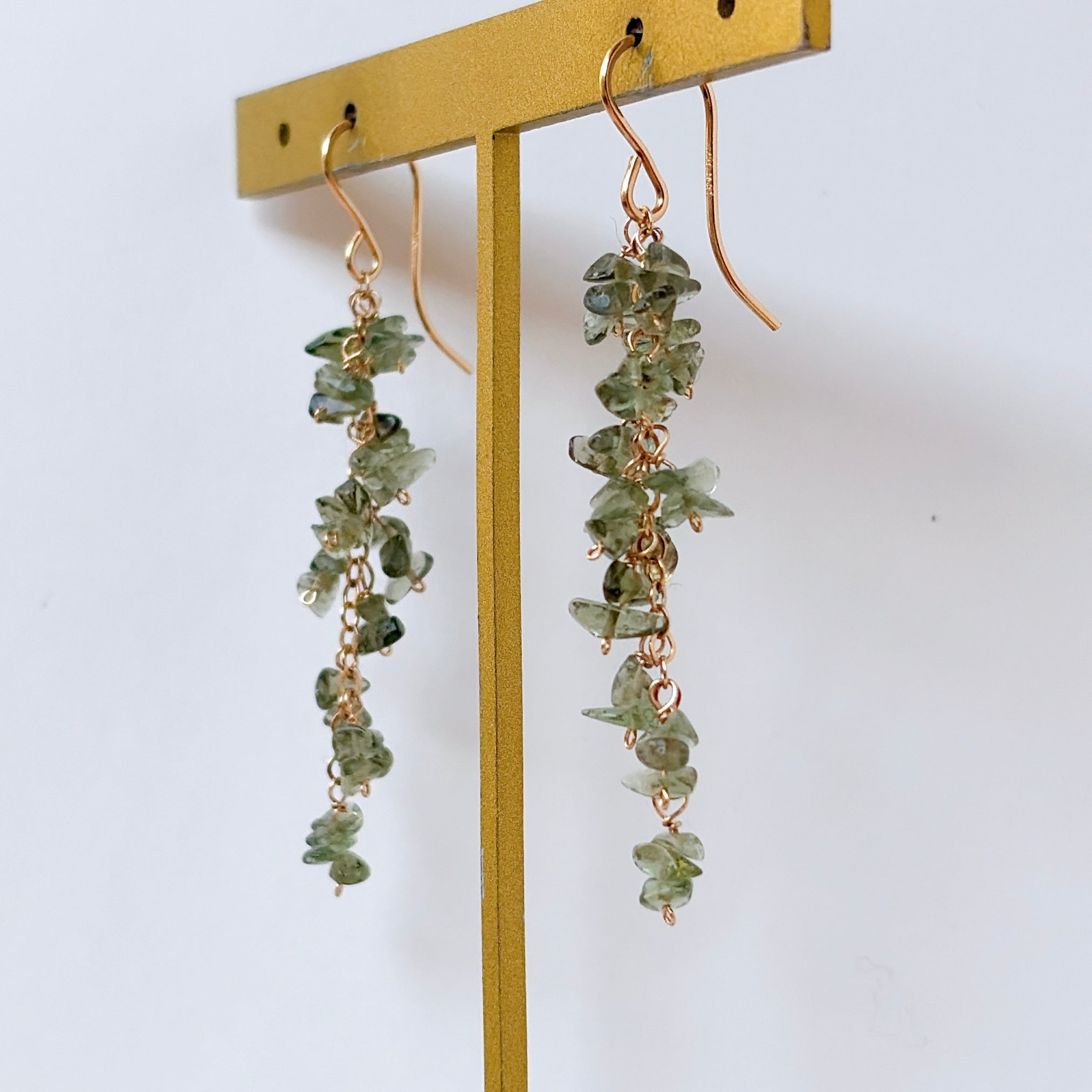 モルダバイトのラフチップを連ね、流れるような縦のラインに仕立てたピアスです。