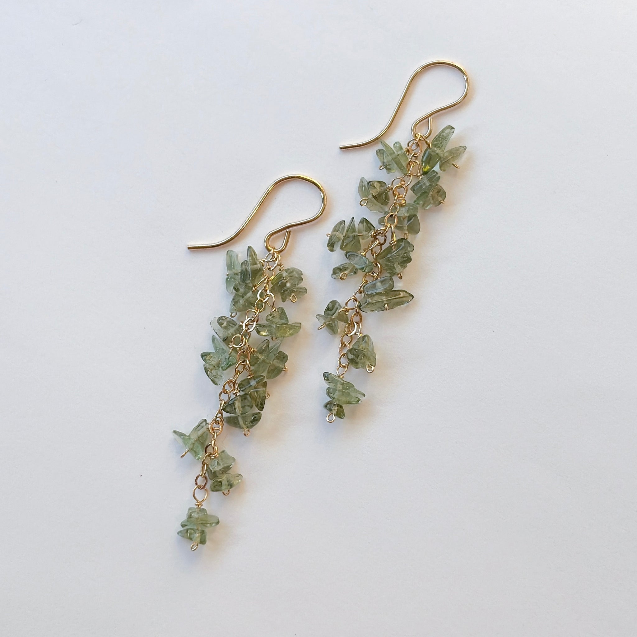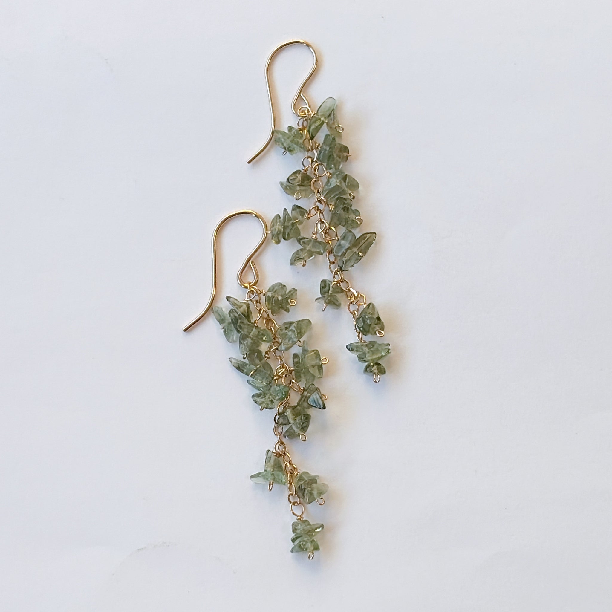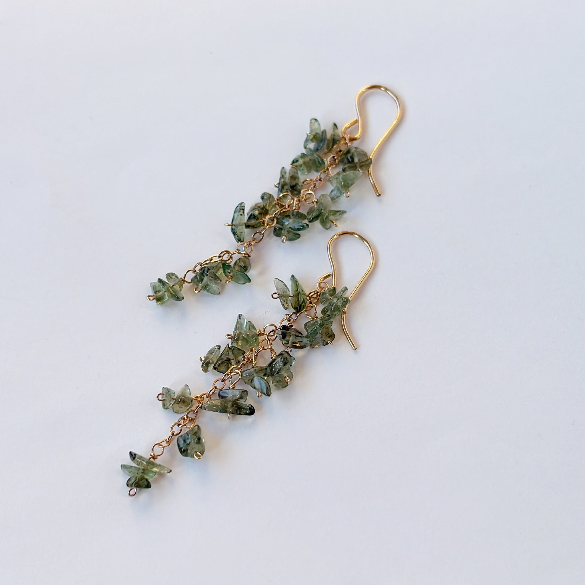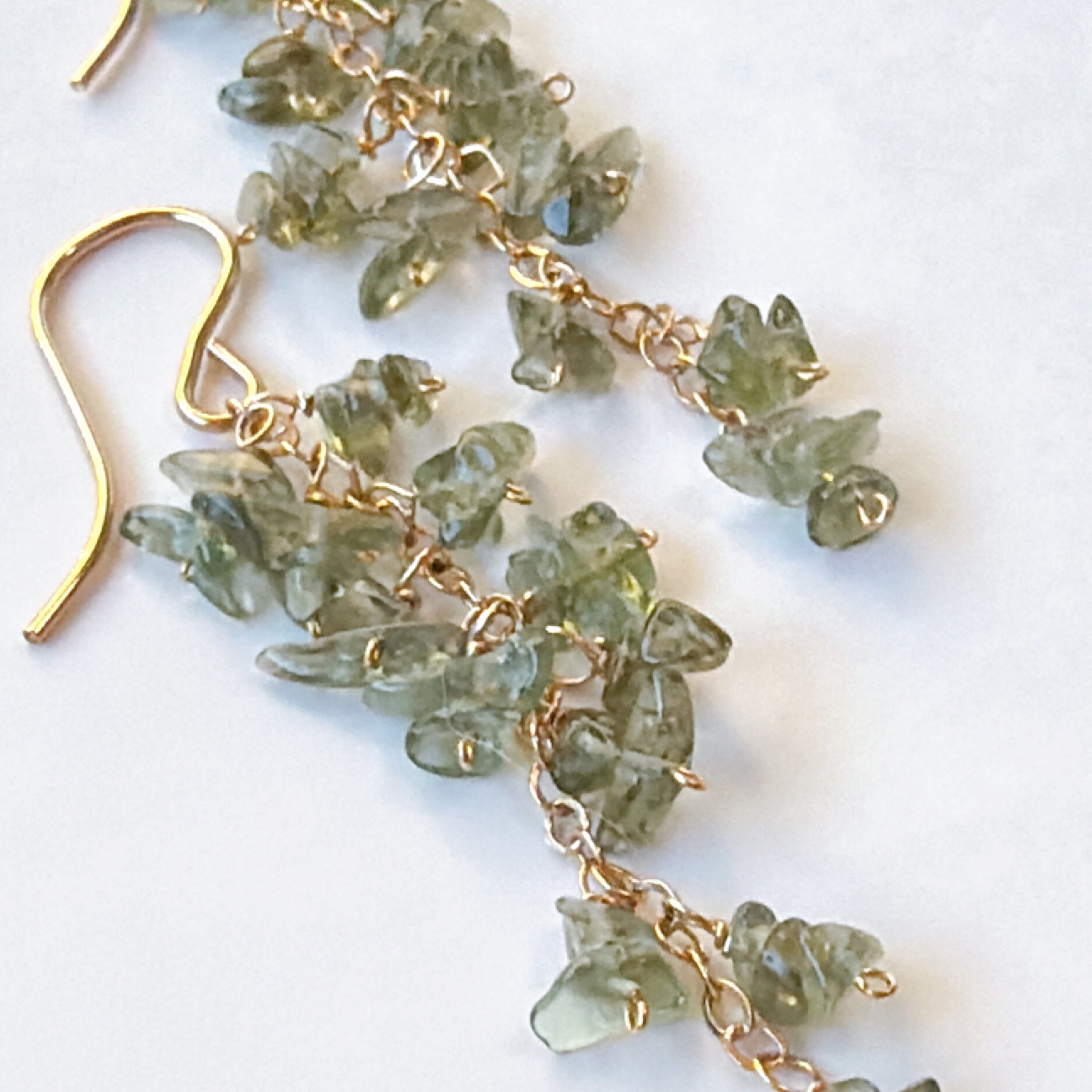 モルダバイトのラフチップを連ね、流れるような縦のラインに仕立てたピアスです。