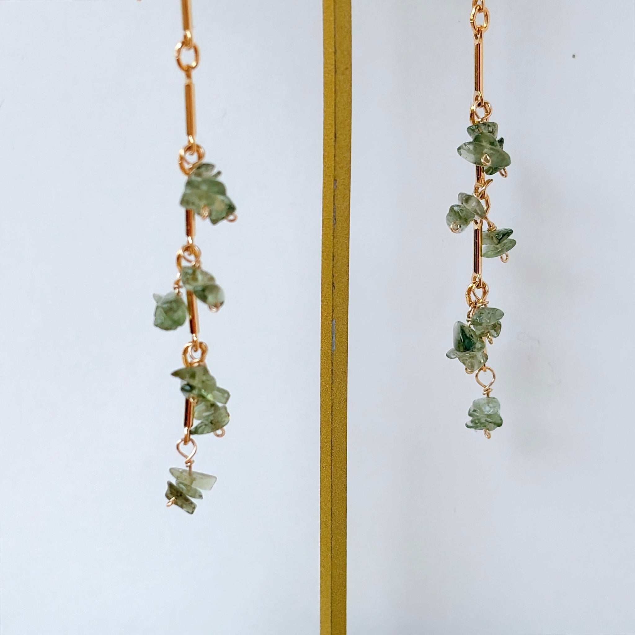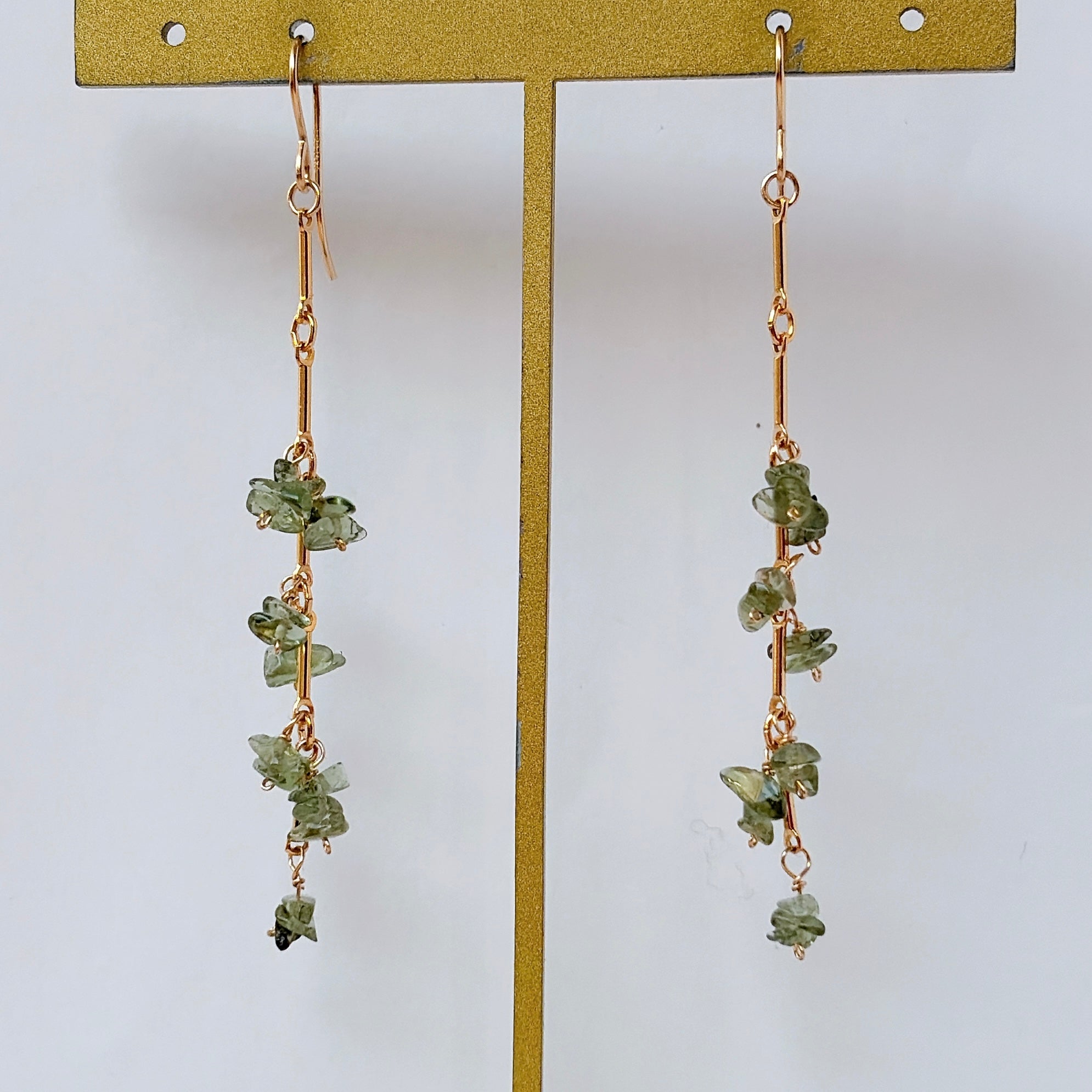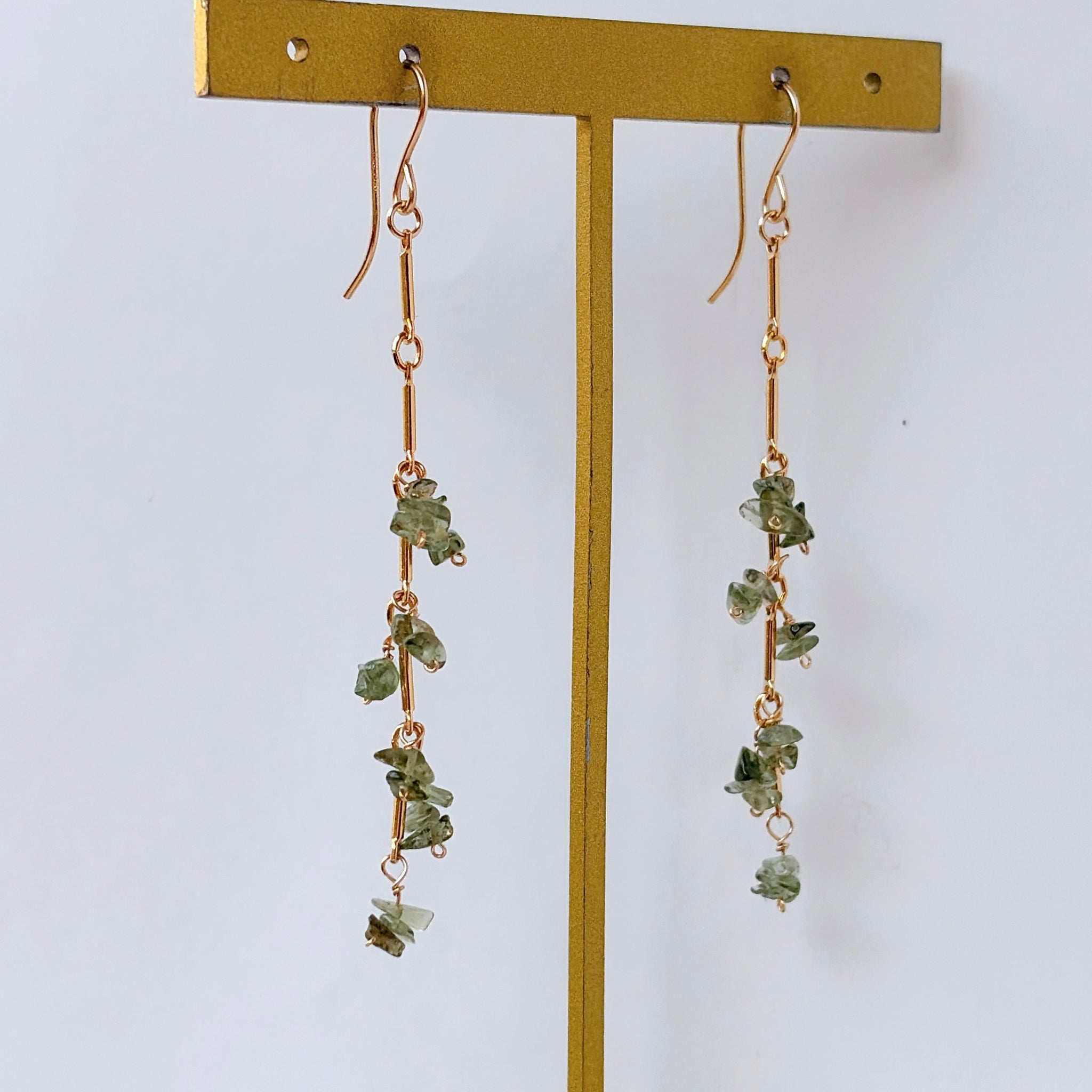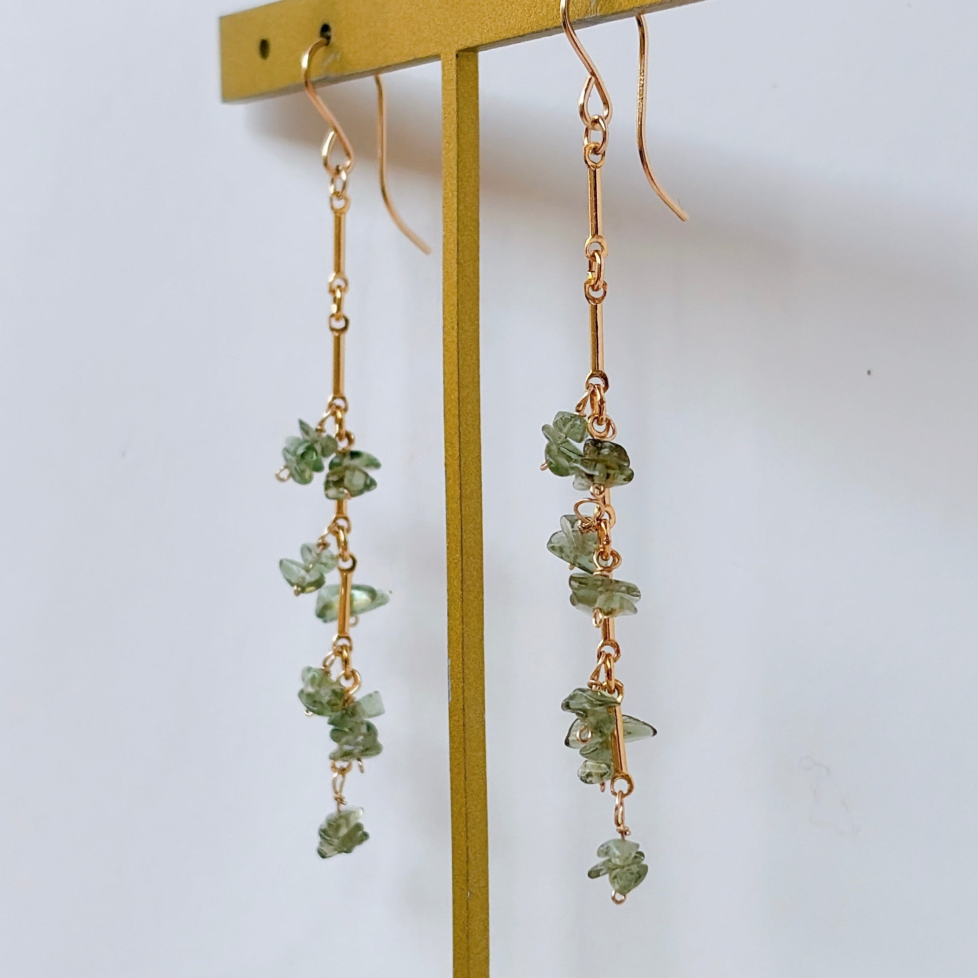 縦のラインを強調したデザインに、モルダバイトのラフチップをリズミカルに配置したピアスです。