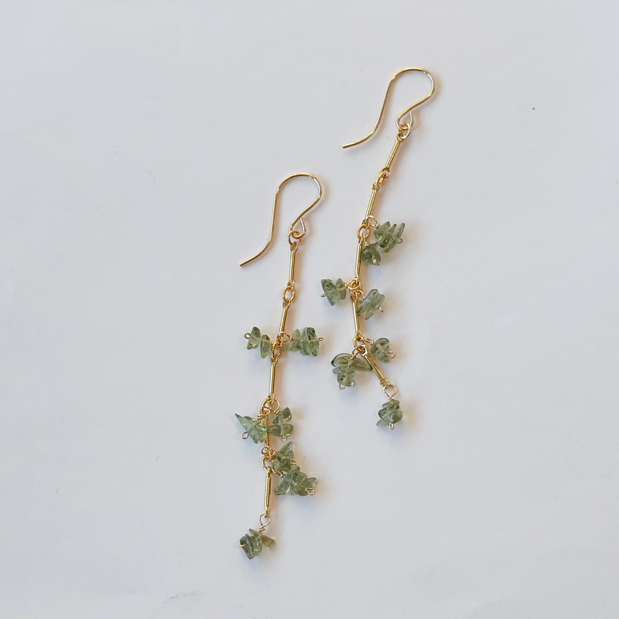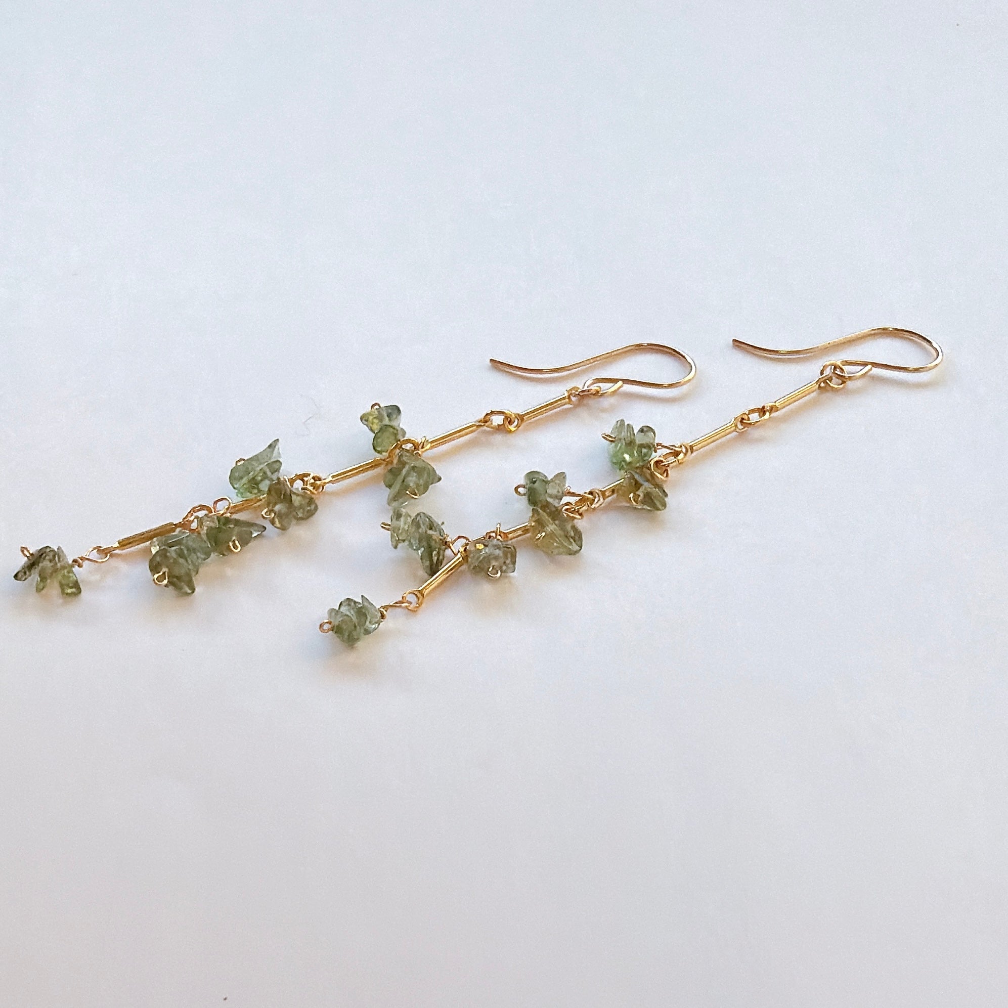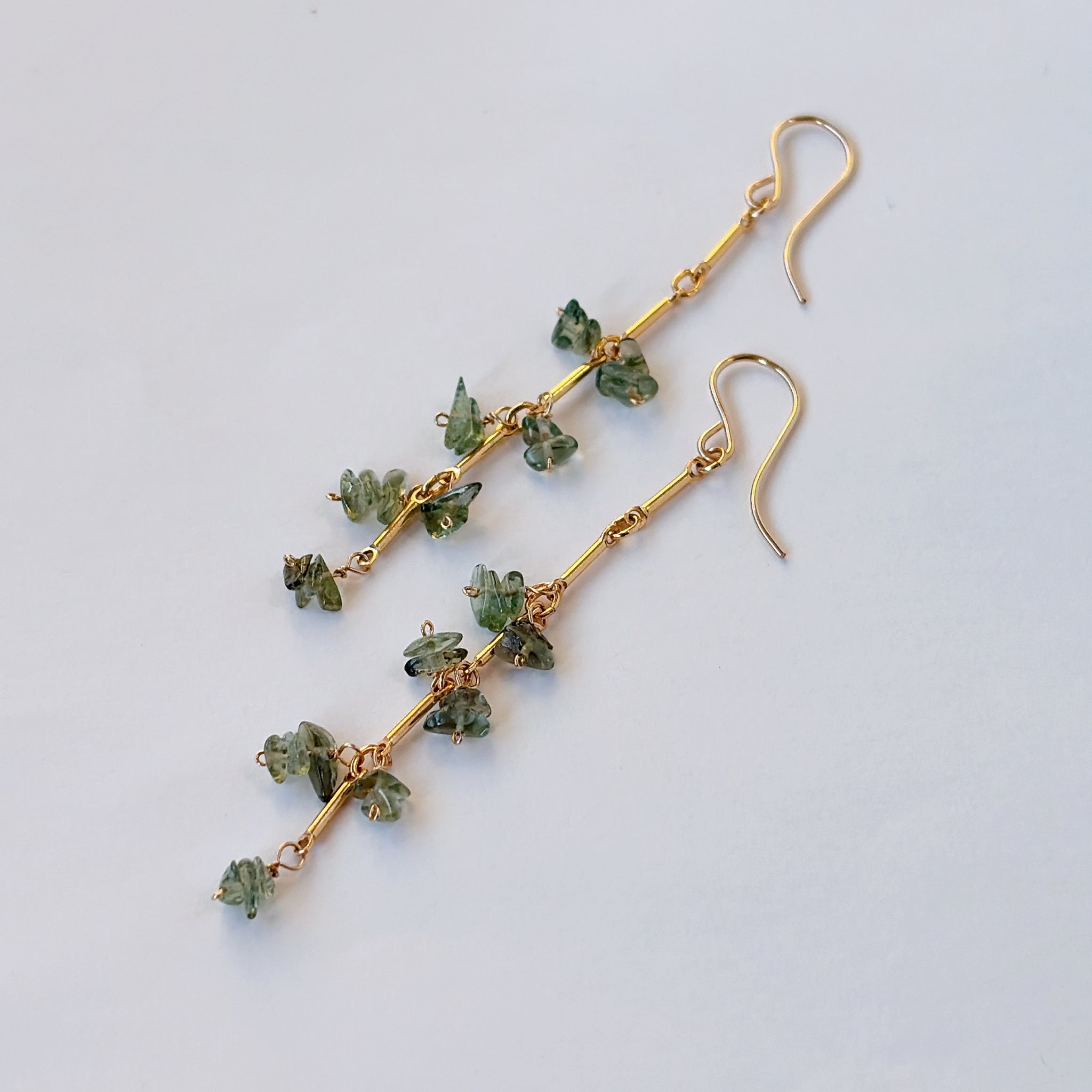縦のラインを強調したデザインに、モルダバイトのラフチップをリズミカルに配置したピアスです。