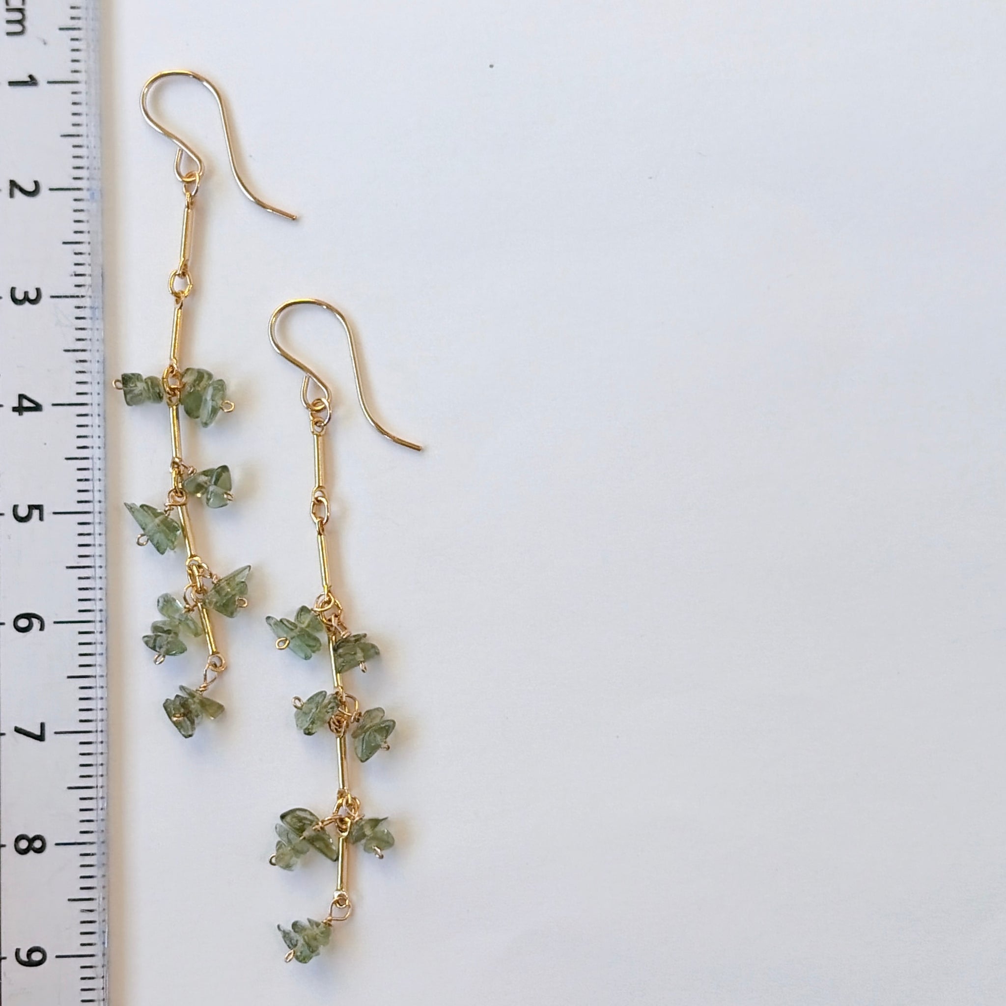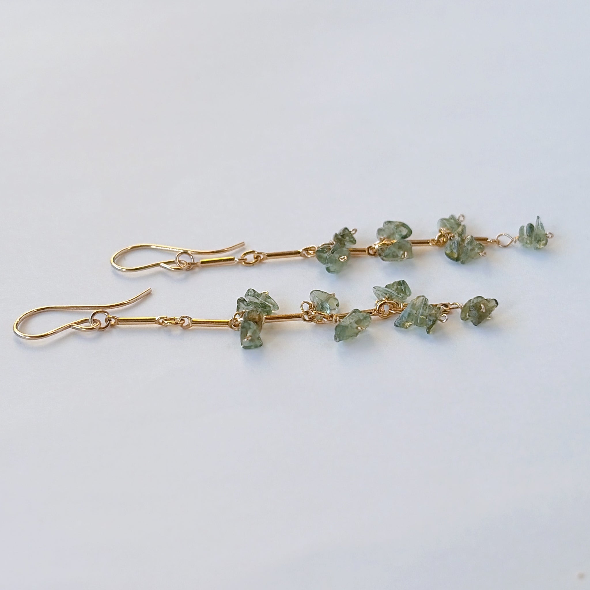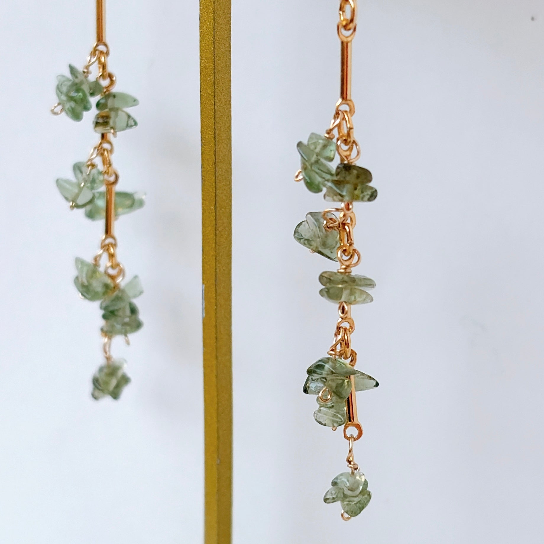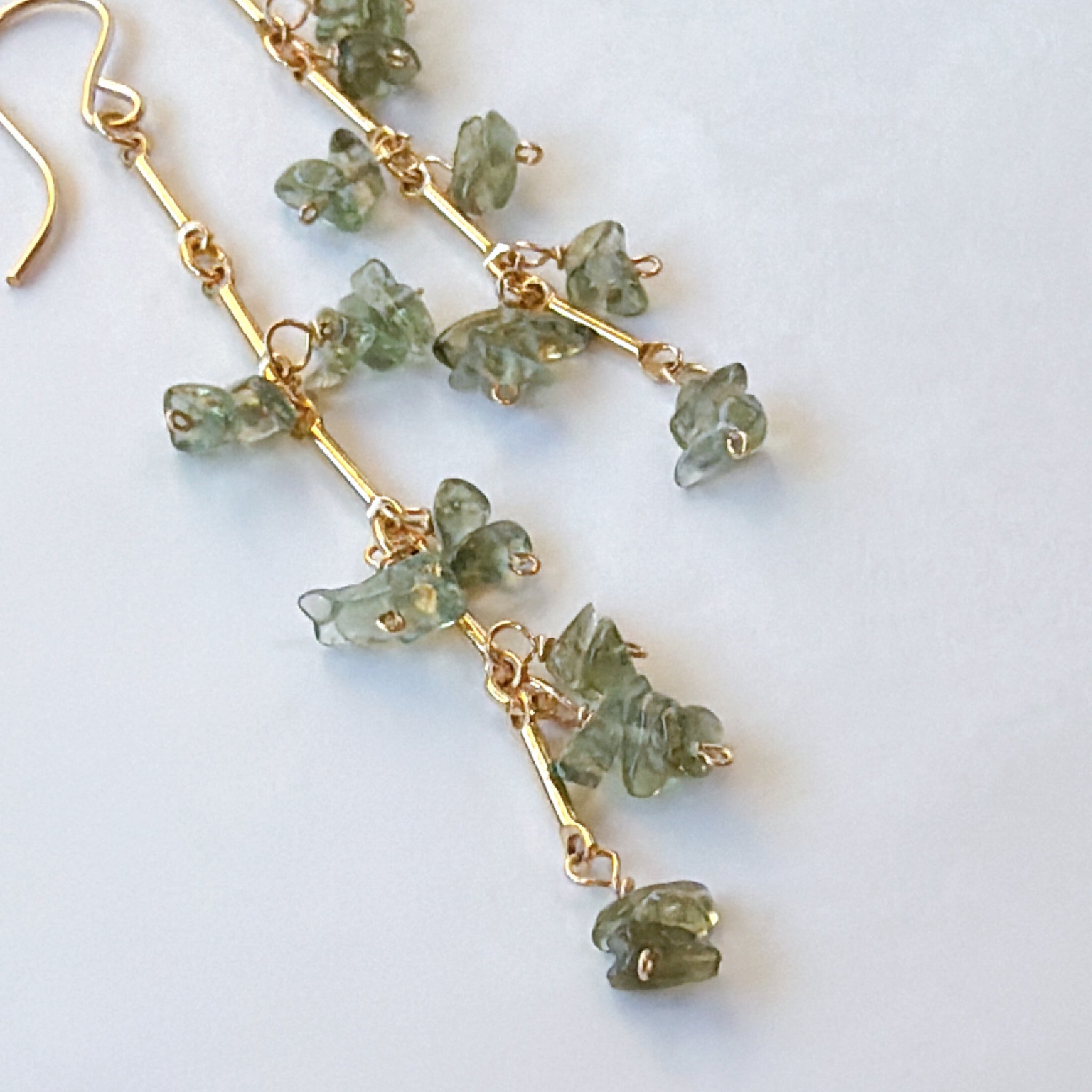 縦のラインを強調したデザインに、モルダバイトのラフチップをリズミカルに配置したピアスです。