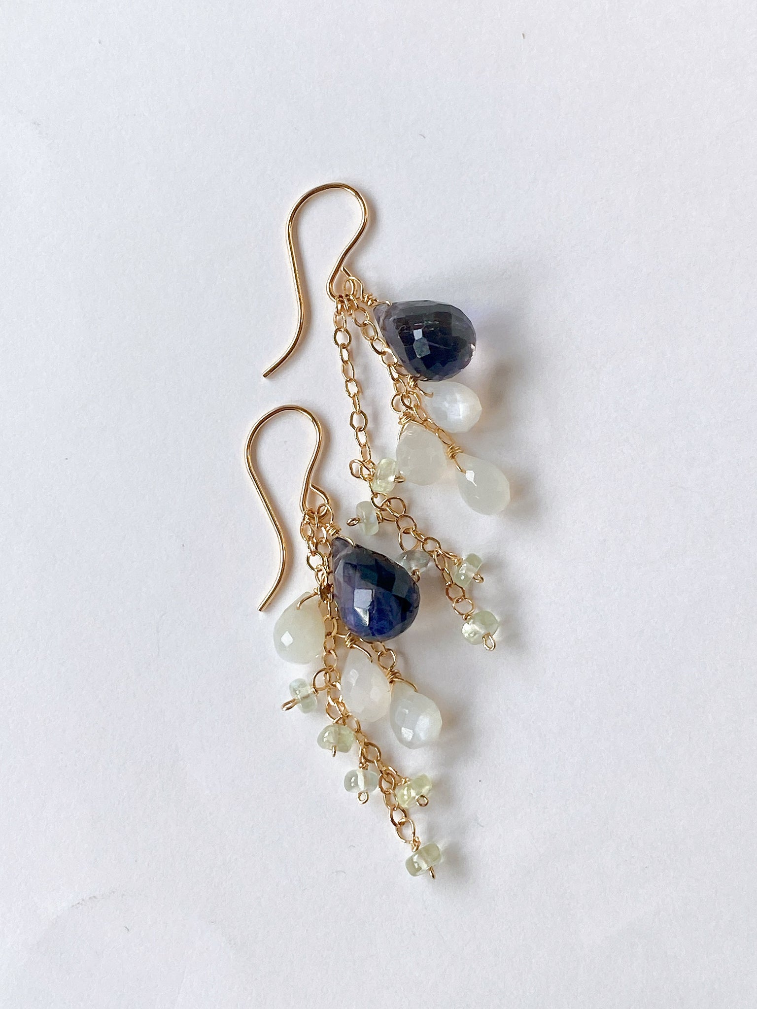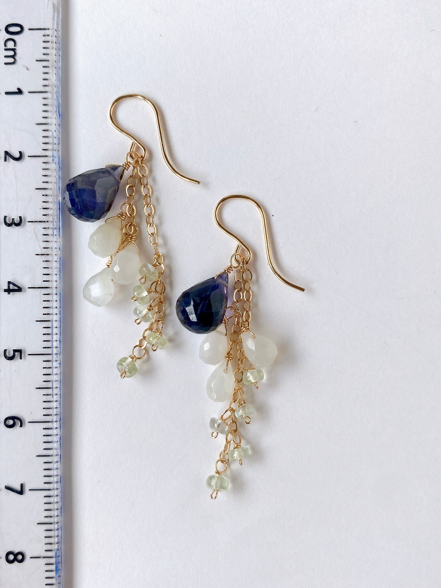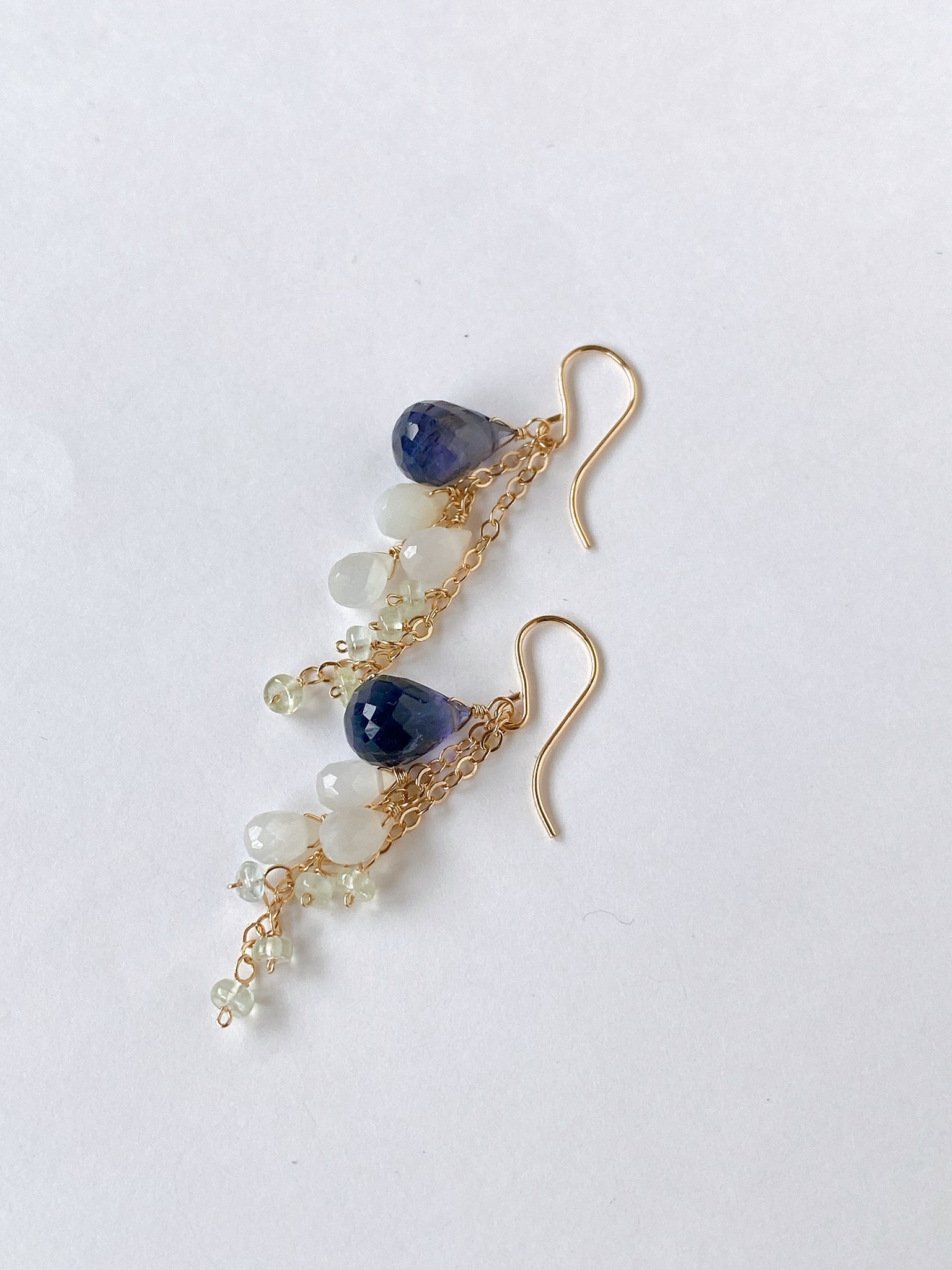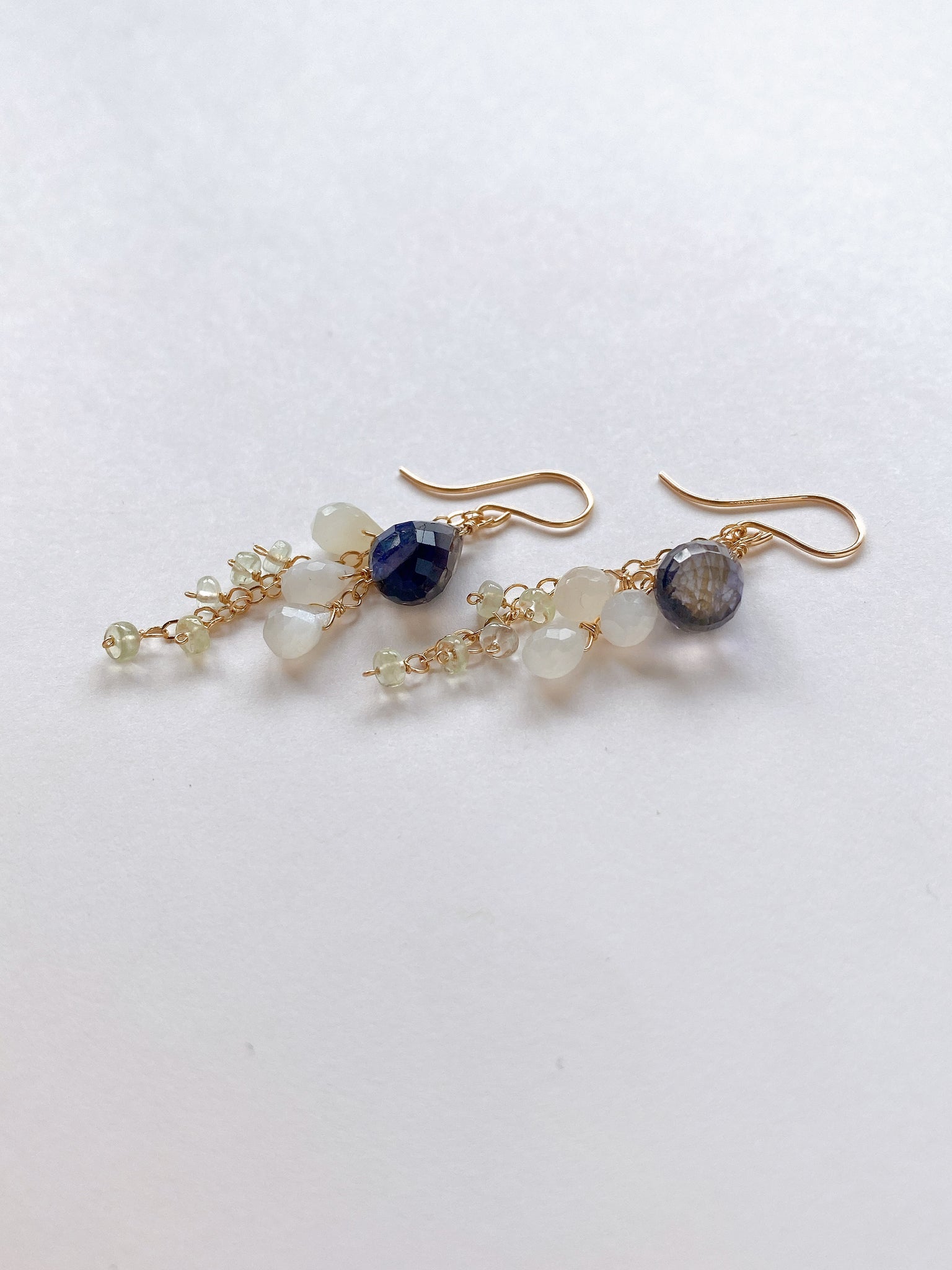 ドロップカットのアイオライトとホワイトムーンストーン、つるんとしたロンデルカットのクリソベリルを使ってデザインした耳飾りです。