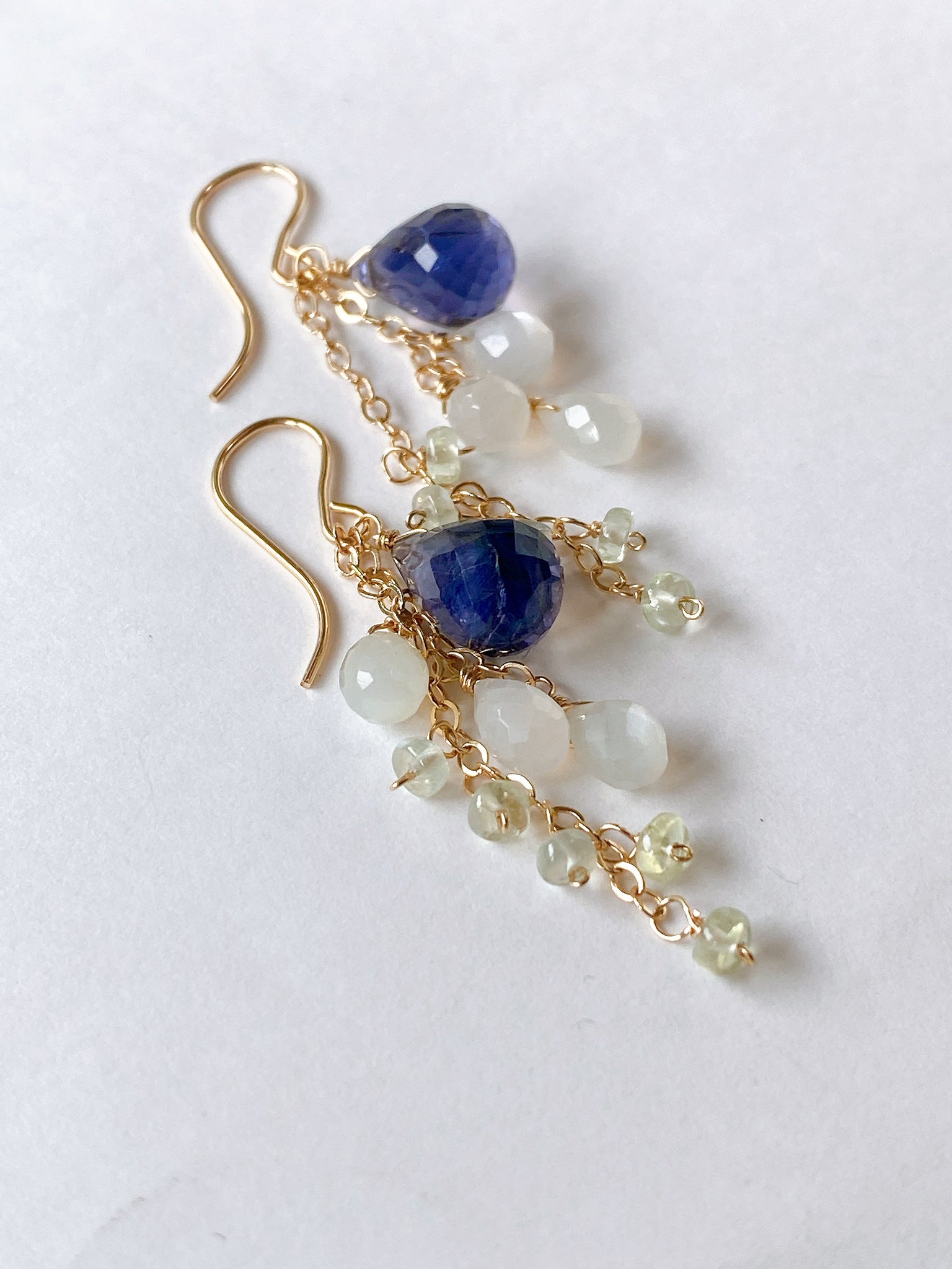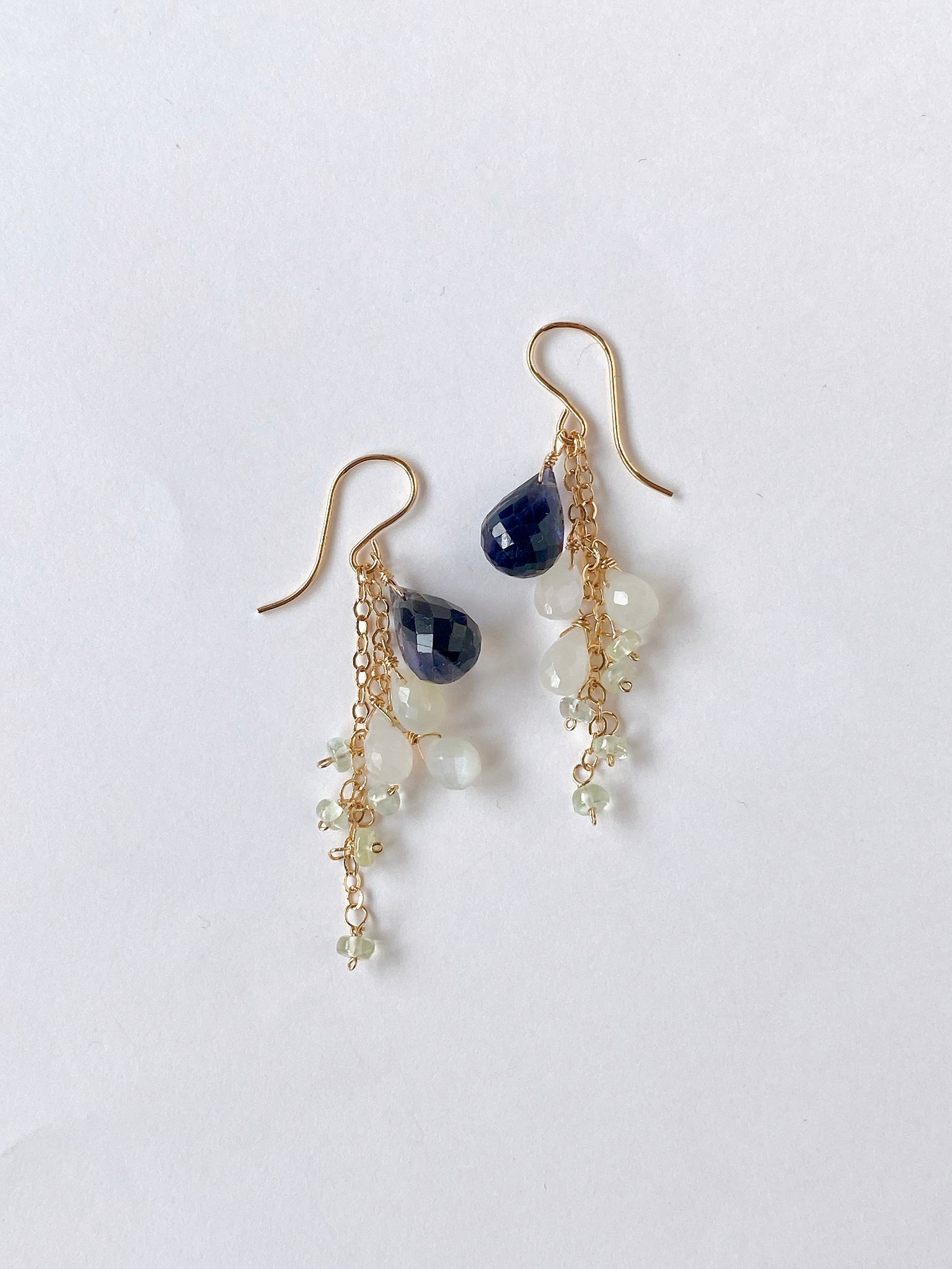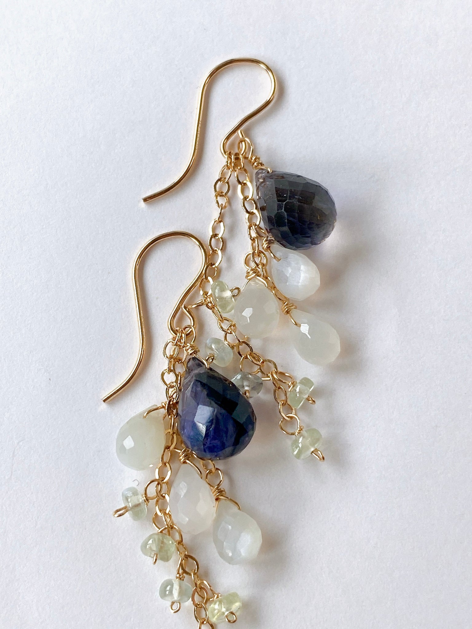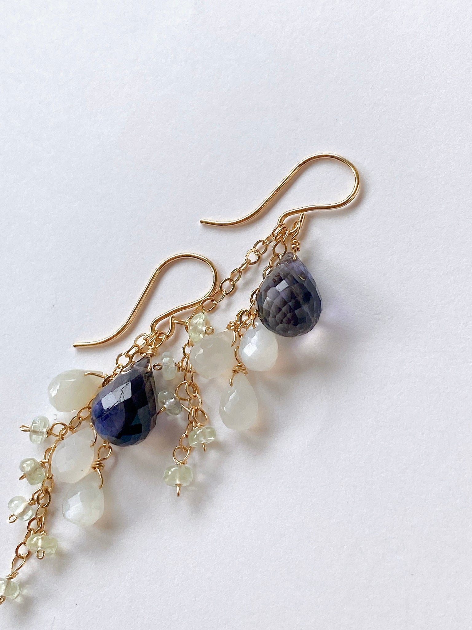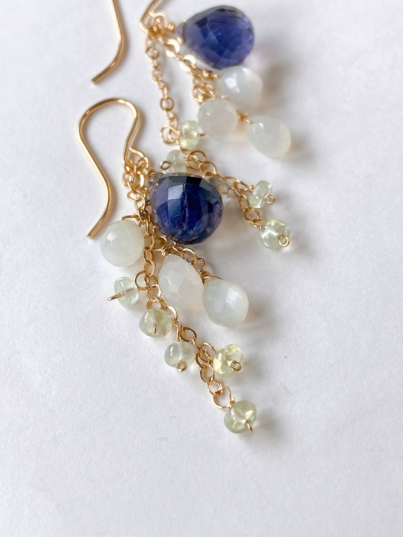 ドロップカットのアイオライトとホワイトムーンストーン、つるんとしたロンデルカットのクリソベリルを使ってデザインした耳飾りです。