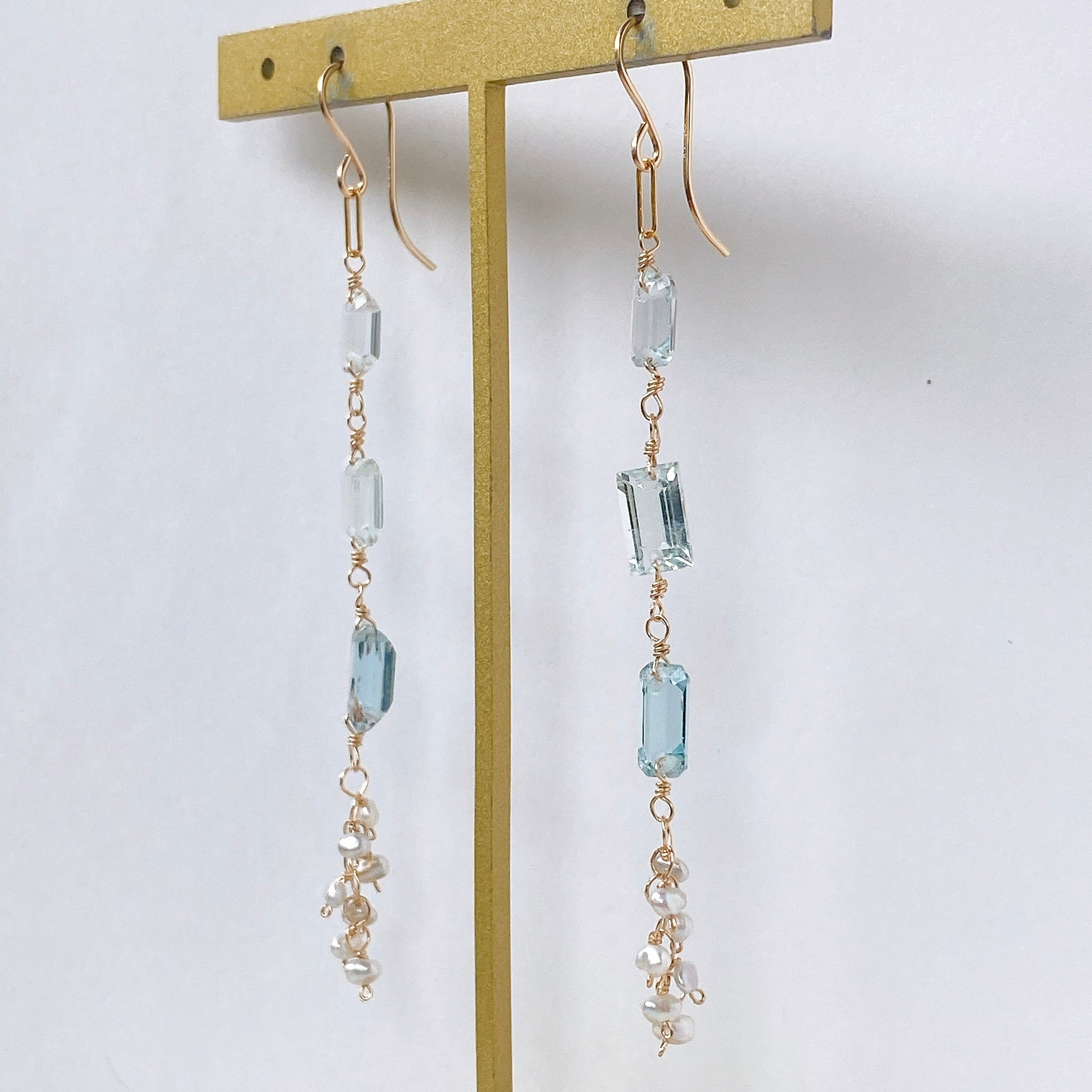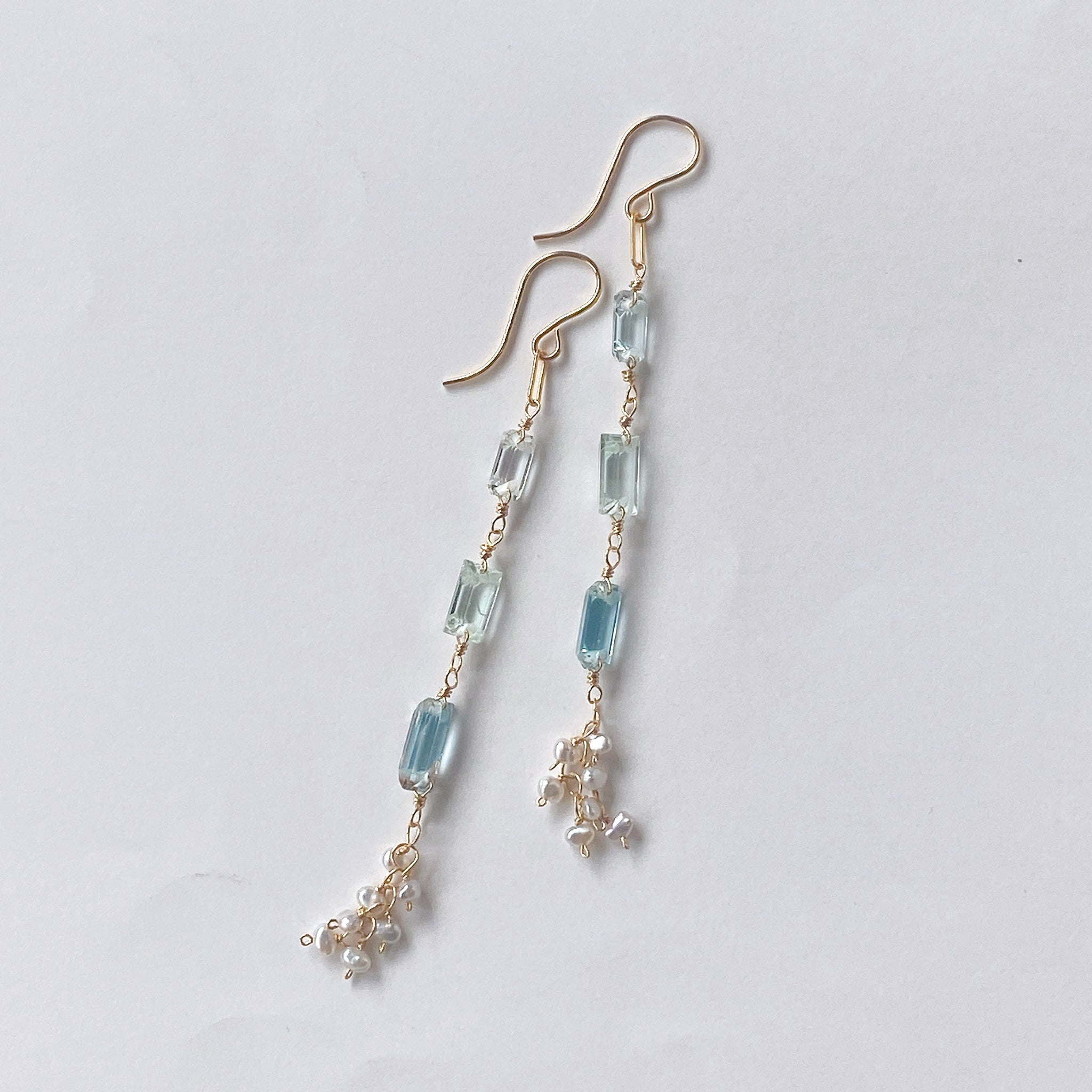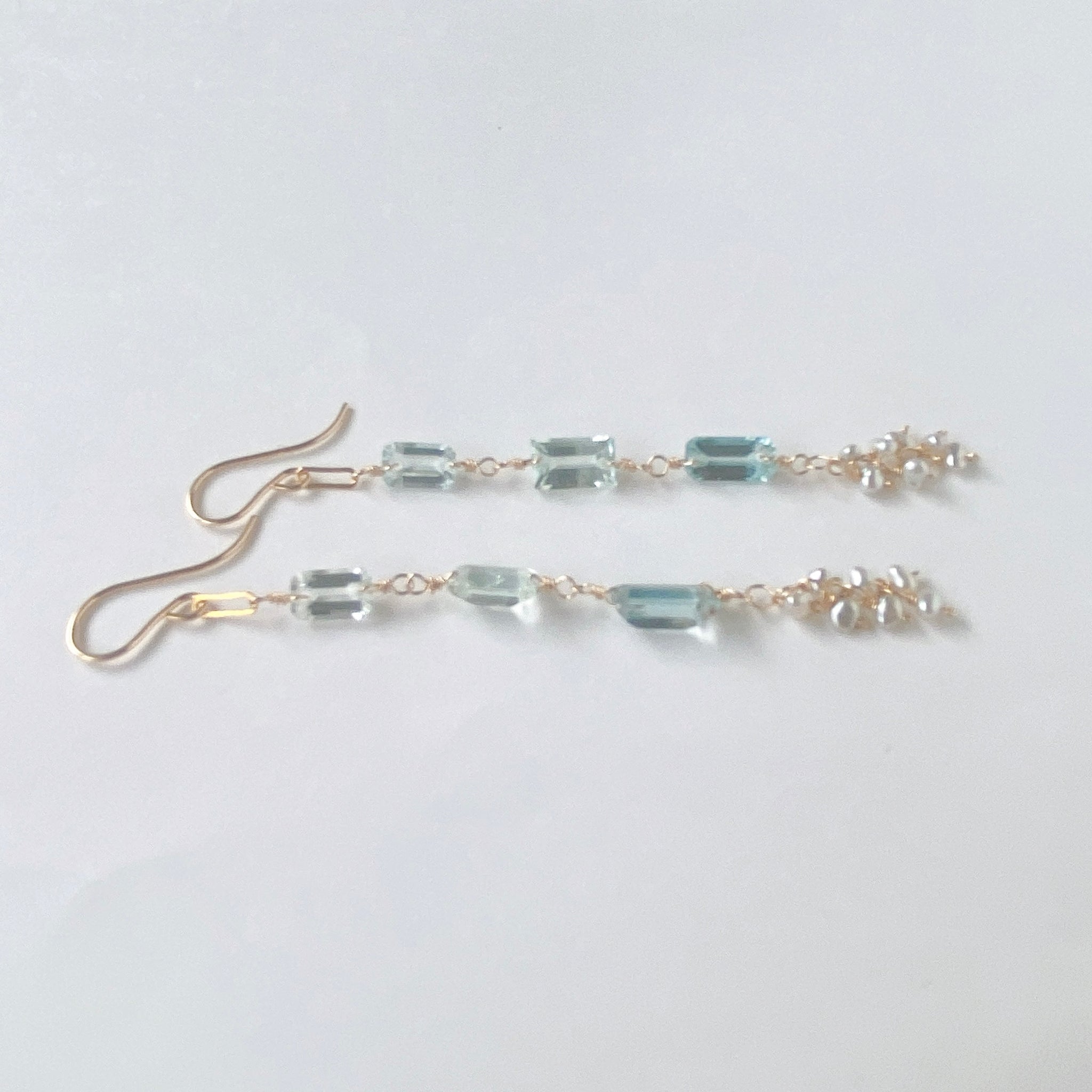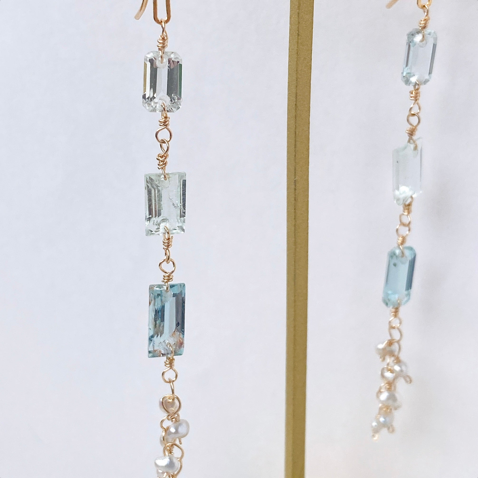 ファセットレクタングルカットのアクアマリンと小さなアコヤケシパールを使ってデザインした耳飾りです。
