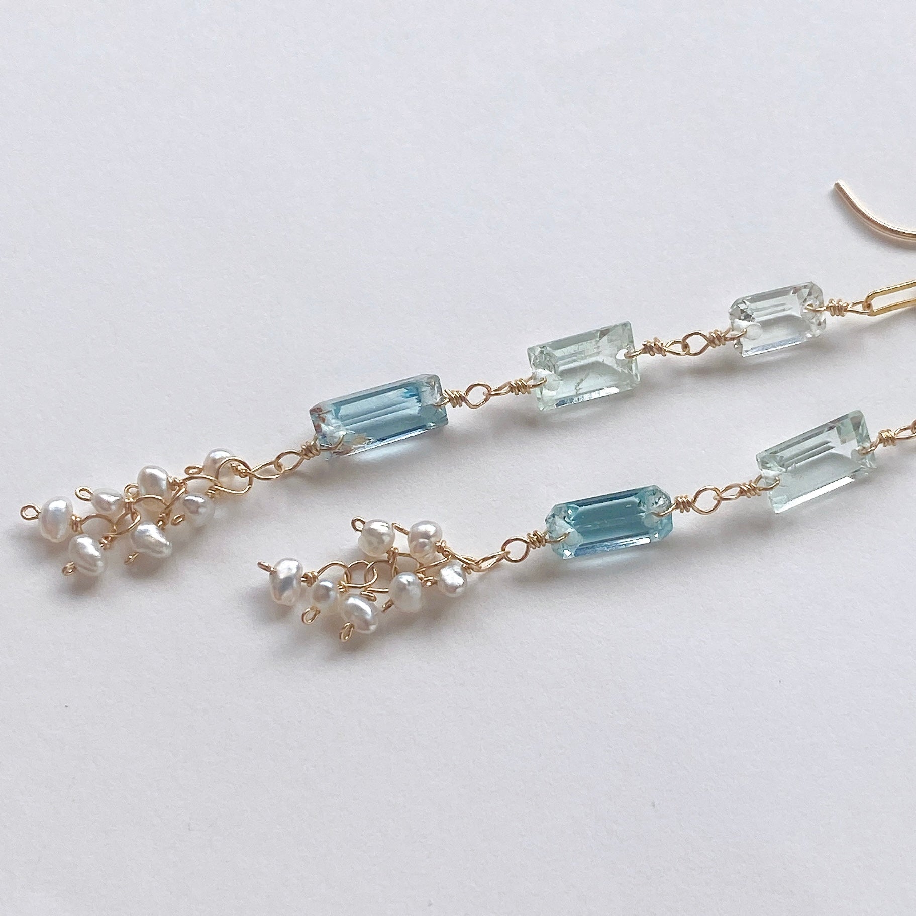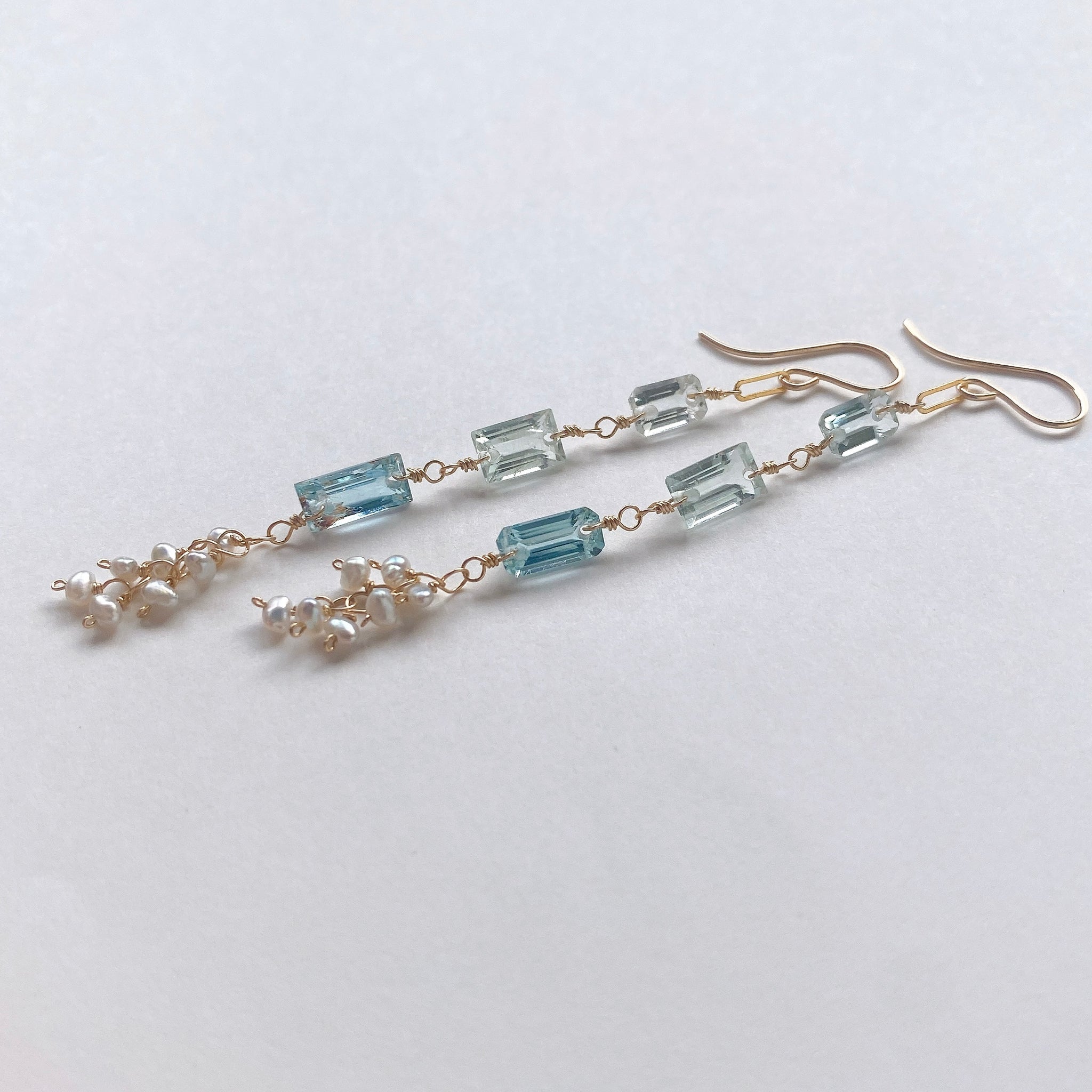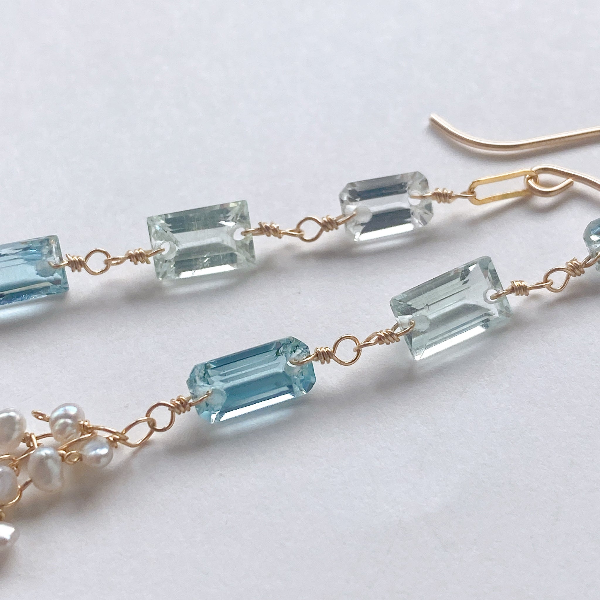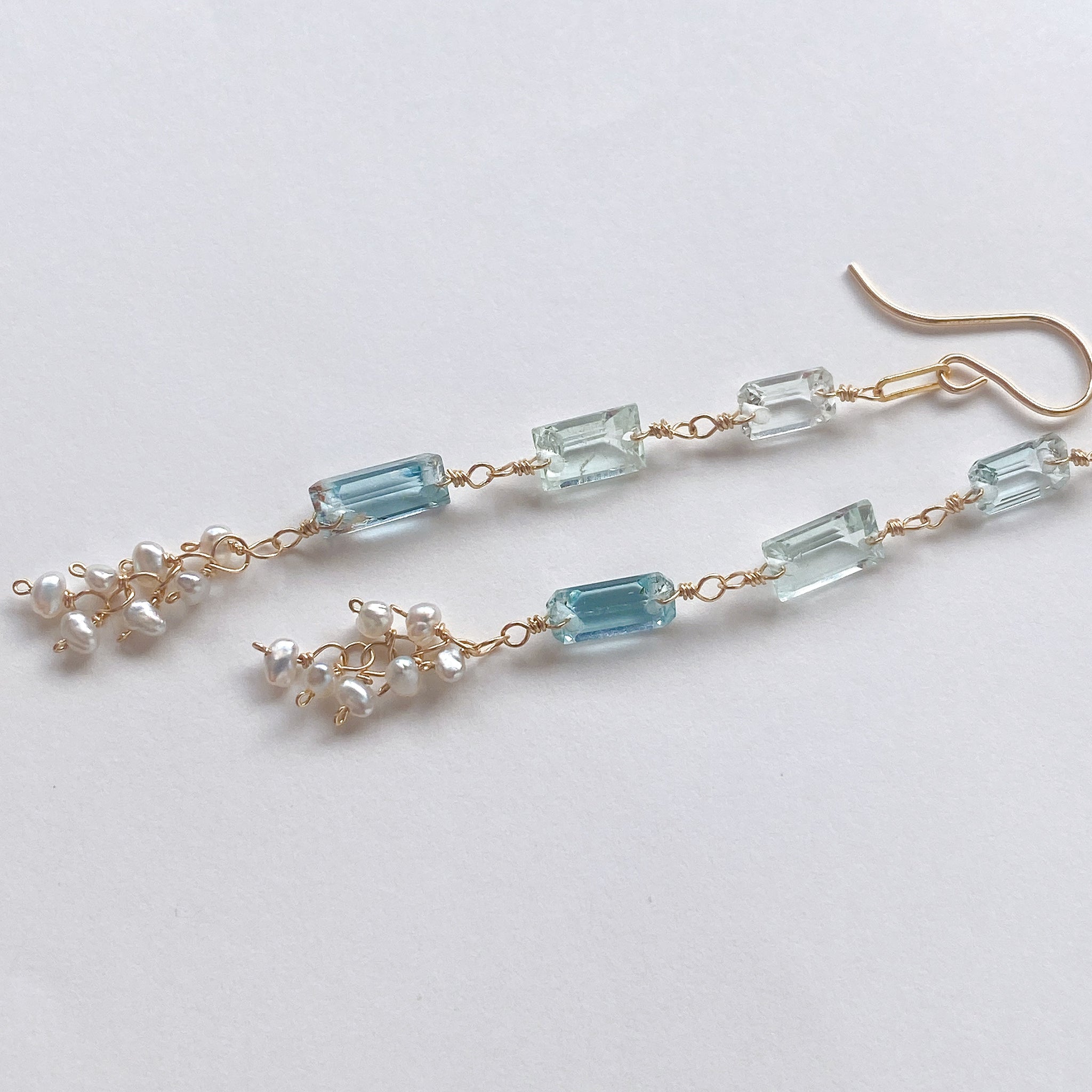 ファセットレクタングルカットのアクアマリンと小さなアコヤケシパールを使ってデザインした耳飾りです。