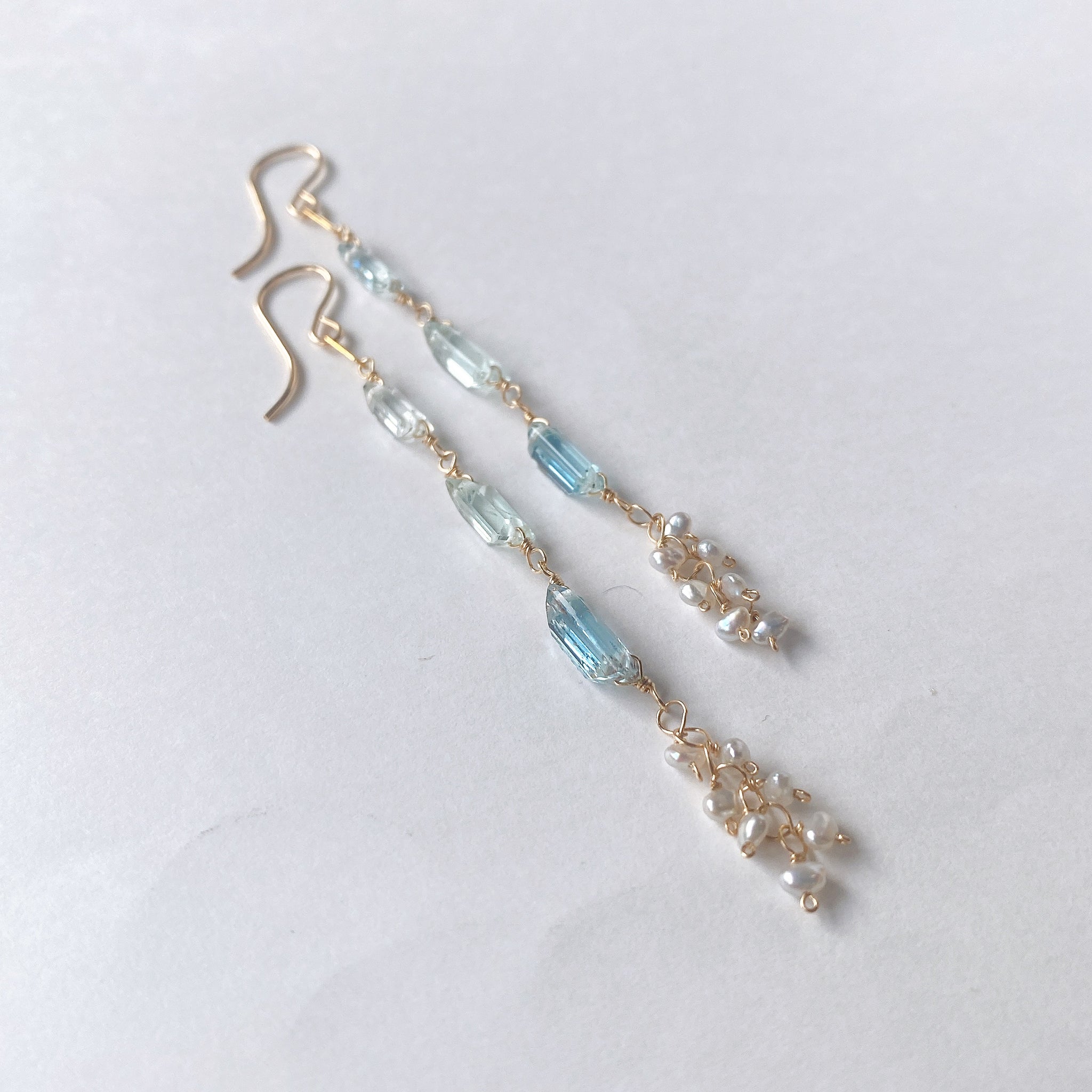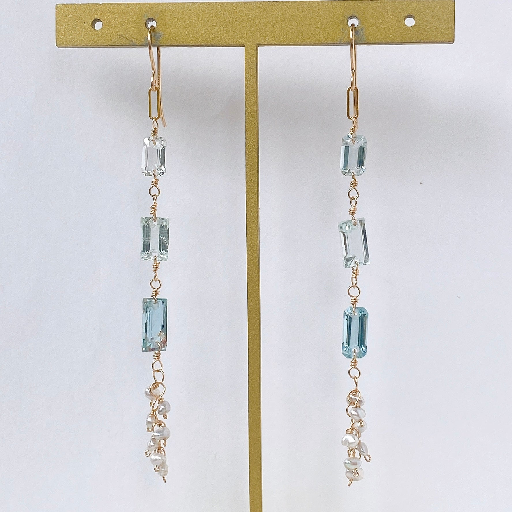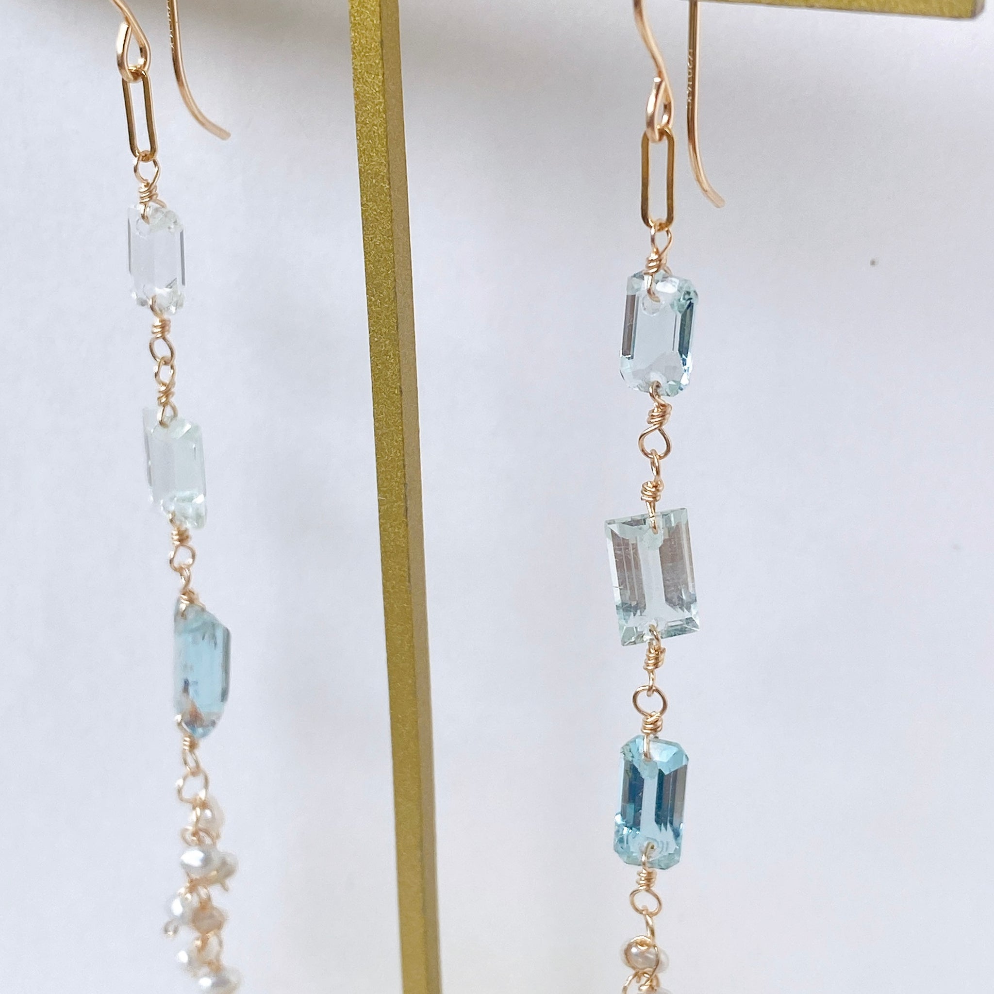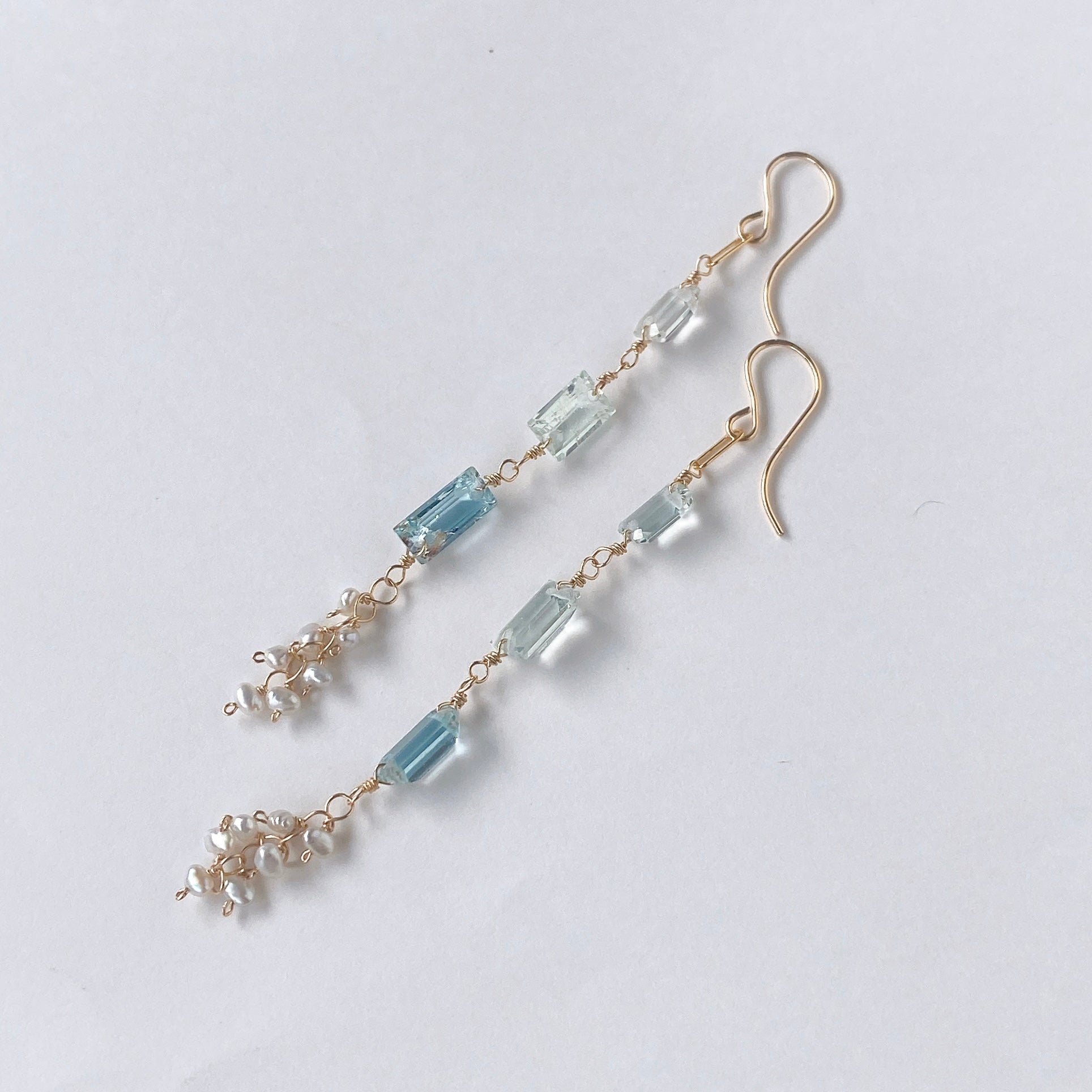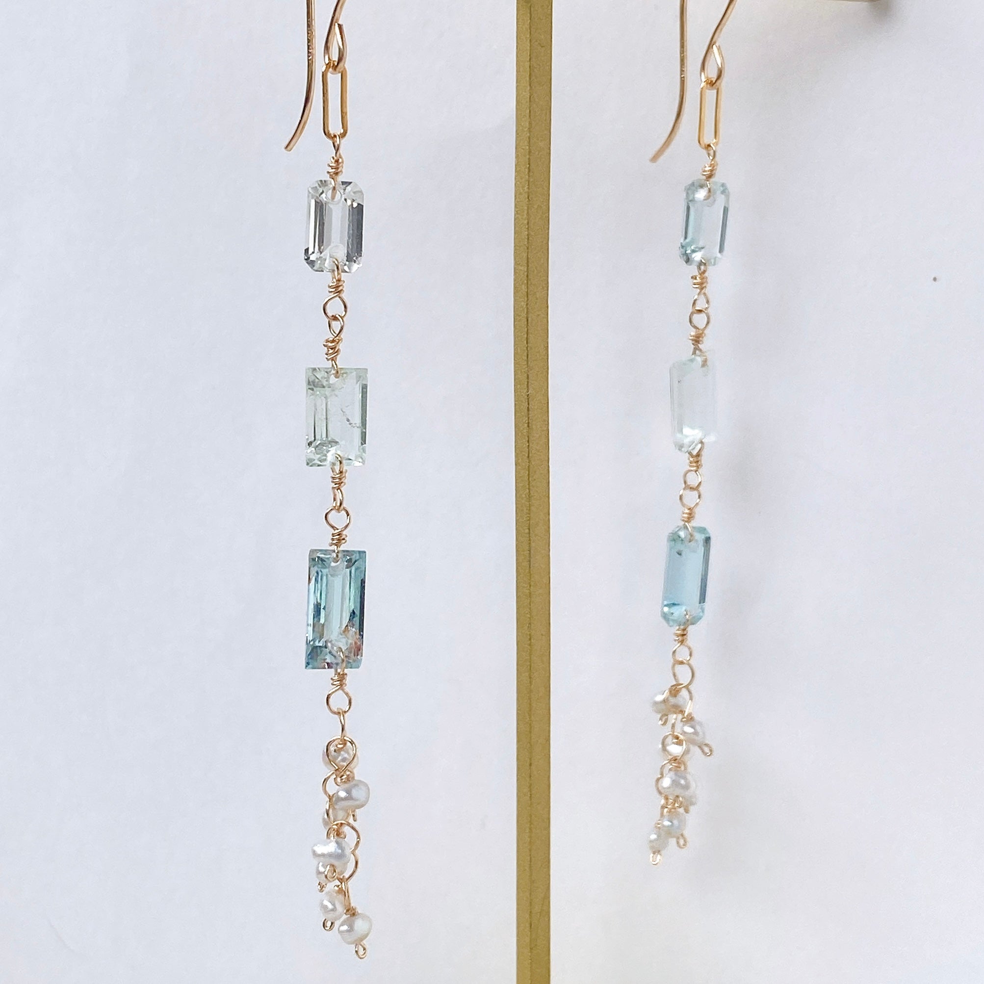 ファセットレクタングルカットのアクアマリンと小さなアコヤケシパールを使ってデザインした耳飾りです。