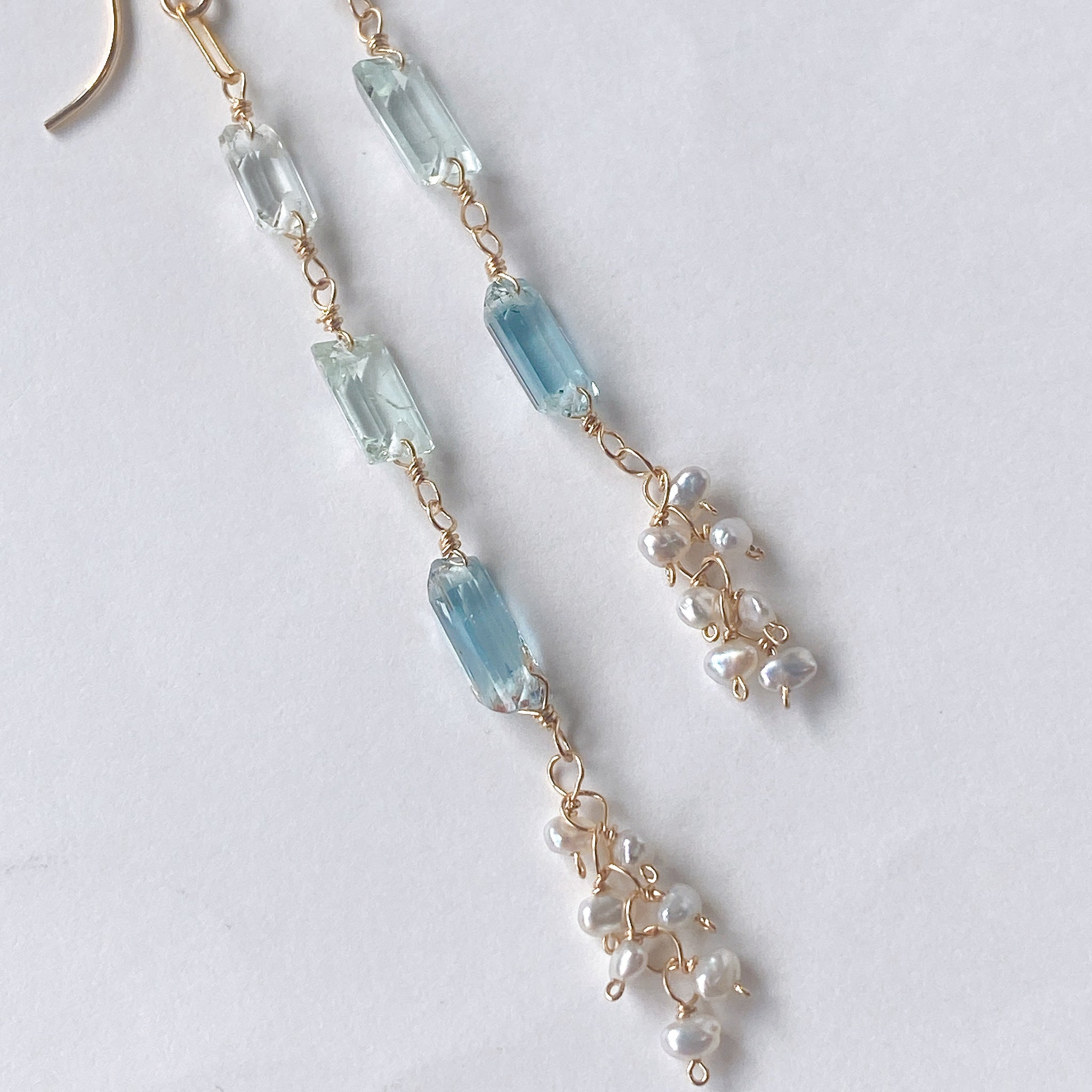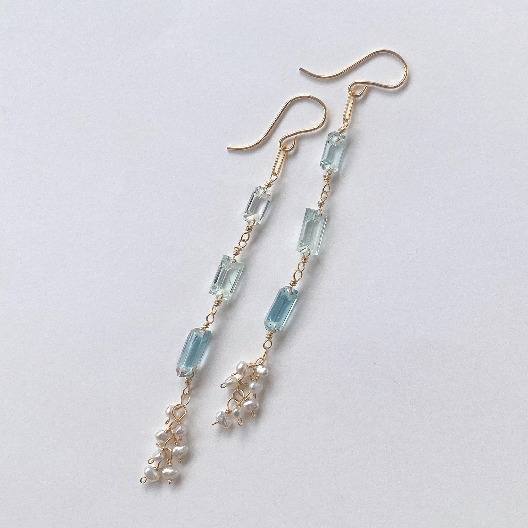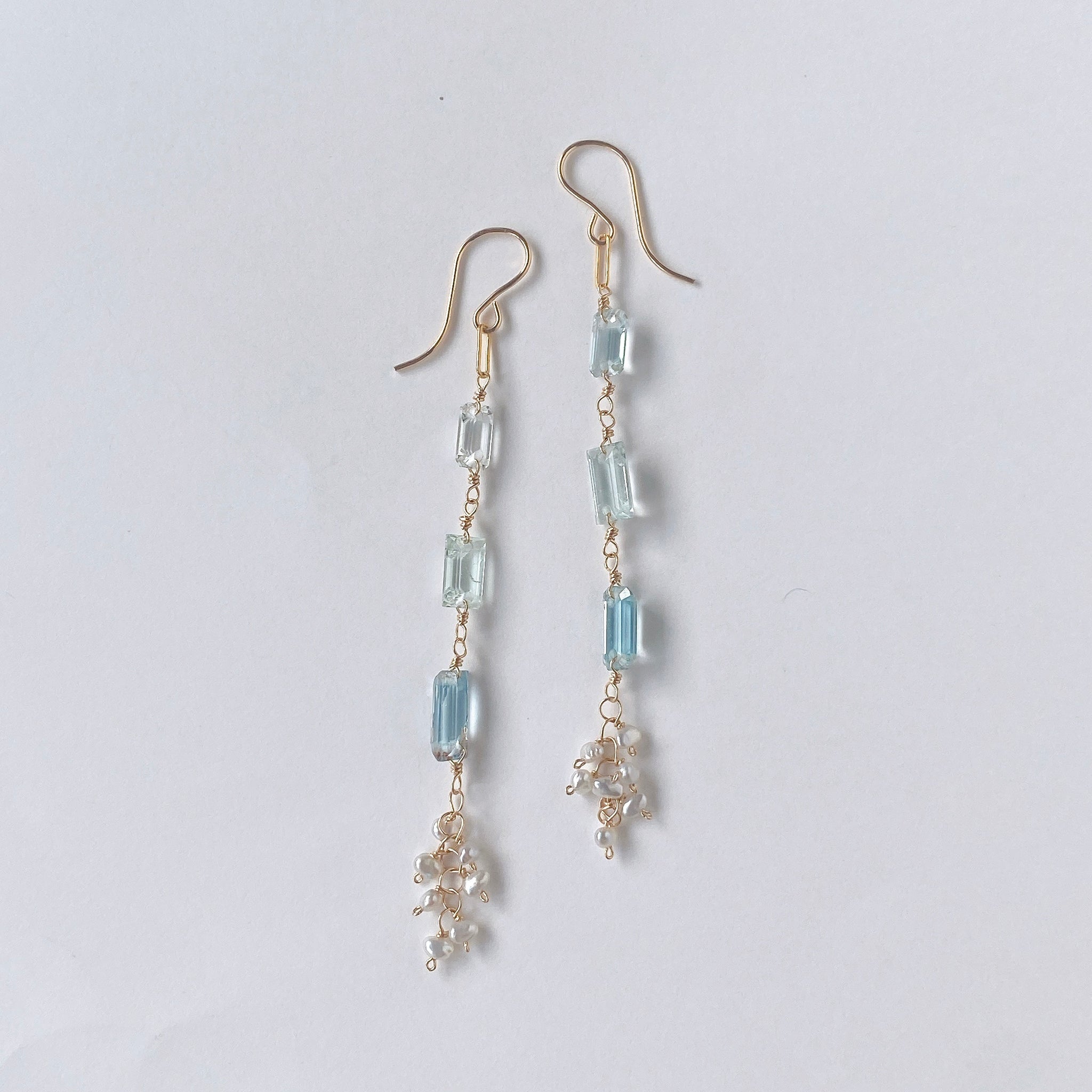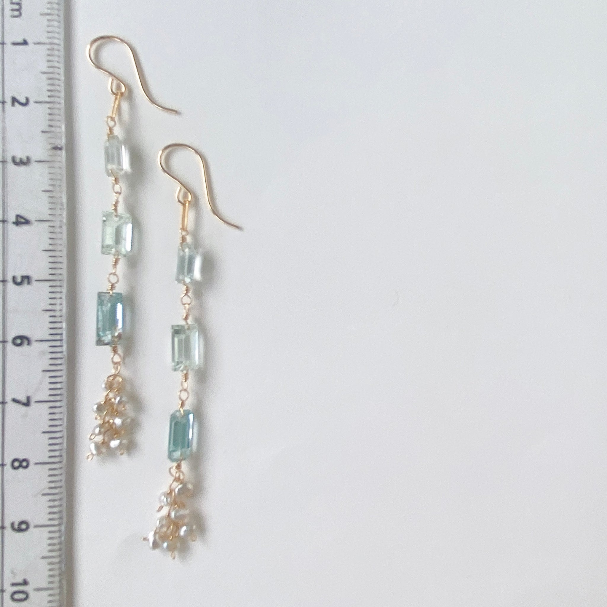 ファセットレクタングルカットのアクアマリンと小さなアコヤケシパールを使ってデザインした耳飾りです。