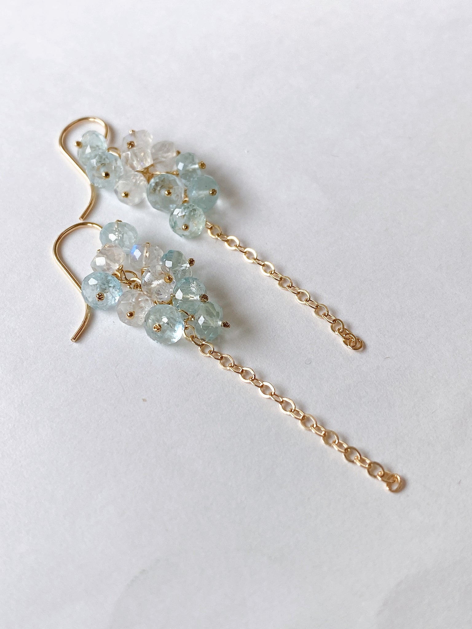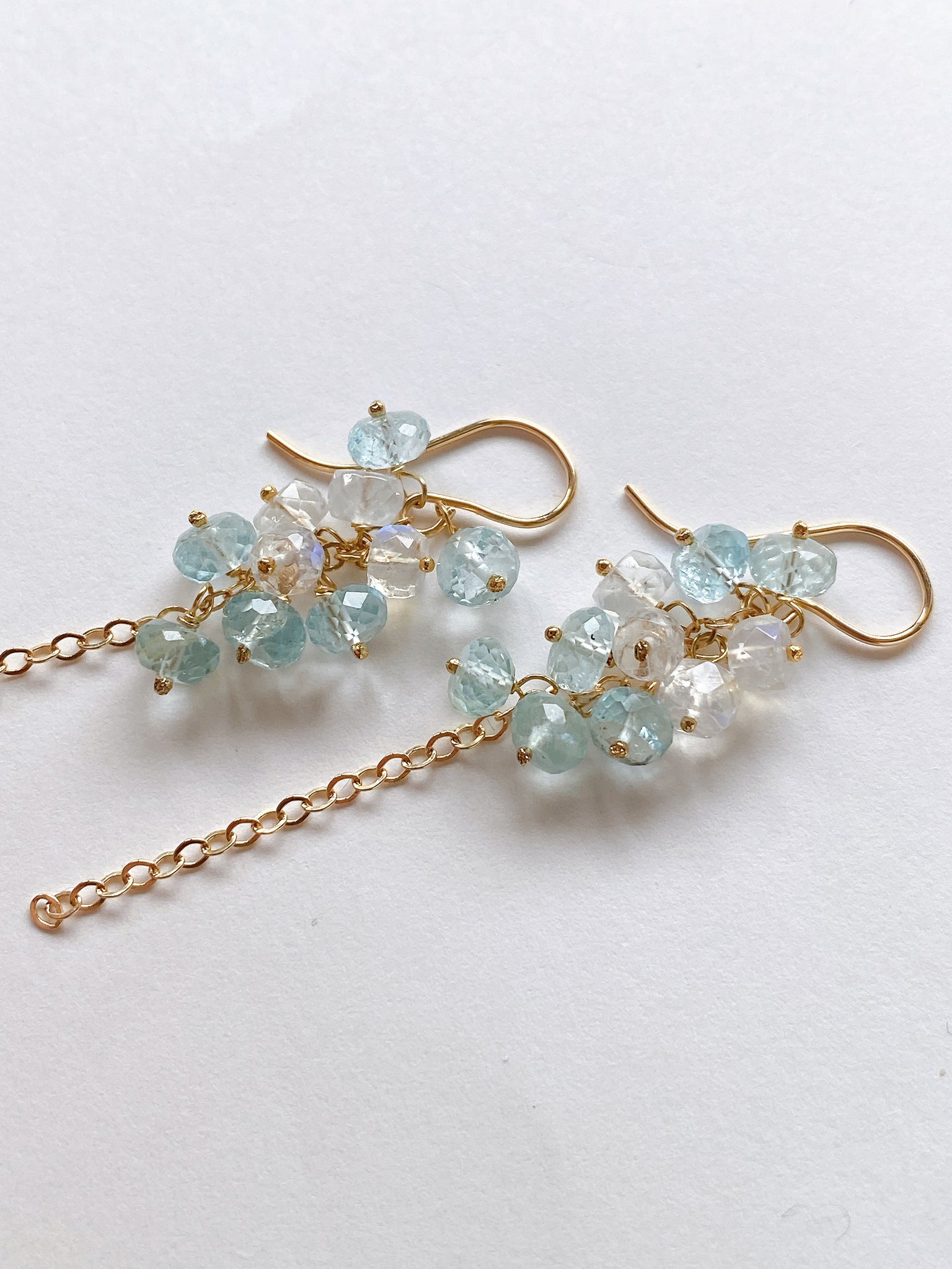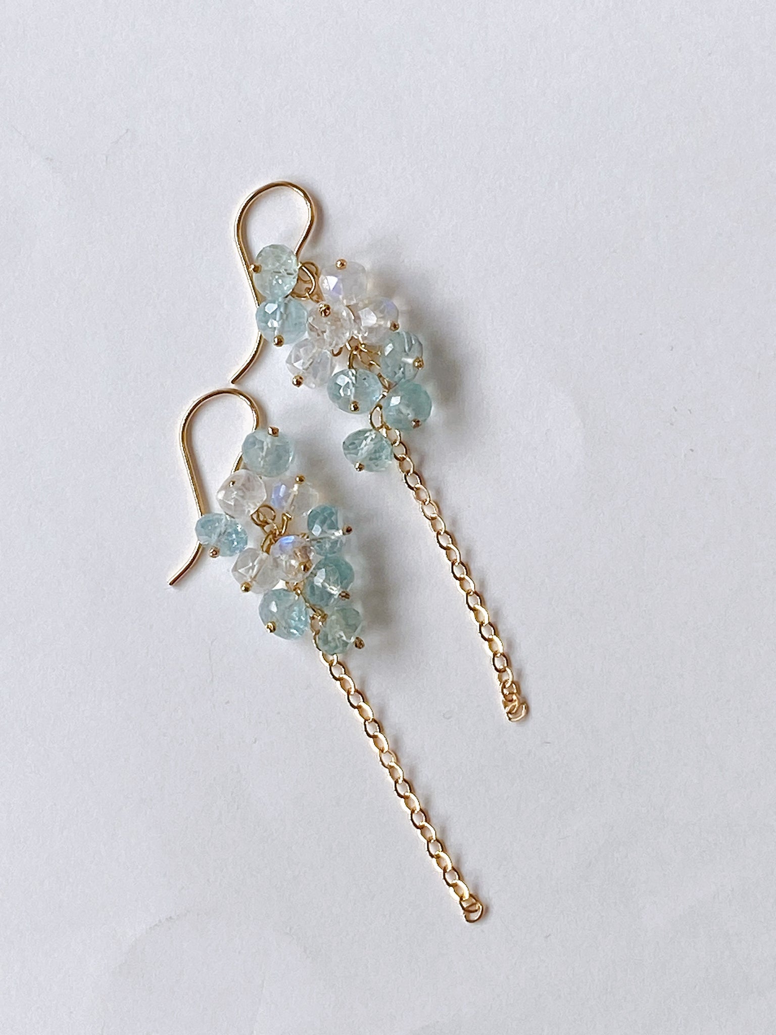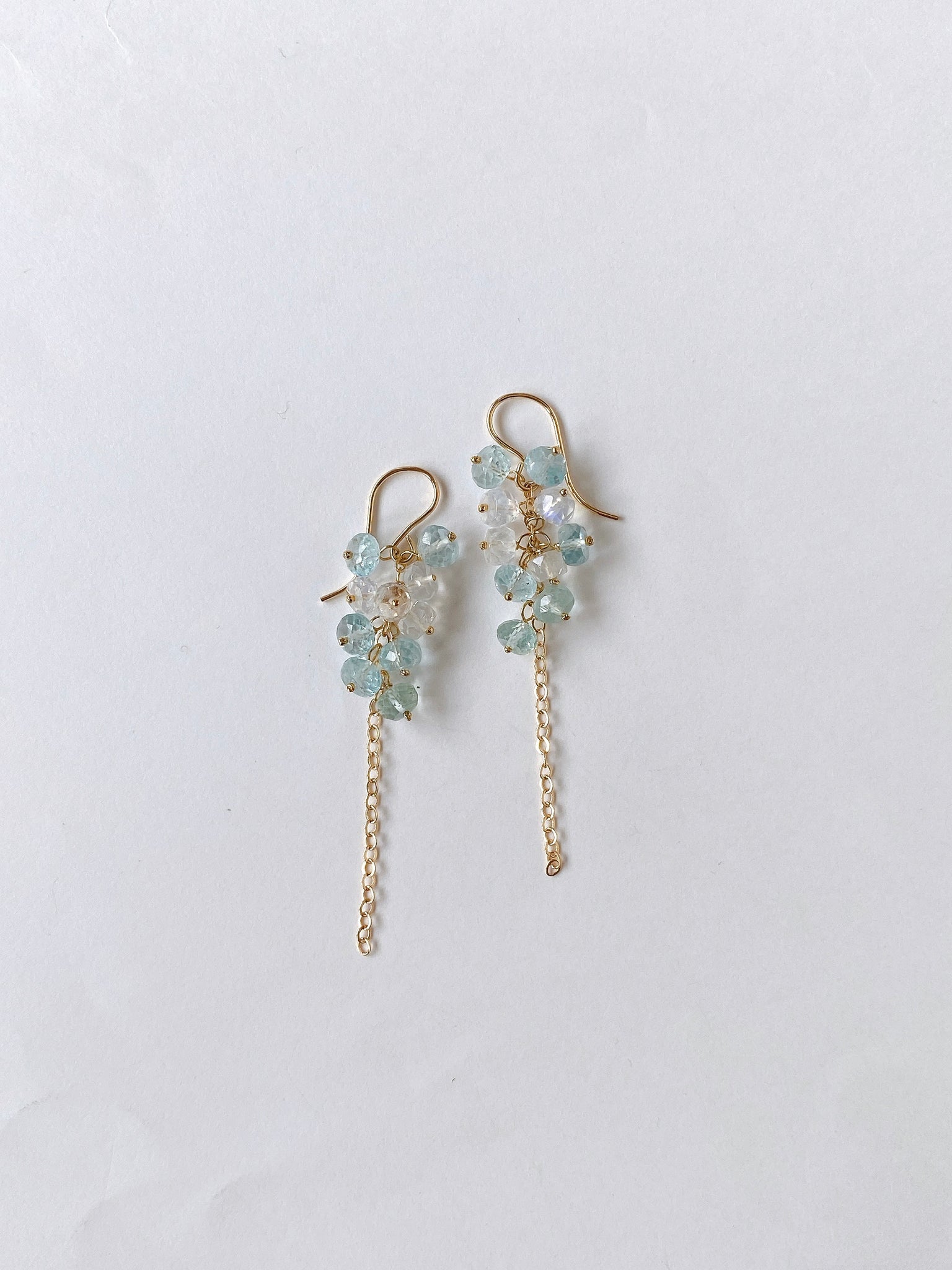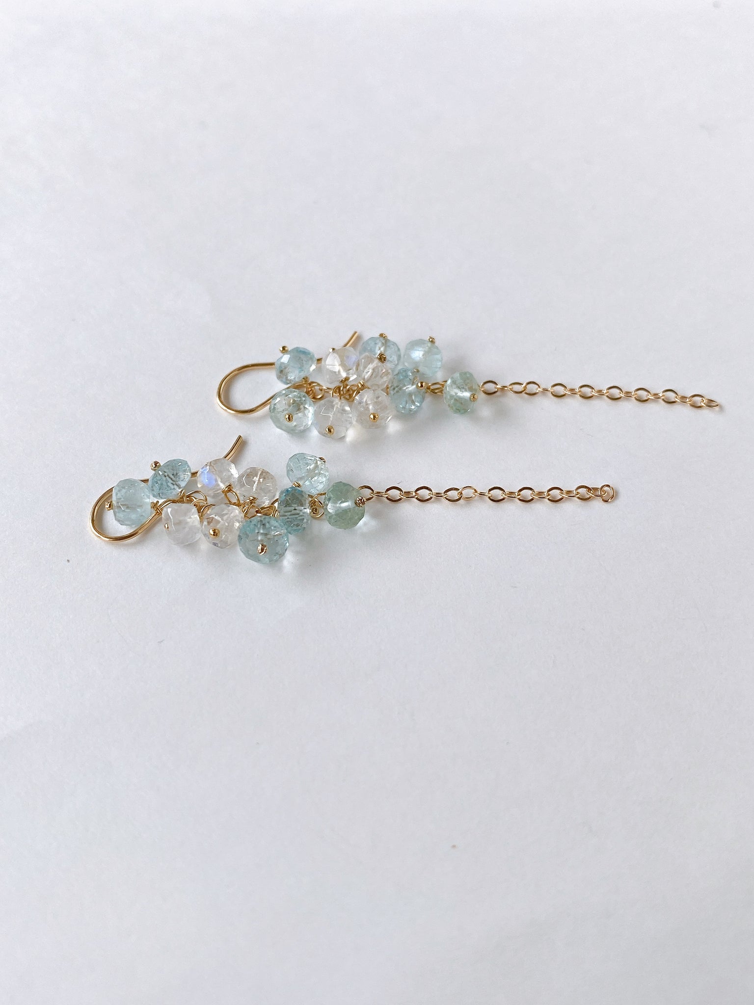 アクアマリンとレインボームーンストーンのふさふさピアス