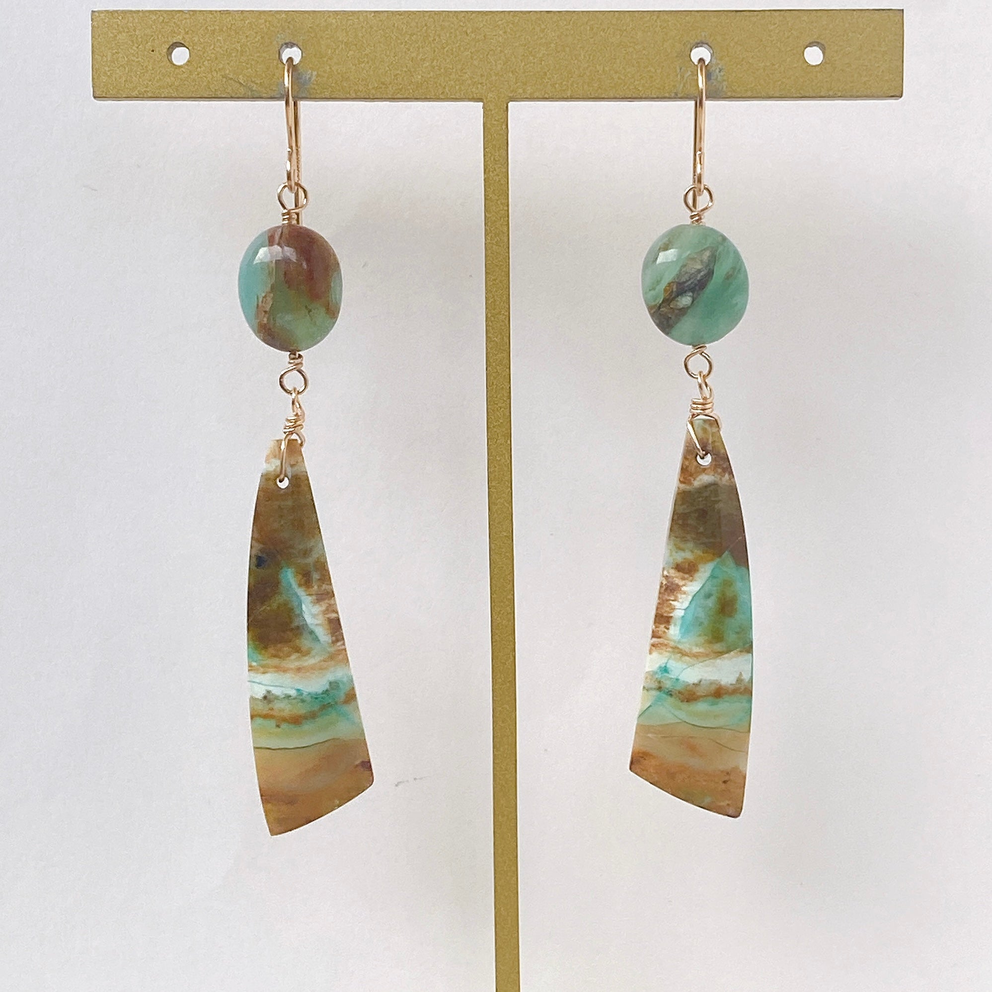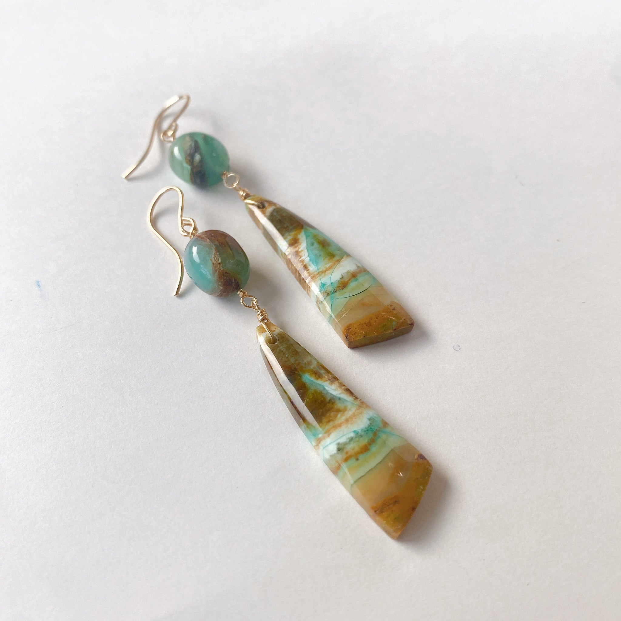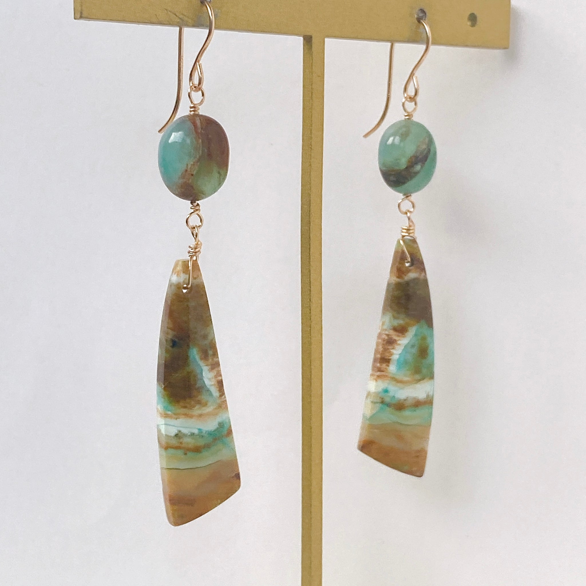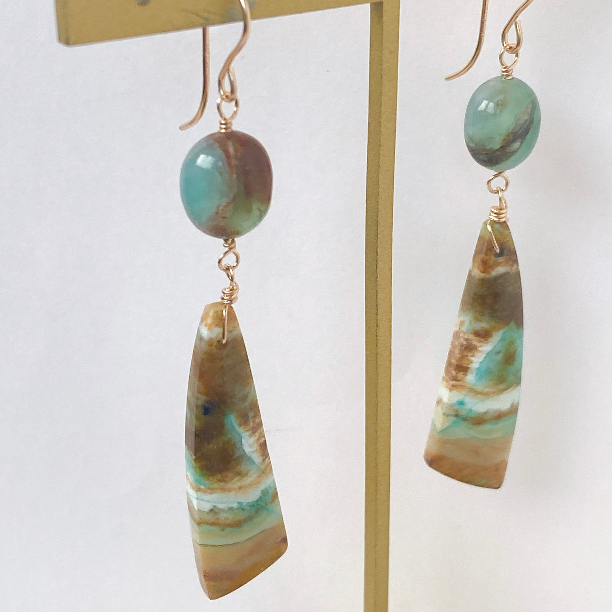 オパライズドウッドとブルーオパールを使ってデザインした耳飾りです。