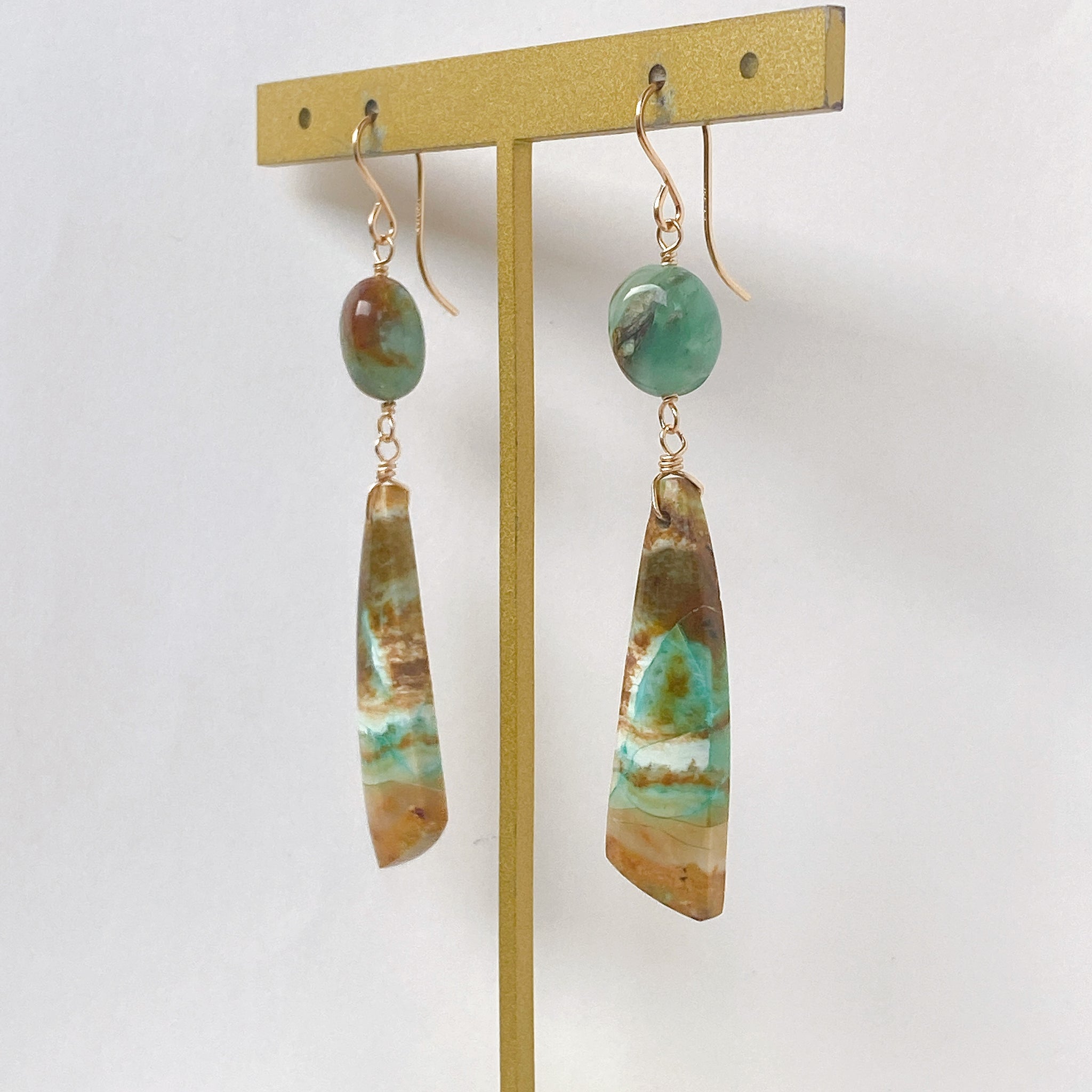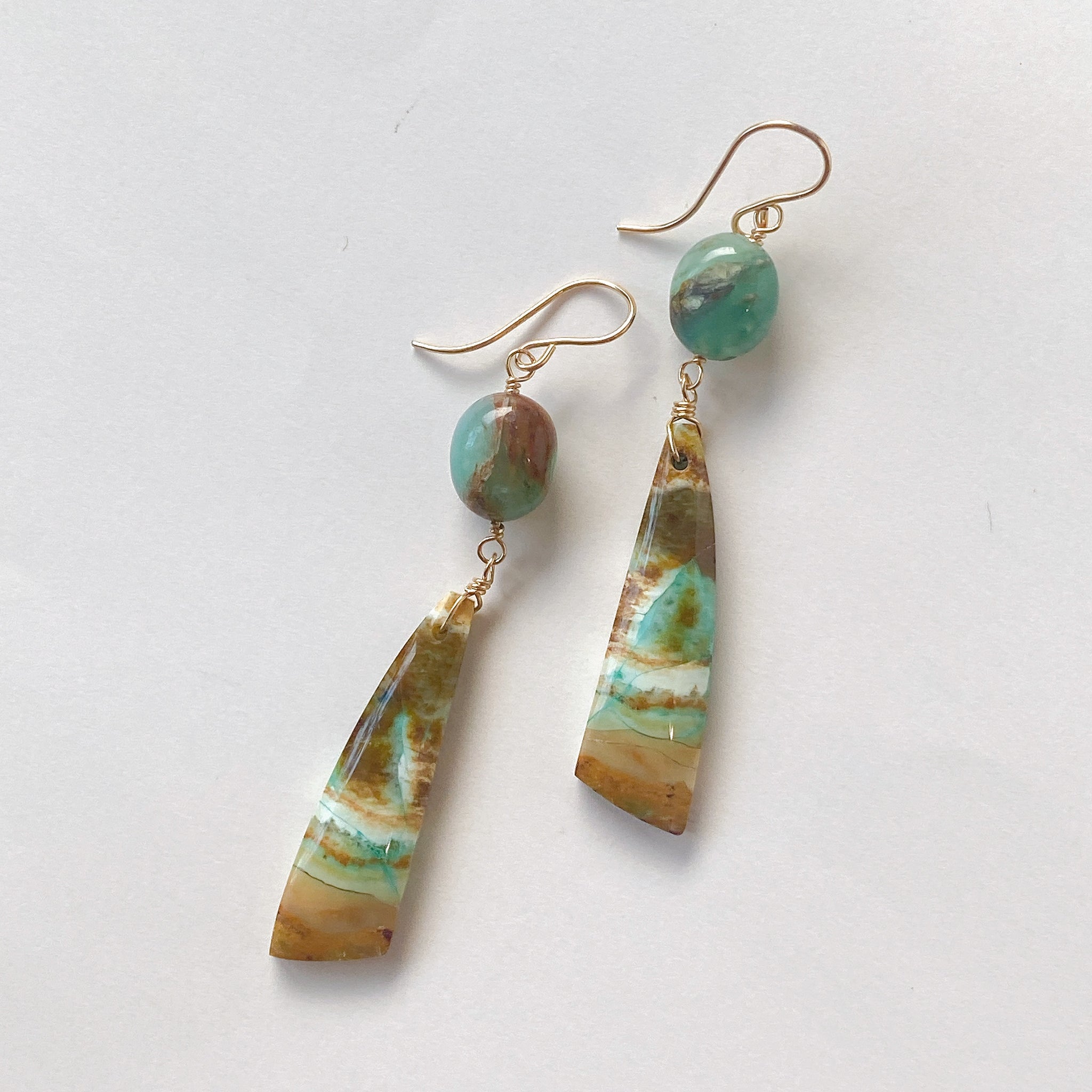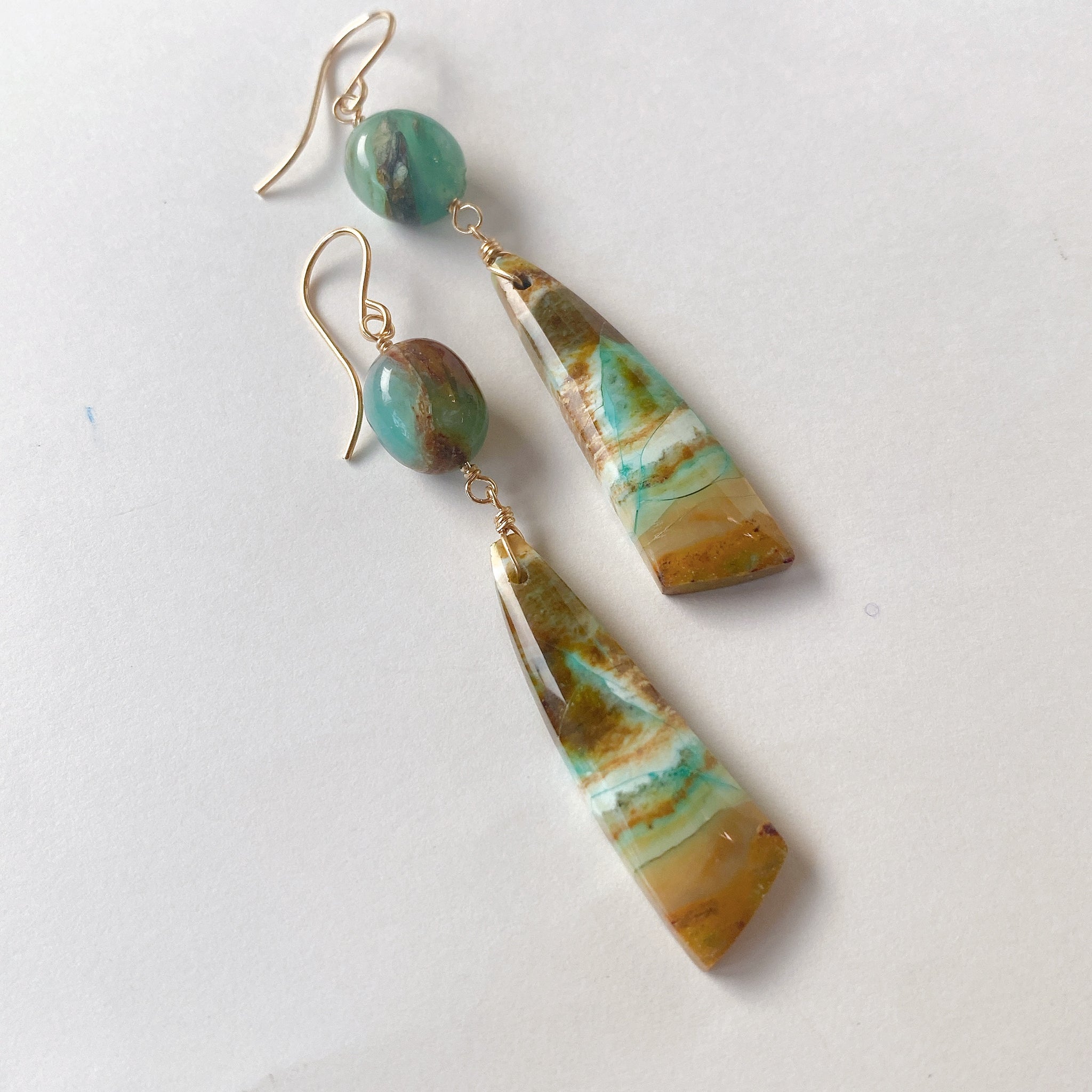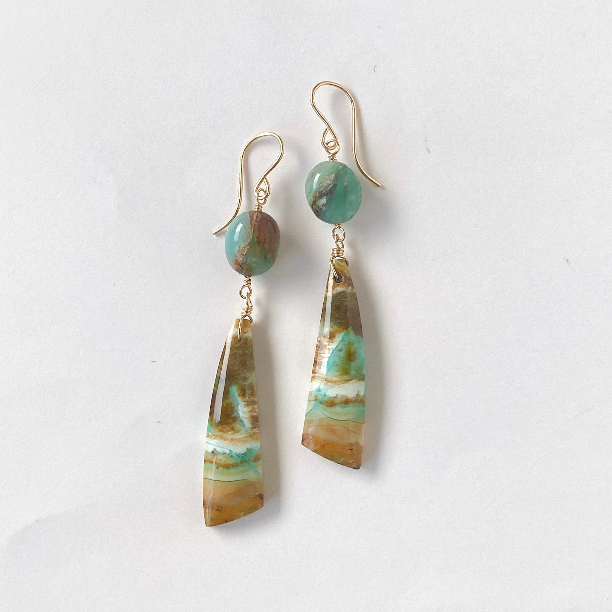オパライズドウッドとブルーオパールを使ってデザインした耳飾りです。
