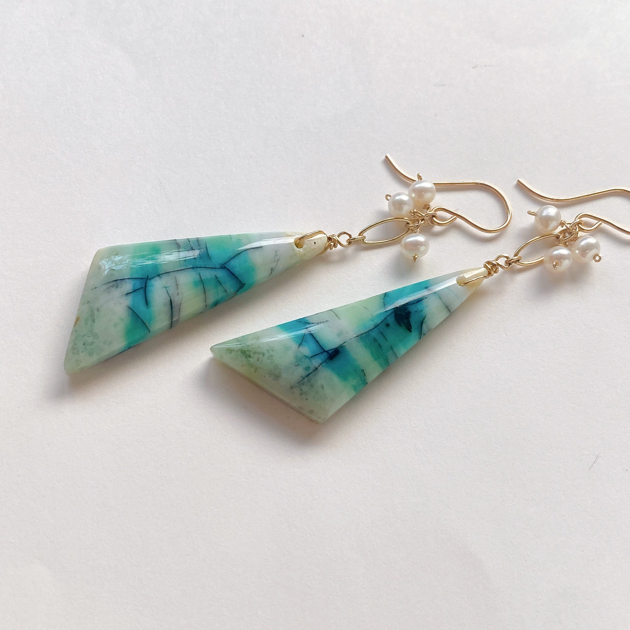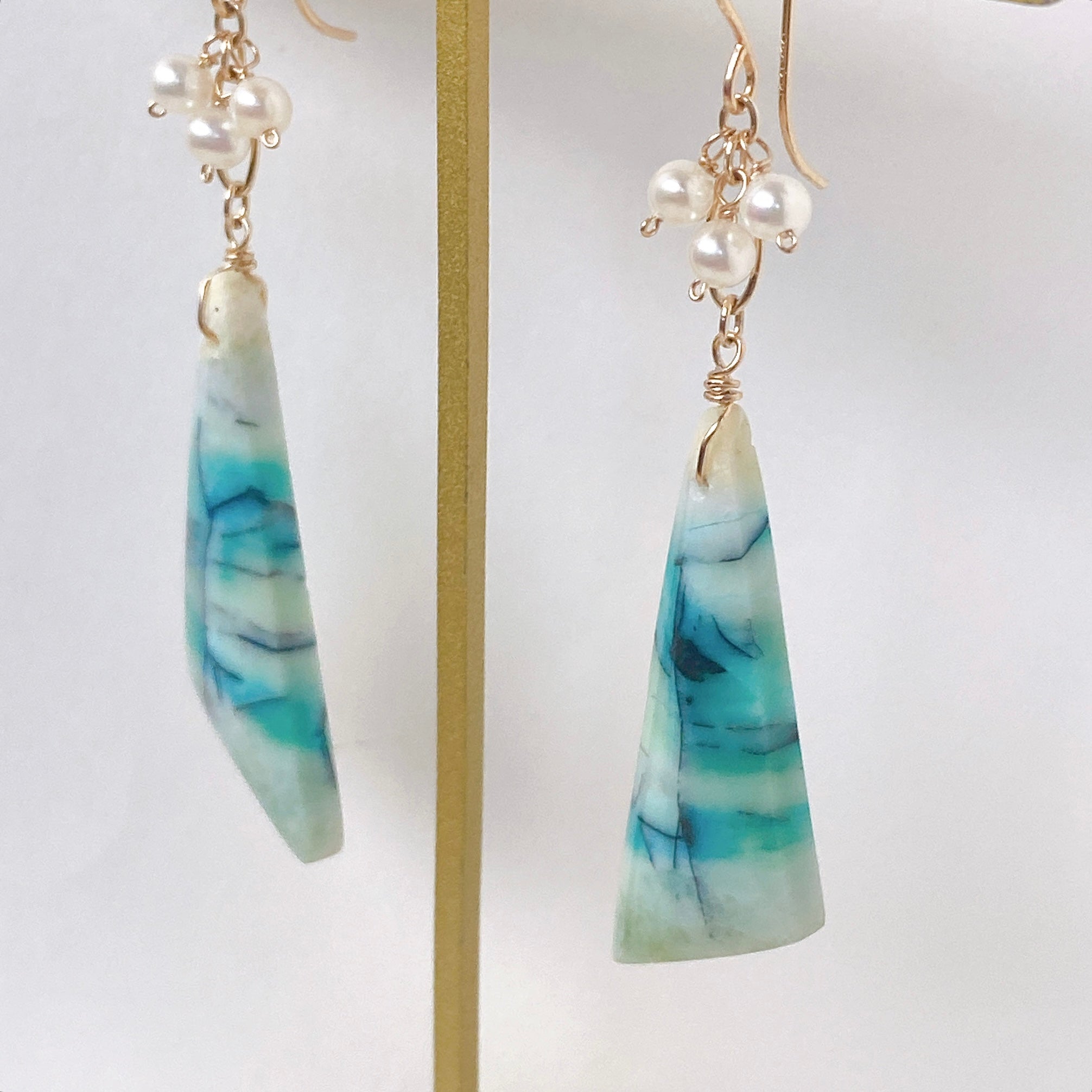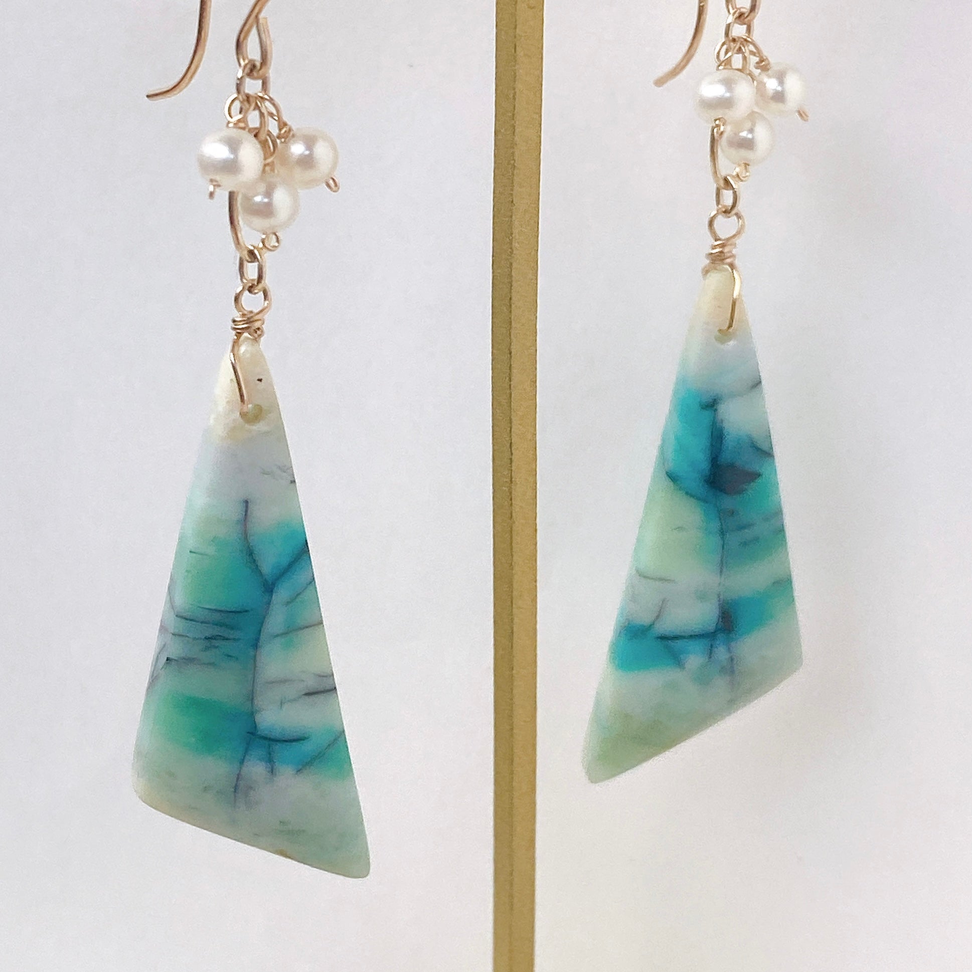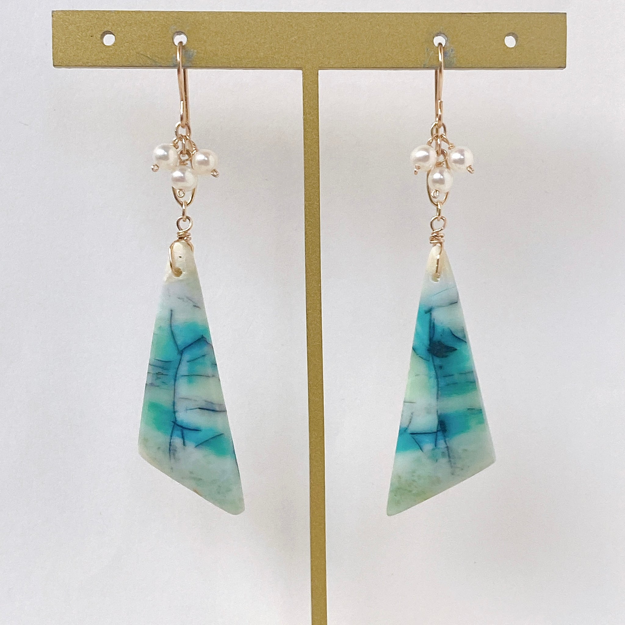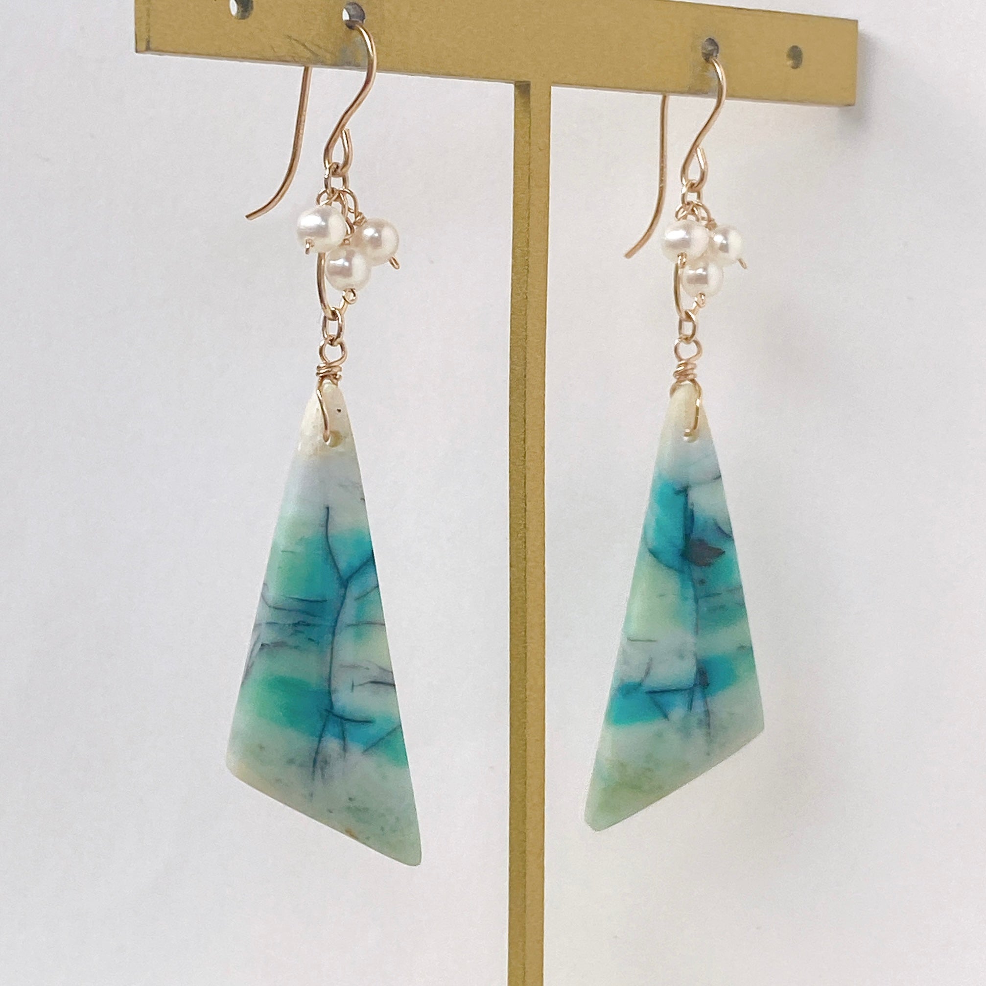 オパライズドウッドと淡水パールを使ってデザインした耳飾りです。