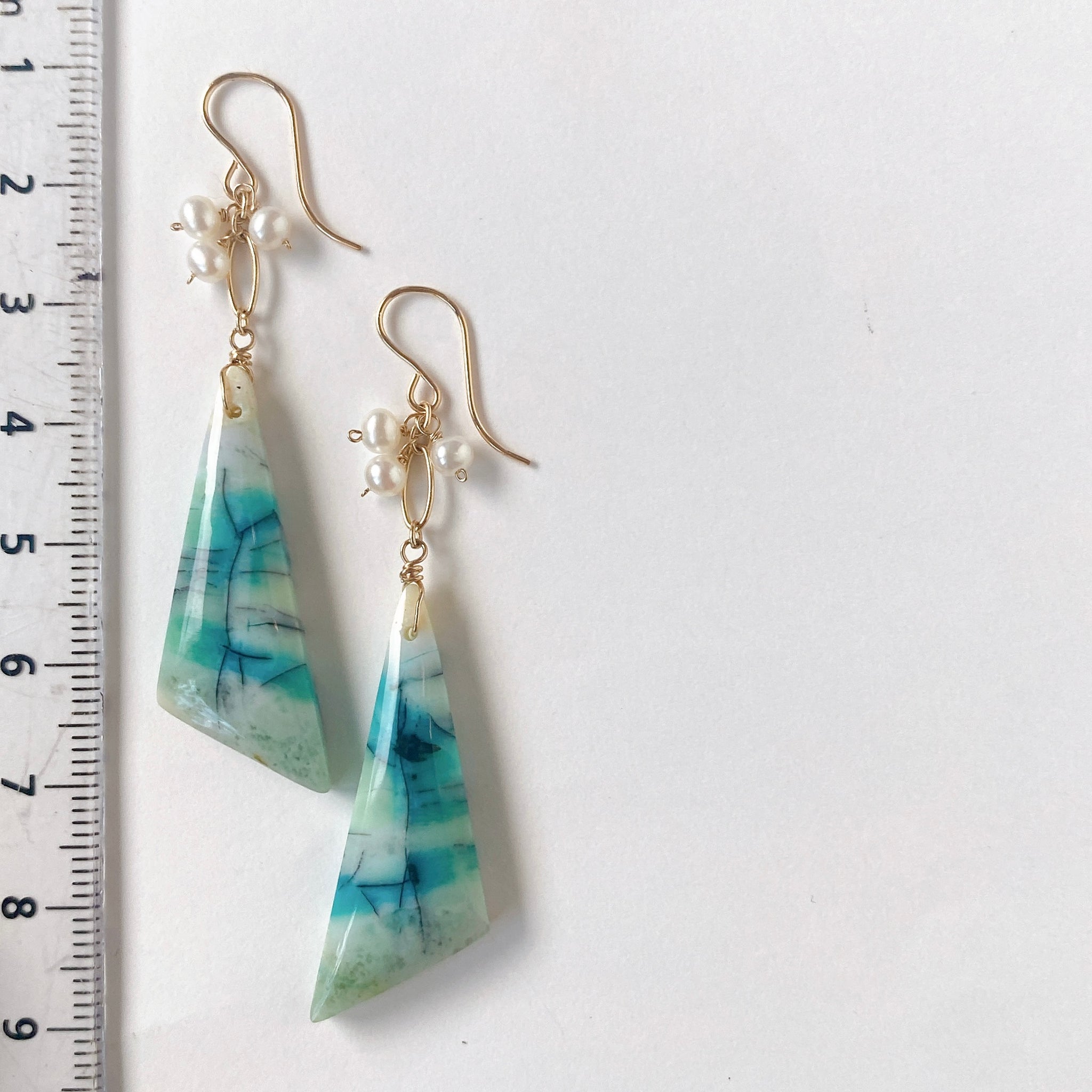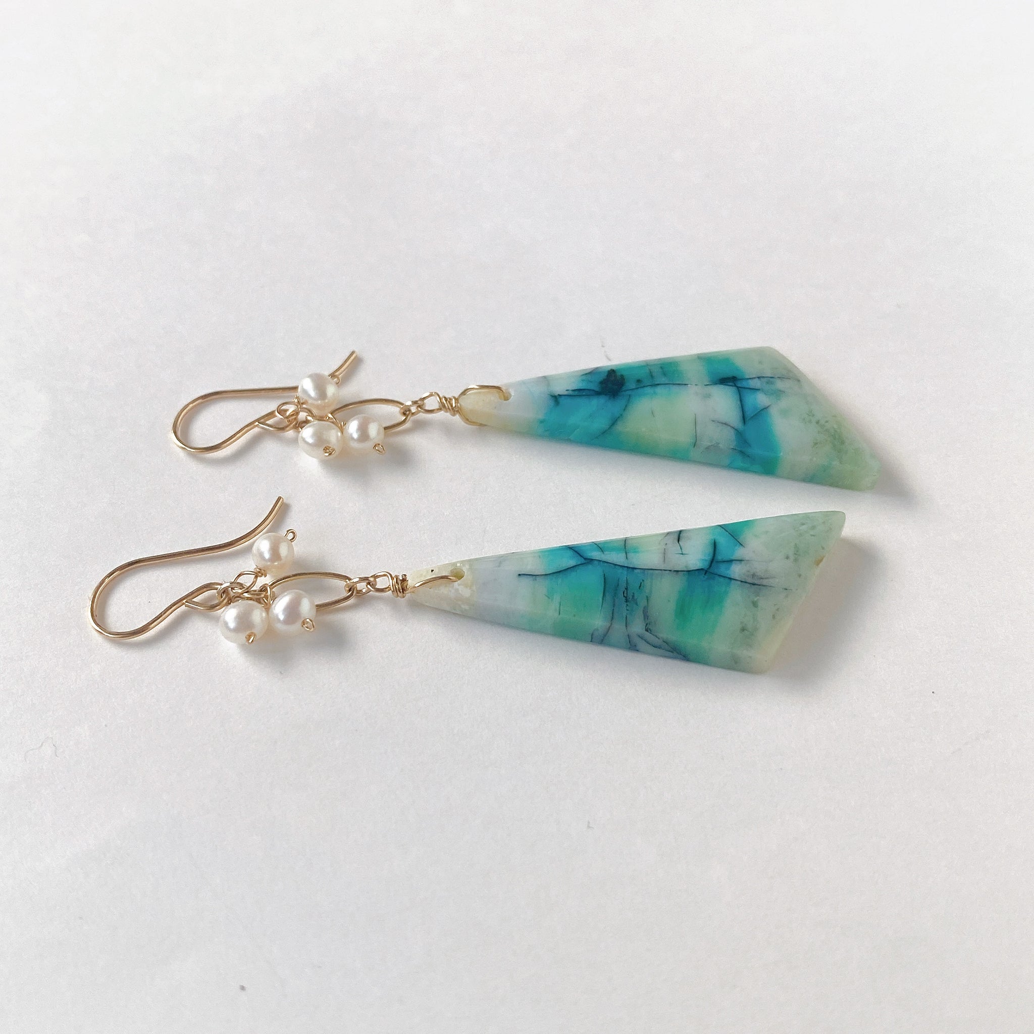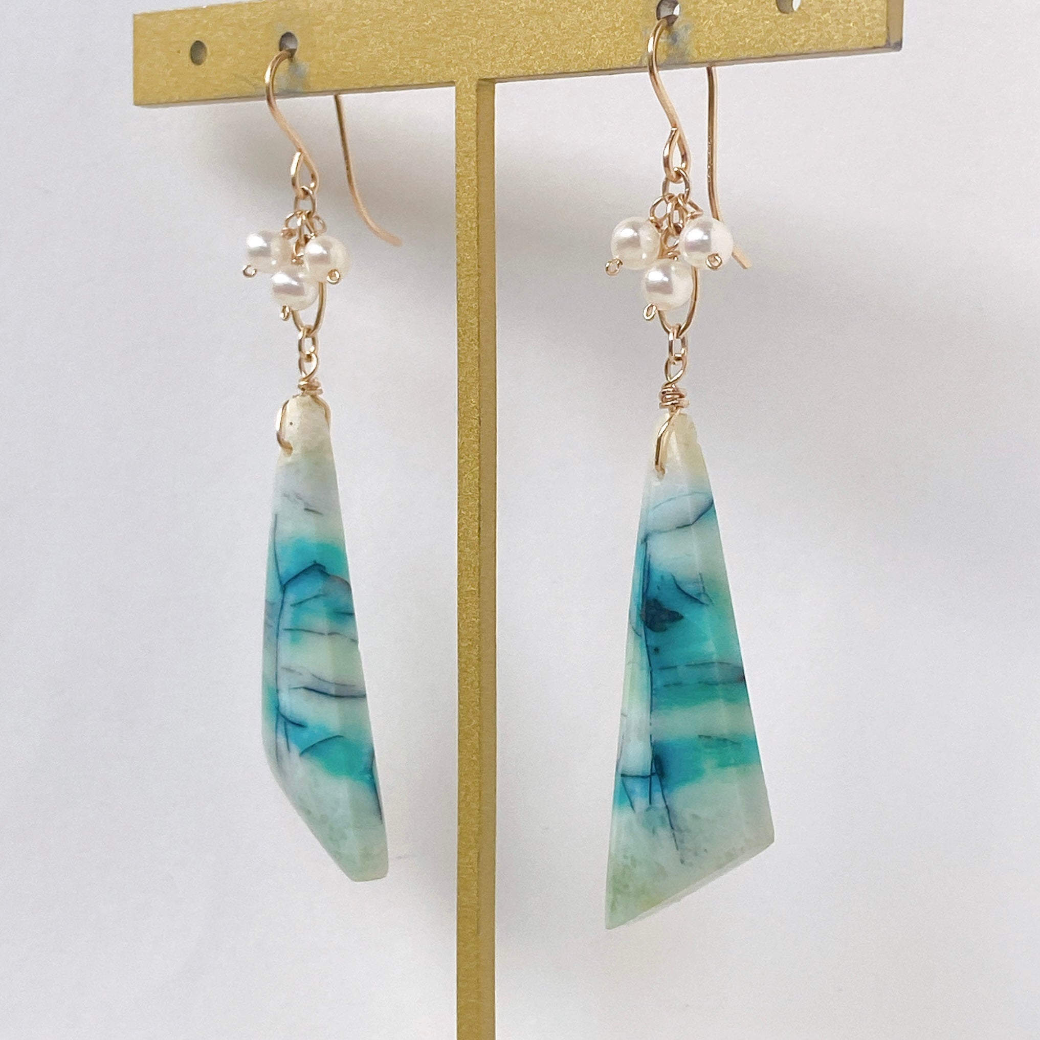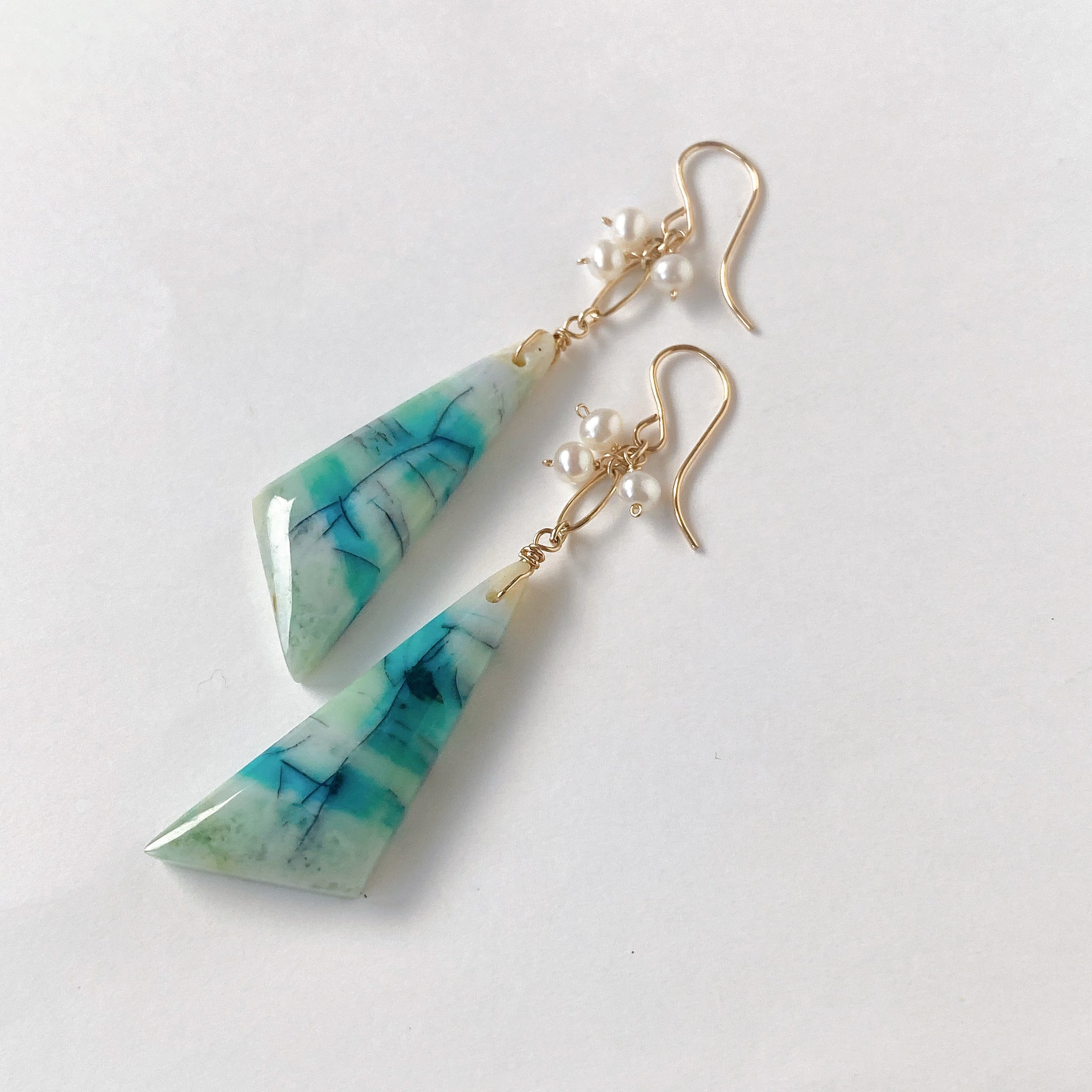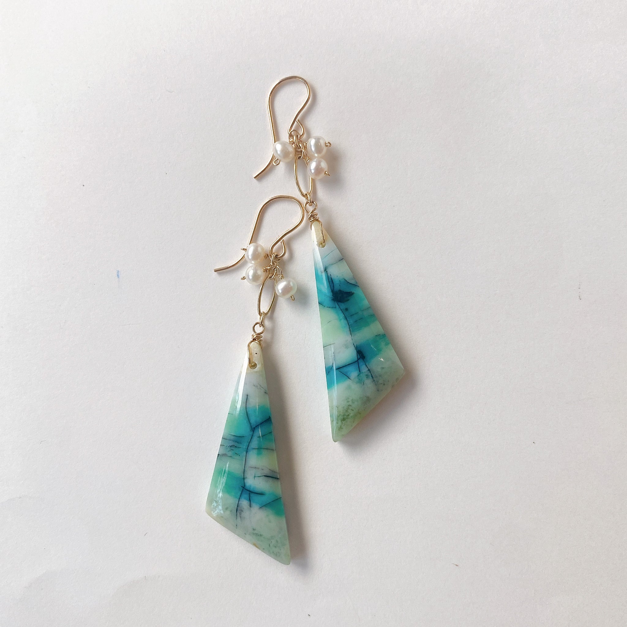 オパライズドウッドと淡水パールを使ってデザインした耳飾りです。