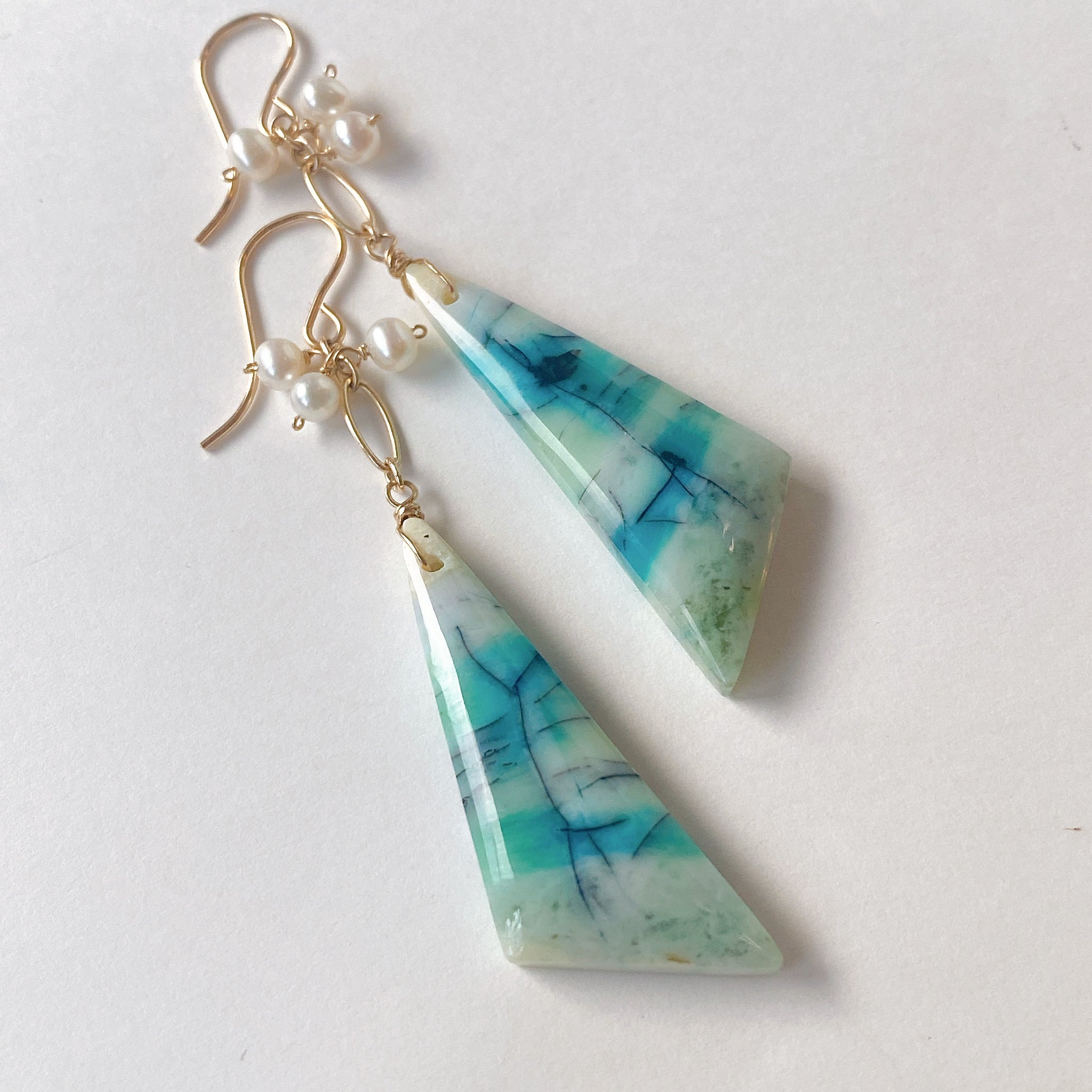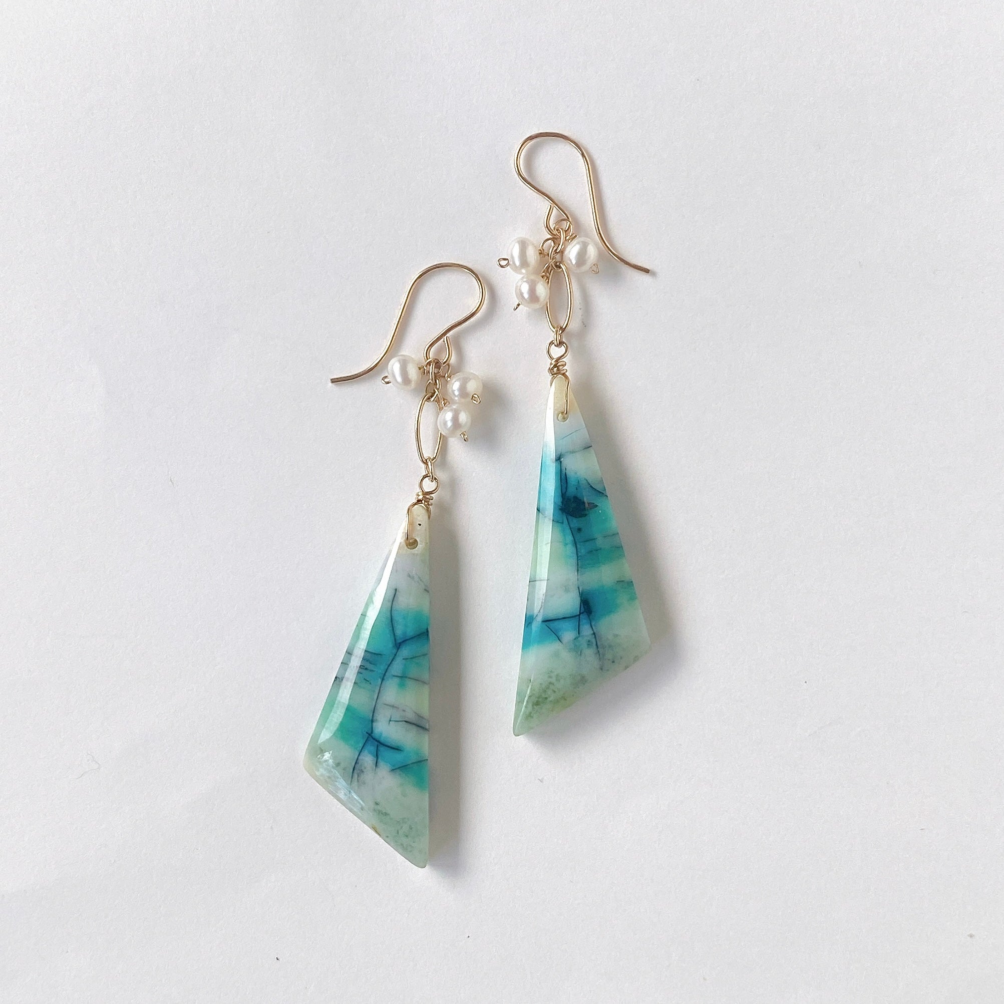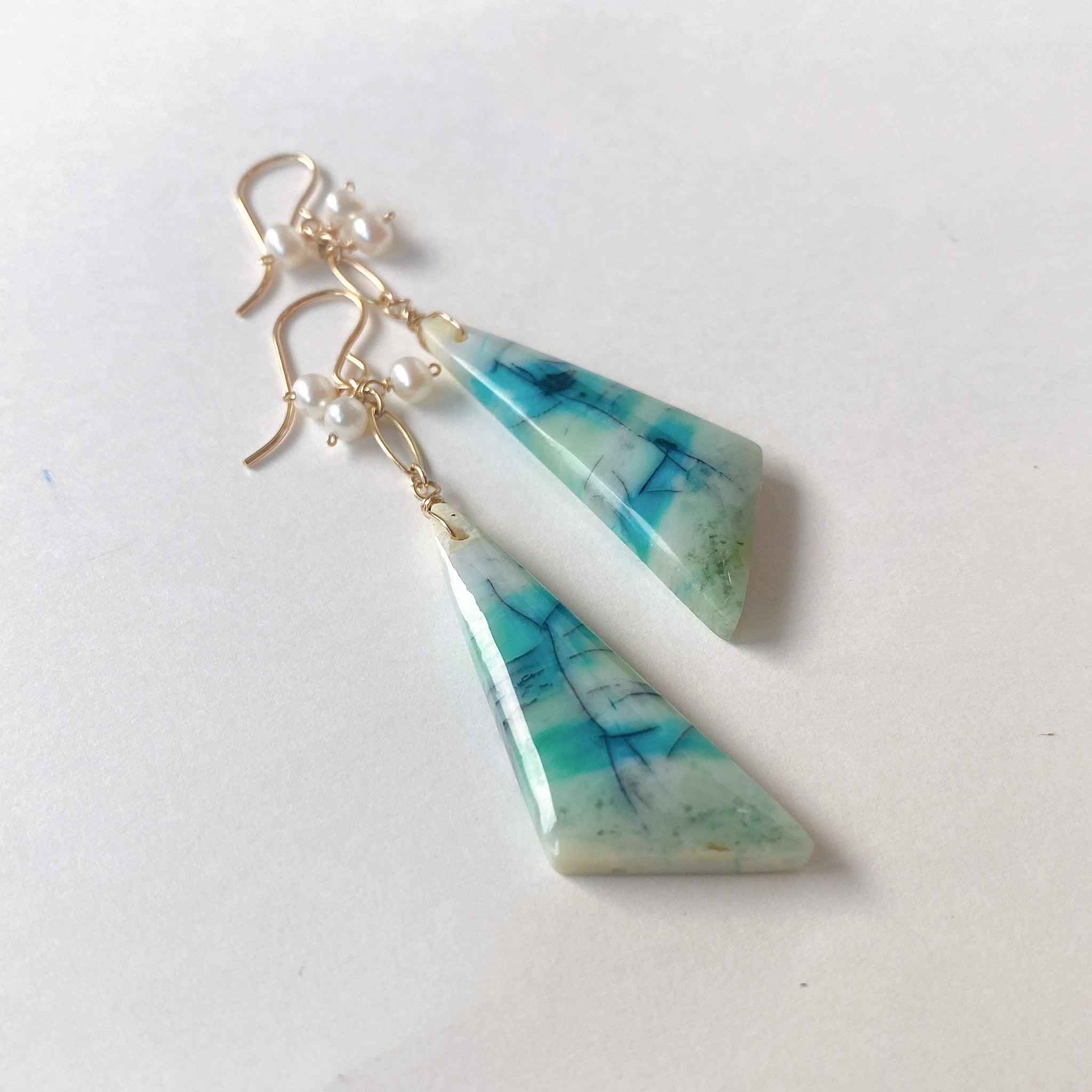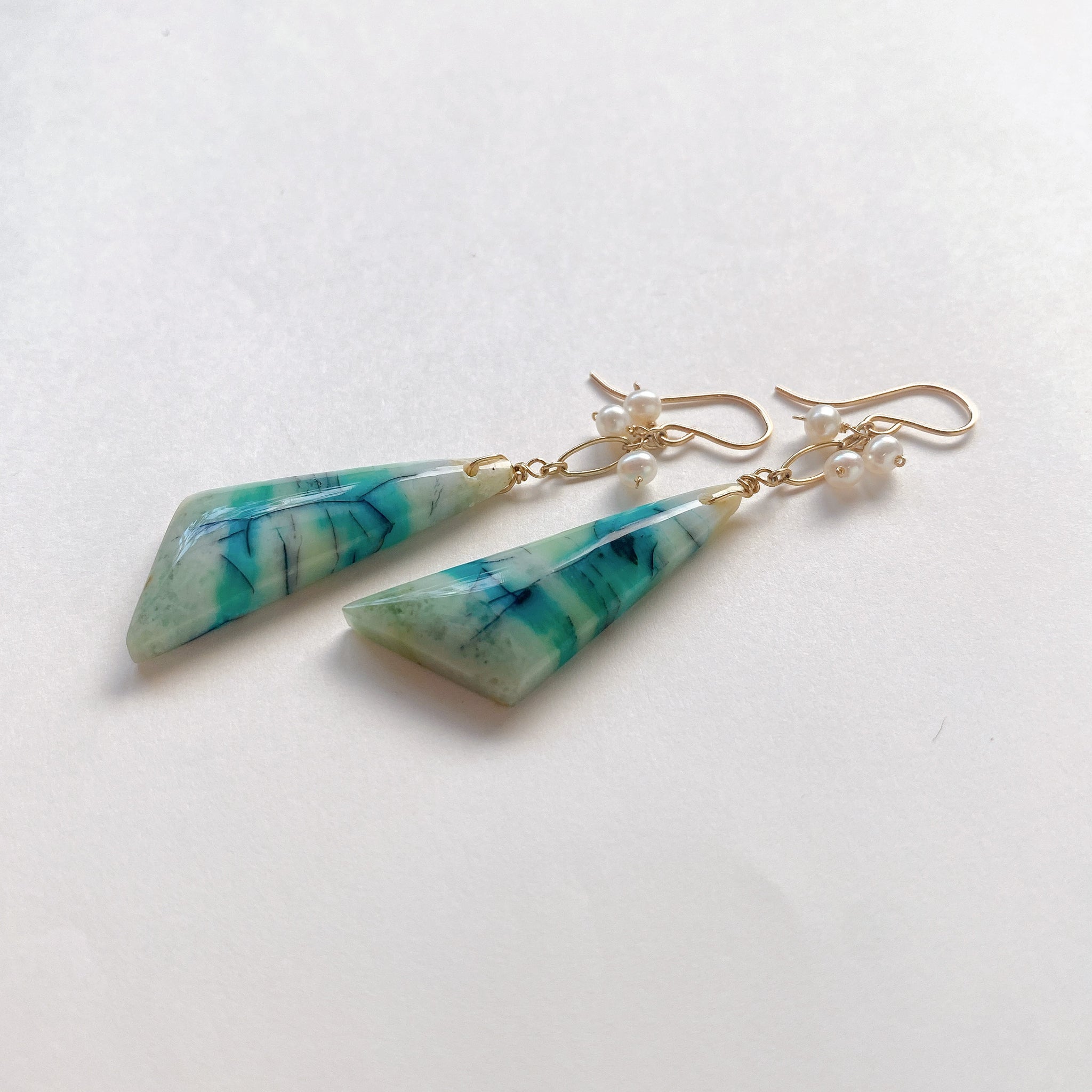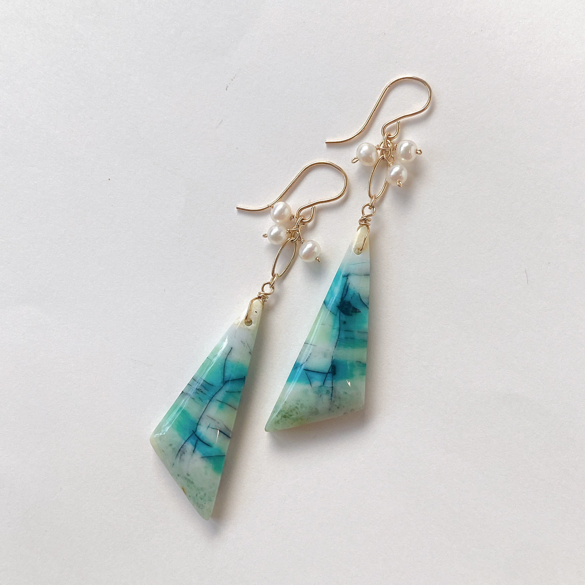 オパライズドウッドと淡水パールを使ってデザインした耳飾りです。