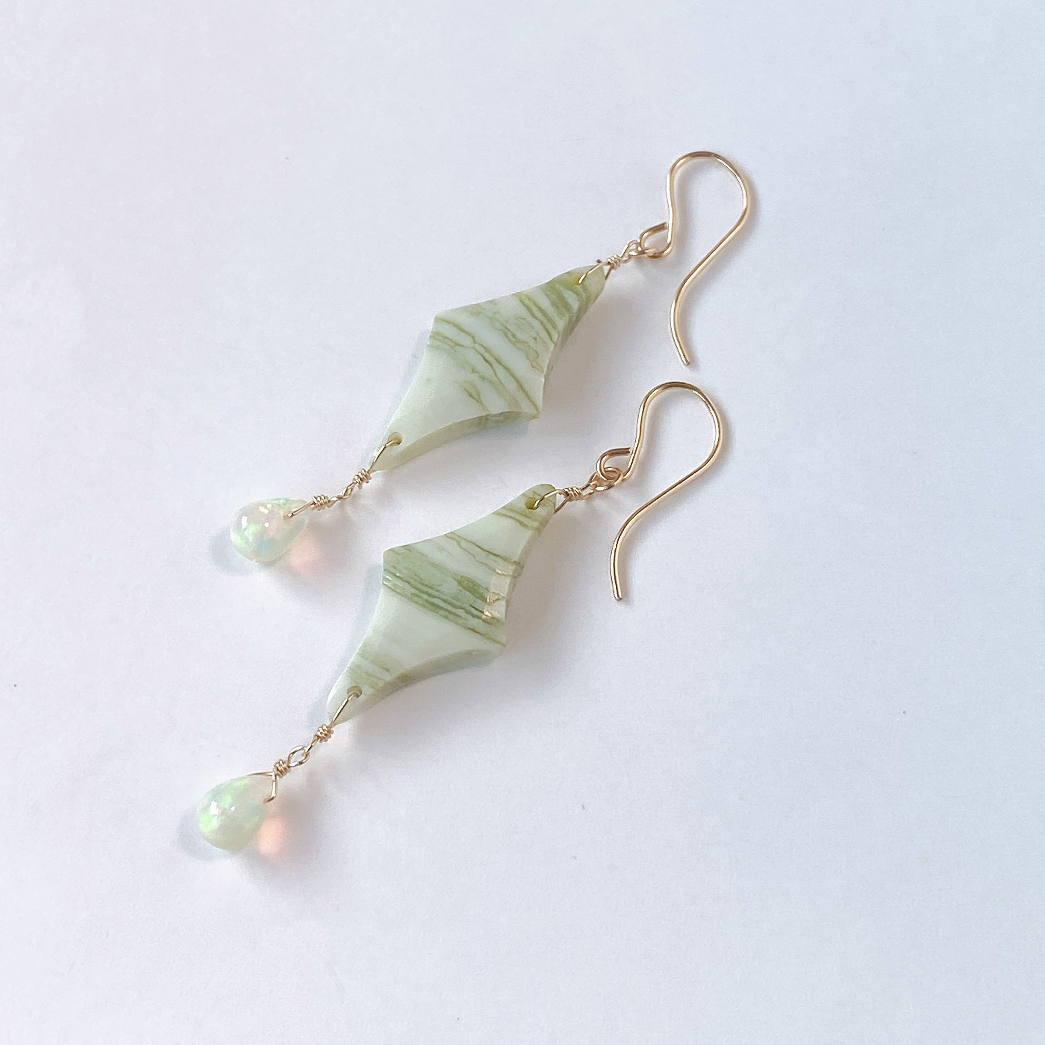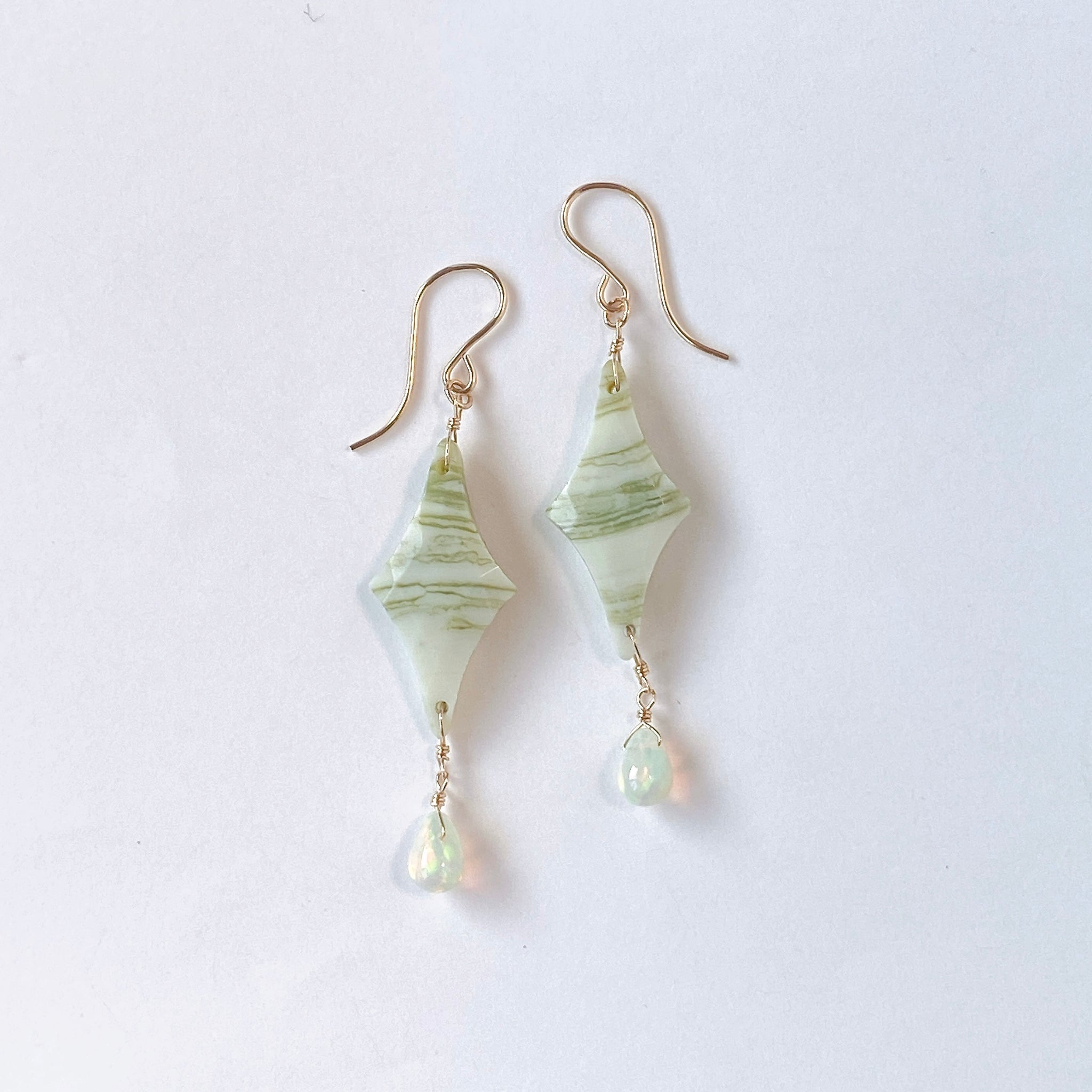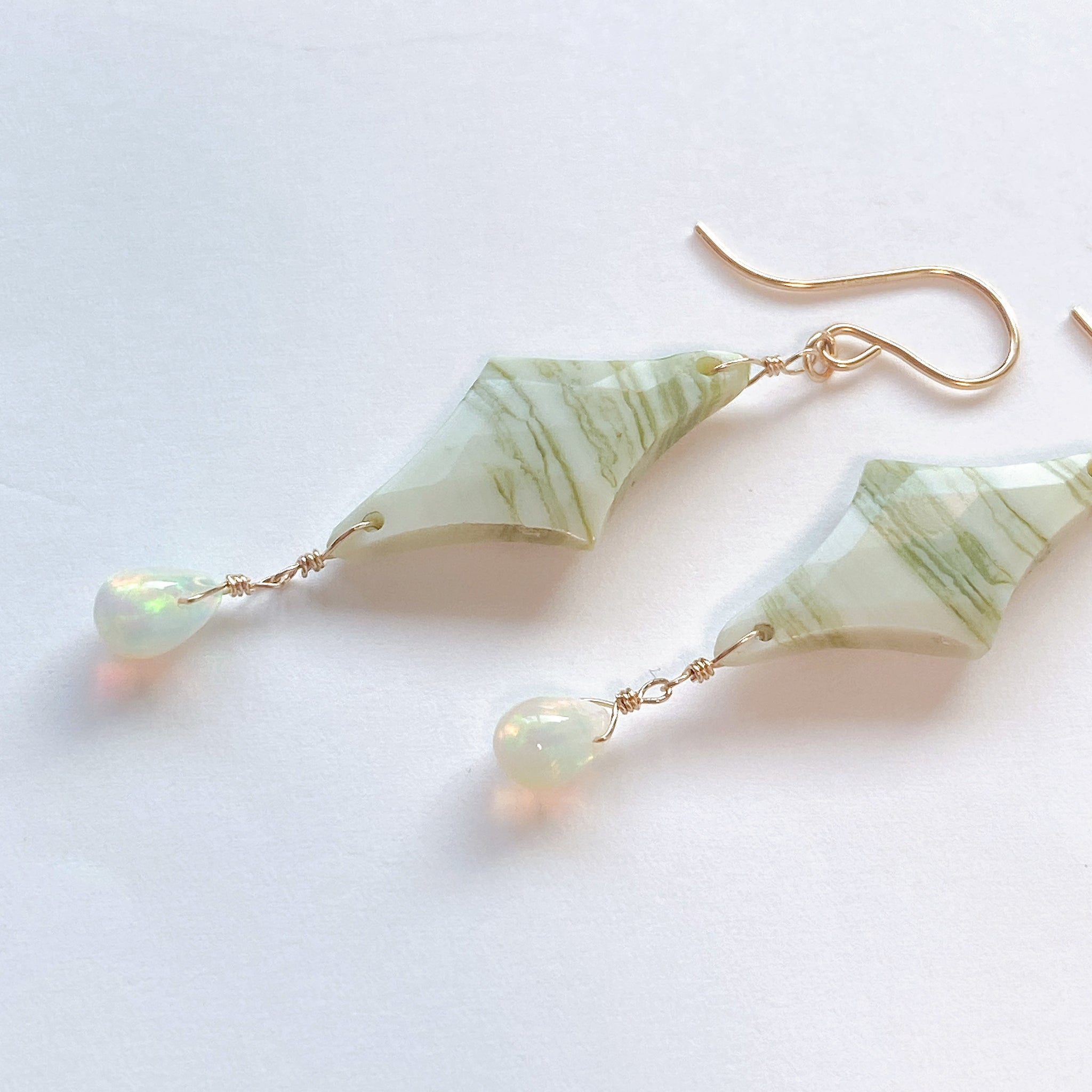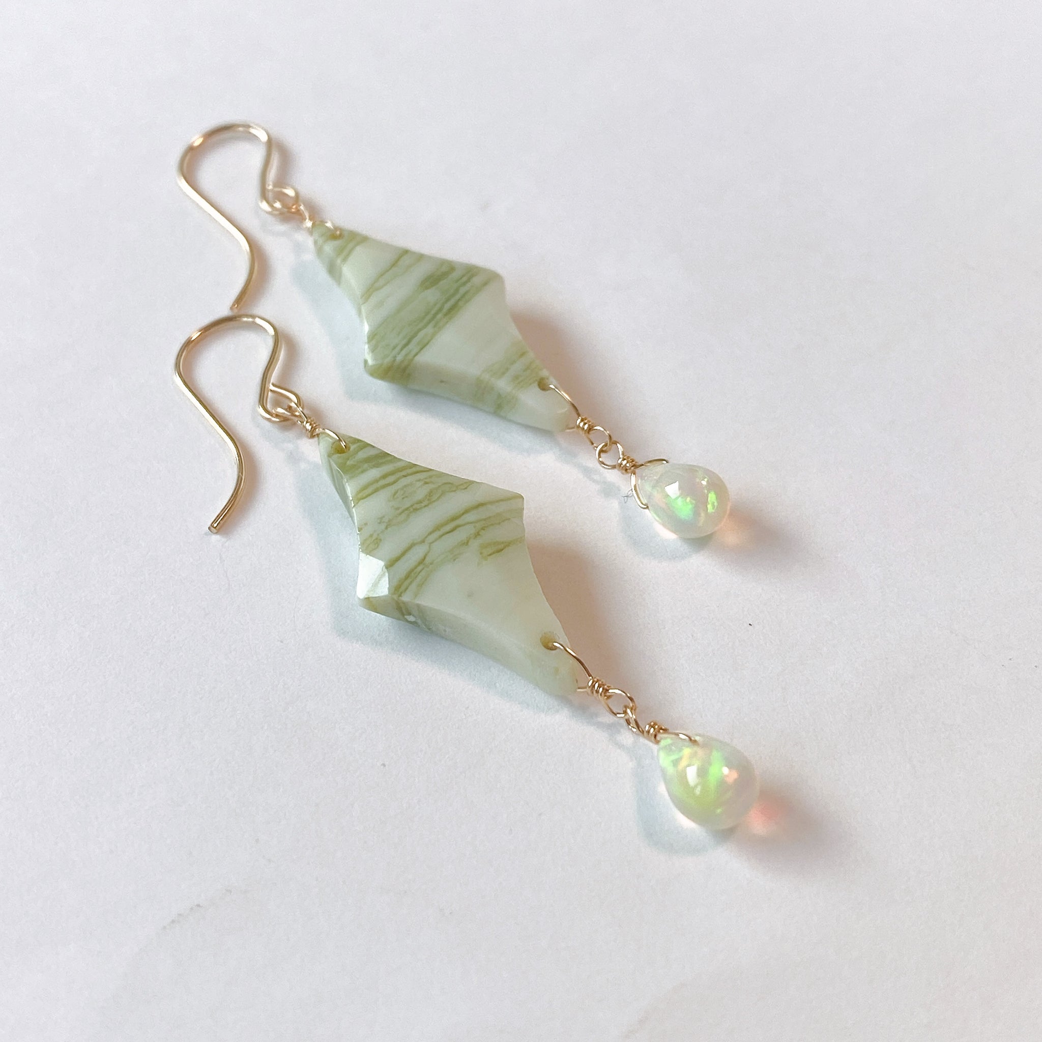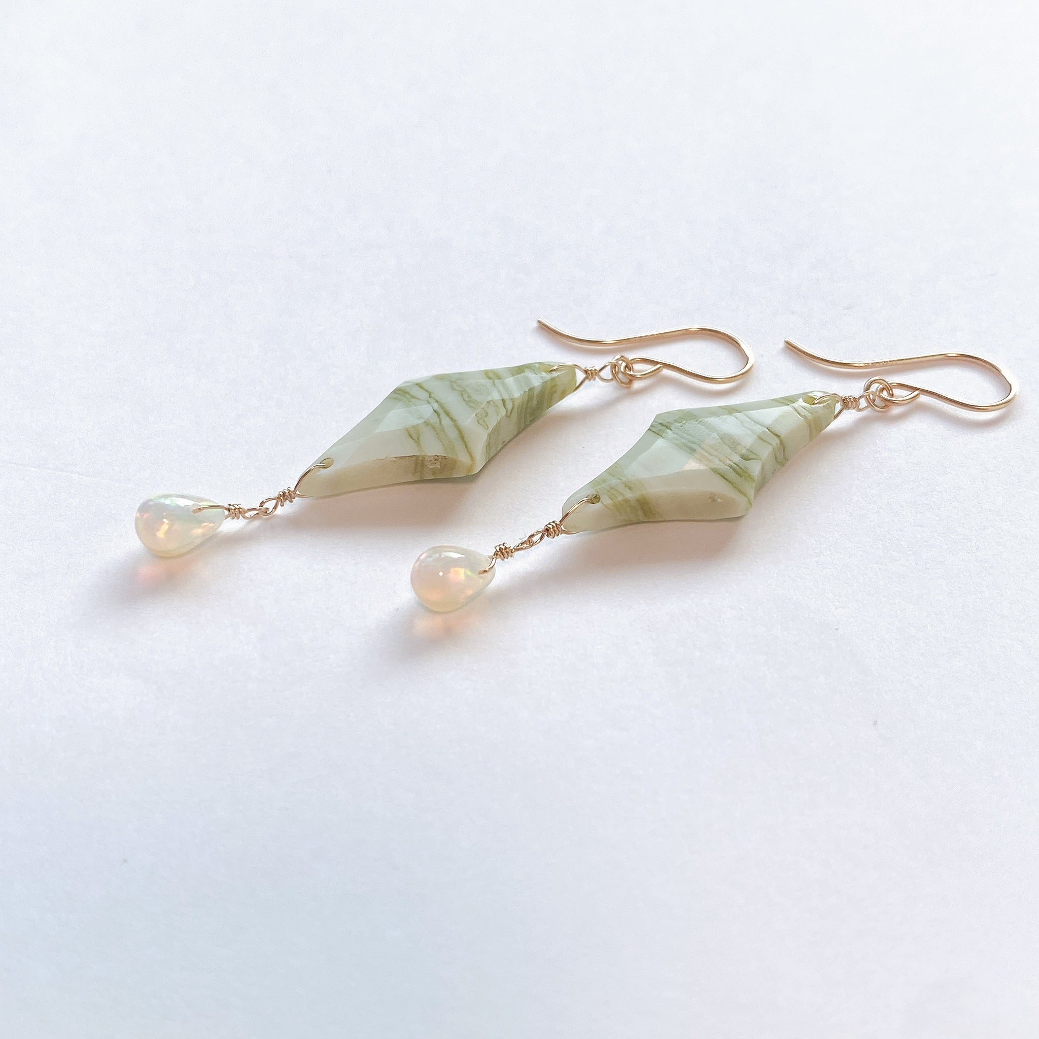 ロゼンジチェッカーカットのグリーンジャスパーとドロップカットのオパールを使ってデザインした耳飾りです。