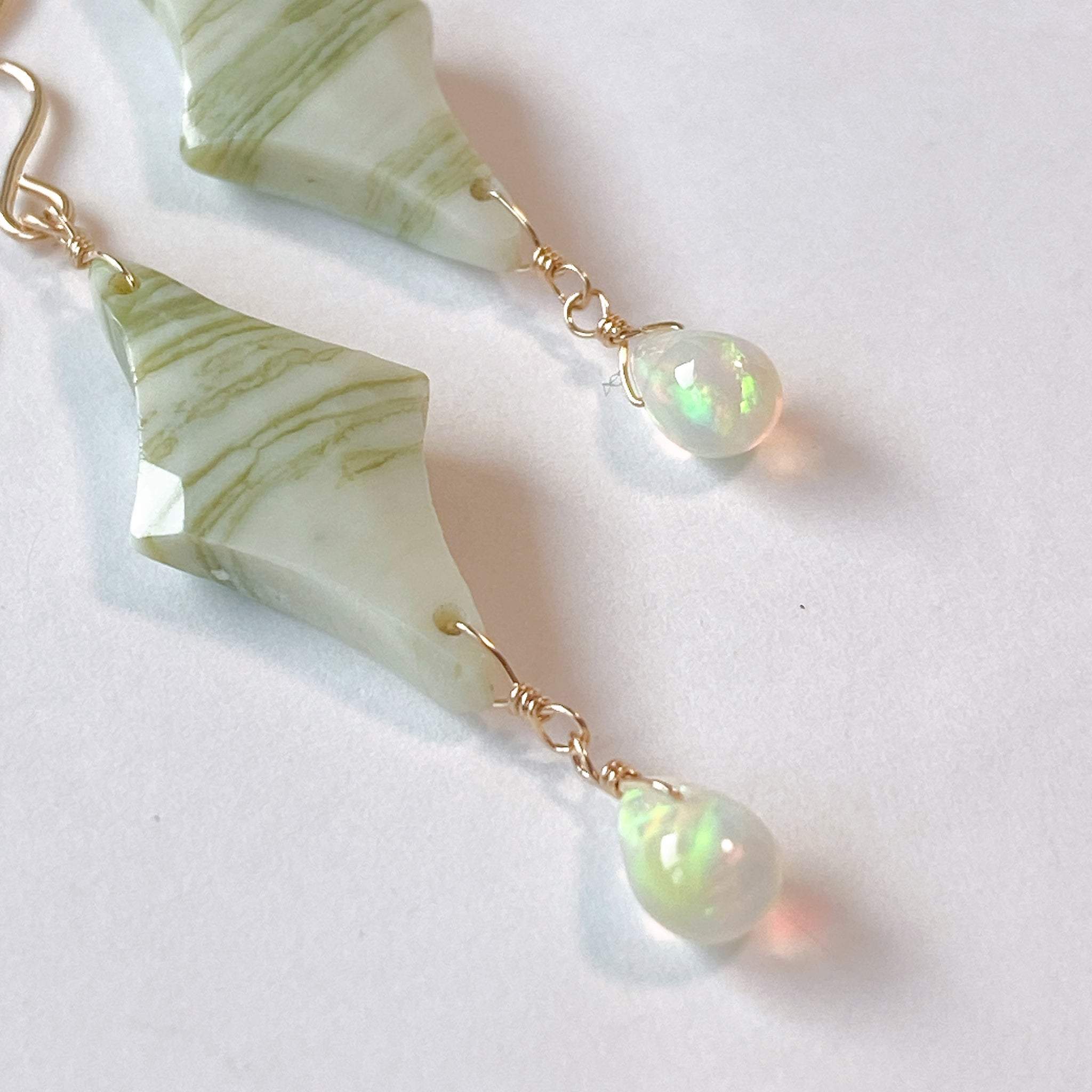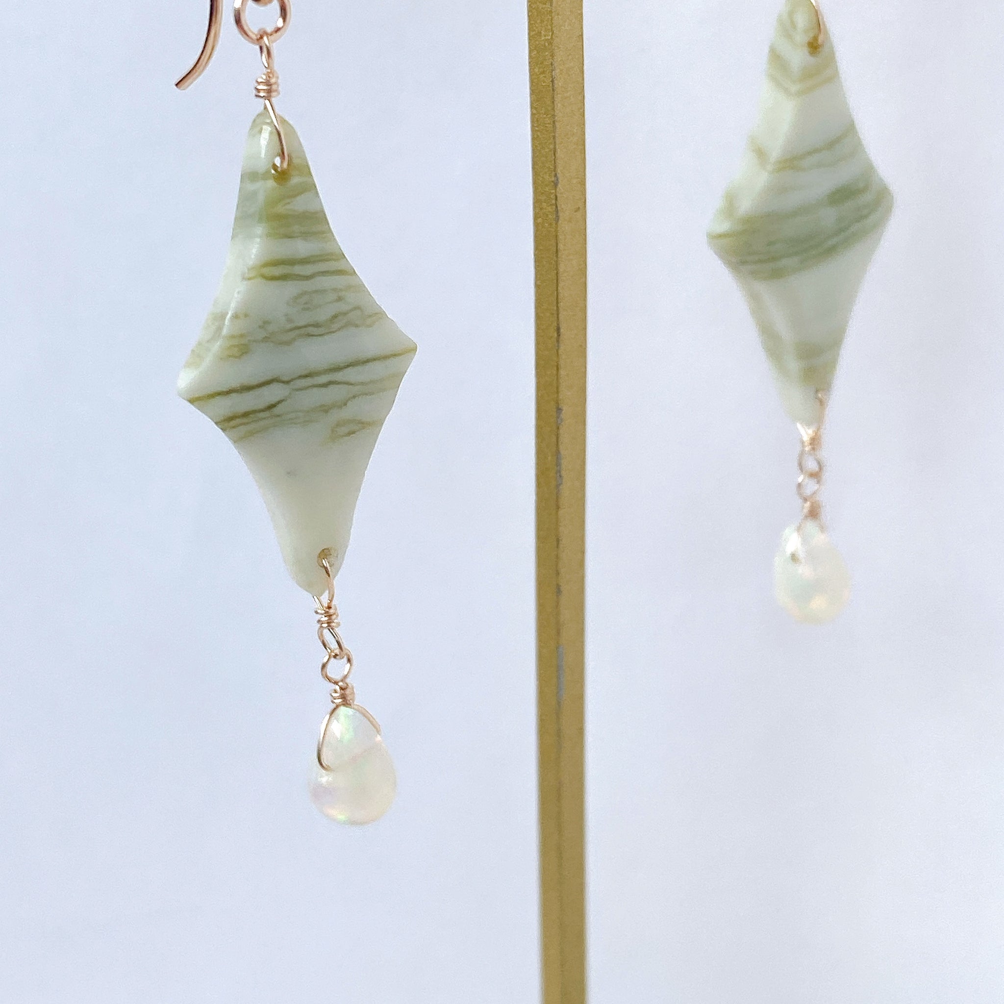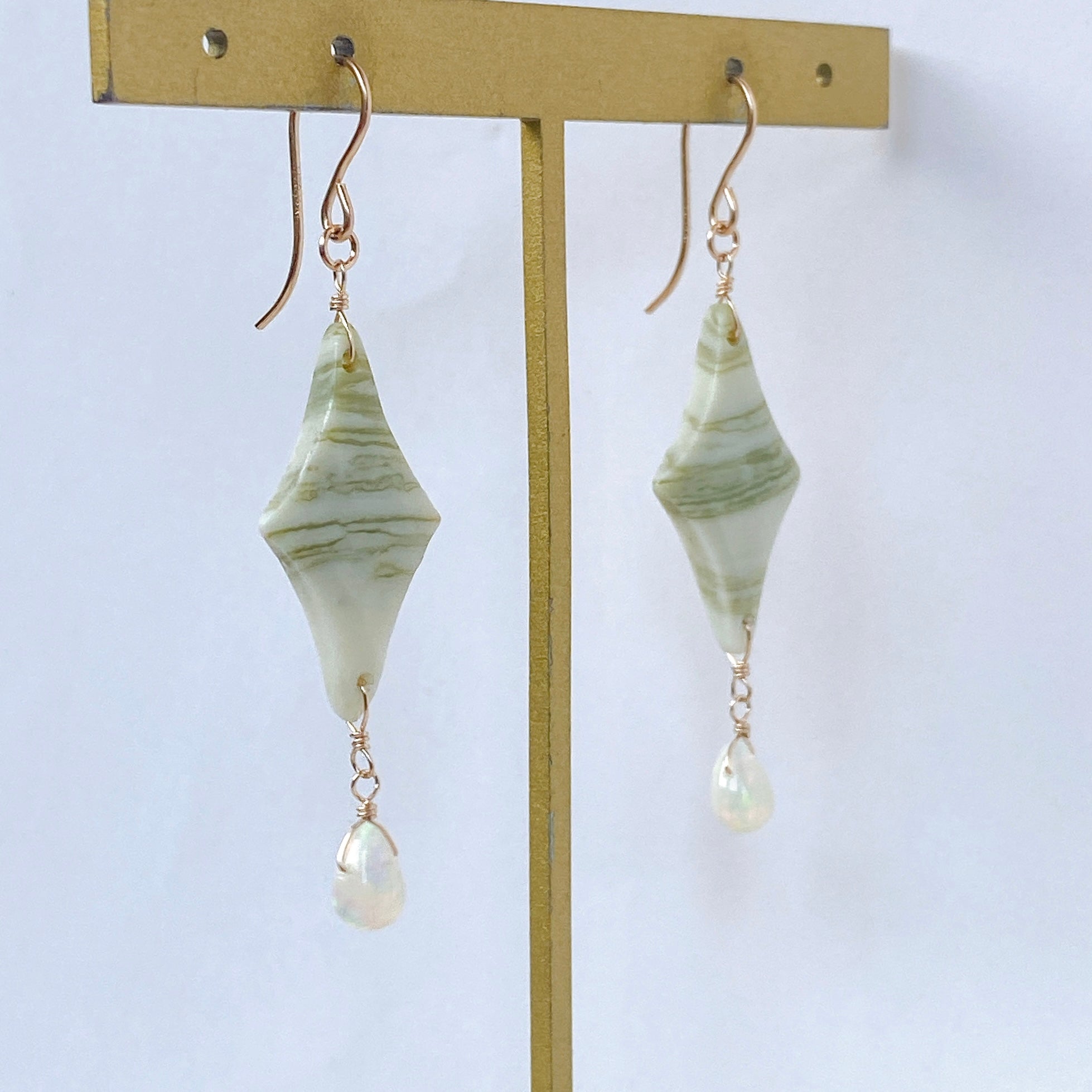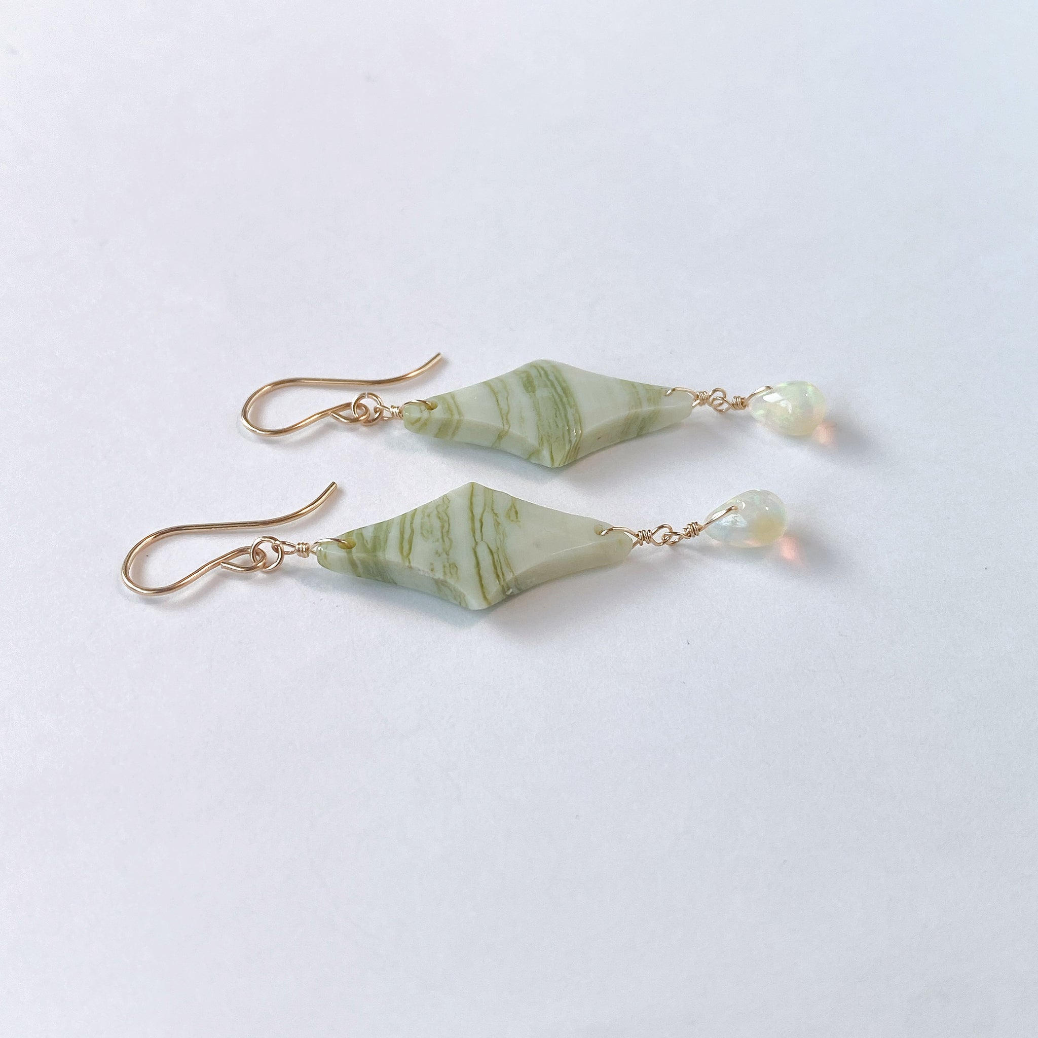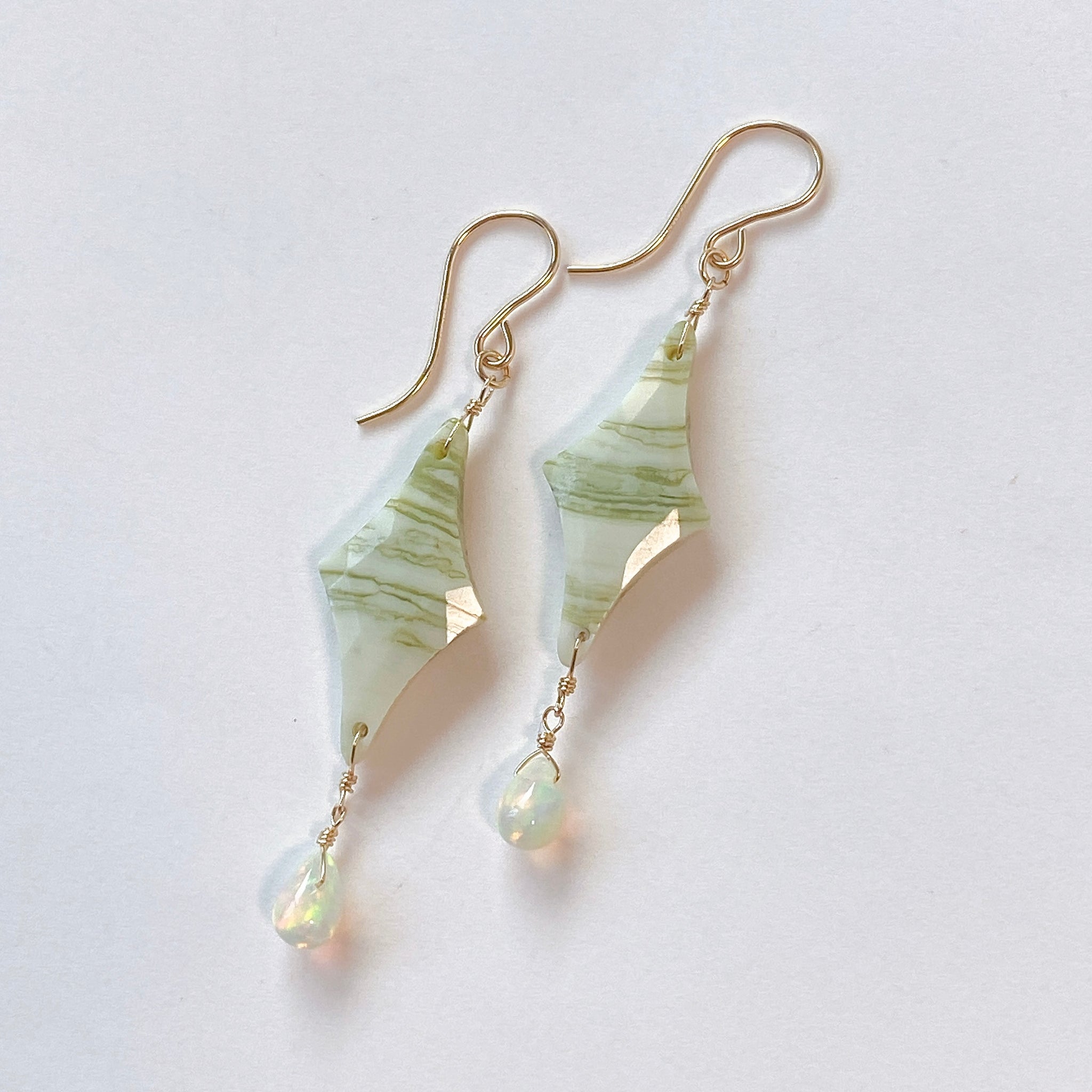 ロゼンジチェッカーカットのグリーンジャスパーとドロップカットのオパールを使ってデザインした耳飾りです。