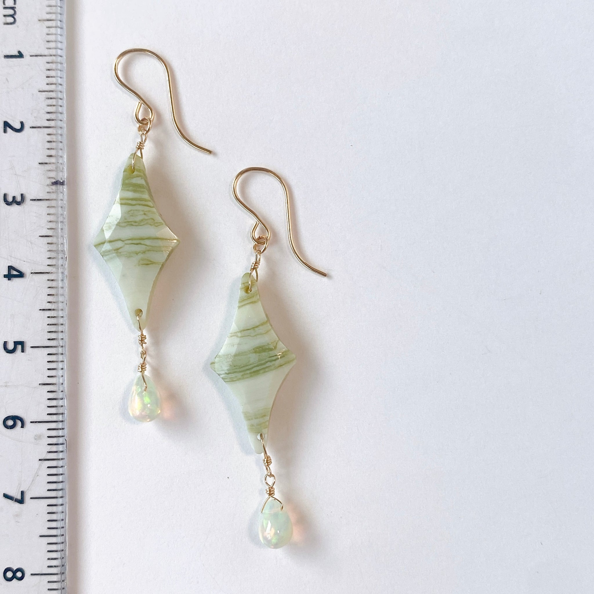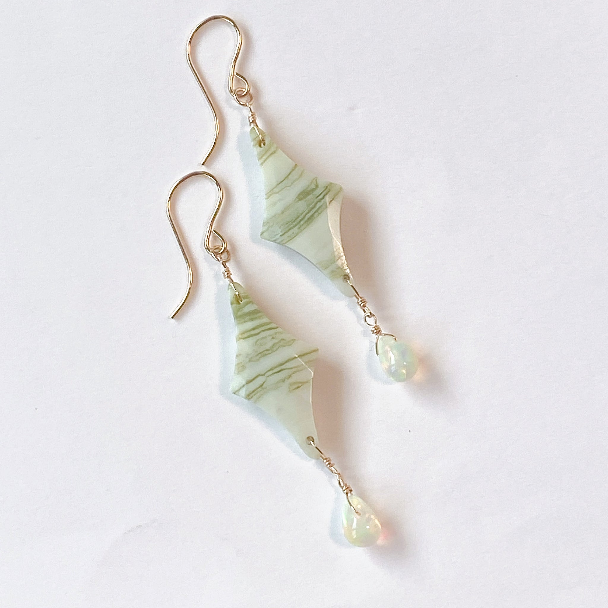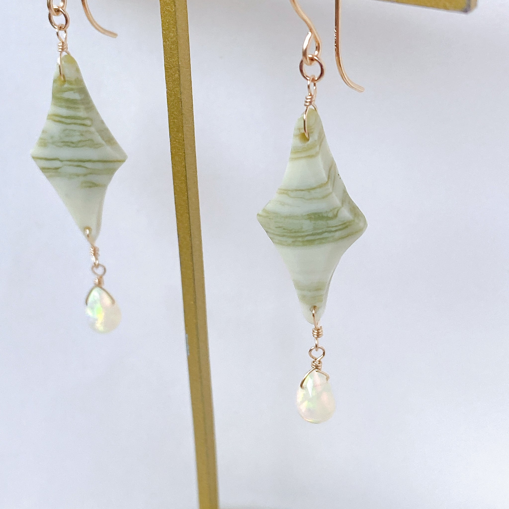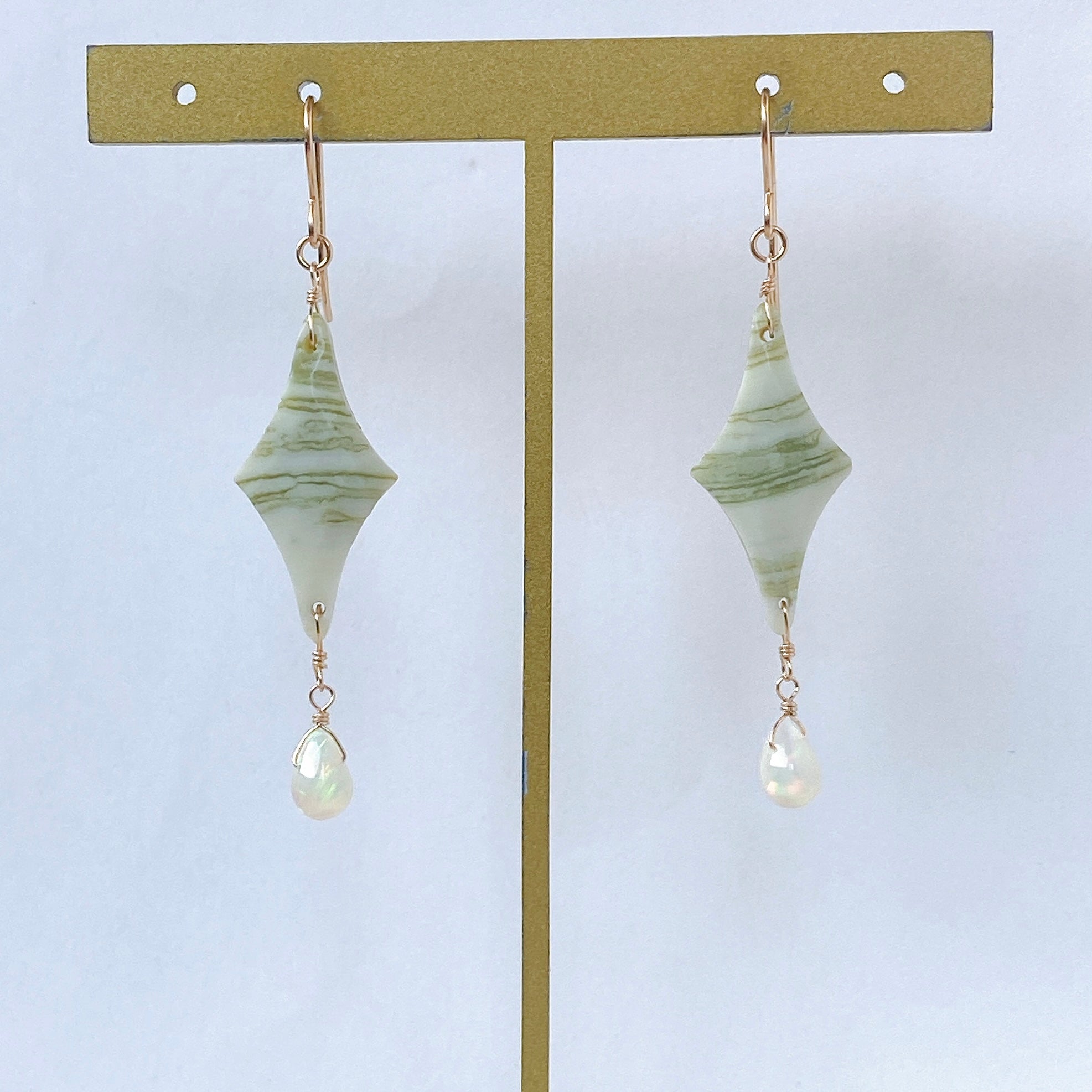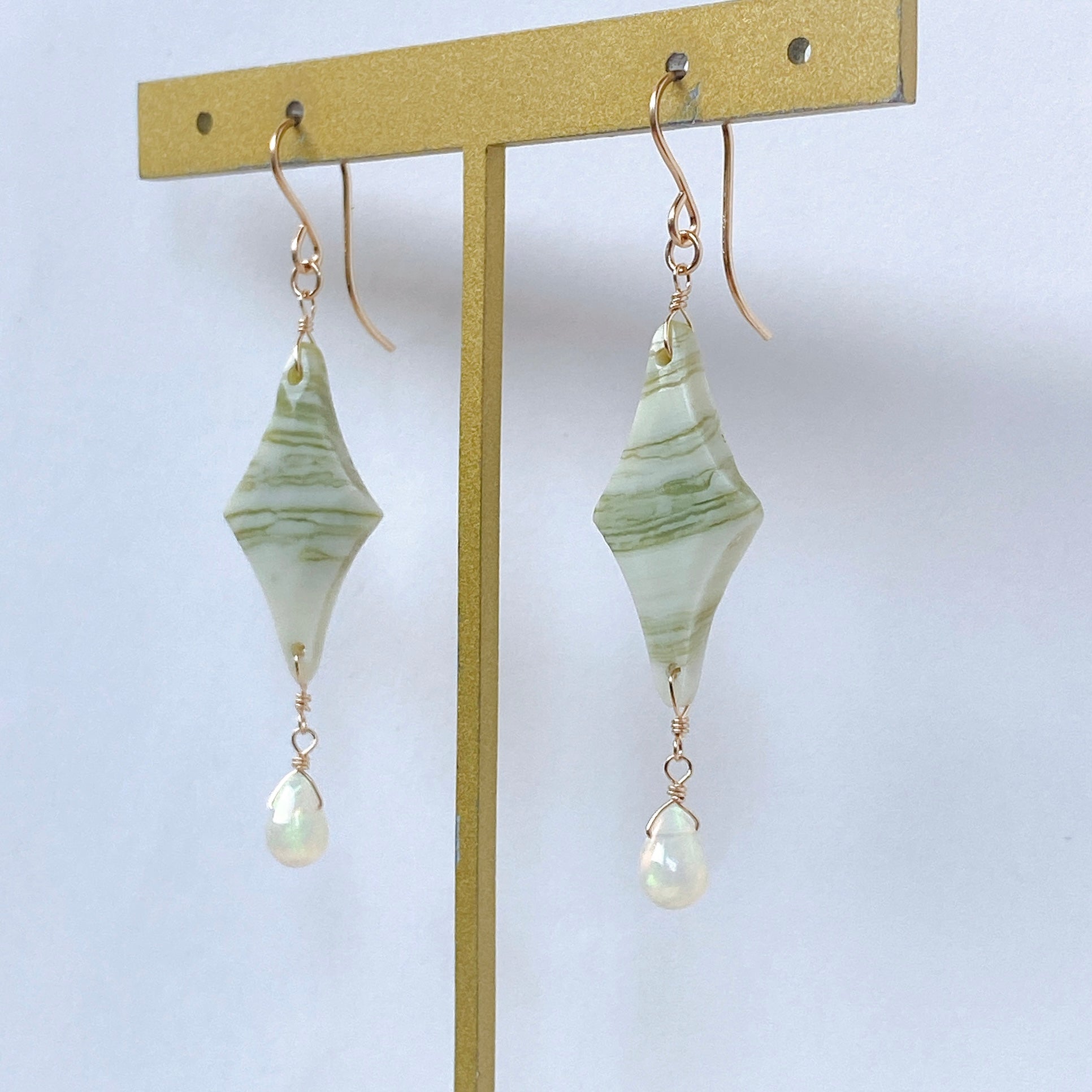 ロゼンジチェッカーカットのグリーンジャスパーとドロップカットのオパールを使ってデザインした耳飾りです。