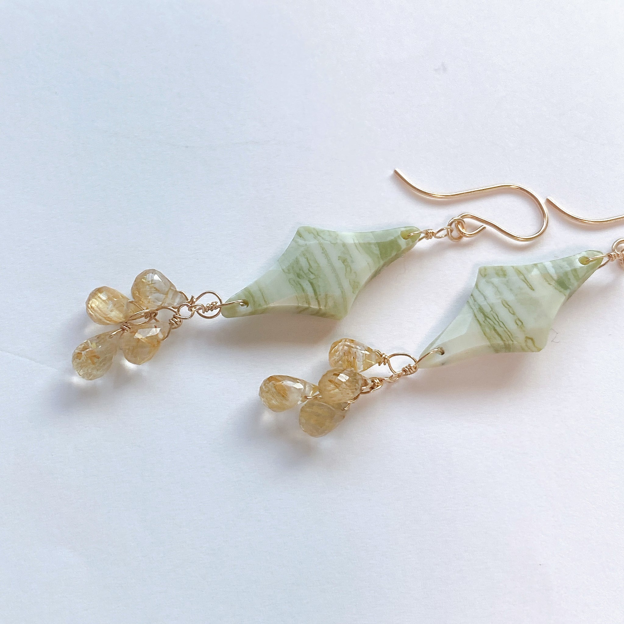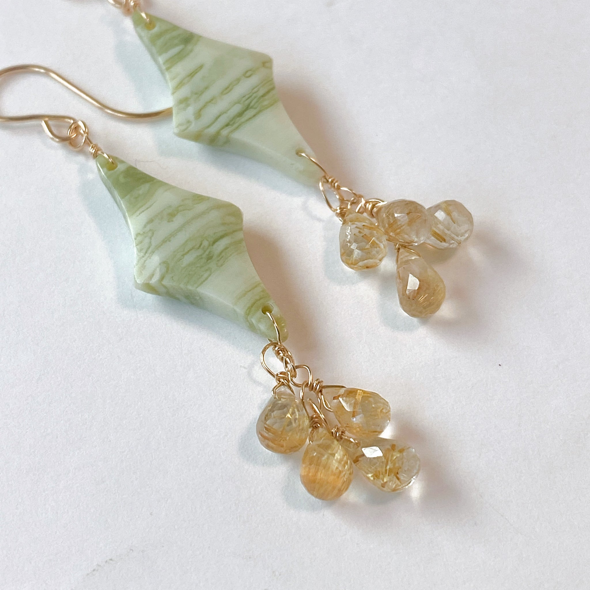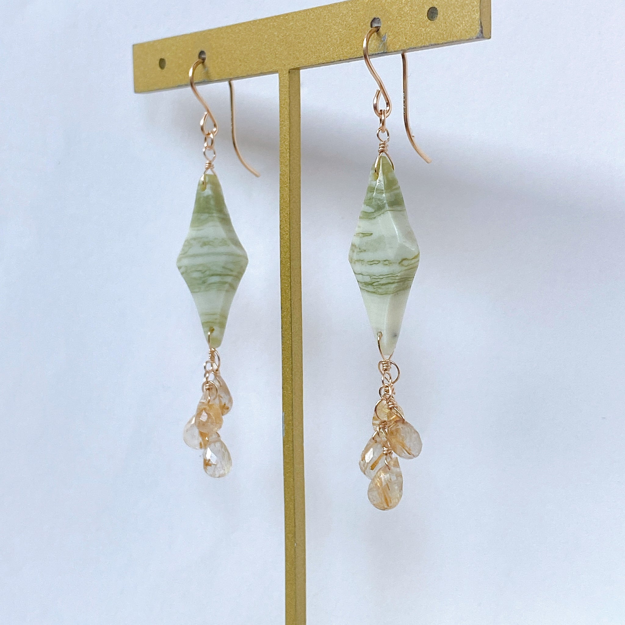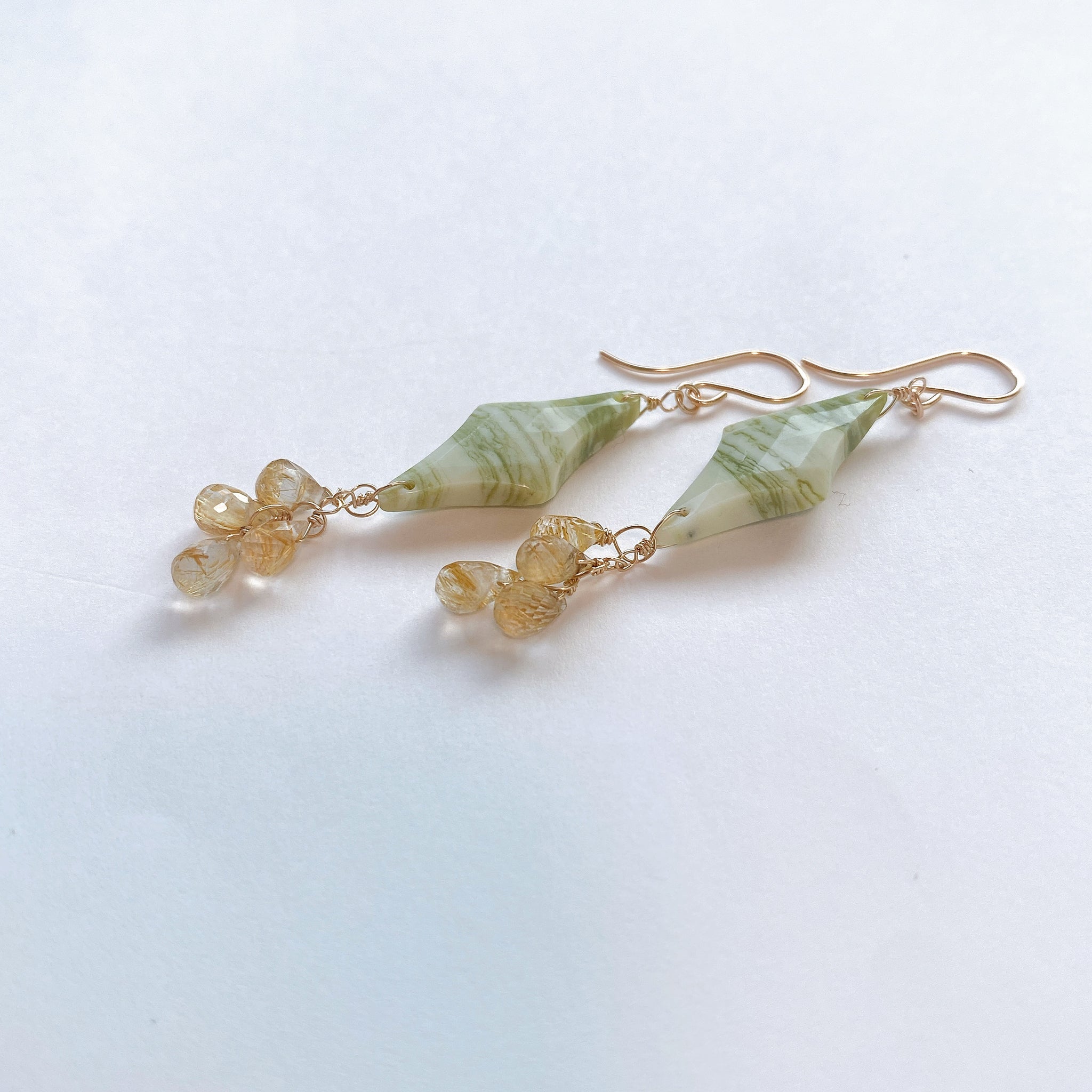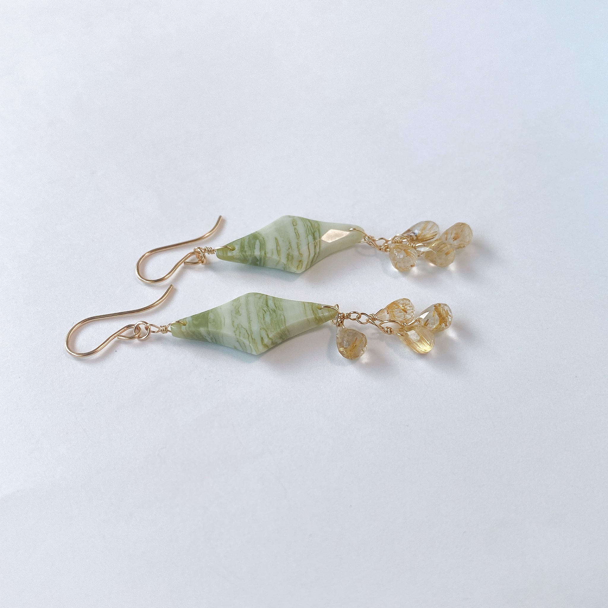 ロゼンジチェッカーカットのグリーンジャスパーとドロップカットのゴールデンルチルクォーツを使ってデザインした耳飾りです。