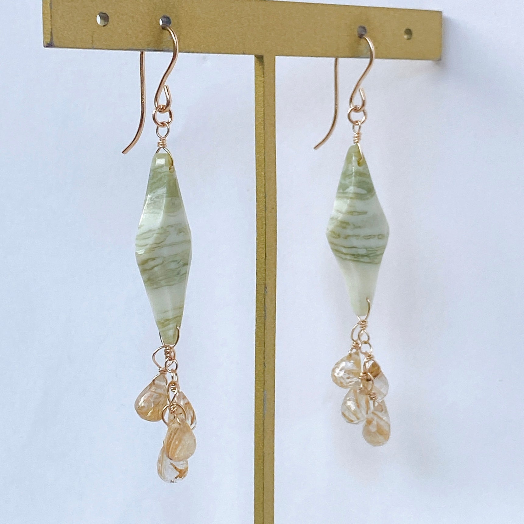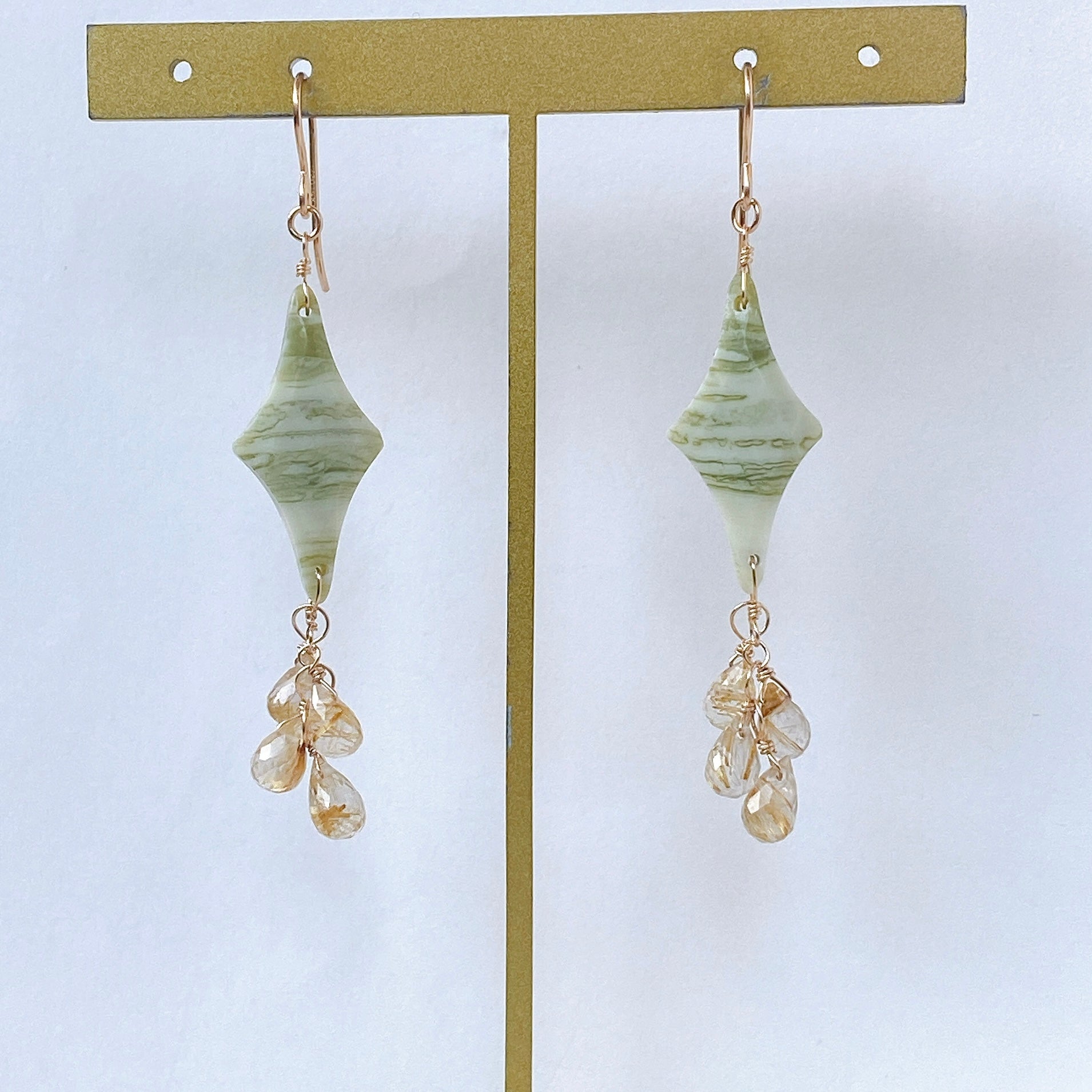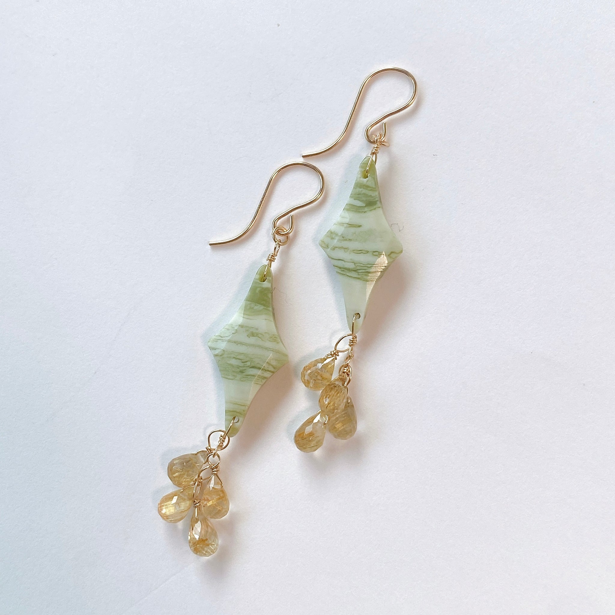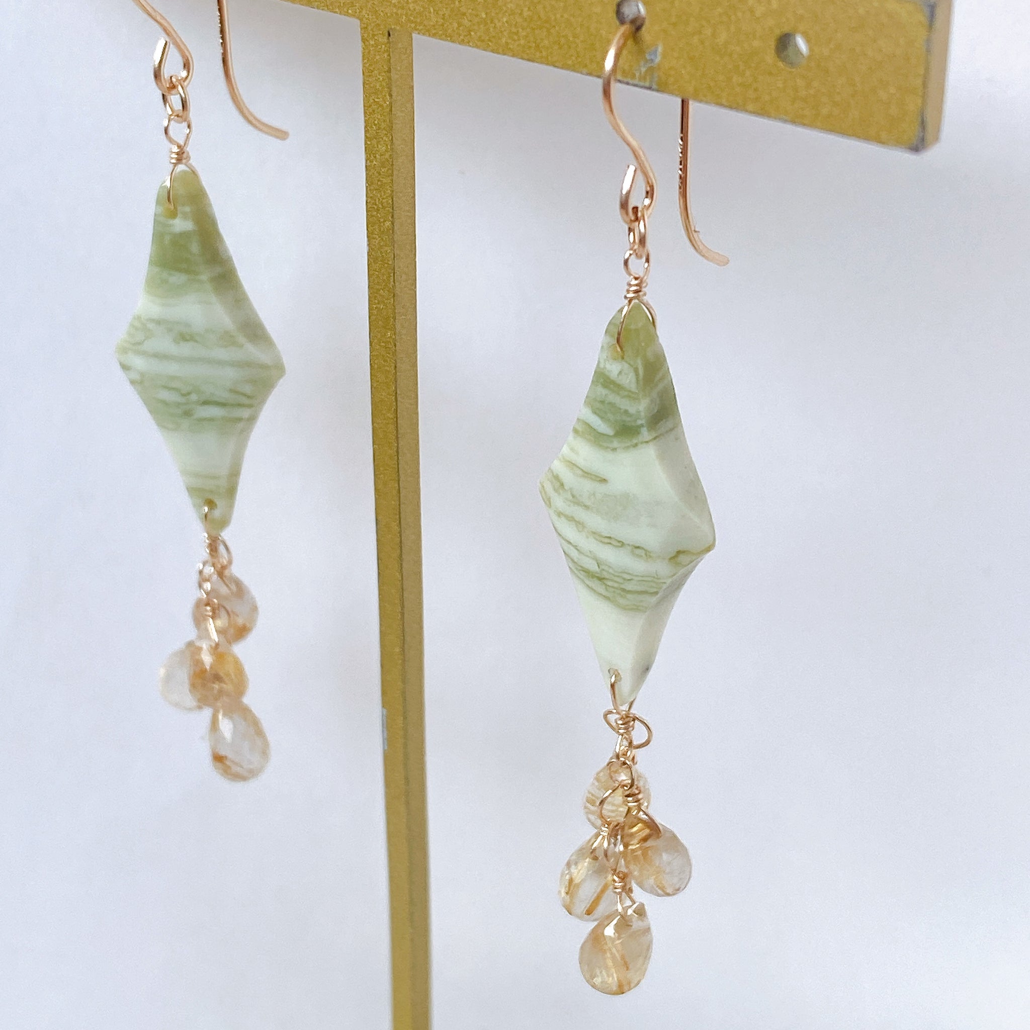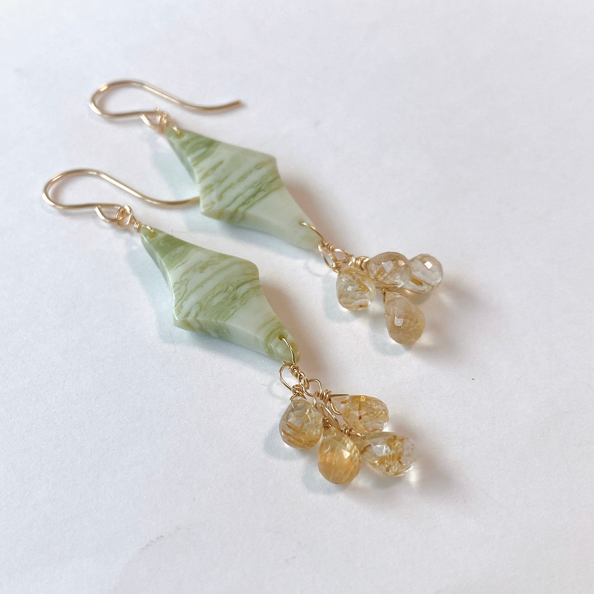 ロゼンジチェッカーカットのグリーンジャスパーとドロップカットのゴールデンルチルクォーツを使ってデザインした耳飾りです。