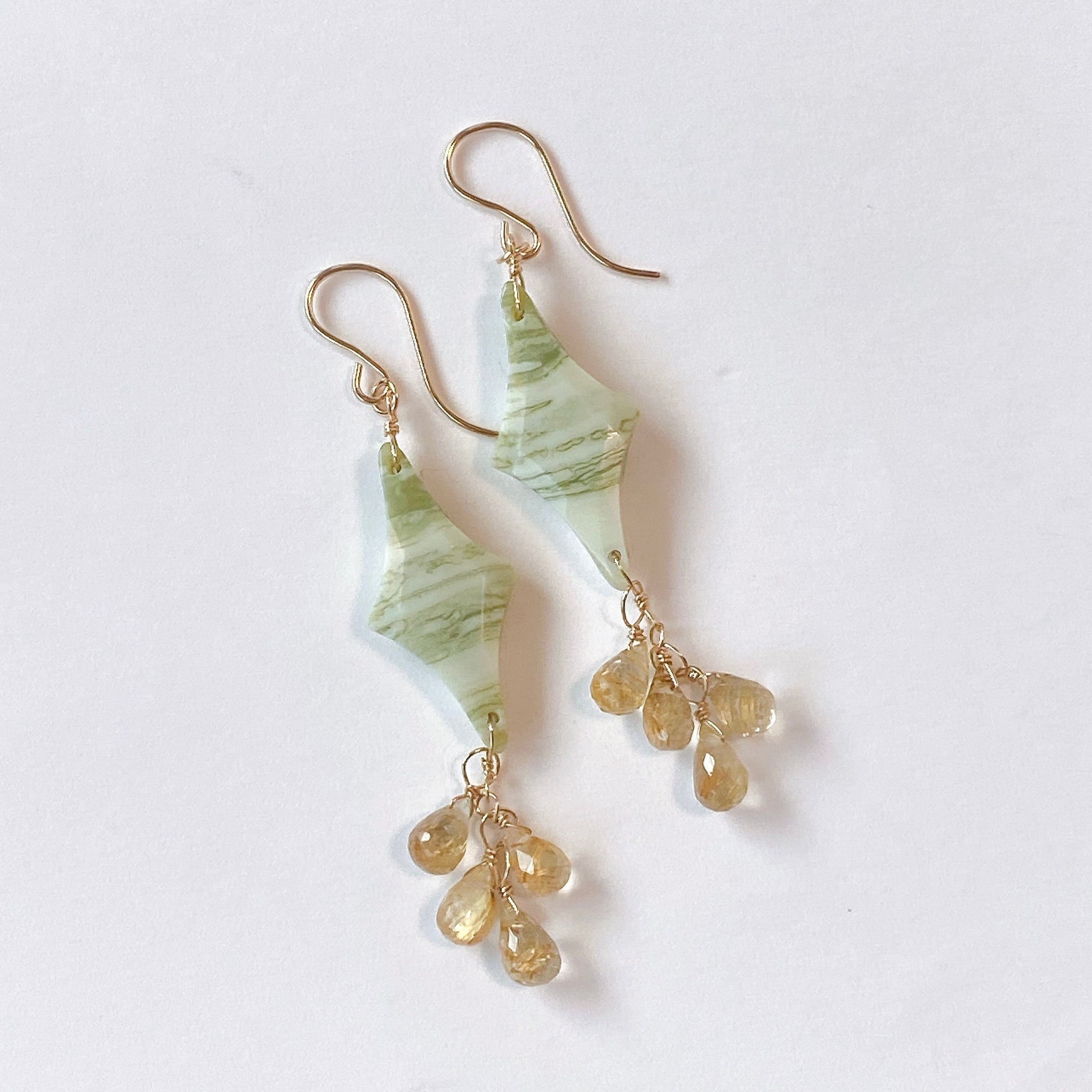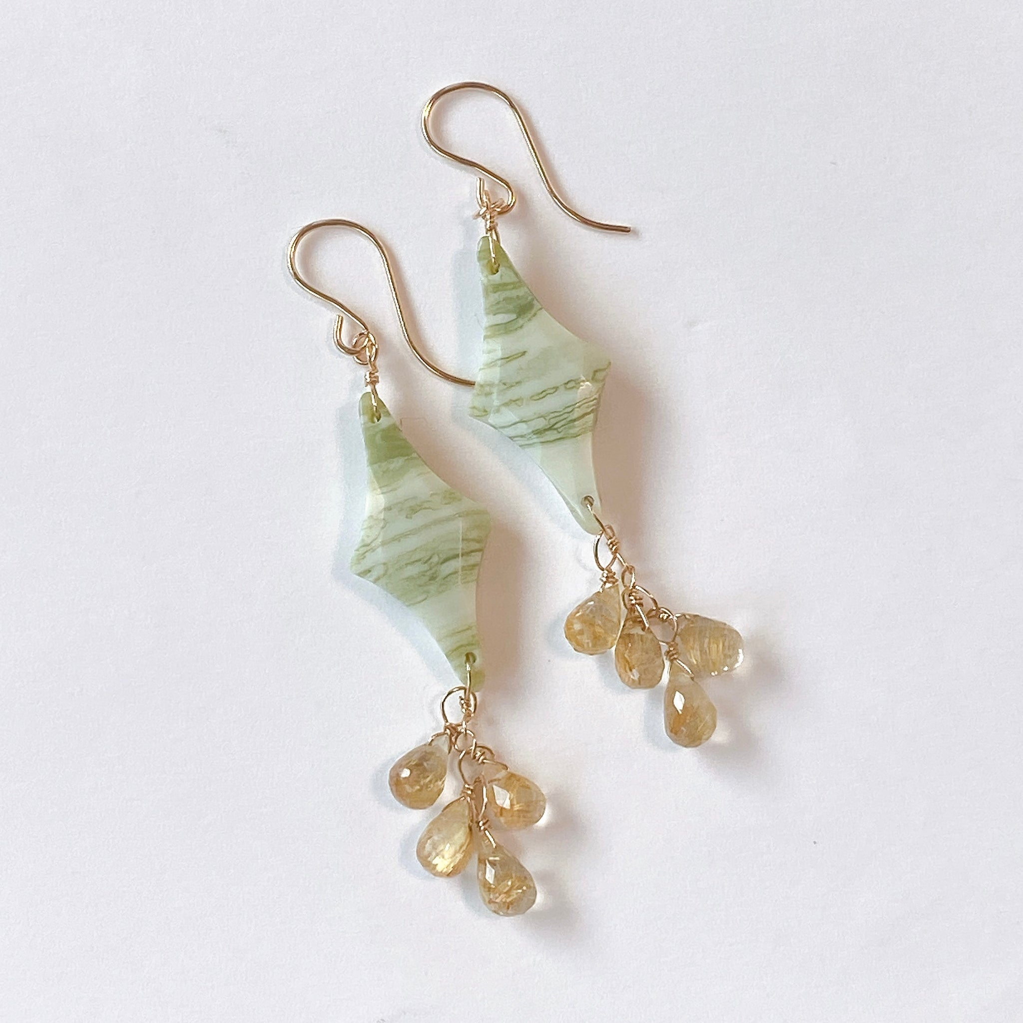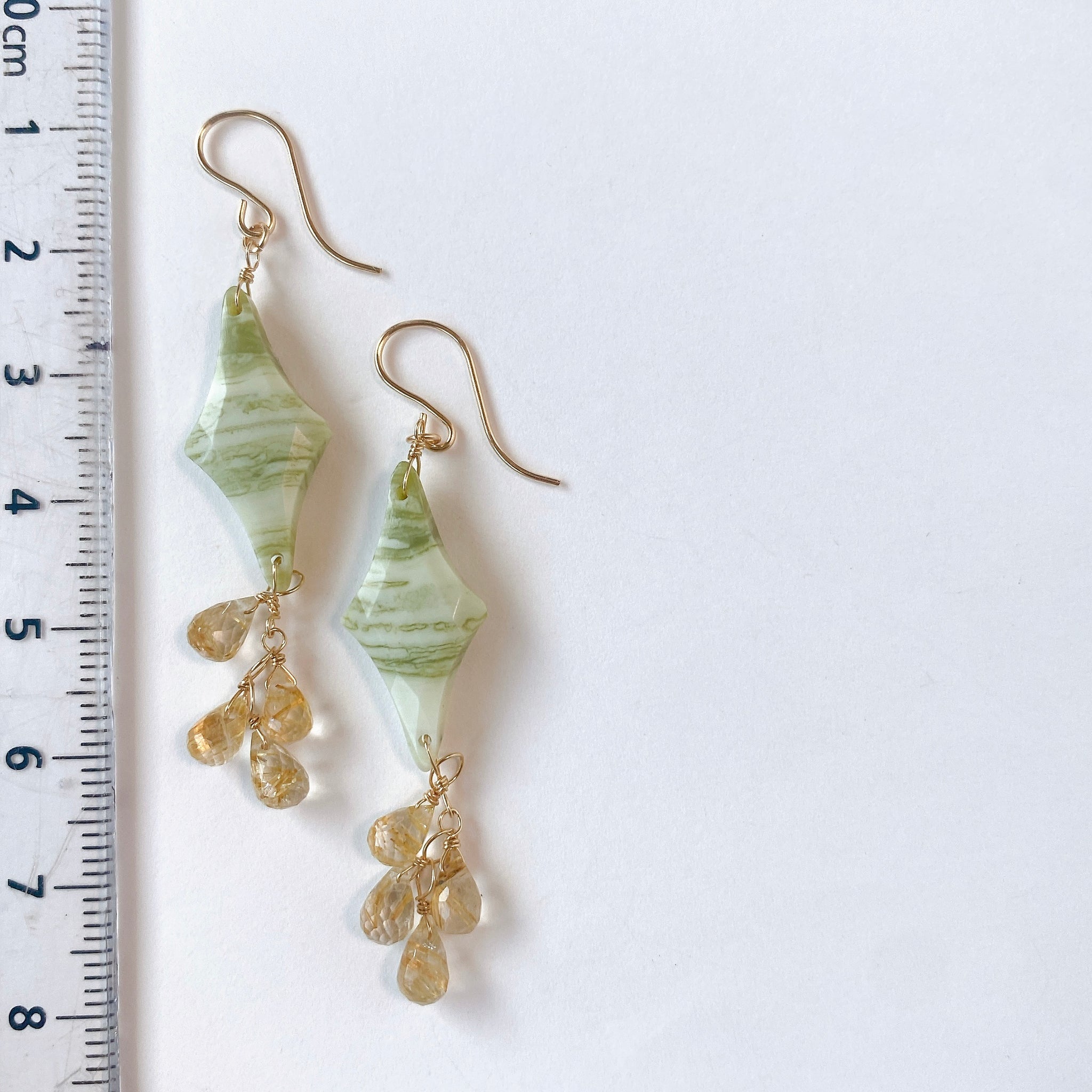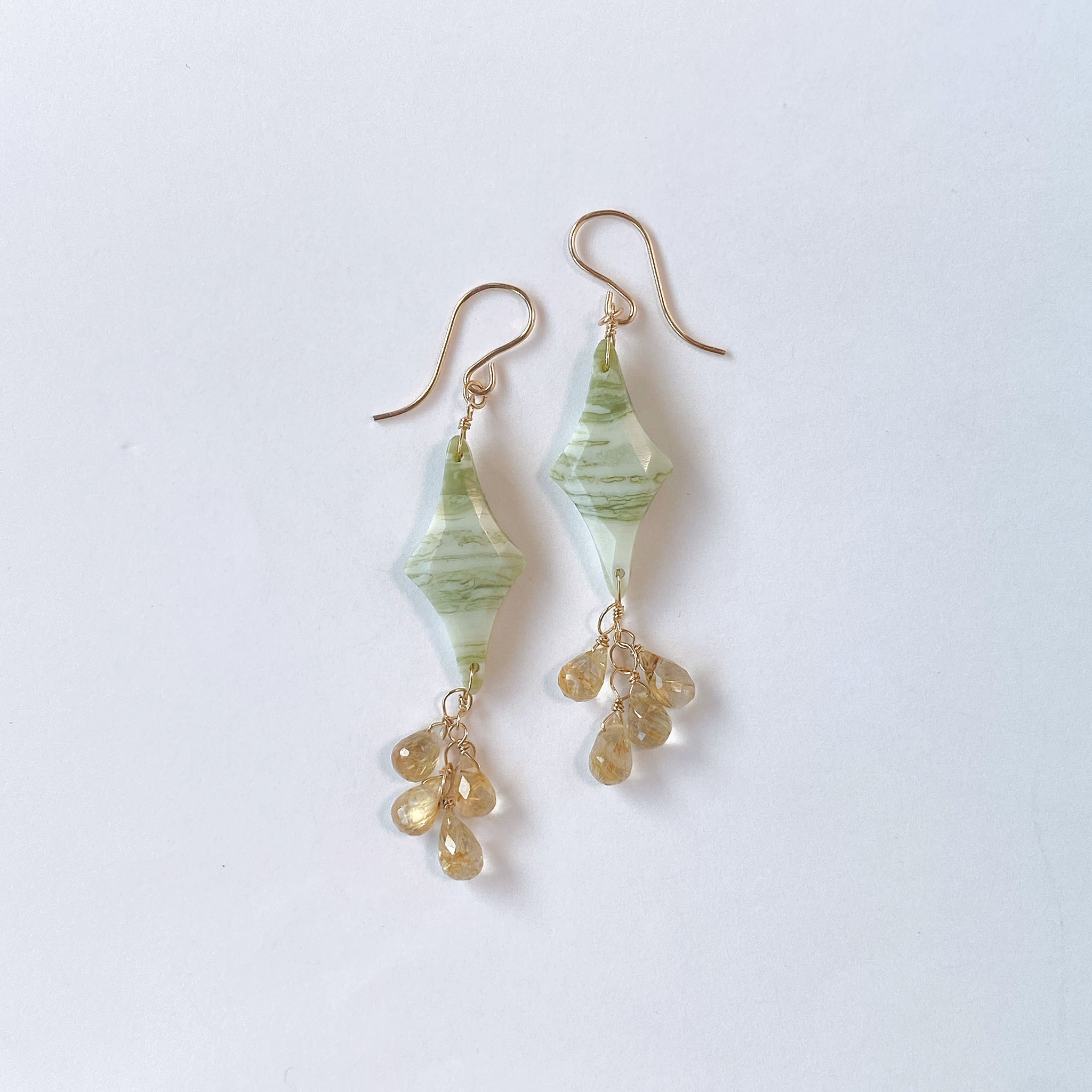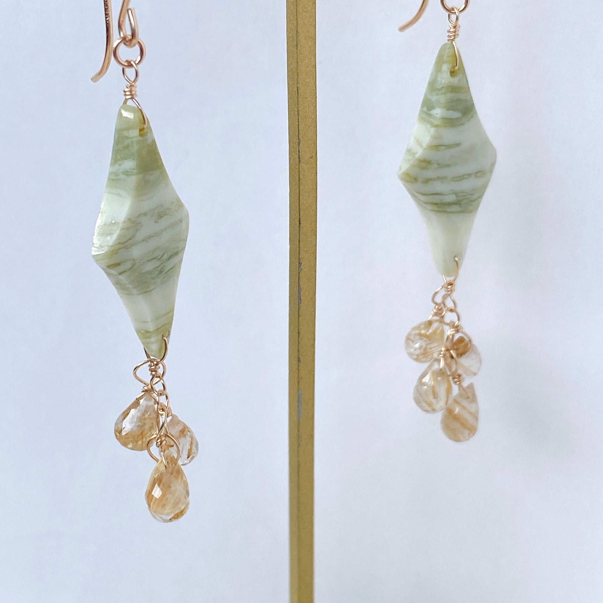 ロゼンジチェッカーカットのグリーンジャスパーとドロップカットのゴールデンルチルクォーツを使ってデザインした耳飾りです。