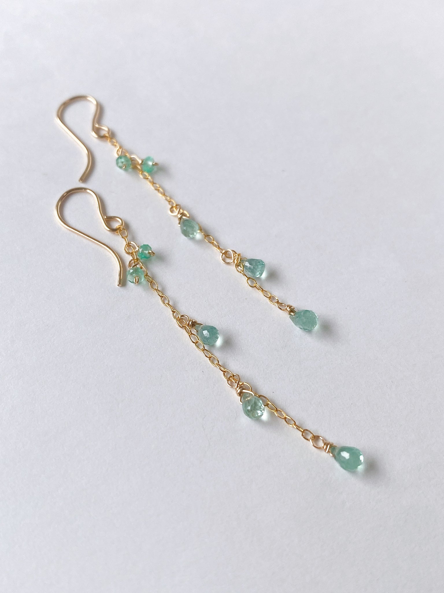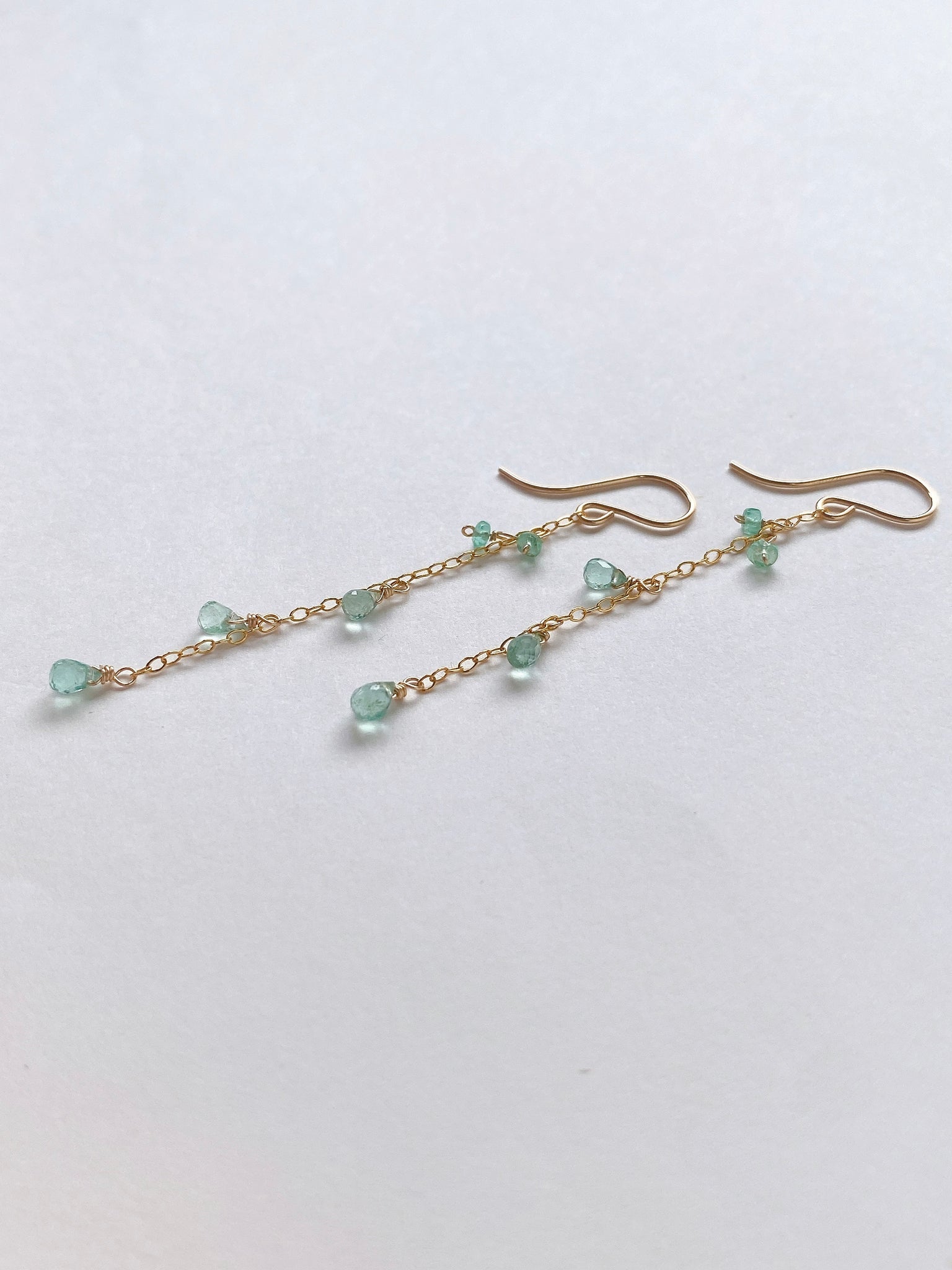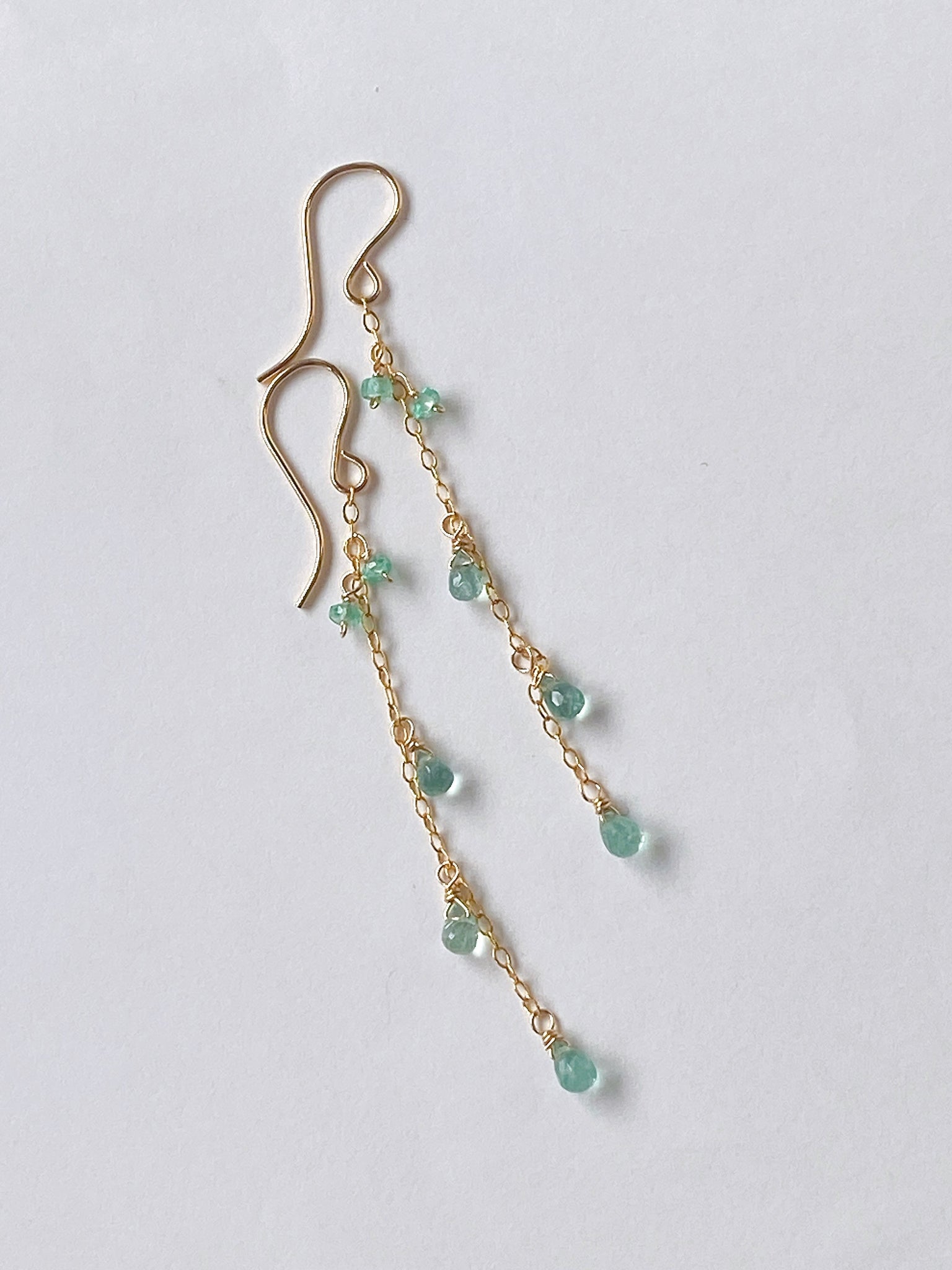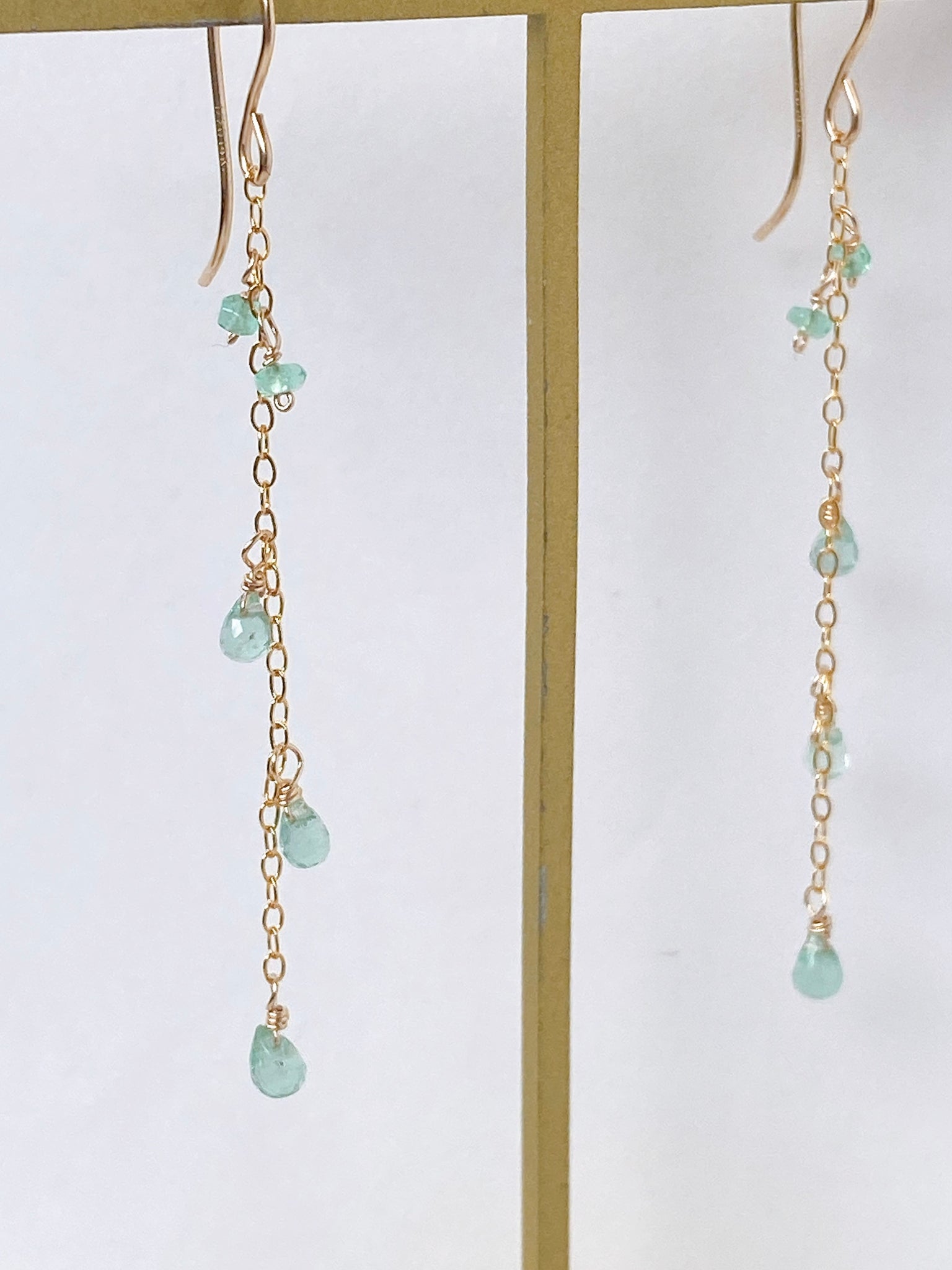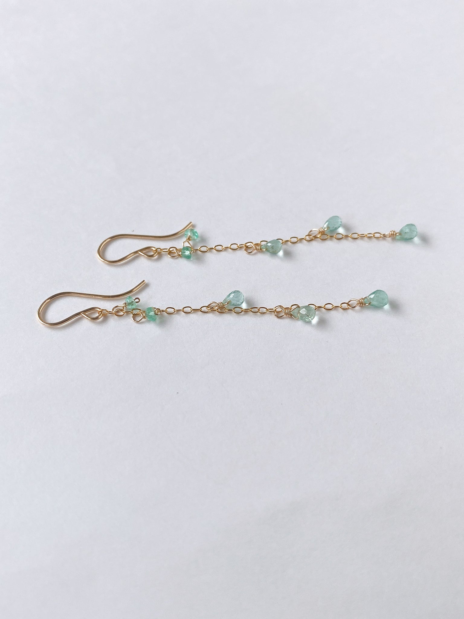 コロンビア産のエメラルドを14kgf製の華奢なチェーンに留めたシンプルなデザインです。