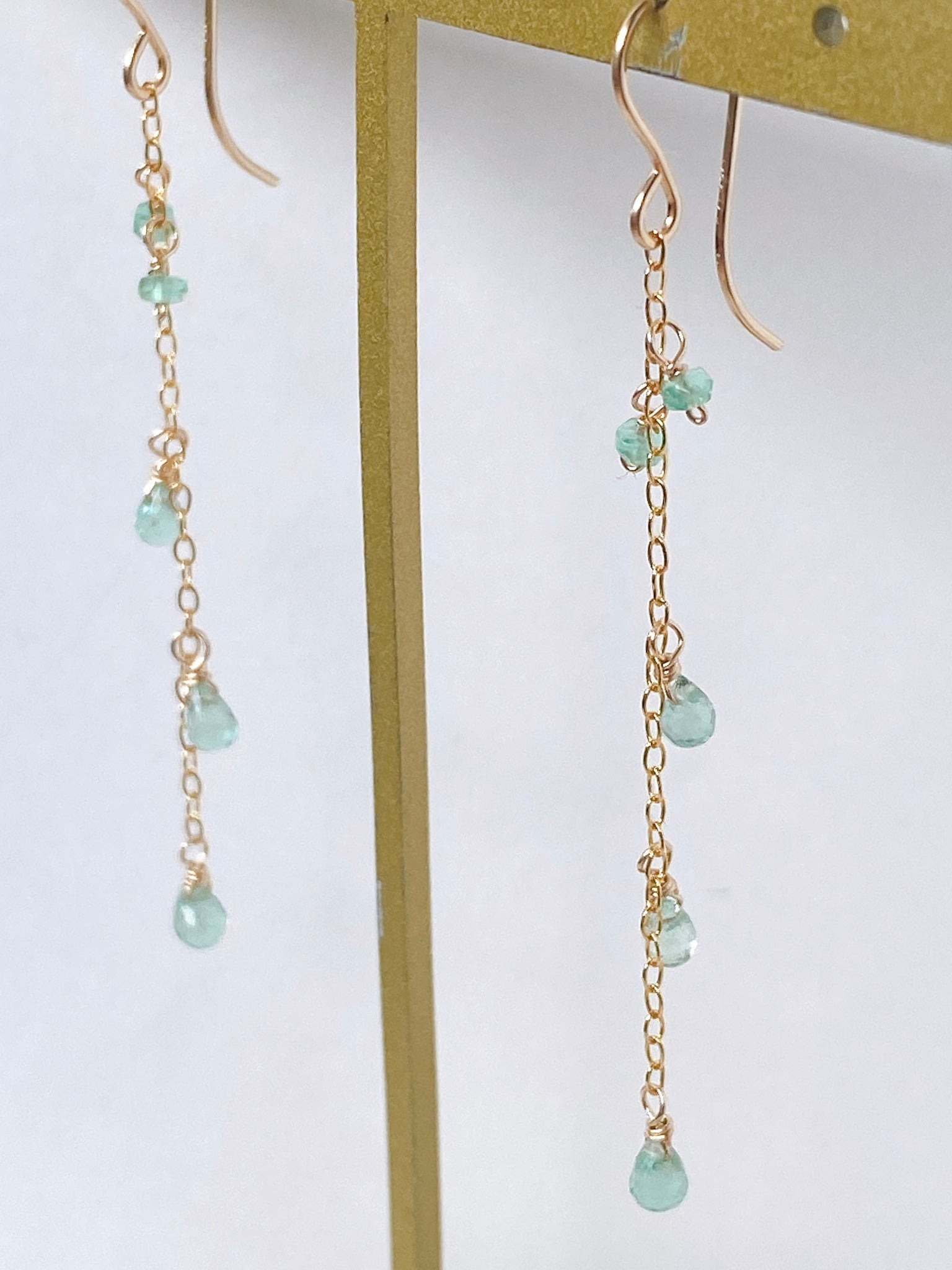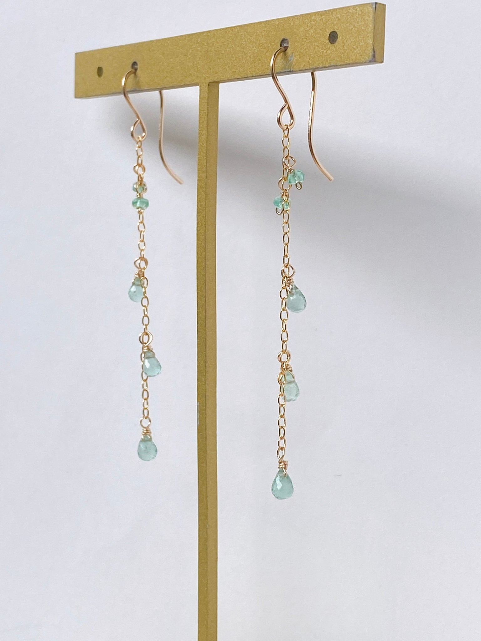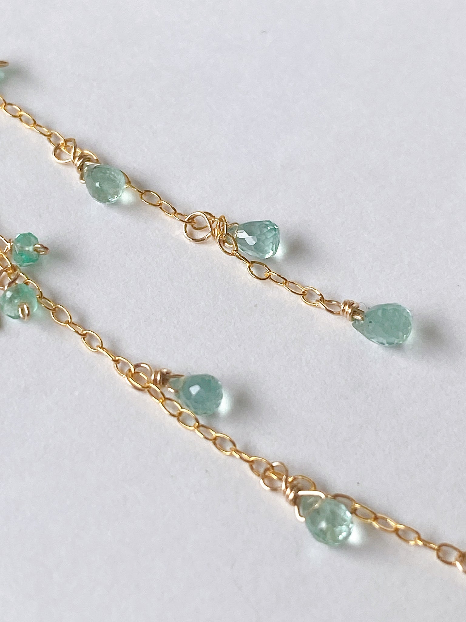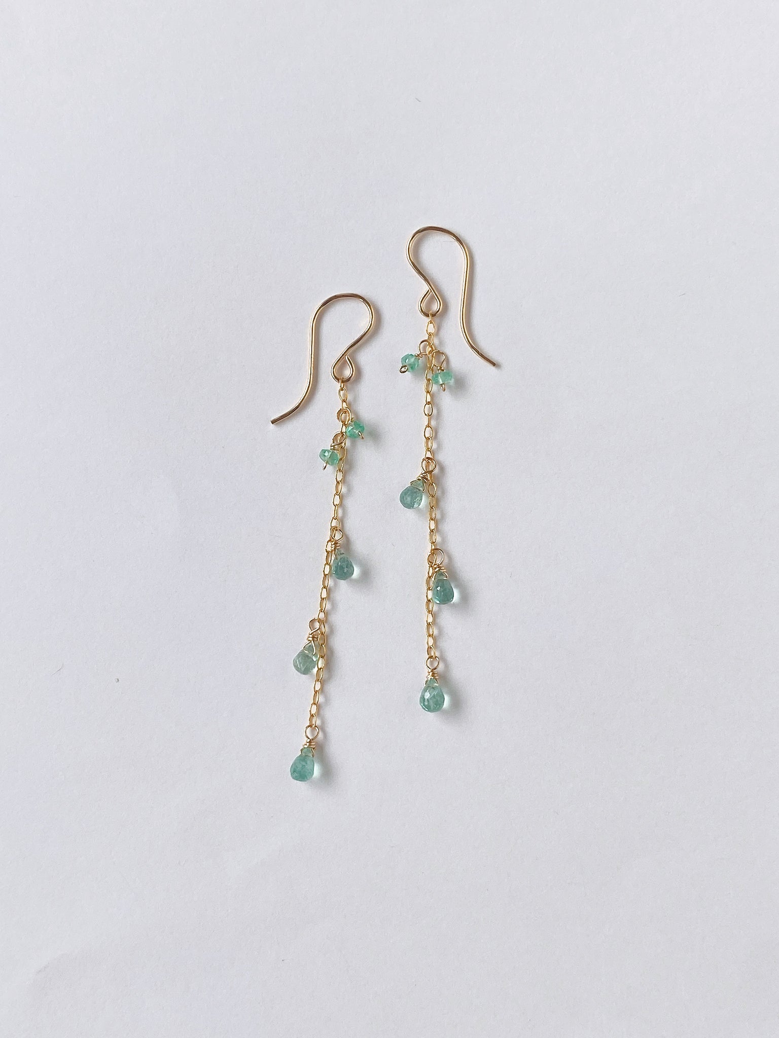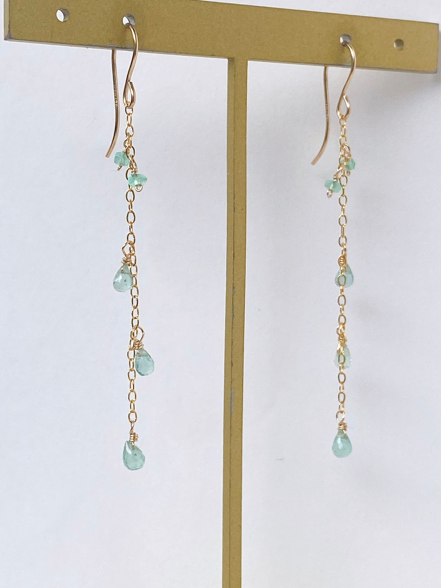 コロンビア産のエメラルドを14kgf製の華奢なチェーンに留めたシンプルなデザインです。