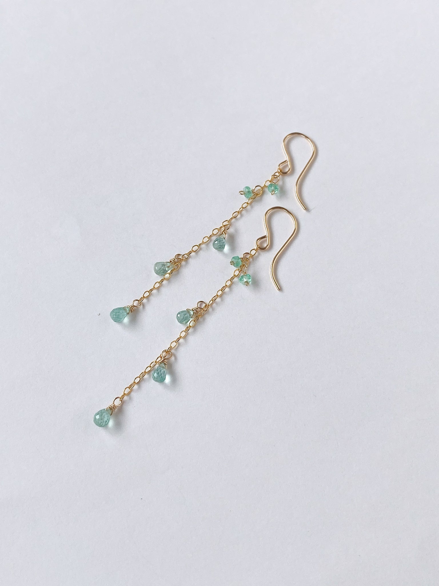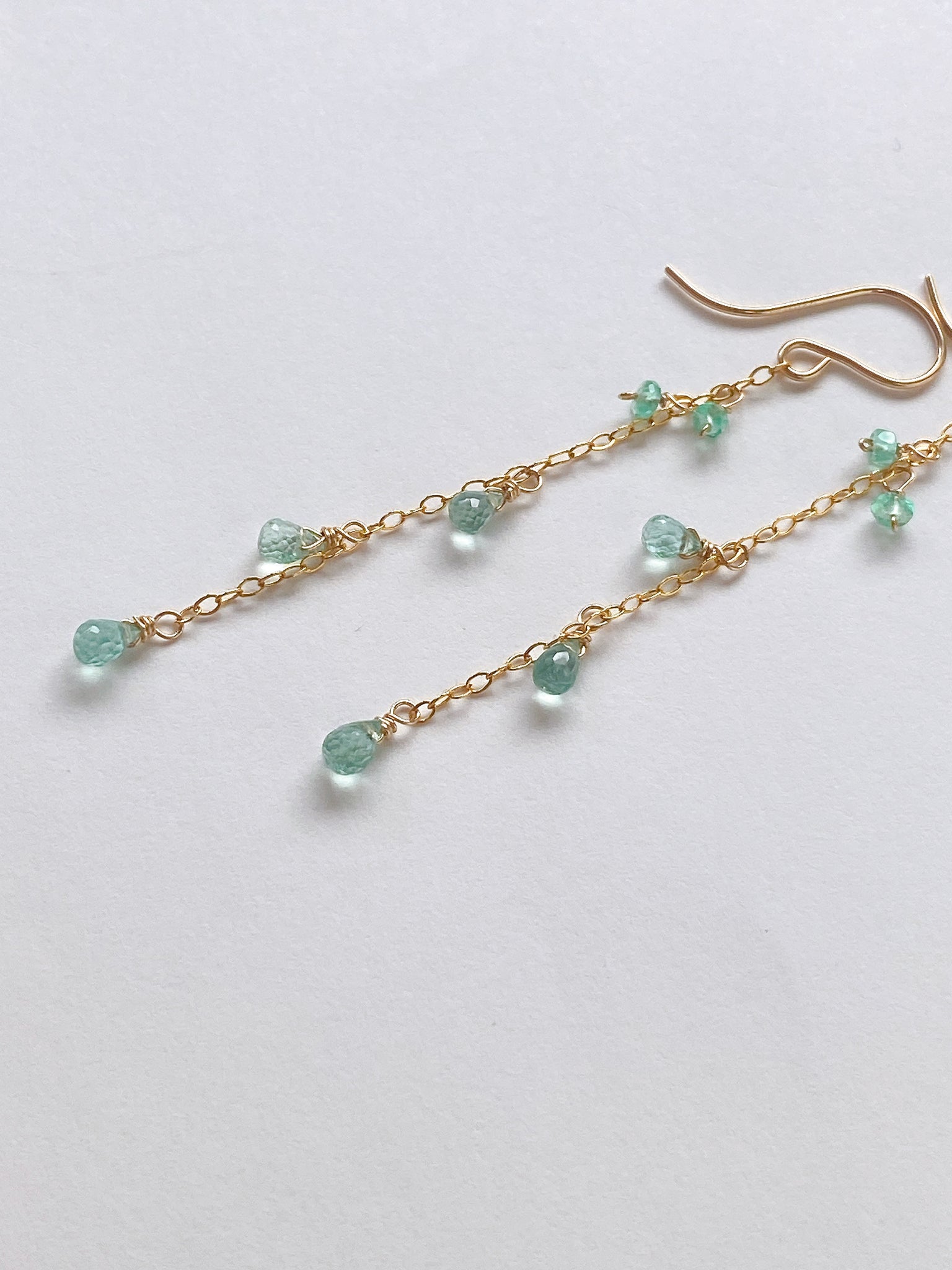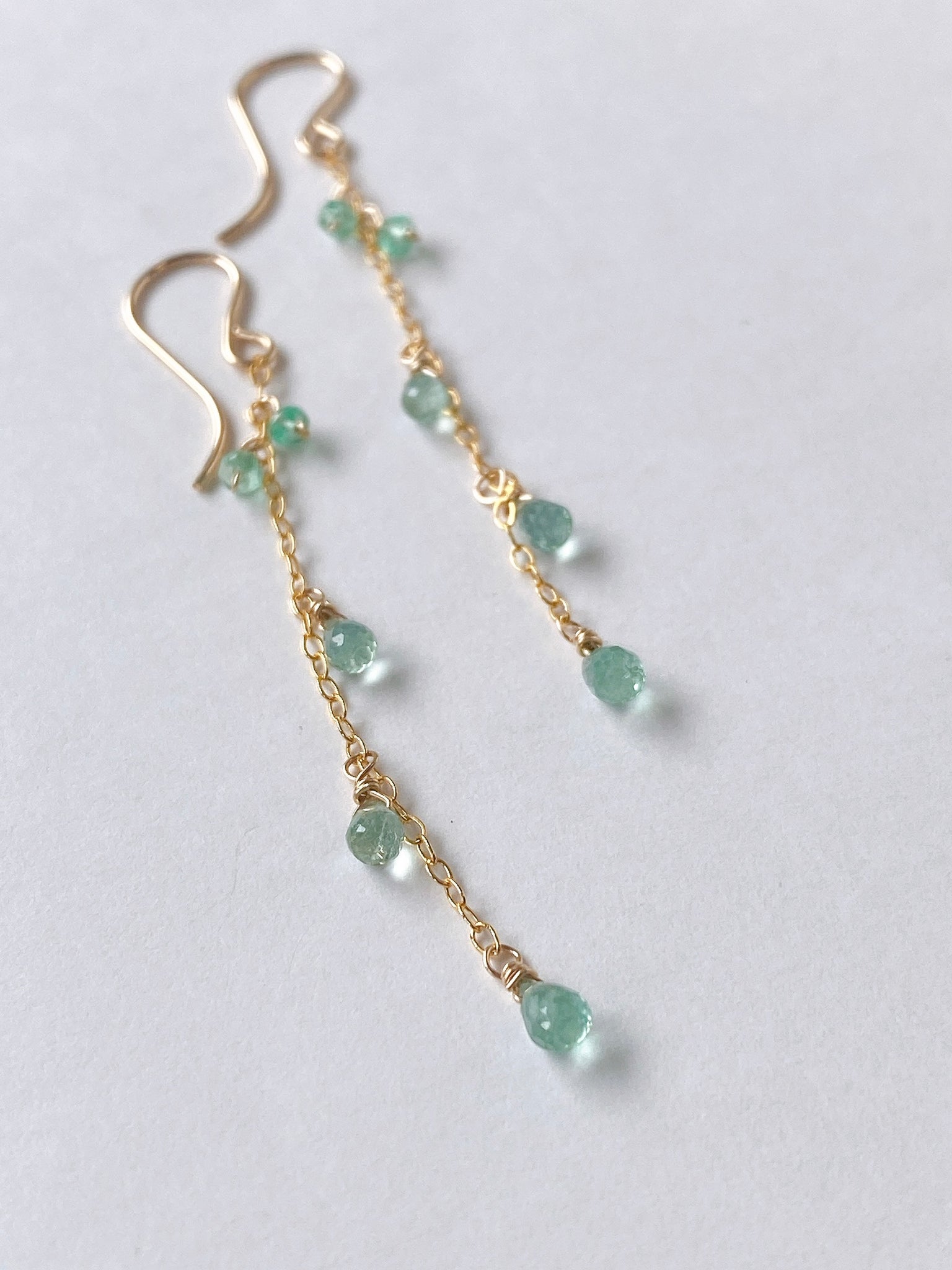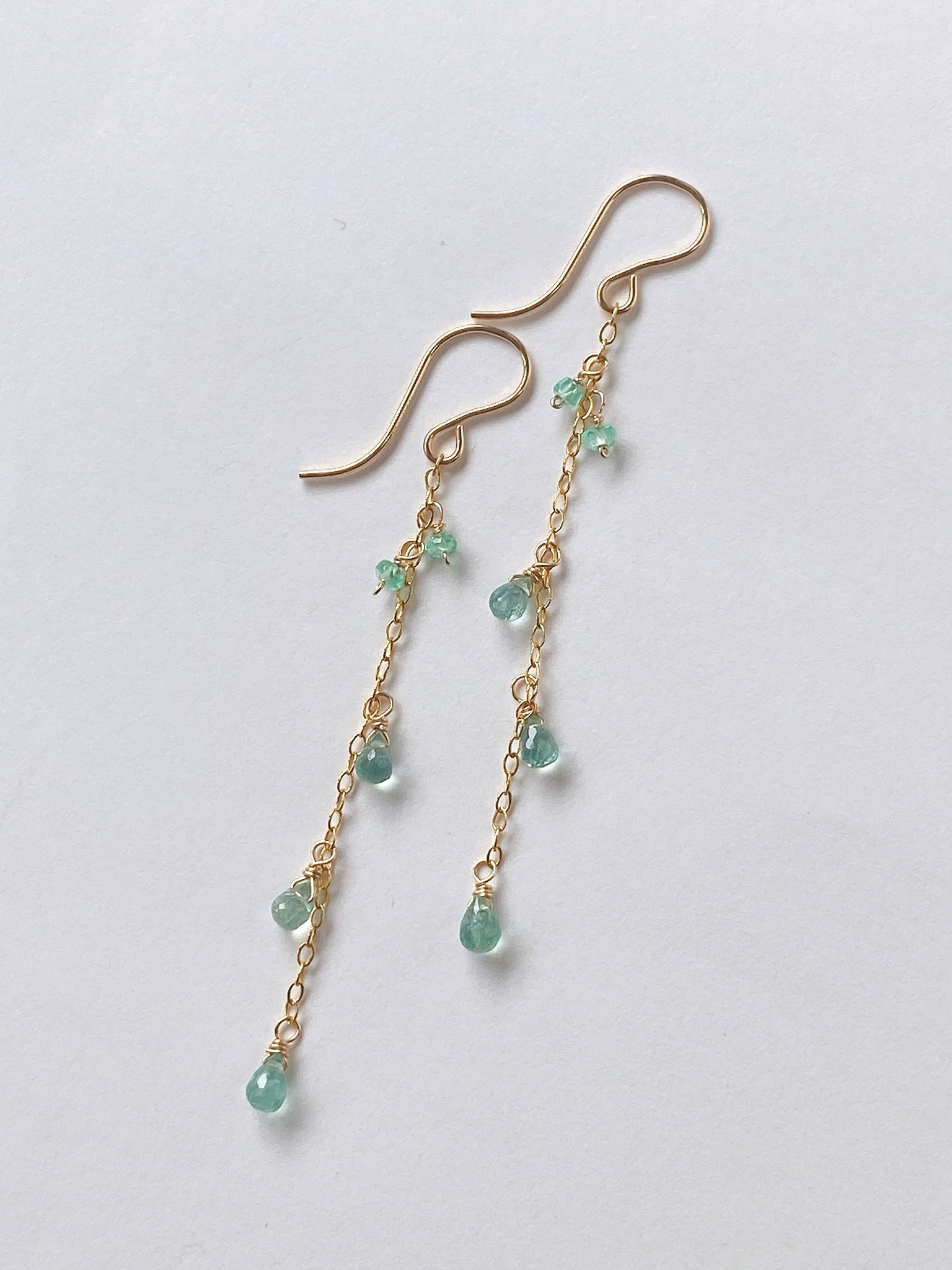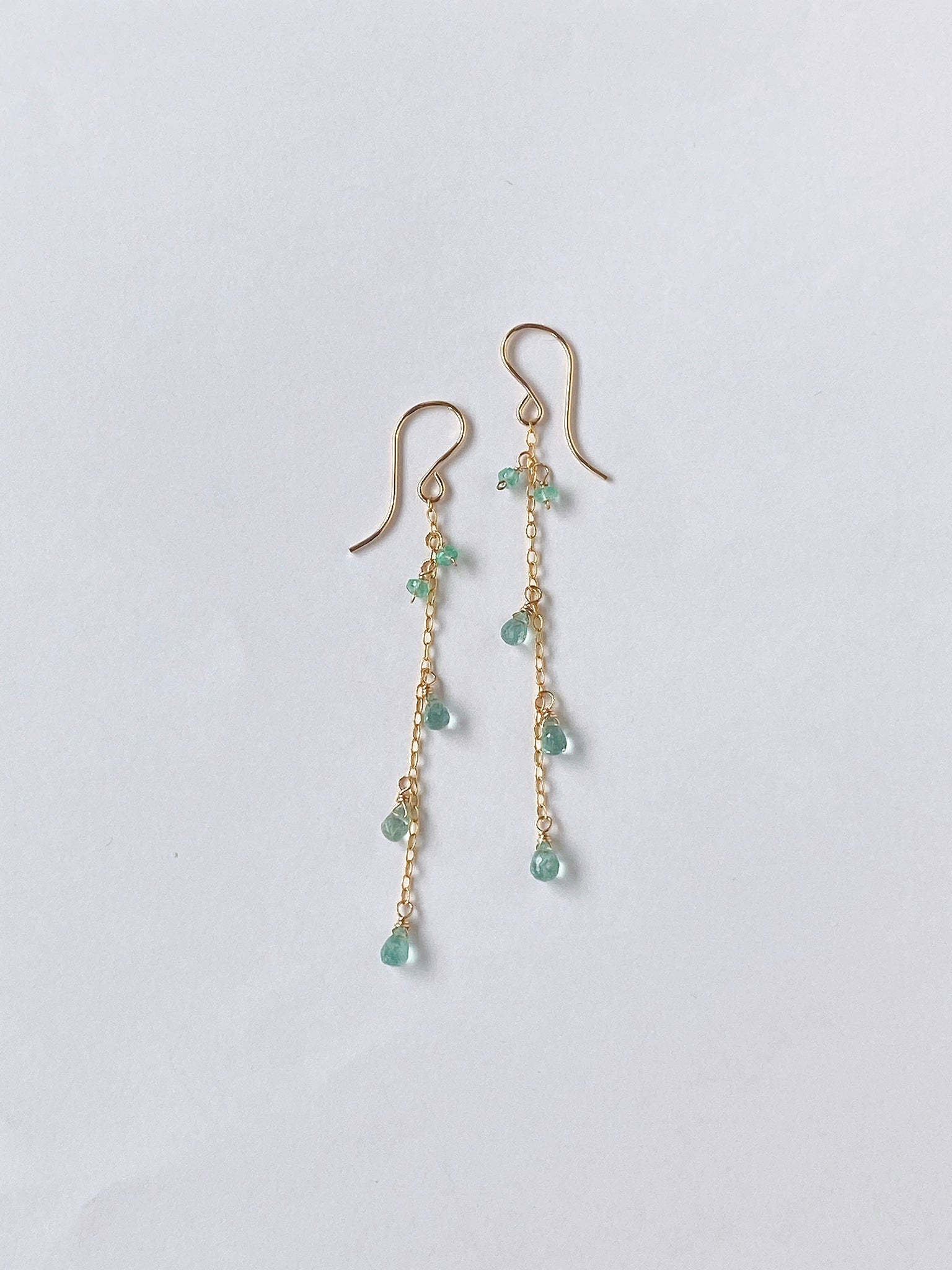 コロンビア産のエメラルドを14kgf製の華奢なチェーンに留めたシンプルなデザインです。