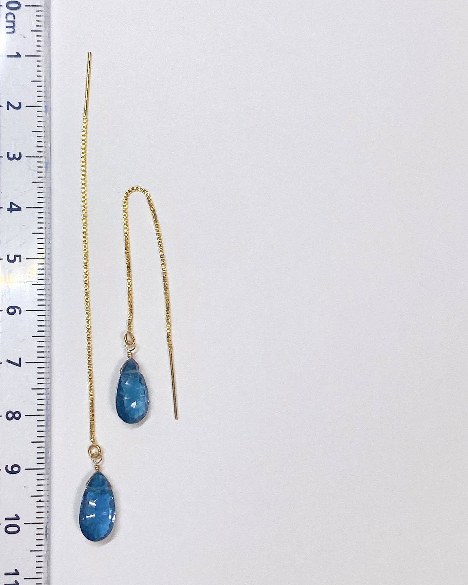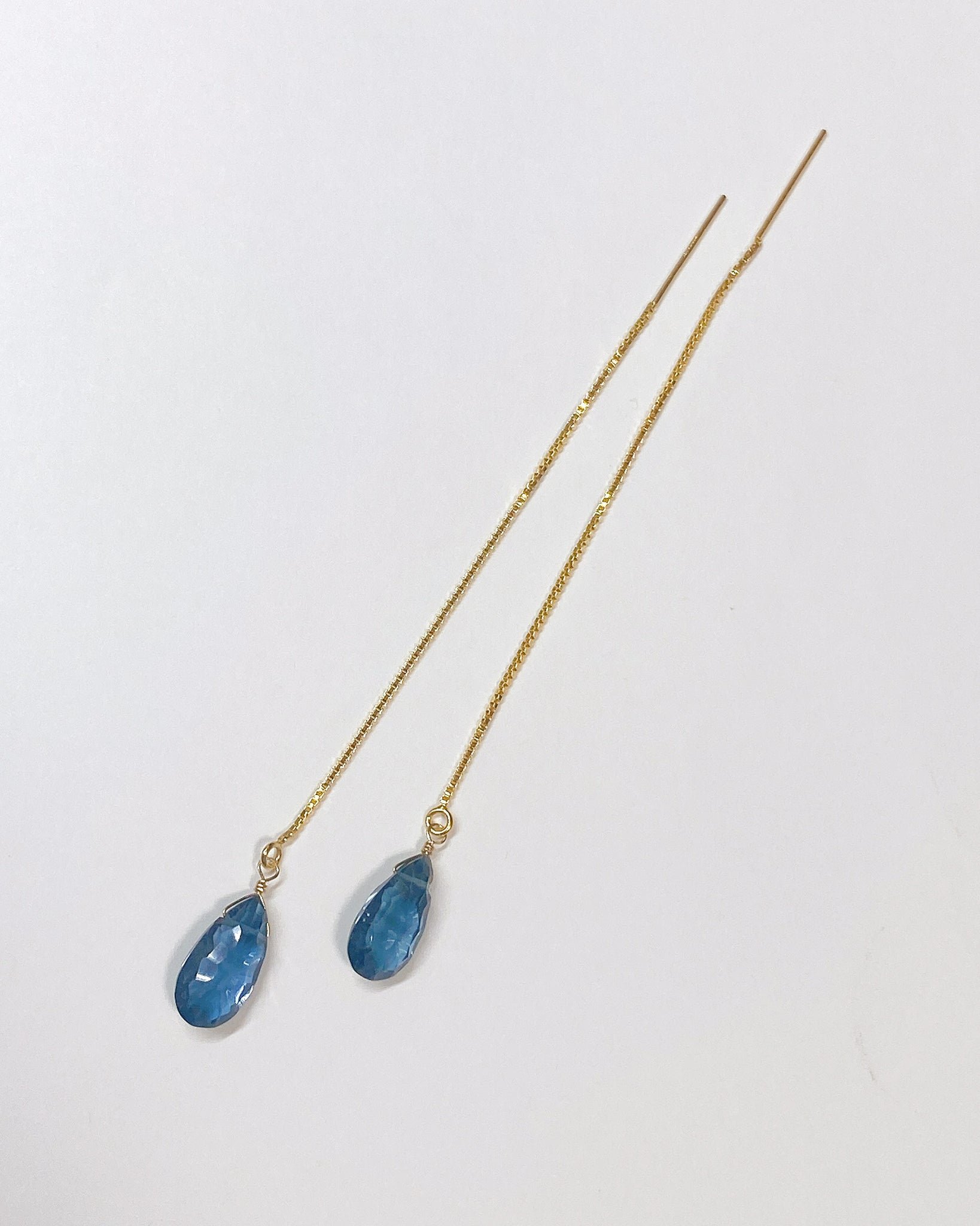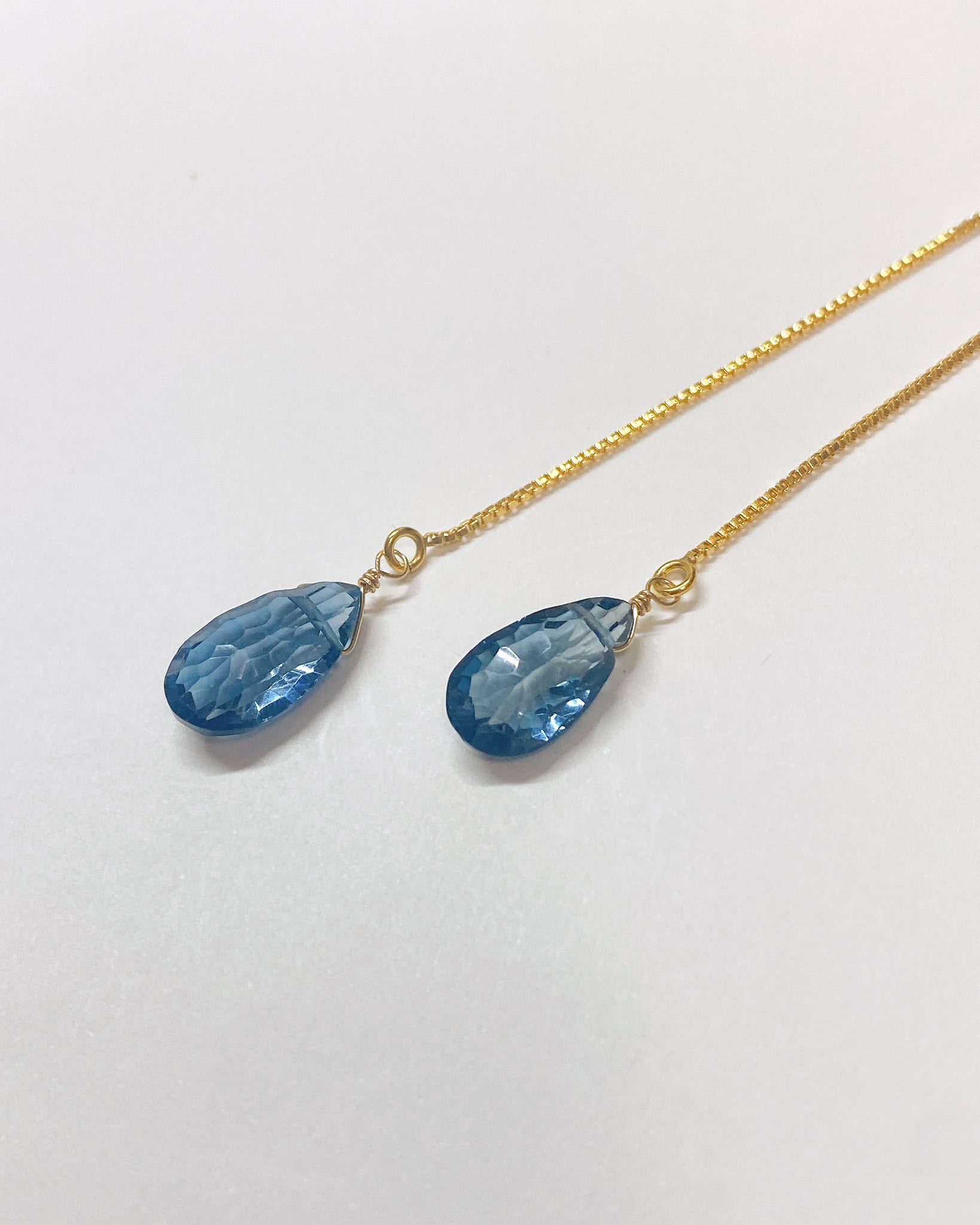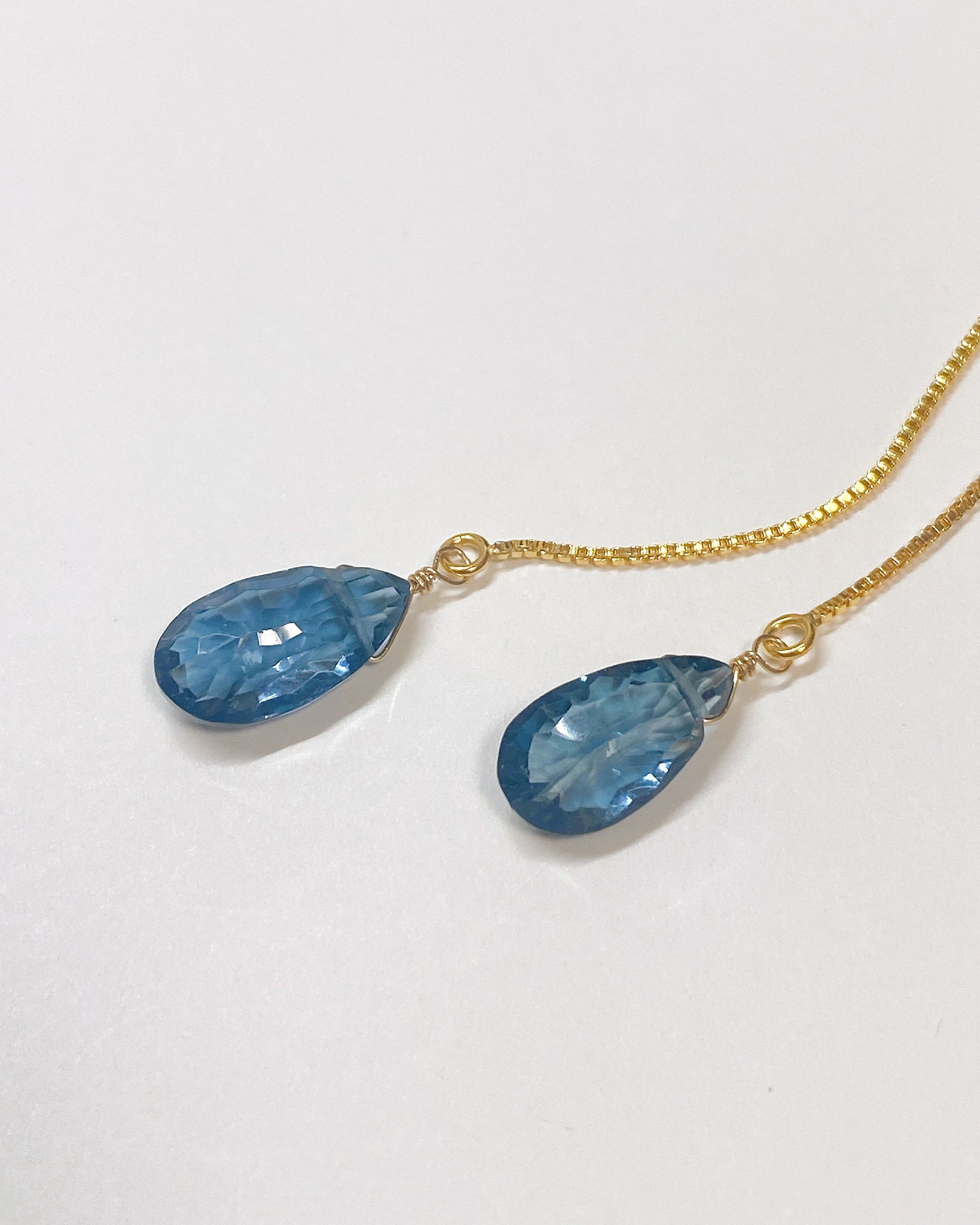 コンケーブペアシェイプカットのロンドンブルートパーズを使ってデザインした耳飾りです。