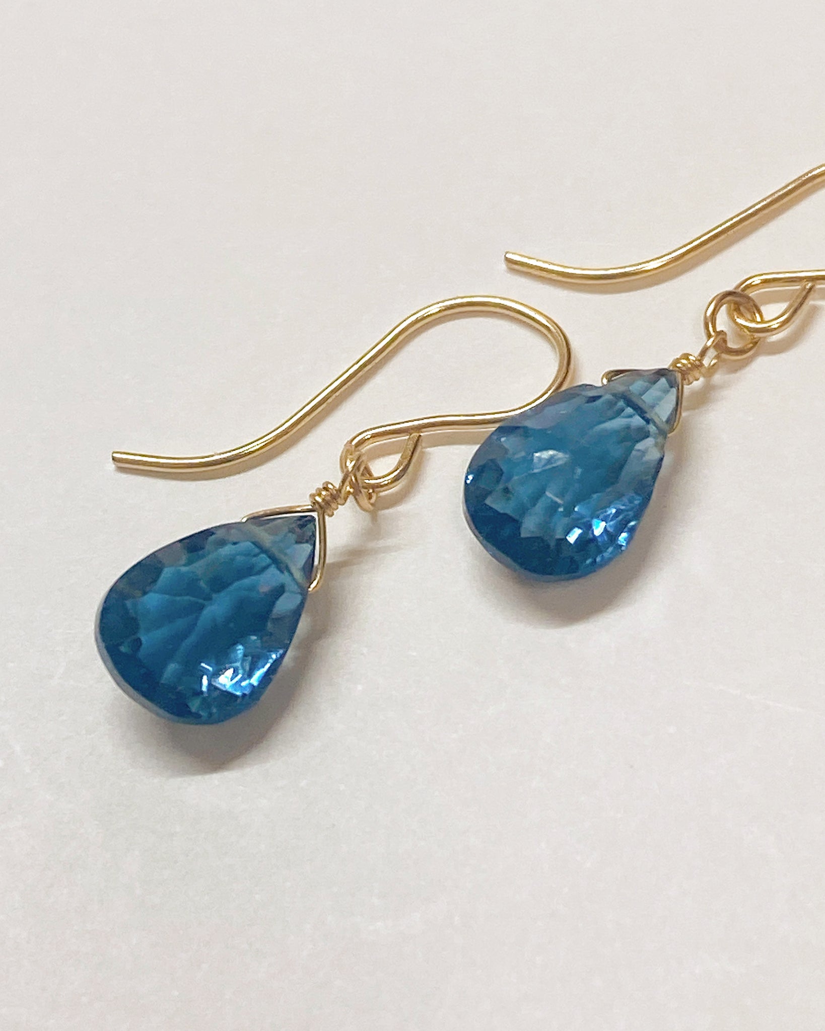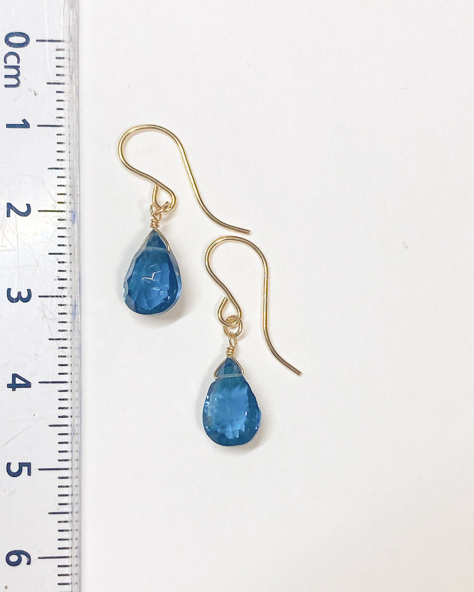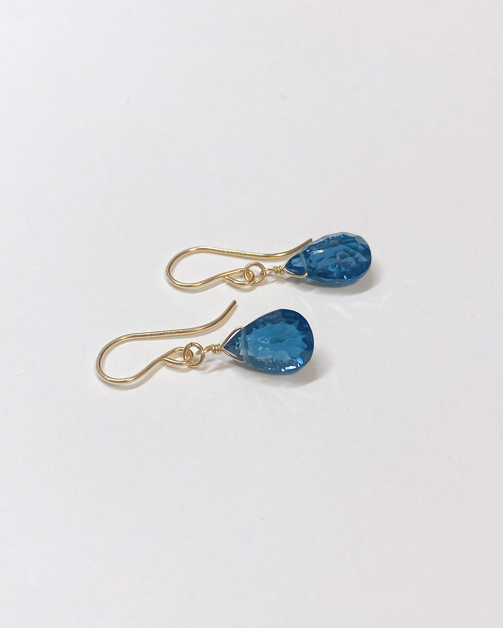 コンケーブペアシェイプカットのロンドンブルートパーズを使ってデザインした耳飾りです。