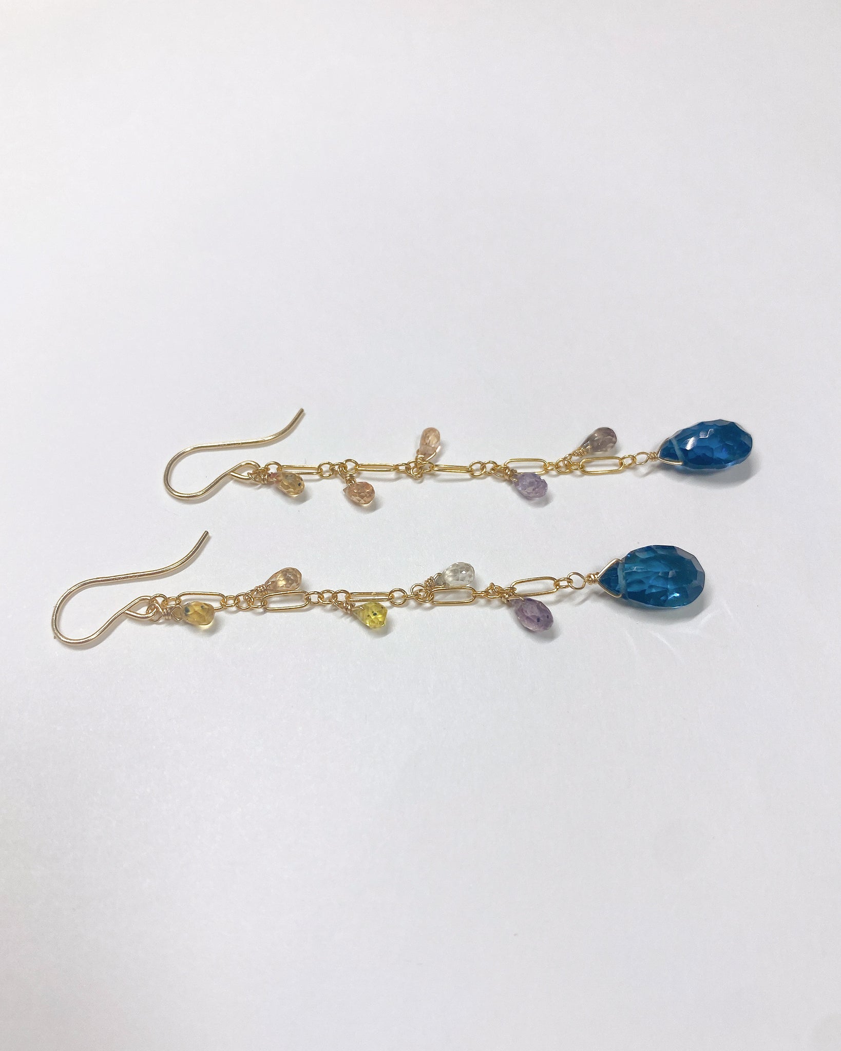 14kgf製のチェーンに小さなドロップカットのサファイアを丁寧に留めたロングタイプのピアスです。