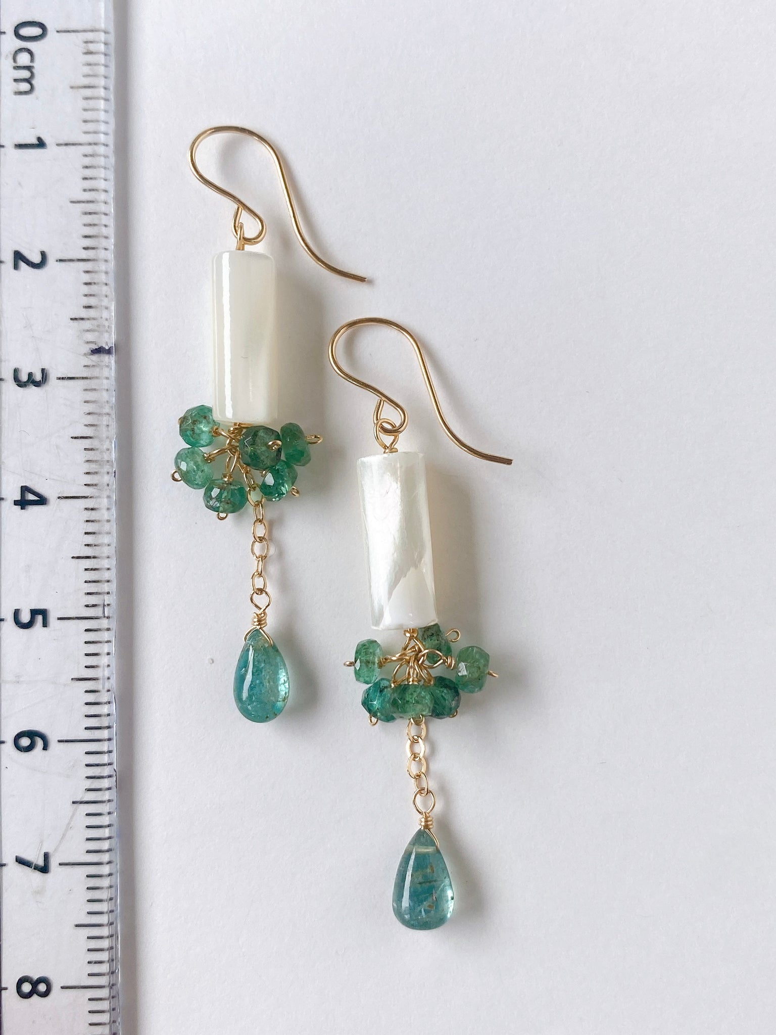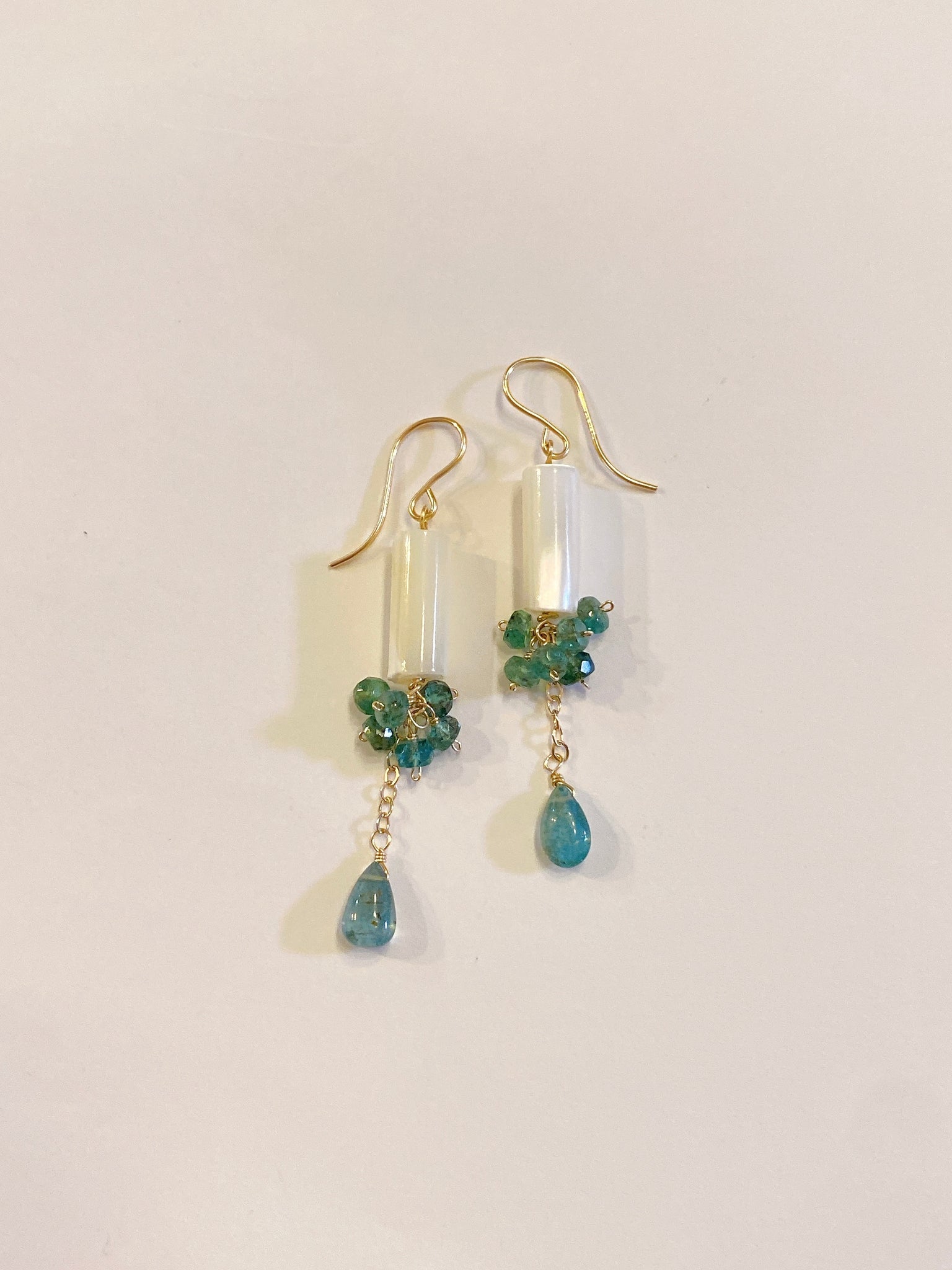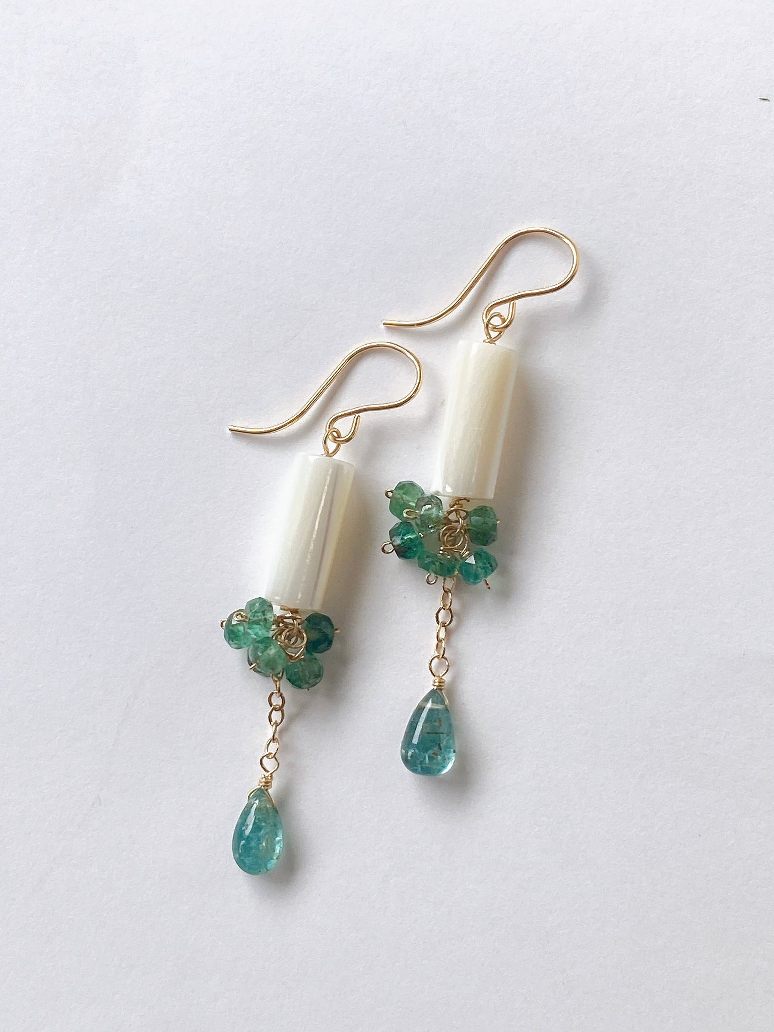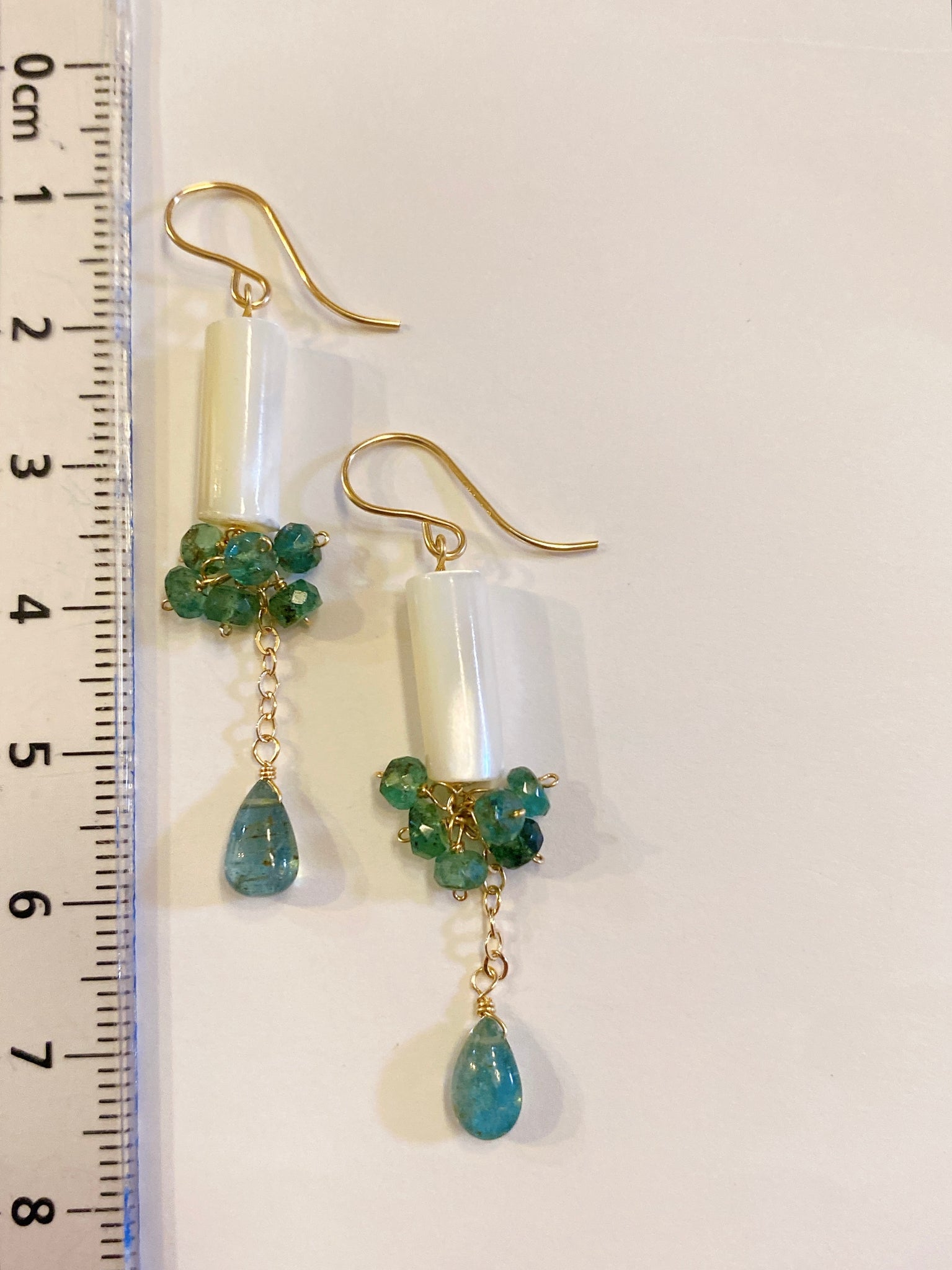 ホワイトシェルとロンデルカットのロンドンブルートパーズ、ペアシェイプカットのカイヤナイトを使ってデザインした耳飾りです。