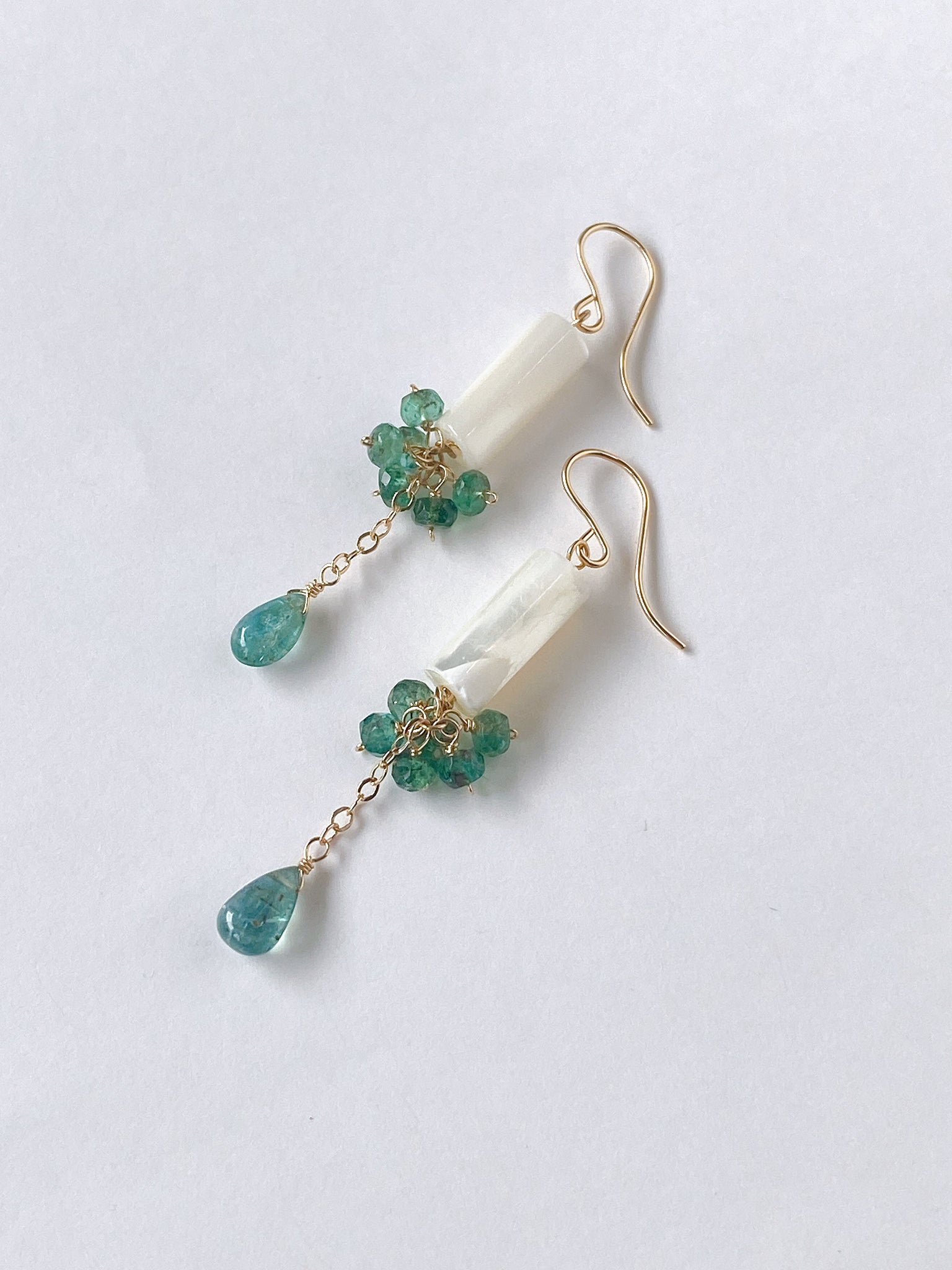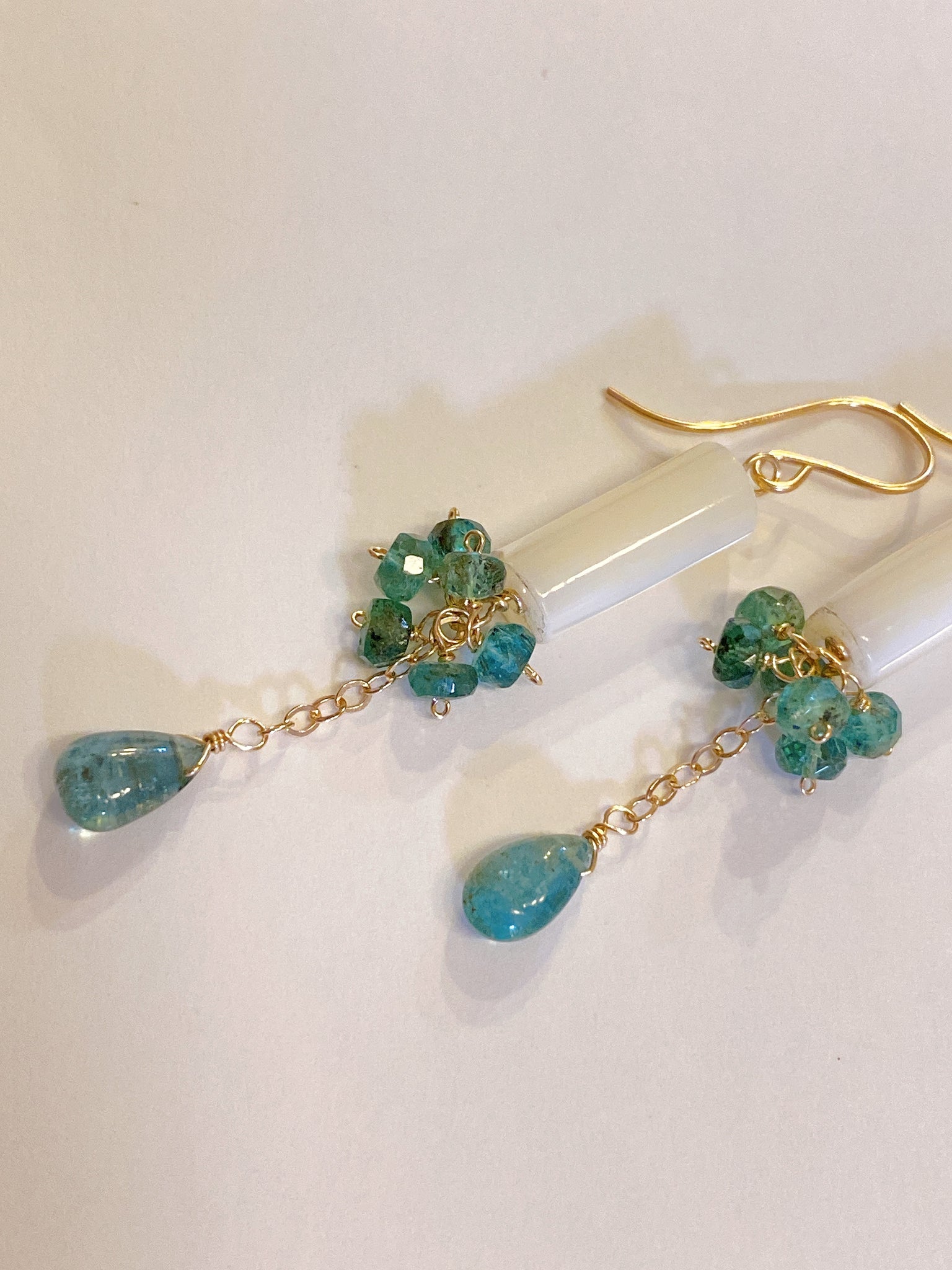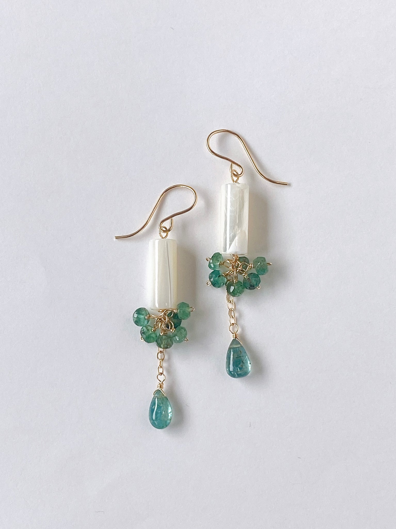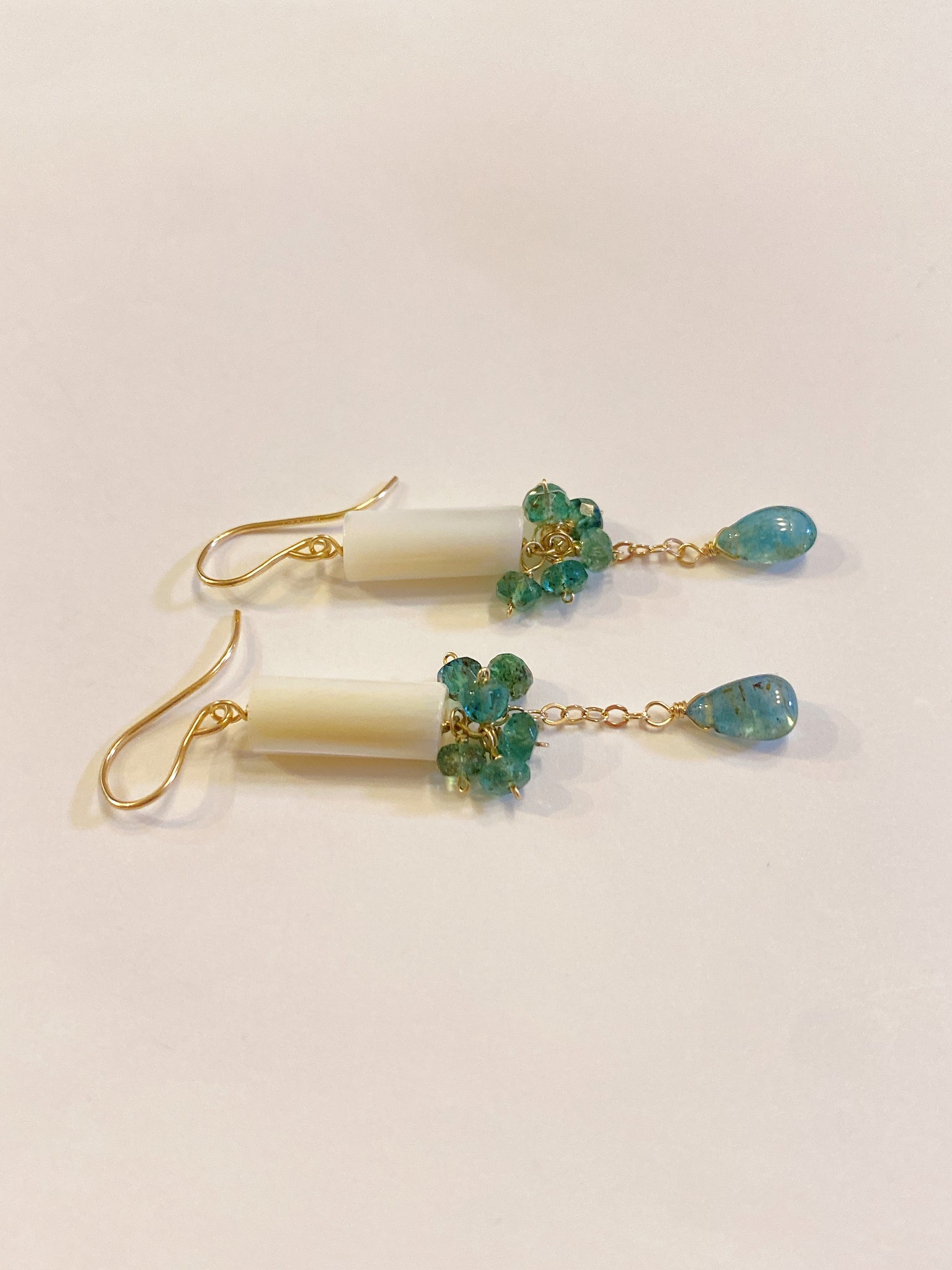 ホワイトシェルとロンデルカットのロンドンブルートパーズ、ペアシェイプカットのカイヤナイトを使ってデザインした耳飾りです。