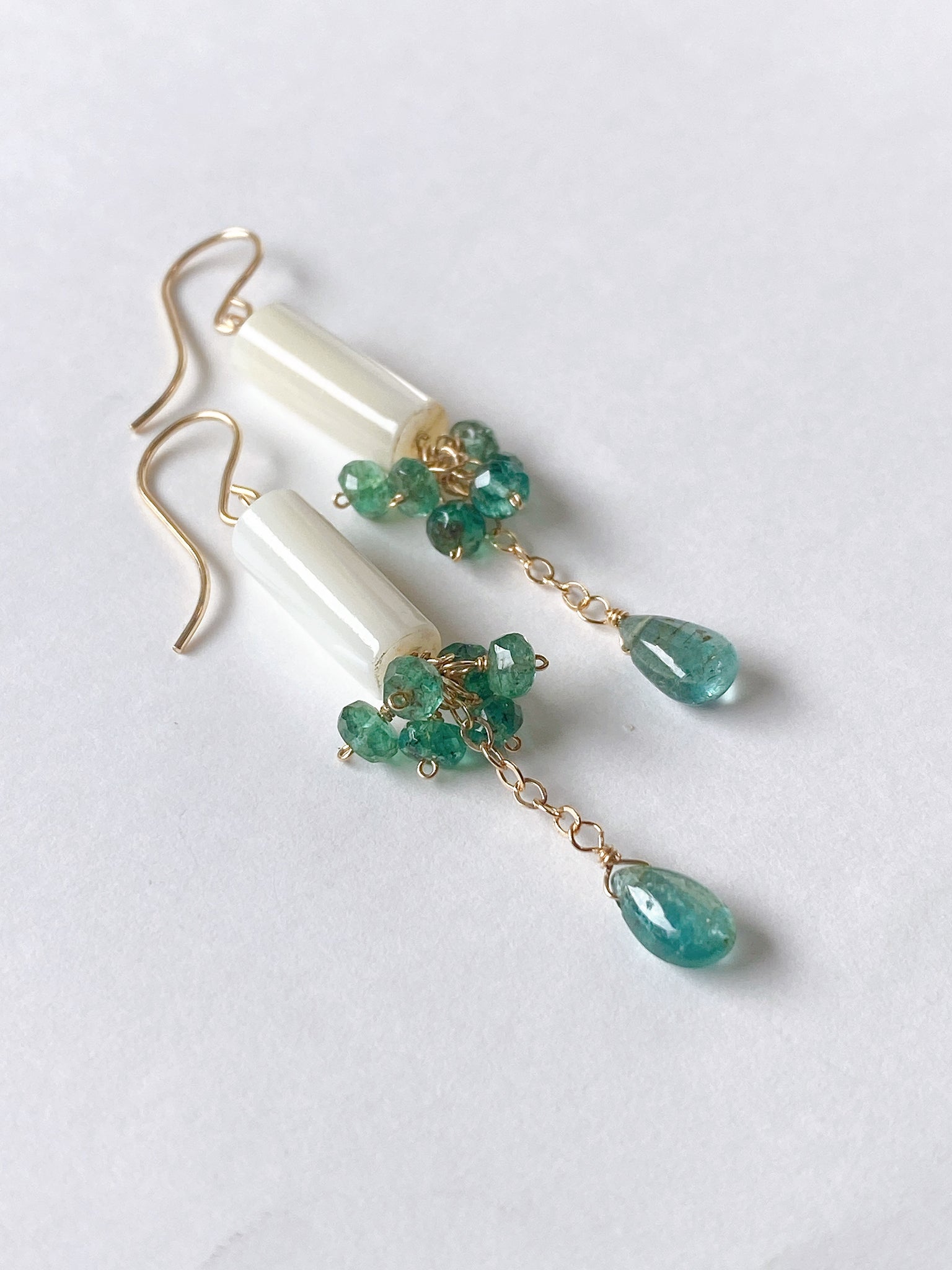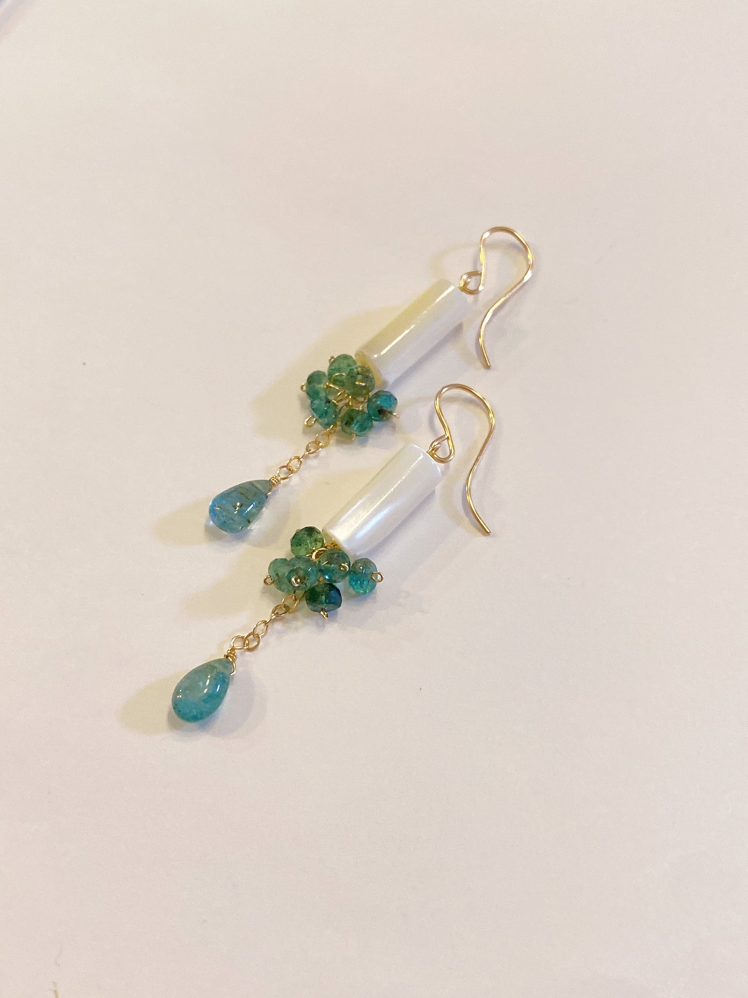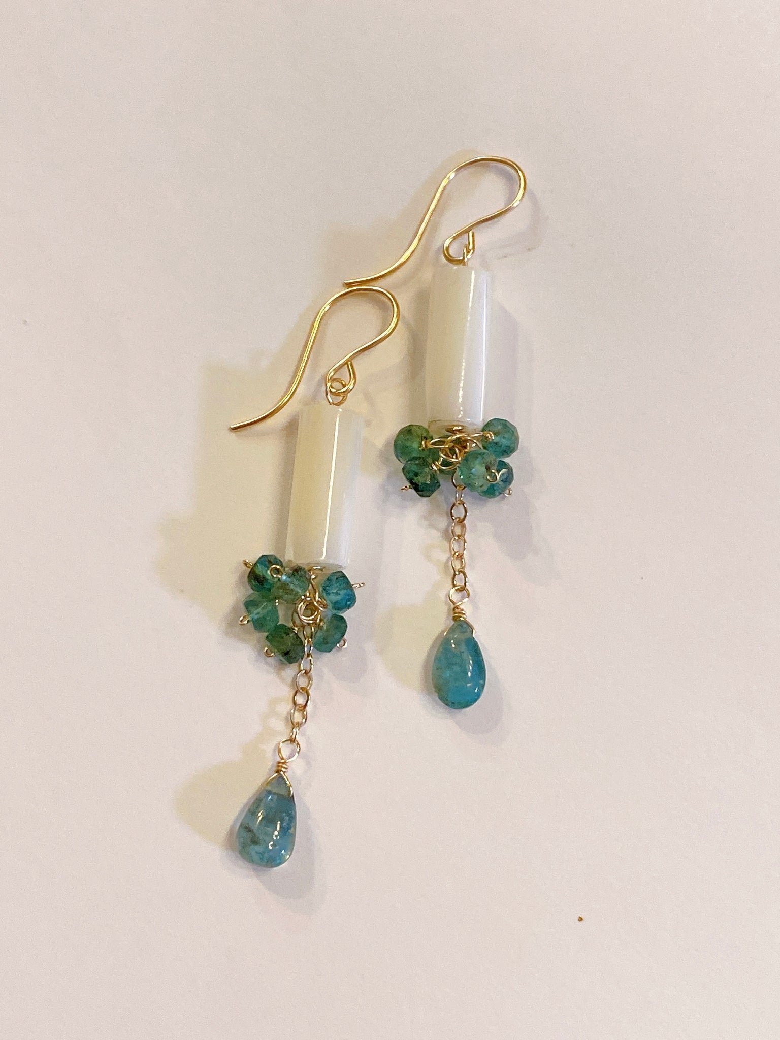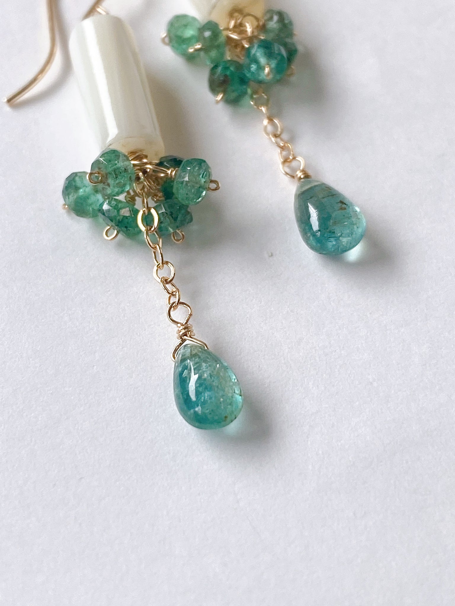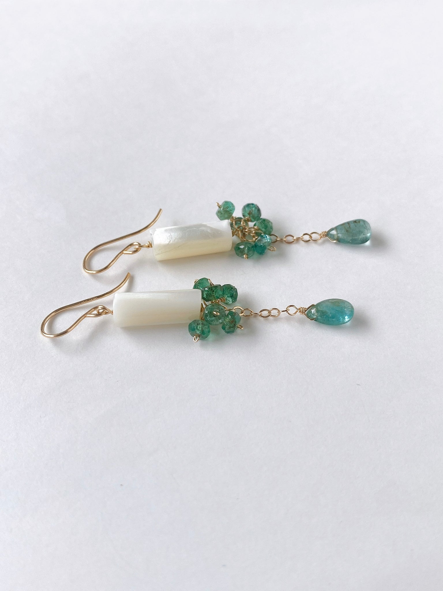ホワイトシェルとロンデルカットのロンドンブルートパーズ、ペアシェイプカットのカイヤナイトを使ってデザインした耳飾りです。