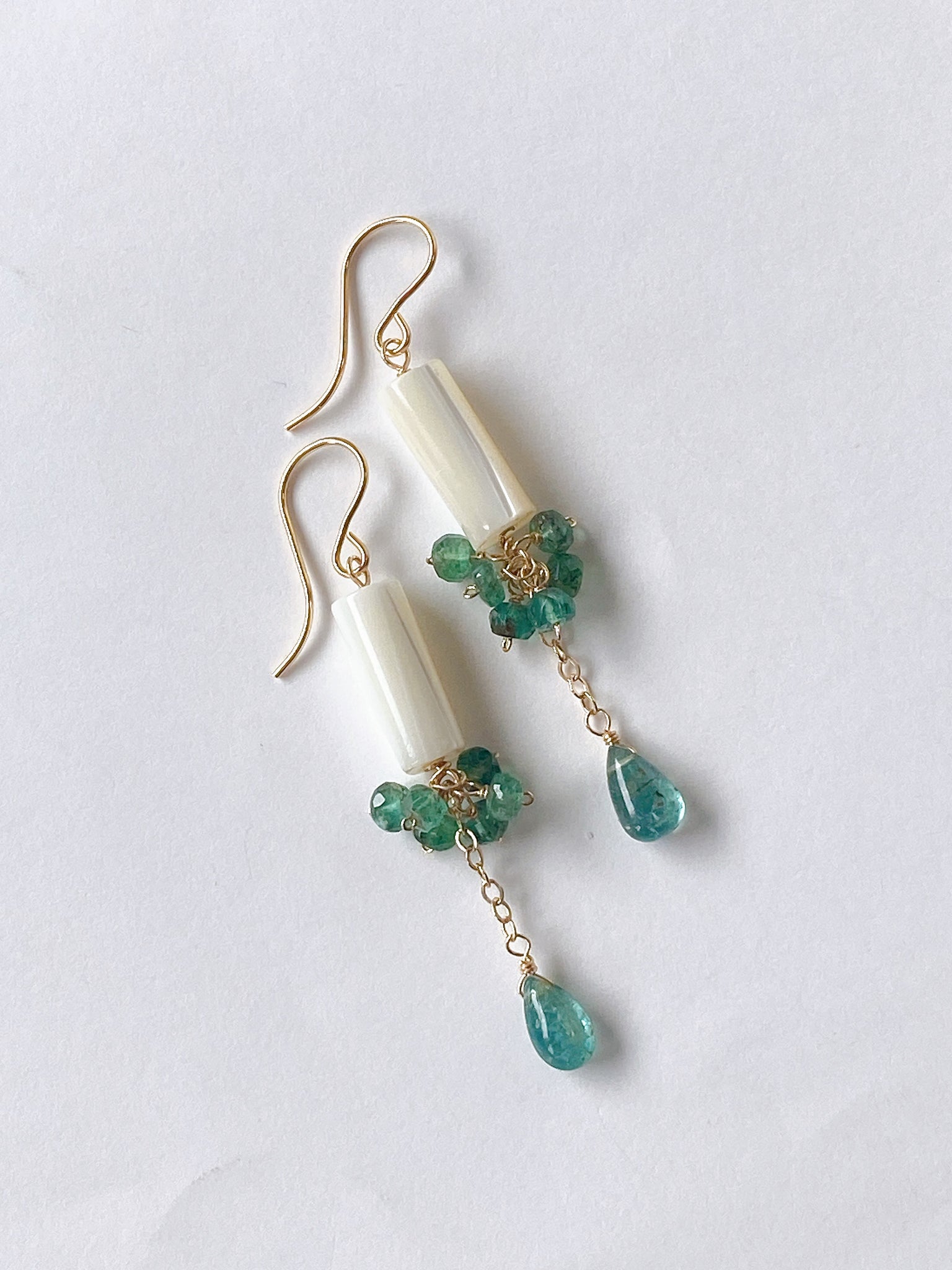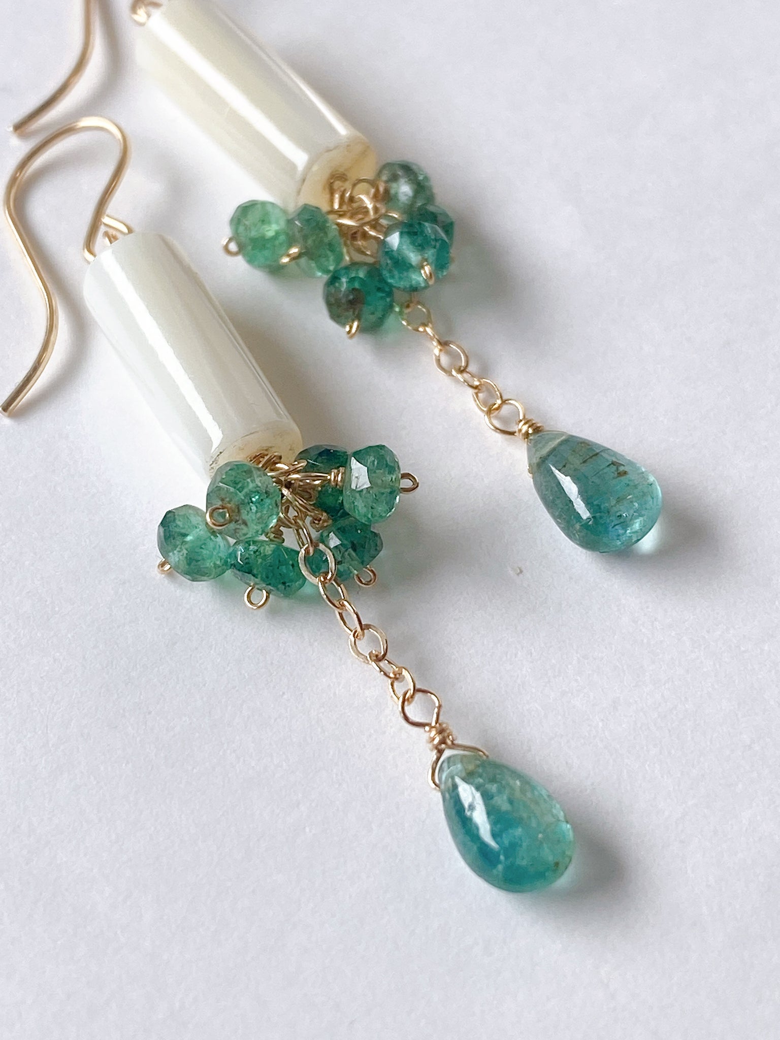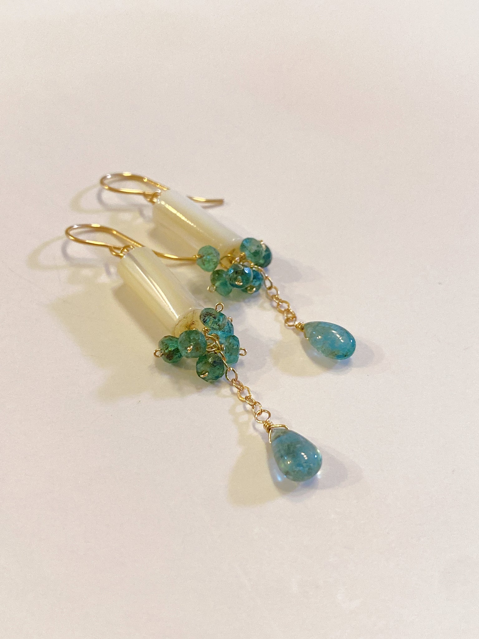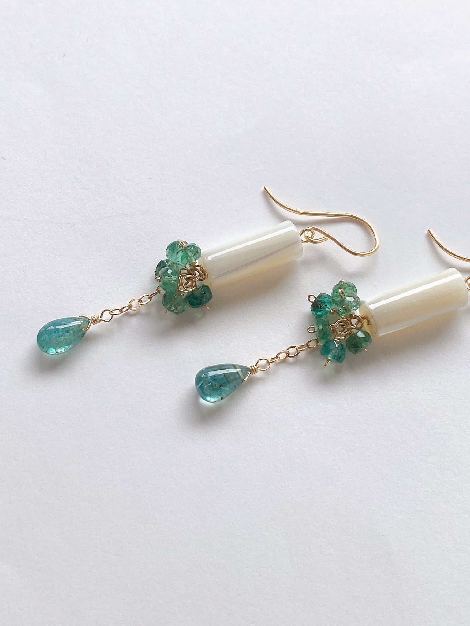 ホワイトシェルとロンデルカットのロンドンブルートパーズ、ペアシェイプカットのカイヤナイトを使ってデザインした耳飾りです。