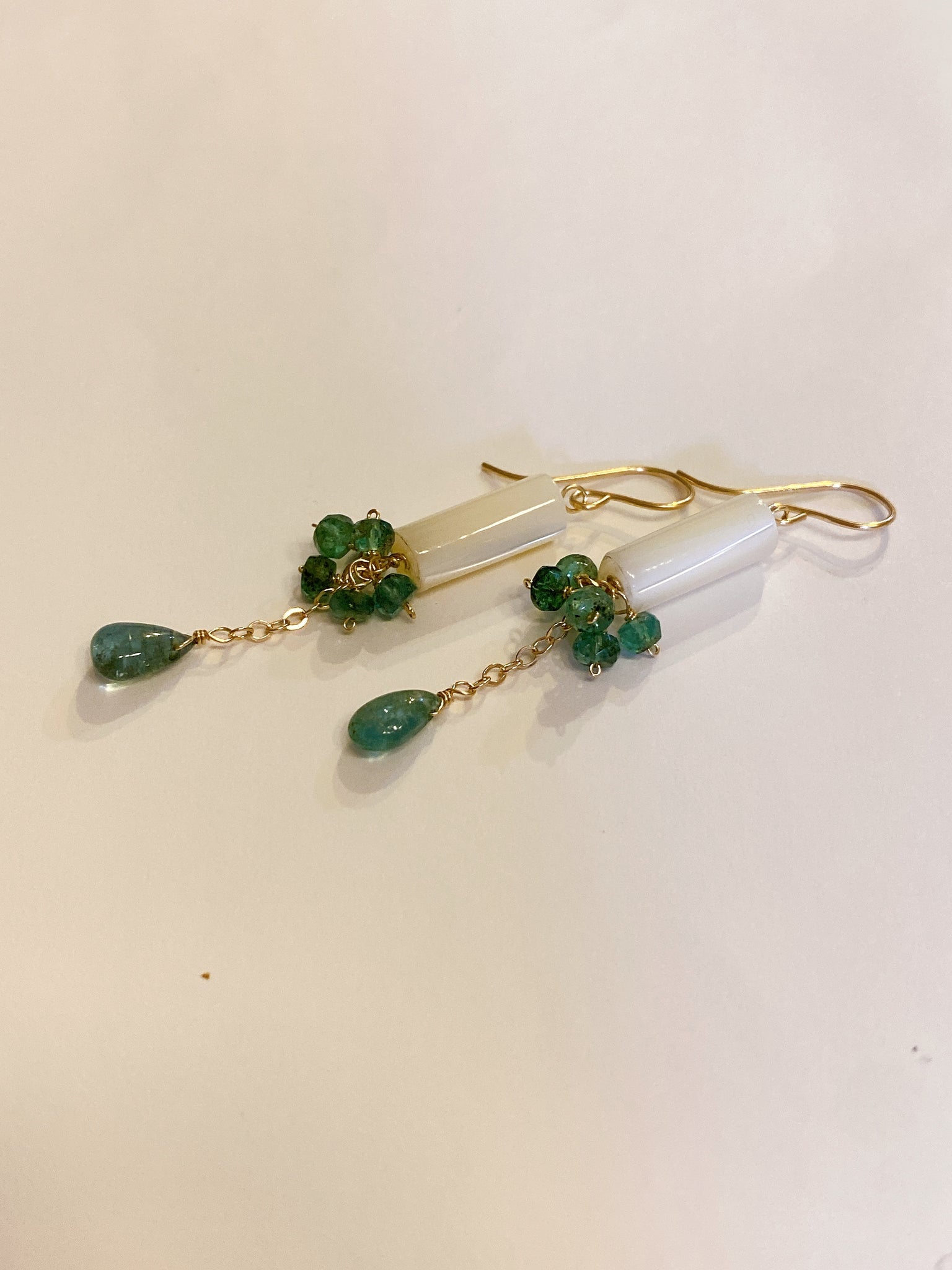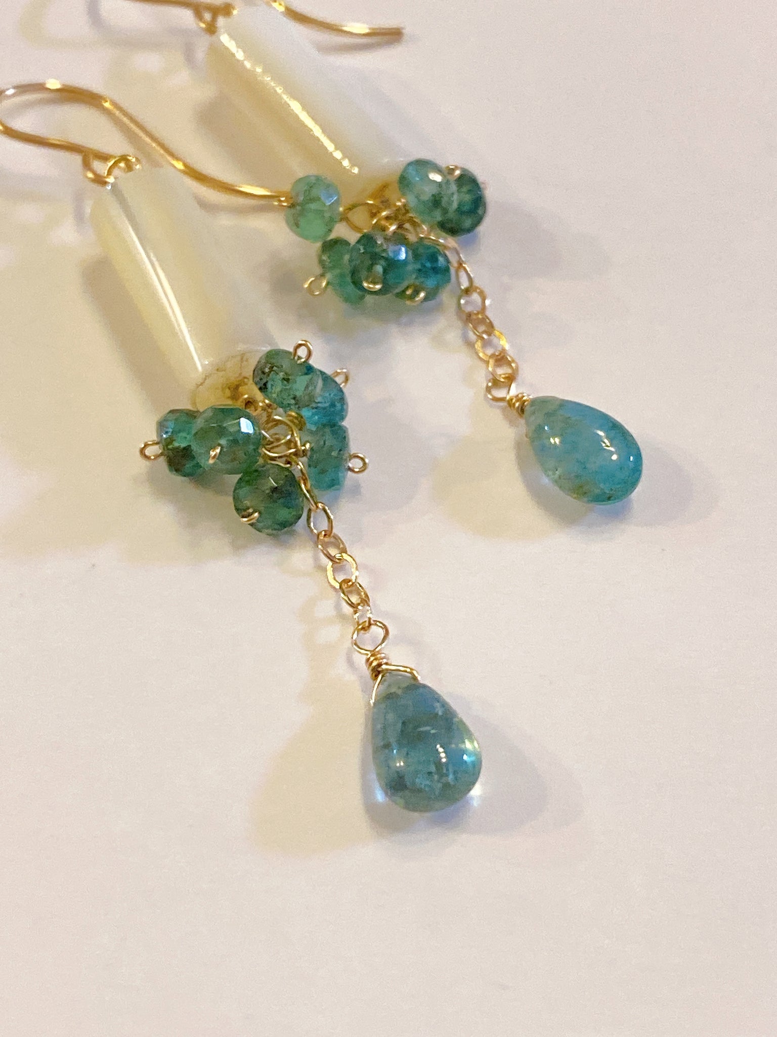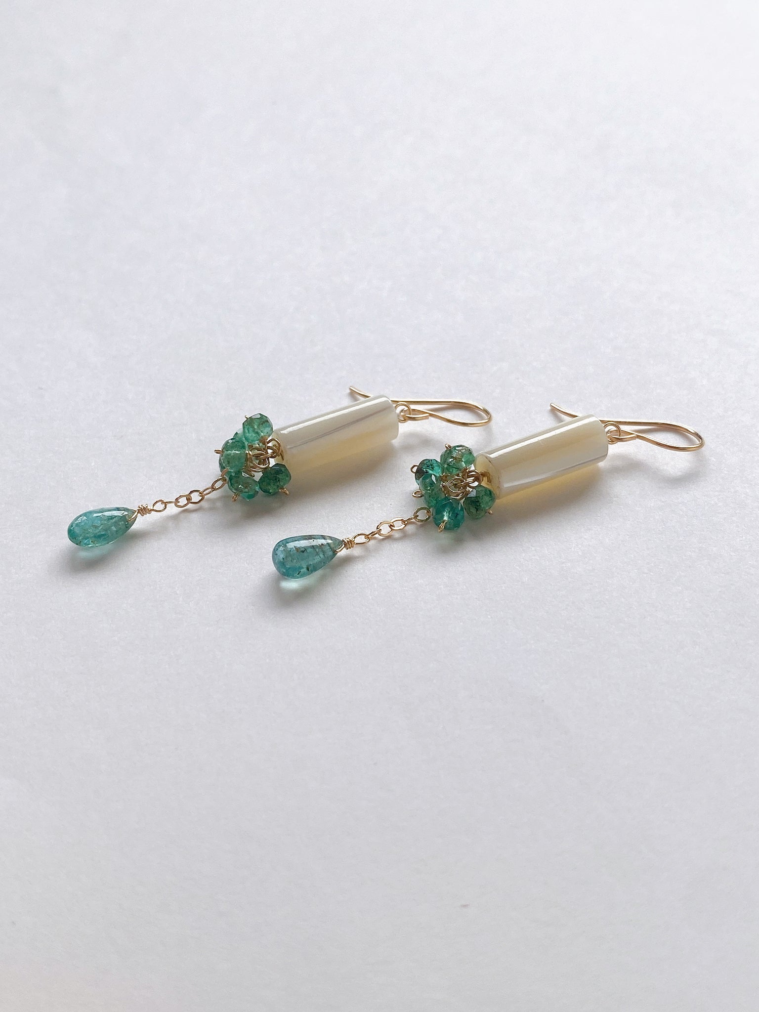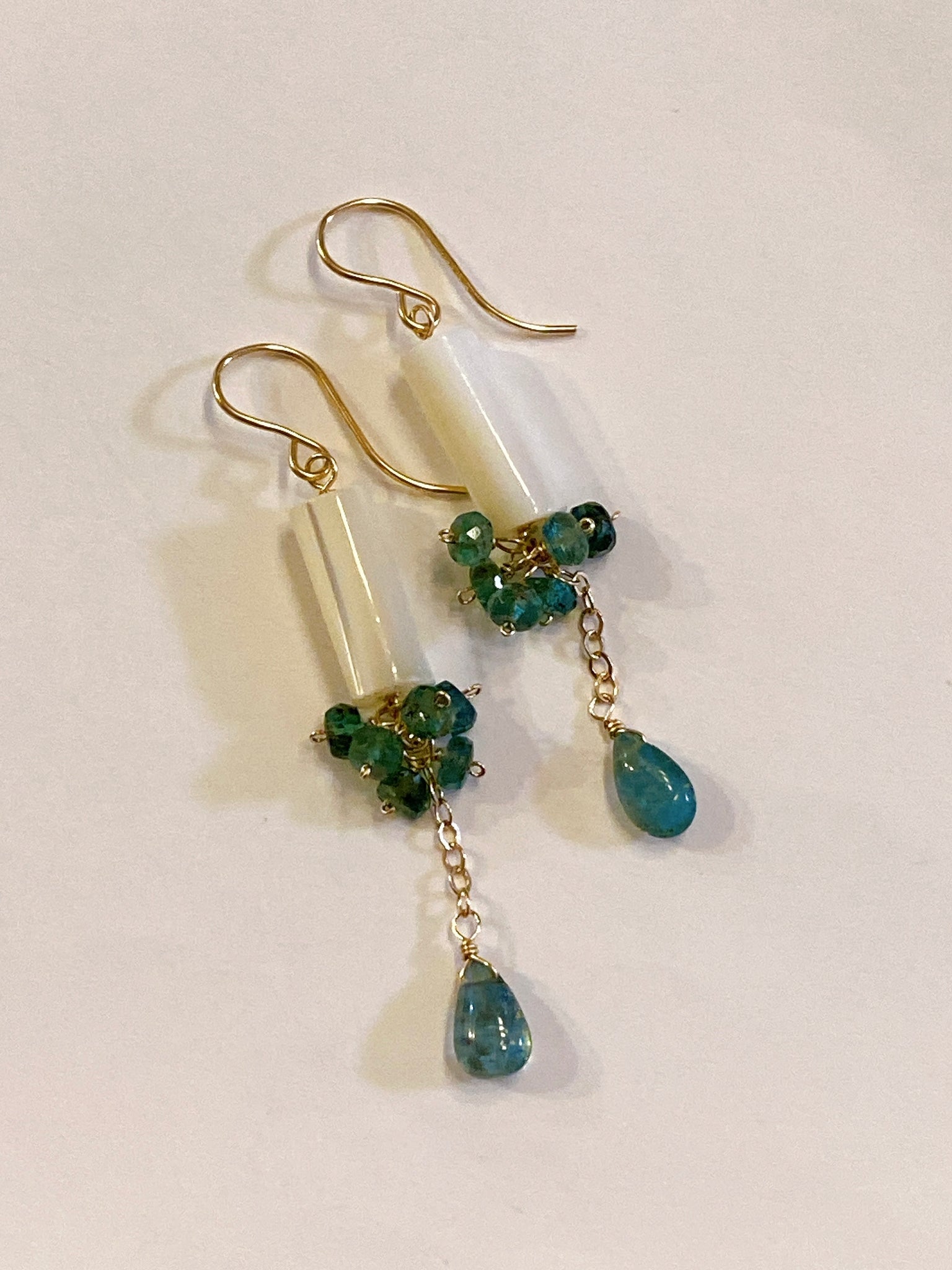 ホワイトシェルとロンデルカットのロンドンブルートパーズ、ペアシェイプカットのカイヤナイトを使ってデザインした耳飾りです。