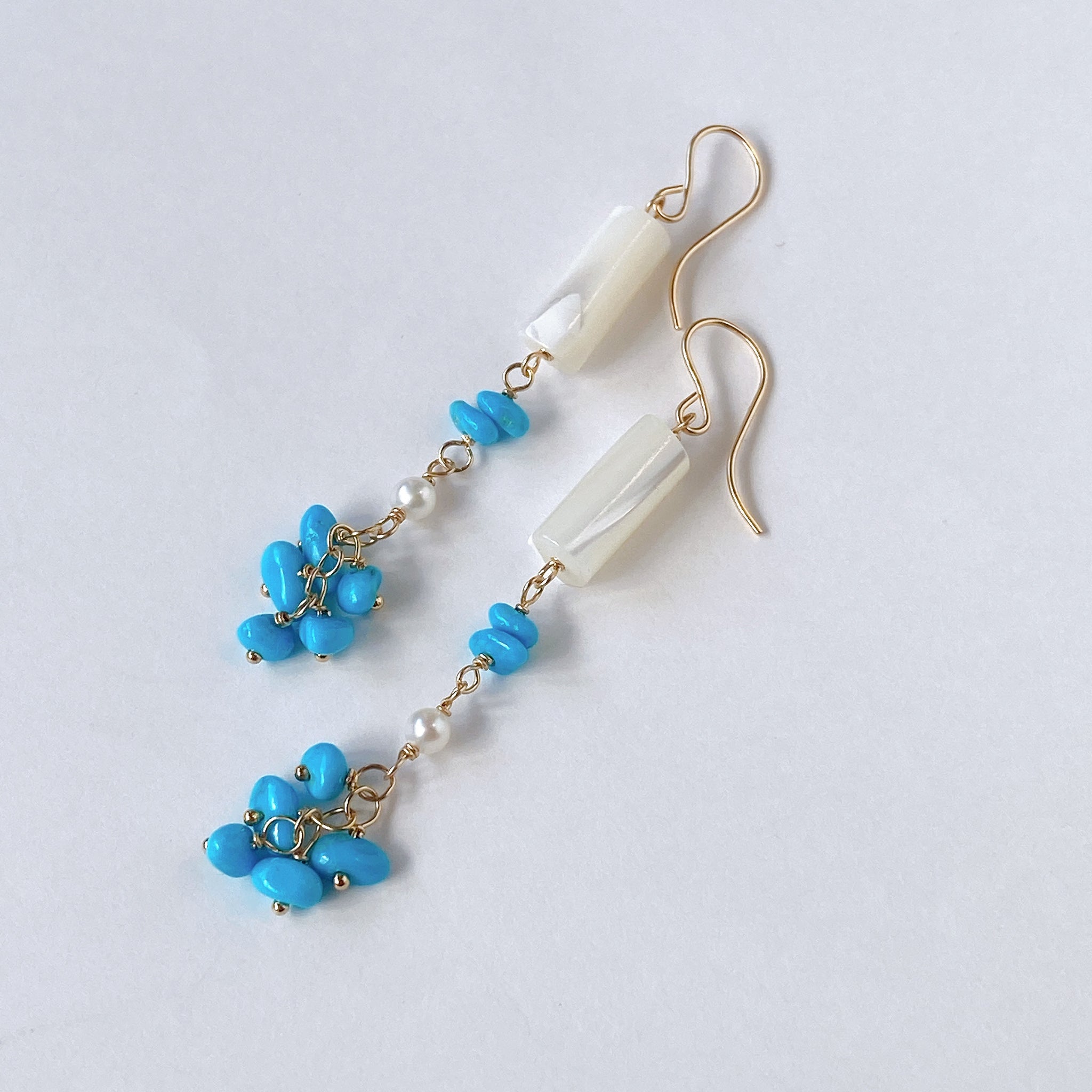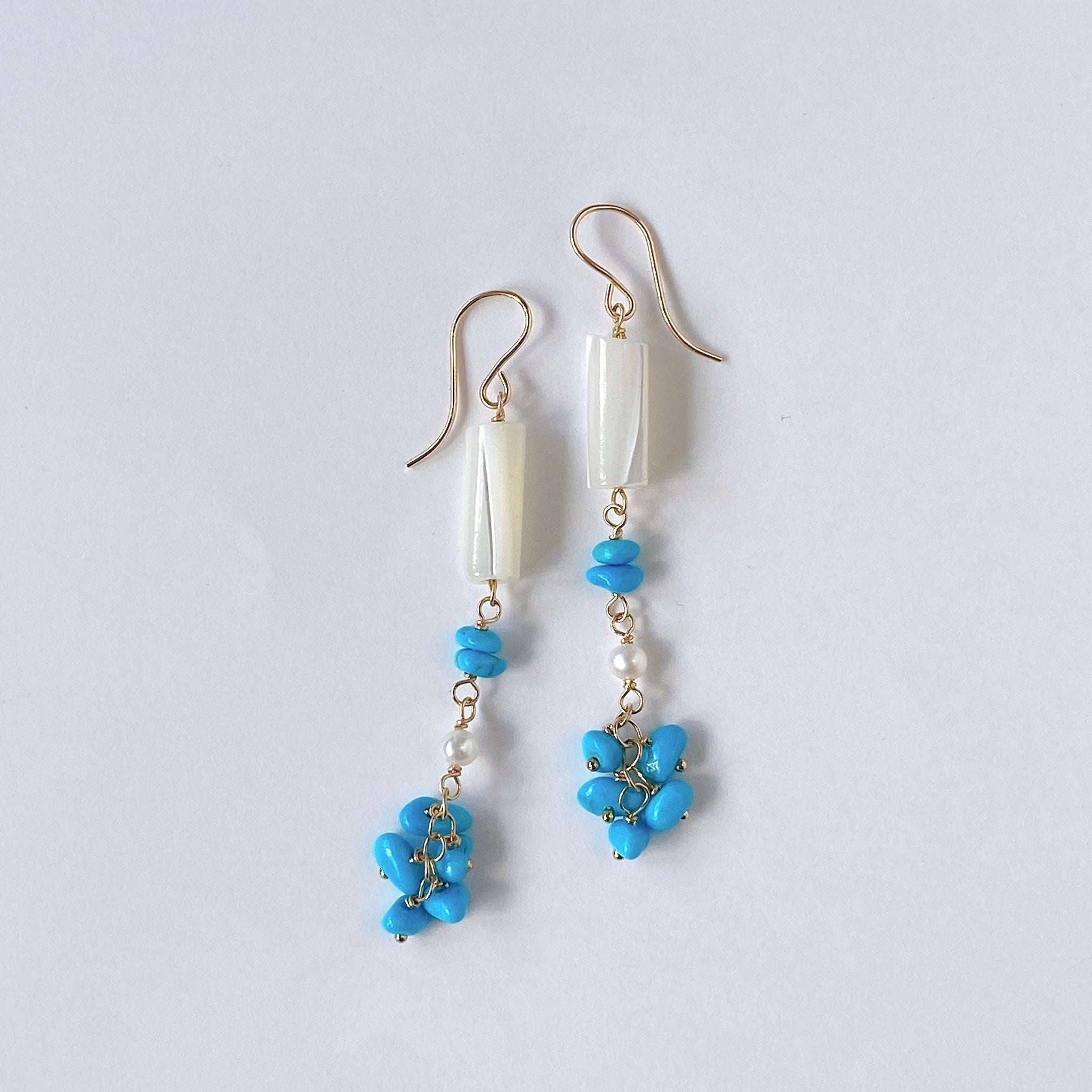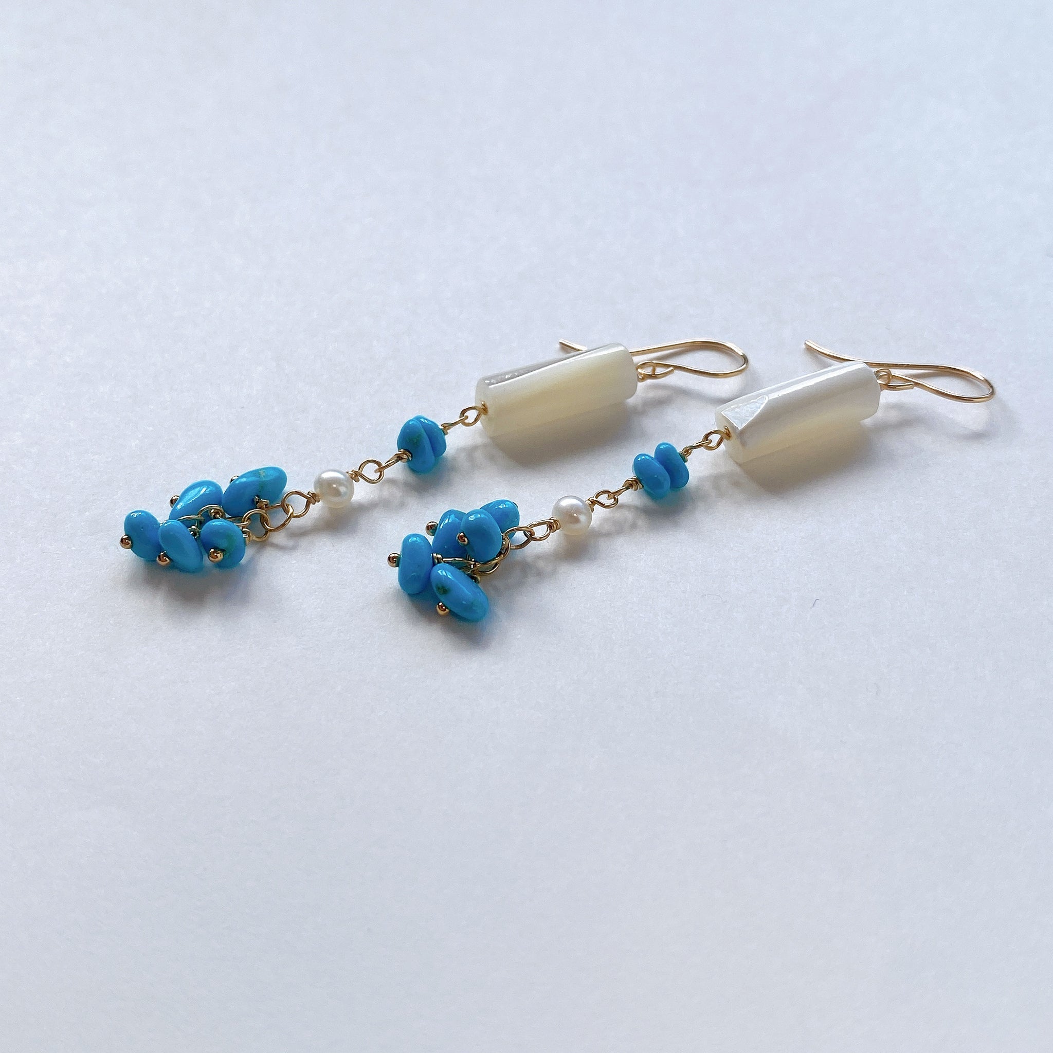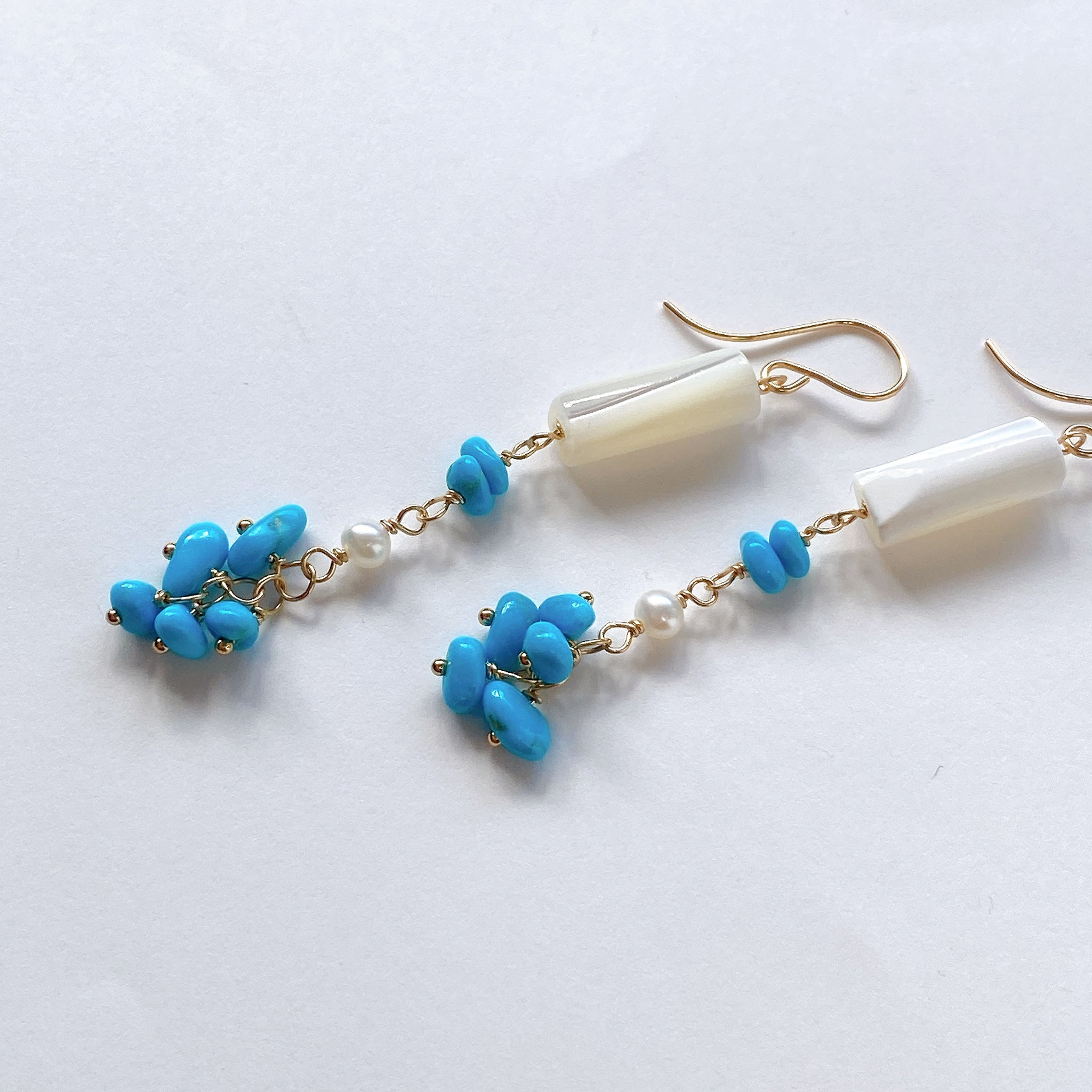 スリーピングビューティーターコイズと小さな淡水パール、ホワイトシェルを使ってデザインした耳飾りです。