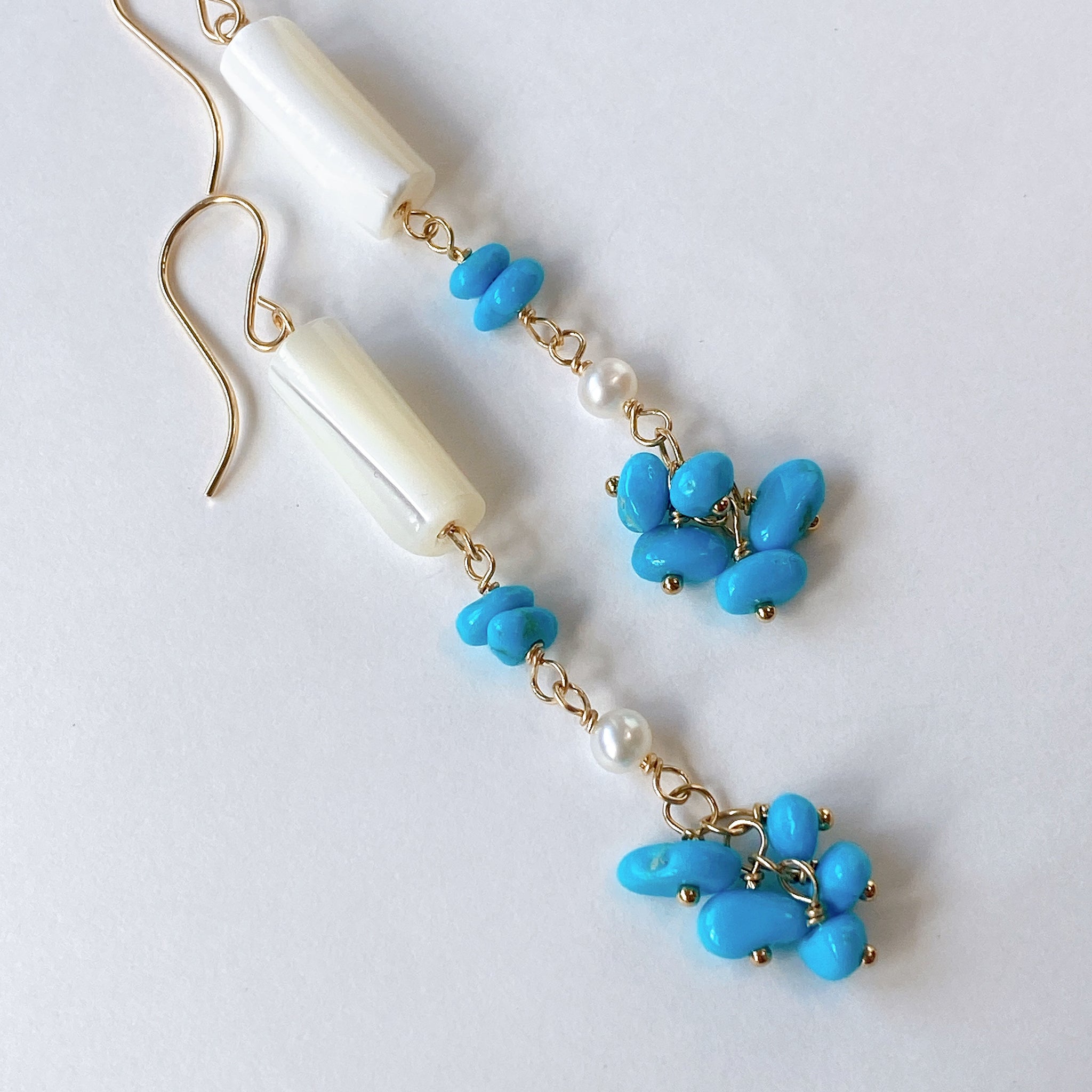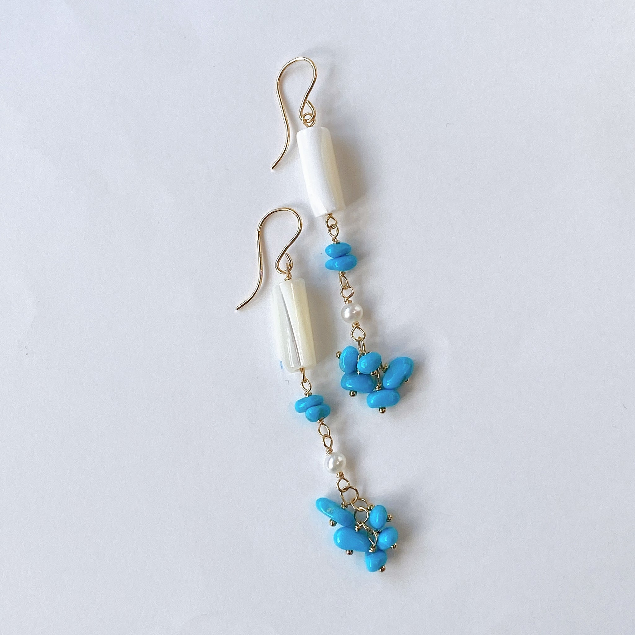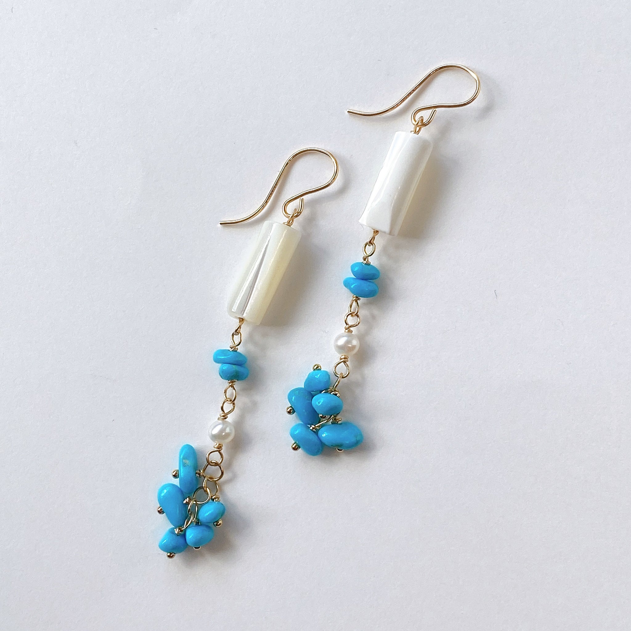 スリーピングビューティーターコイズと小さな淡水パール、ホワイトシェルを使ってデザインした耳飾りです。