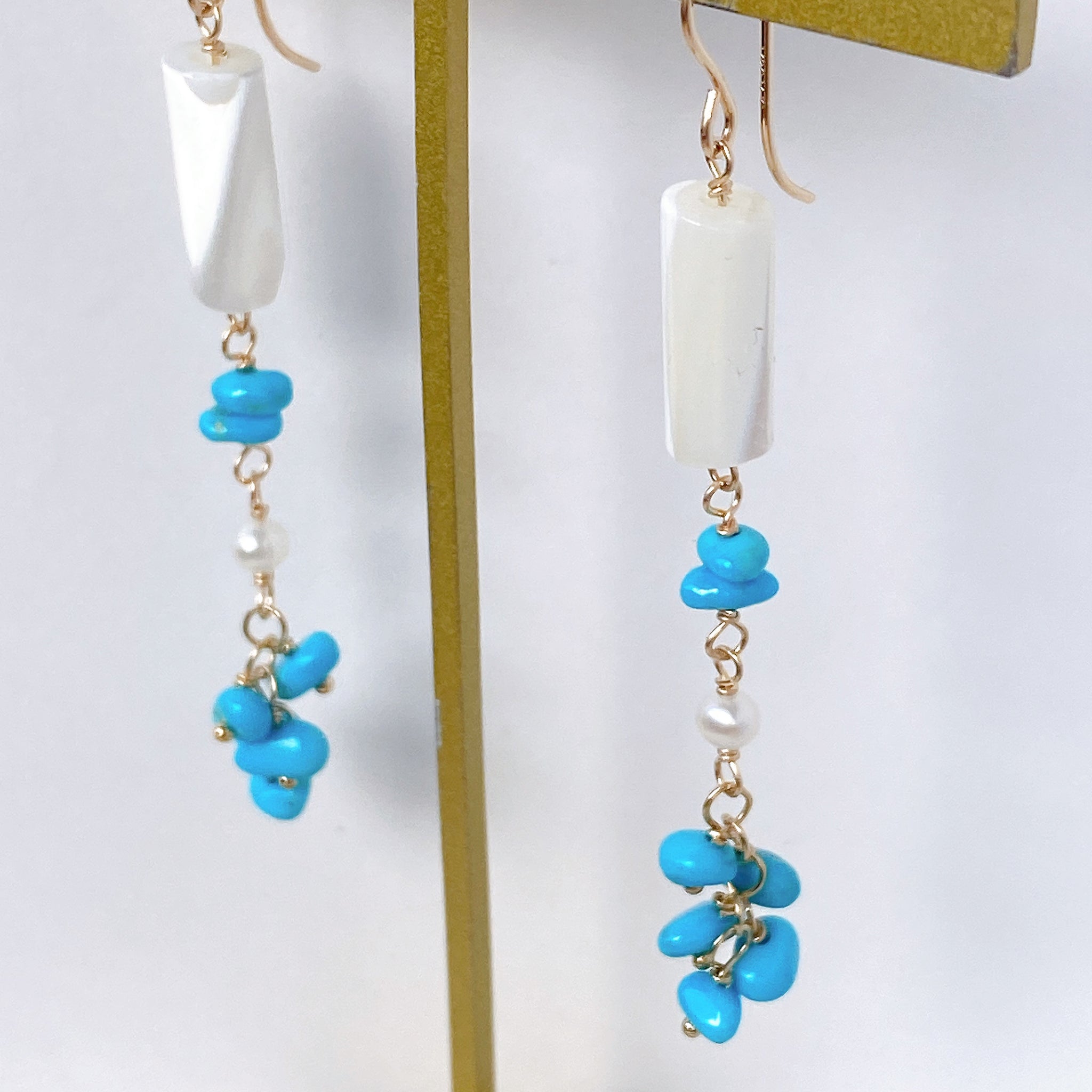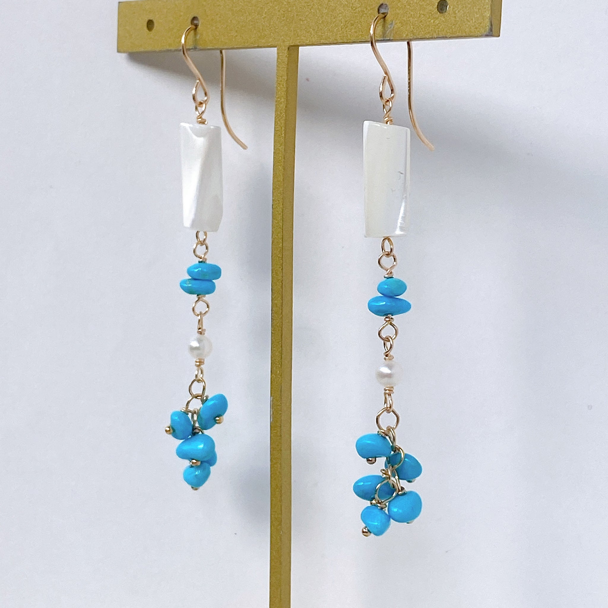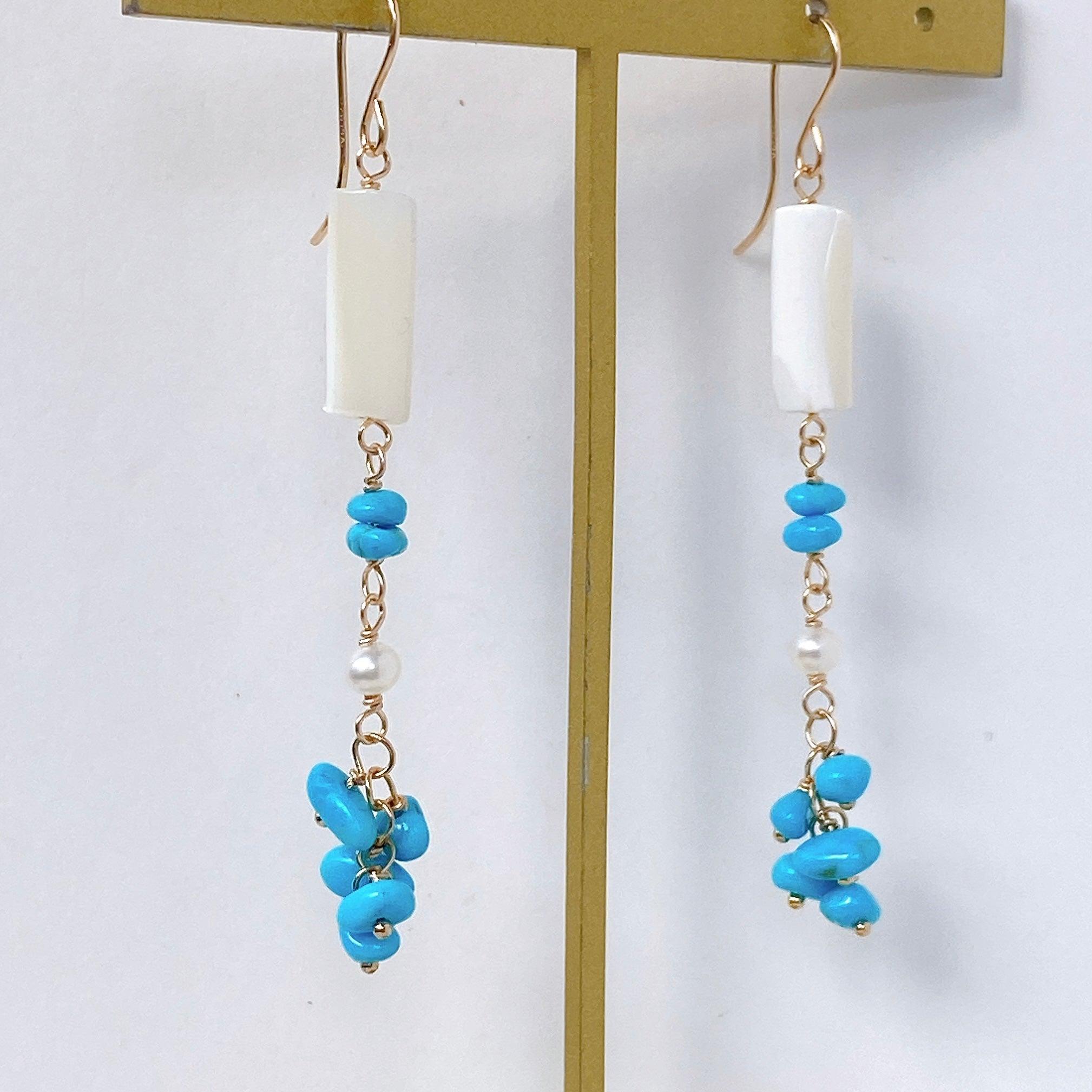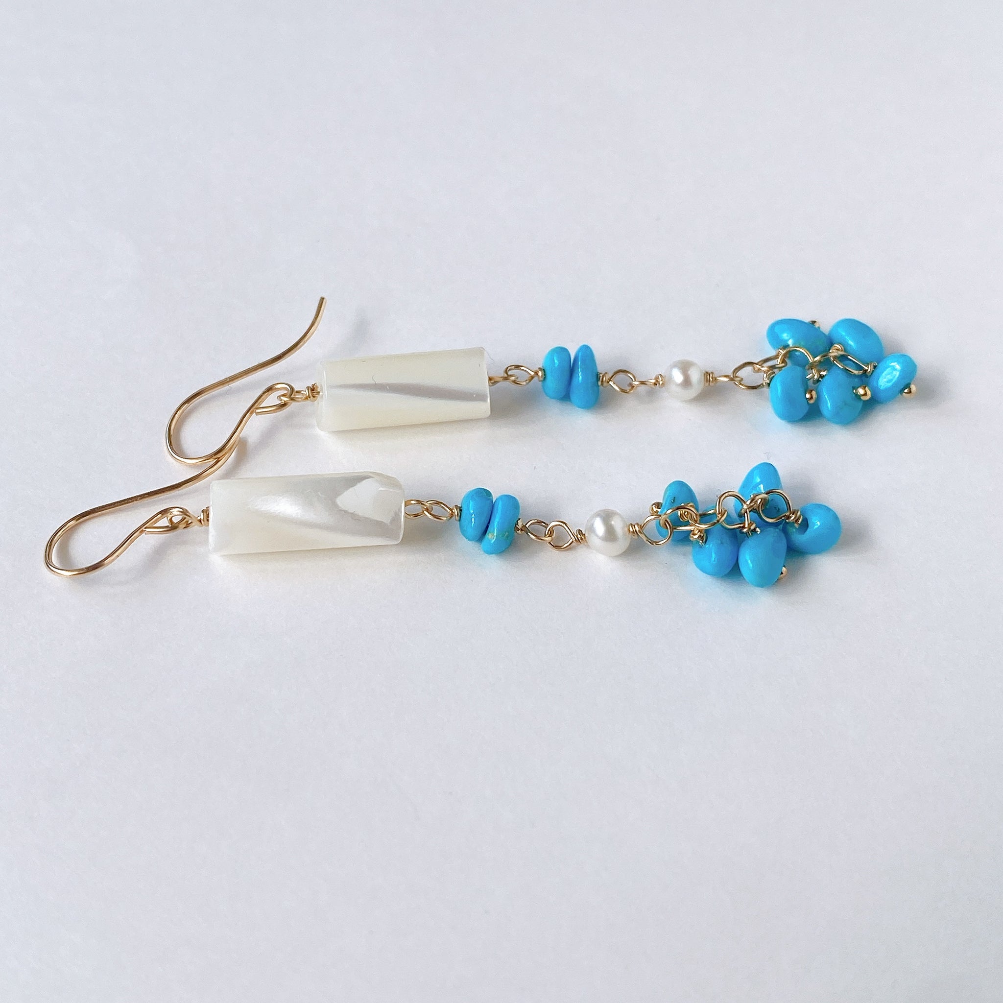 スリーピングビューティーターコイズと小さな淡水パール、ホワイトシェルを使ってデザインした耳飾りです。