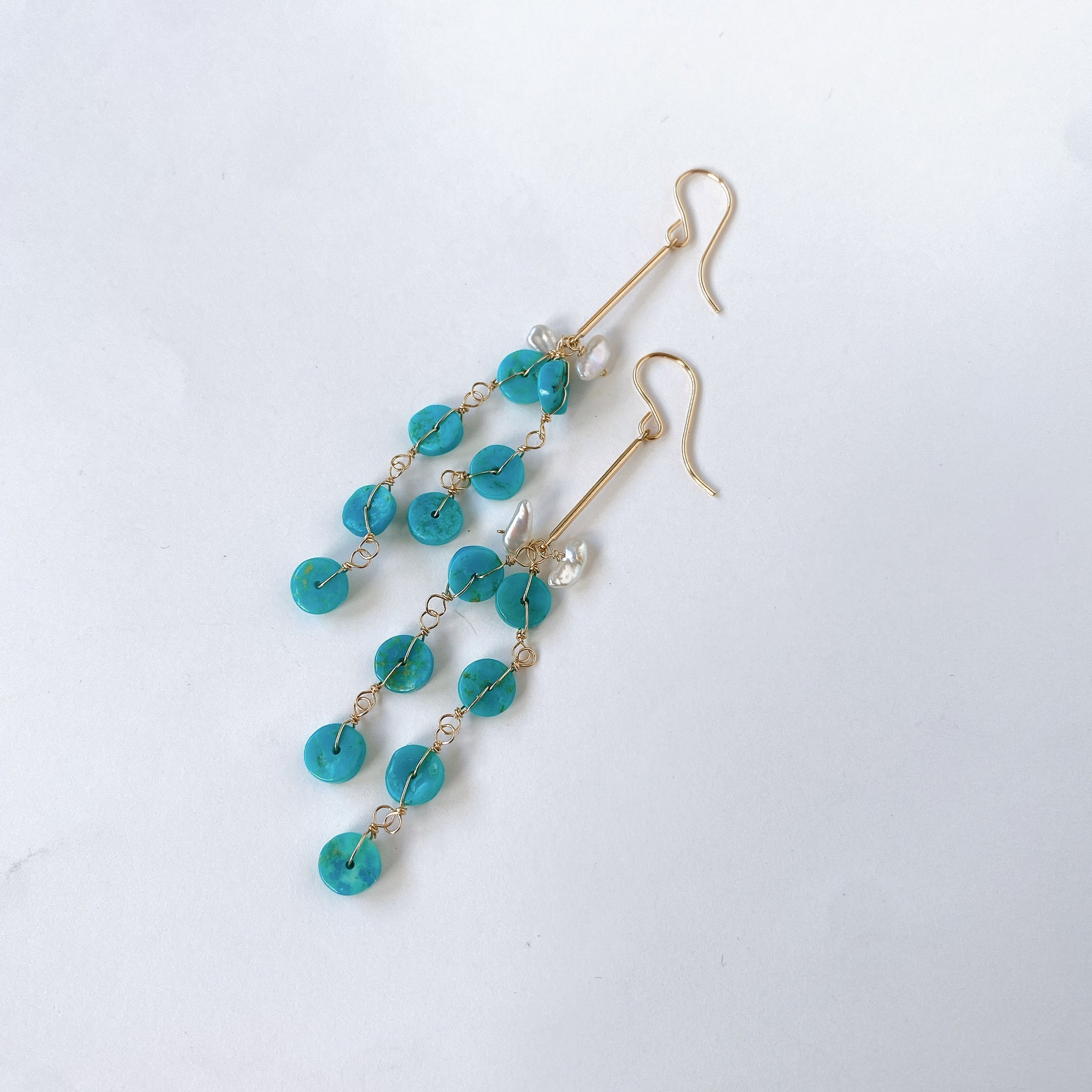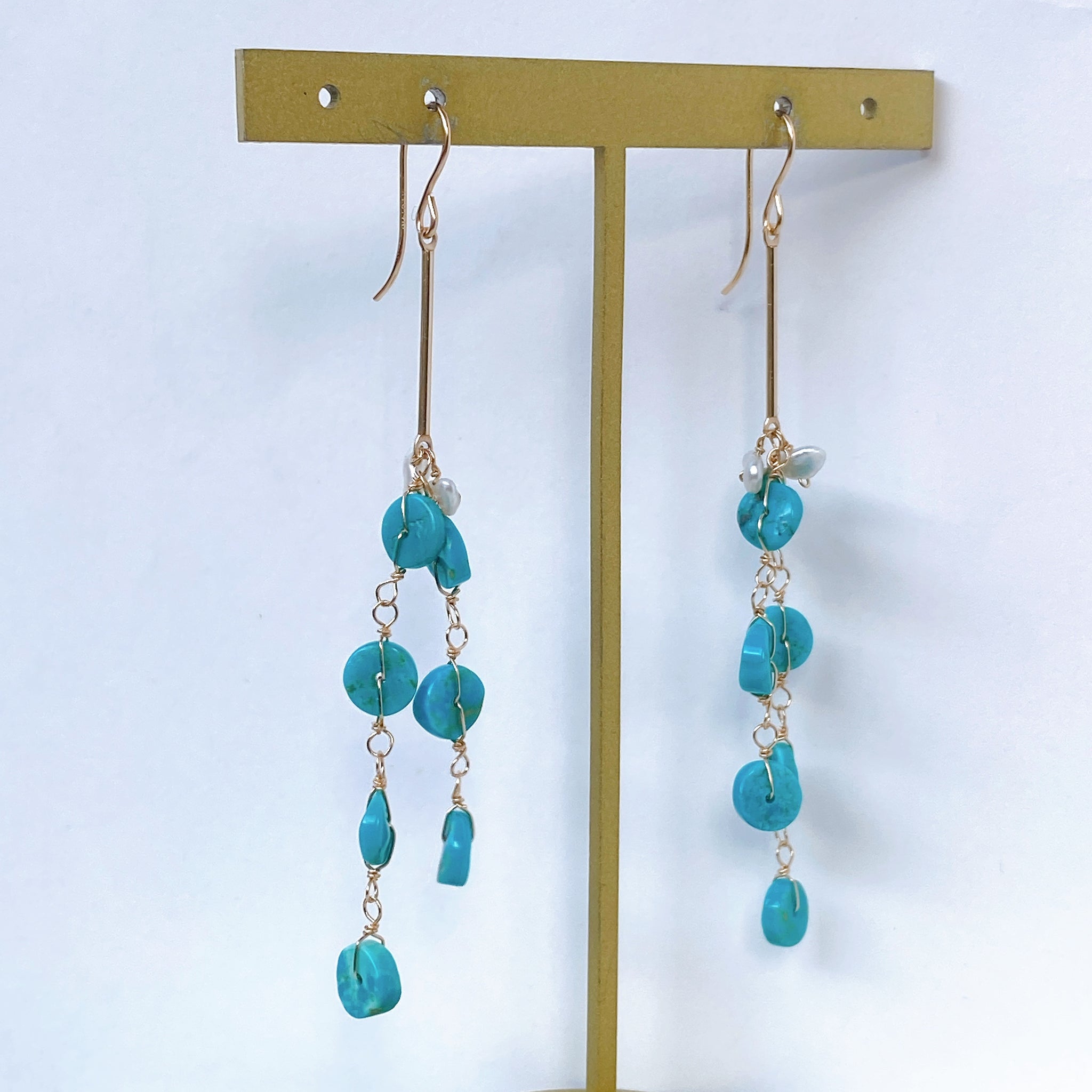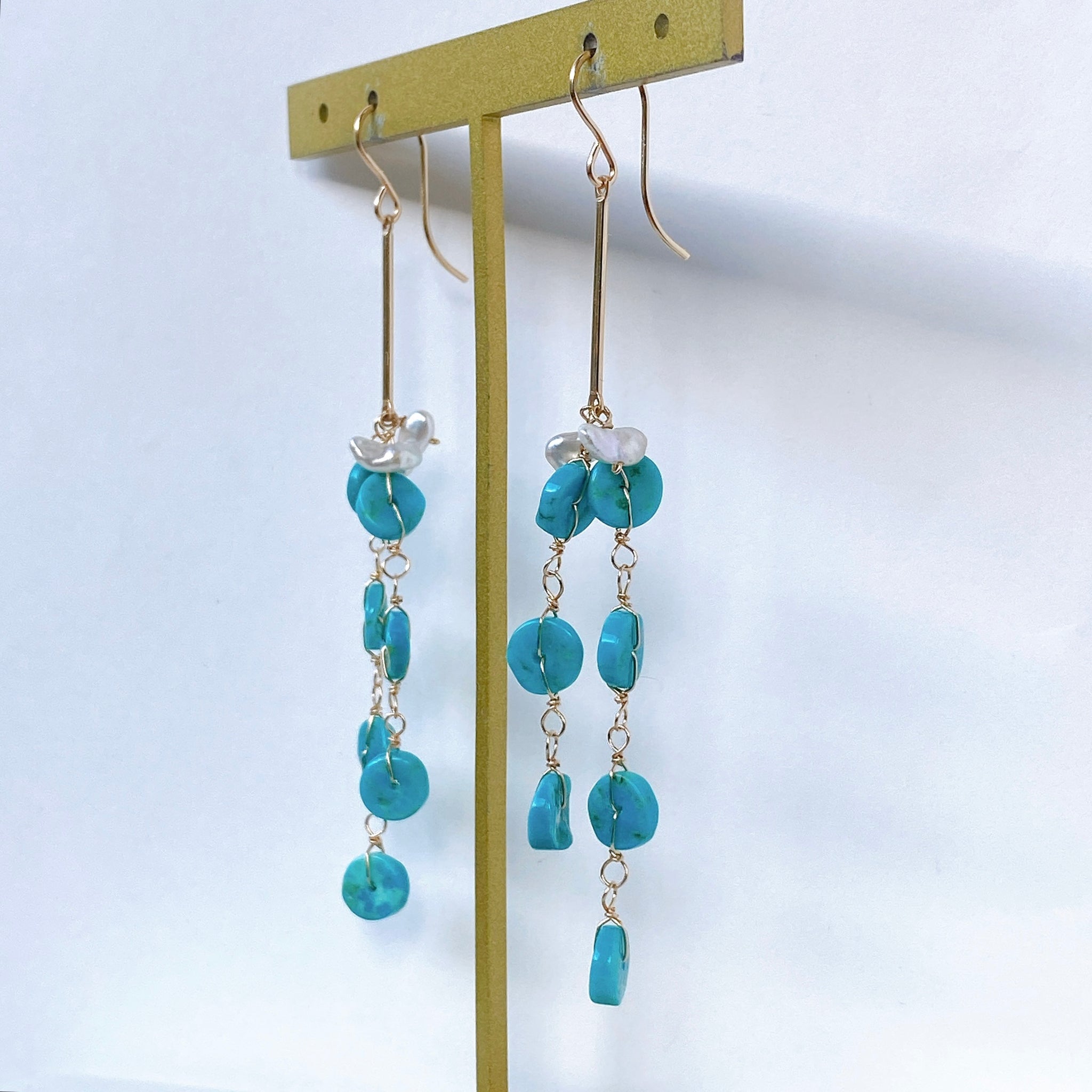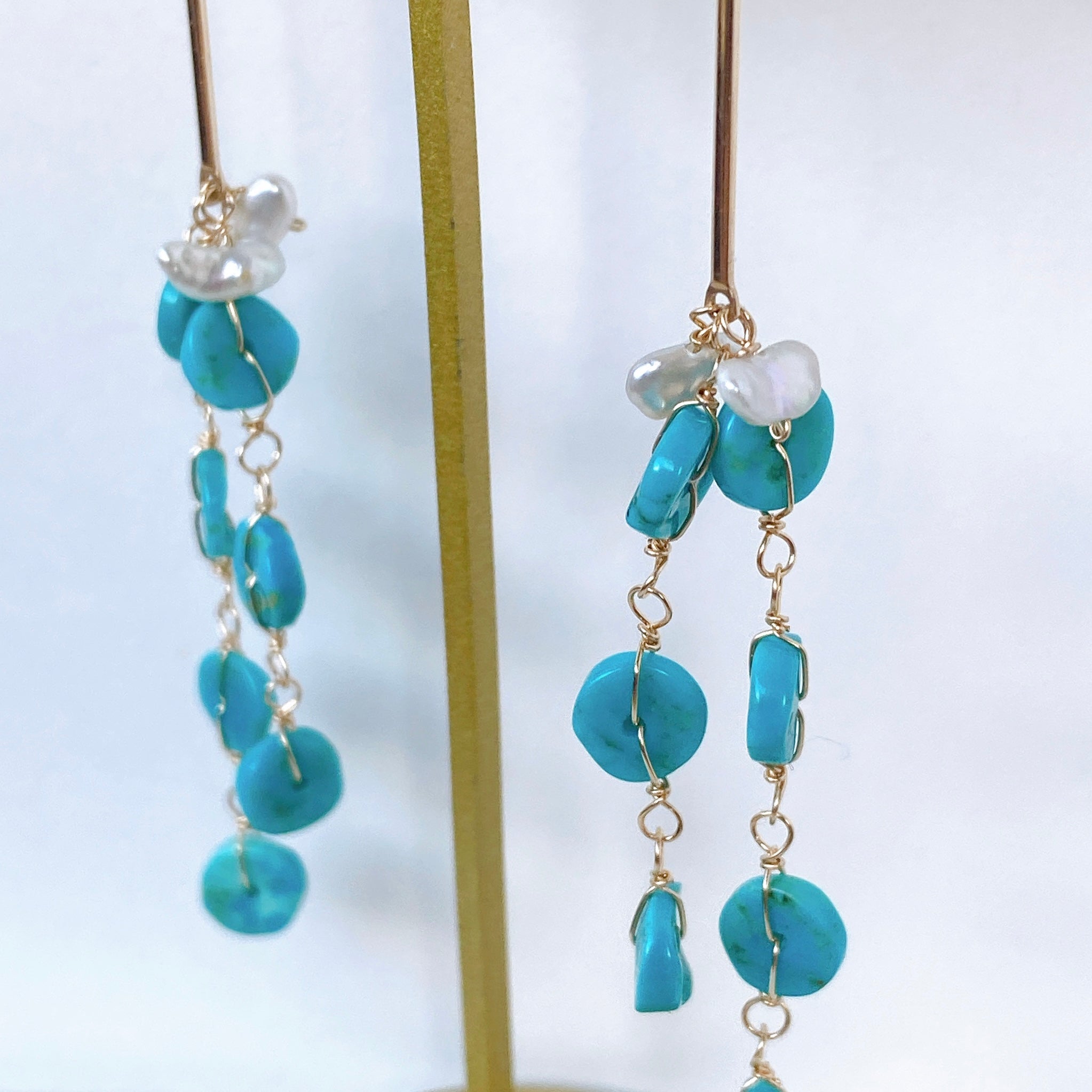 細長い形のアコヤケシパールとソノランターコイズを使ってデザインした耳飾りです。